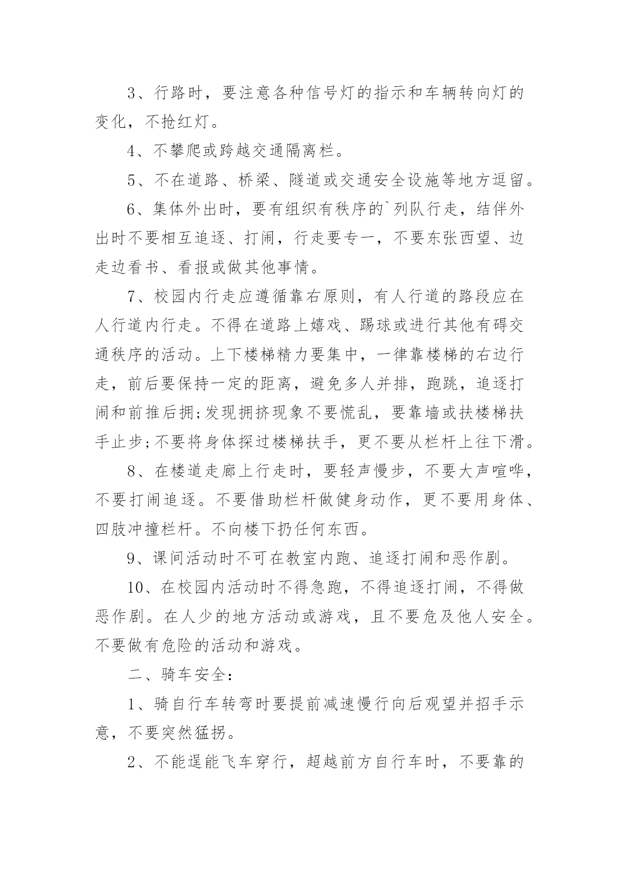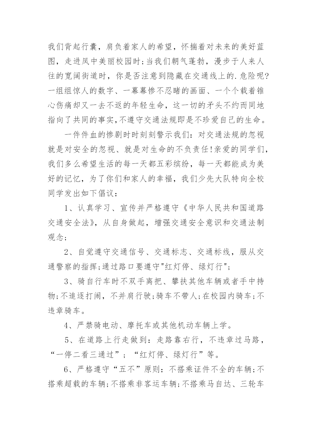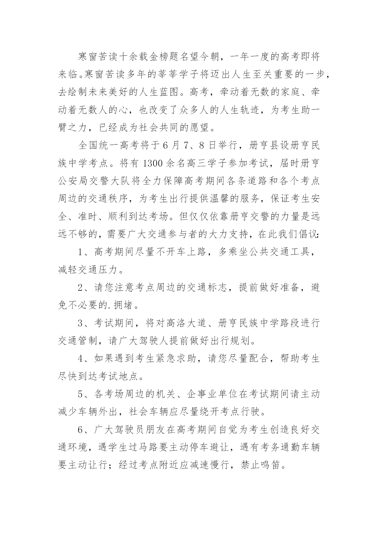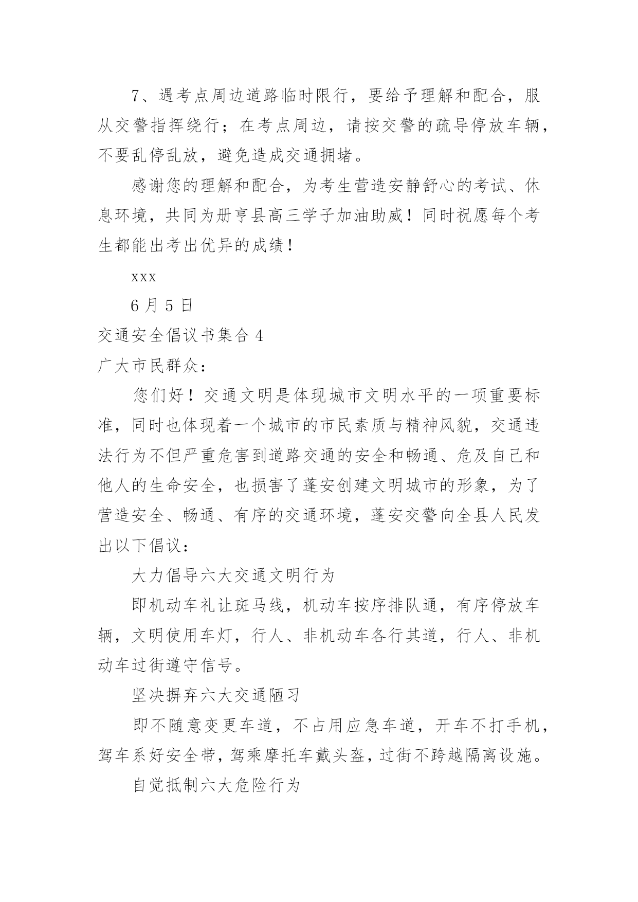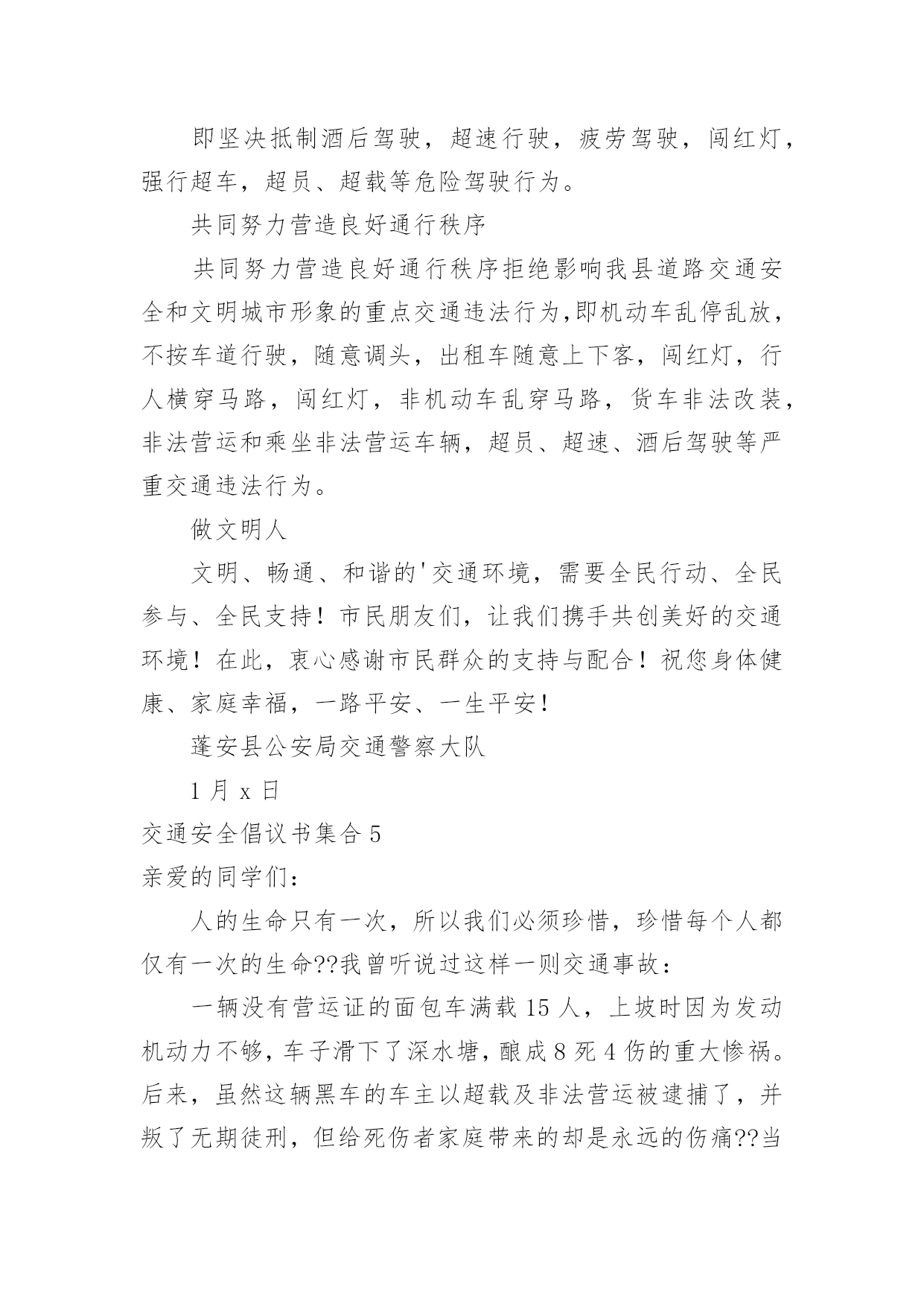 交通安全倡议书交通安全倡议书集合在快速变化和不断变革的新时代,我们使用上倡议书的情况与日俱增,倡议书是日常应用写作中的一种常用文体。来参考自己需要的倡议书吧!以下是小编为大家整理的交通安全倡议书集合,欢迎阅读,希望大家能够喜欢。交通安全倡议书集合1亲爱的同学们:大家好!衣食住行,是我们每一个人的生活基本需求,而其中的行意味着我们每天的生活都离不开交通。拥有一个文明和谐的道路交通环境是大家共同的愿望。但在我们身边,还有一些不文明的交通行为,它不仅影响了正常的交通秩序,还对我们的生命造成了威胁。营造一个良好的道路交通环境,需要全社会包括我们全体同学的共同努力。为积极响应上级号召,进一步巩固我校交通安全教育的成果,不断增强大家的交通文明意识,营造文明、和谐的交通环境,特向同学们提出以下倡议:一、行走安全:1、在公路上行走要走人行道,没有人行道的要靠路边行走。2、通过道路交叉口或横穿公路时,要走人行横道,通过路口时,要左右观察,确定安全时再通过。3、行路时,要注意各种信号灯的指示和车辆转向灯的变化,不抢红灯。4、不攀爬或跨越交通隔离栏。5、不在道路、桥梁、隧道或交通安全设施等地方逗留。6、集体外出时,要有组织有秩序的`列队行走,结伴外出时不要相互追逐、打闹,行走要专一,不要东张西望、边走边看书、看报或做其他事情。7、校园内行走应遵循靠右原则,有人行道的路段应在人行道内行走。不得在道路上嬉戏、踢球或进行其他有碍交通秩序的活动。上下楼梯精力要集中,一律靠楼梯的右边行走,前后要保持一定的距离,避免多人并排,跑跳,追逐打闹和前推后拥;发现拥挤现象不要慌乱,要靠墙或扶楼梯扶手止步;不要将身体探过楼梯扶手,更不要从栏杆上往下滑。8、在楼道走廊上行走时,要轻声慢步,不要大声喧哗,不要打闹追逐。不要借助栏杆做健身动作,更不要用身体、四肢冲撞栏杆。不向楼下扔任何东西。9、课间活动时不可在教室内跑、追逐打闹和恶作剧。10、在校园内活动时不得急跑,不得追逐打闹,不得做恶作剧。在人少的地方活动或游戏,且不要危及他人安全。不要做有危险的活动和游戏。二、骑车安全:1、骑自行车转弯时要提前减速慢行向后观望并招手示意,不要突然猛拐。2、不能逞能飞车穿行,超越前方自行车时,不要靠的太近,不要速度过快。3、骑车时不三五成群并肩骑行,也不要扶肩而行,更不要互相追逐、竟驶。4、不要手中持物骑行,更不要双手离把,呈一时之快。5、不要紧随机动车后面骑行,更不要扒机动车行驶,以免被挂倒。6、过道口,要“一慢二看三通过”,听从指挥,不钻栏杆骑行。7、狭路相逢“让”者胜,车让人,人让车,不仅避免了安全隐患的发生,还体现出人与人之间互相礼让的美德。8、劝告自己的家人、朋友珍爱生命,严格遵守交通规则,安全驾车、安全乘车、安全骑车、安全步行。同学们,让我们积极行动起来,从自己做起,从现在做起,告别交通陋习,弘扬文明新风,共同营造和维护安全、畅通、有序的文明交通环境,让我们的城市、我们的校园更文明、更有序,让生活更和谐、更美好!倡议人:xxX时间:xxxx年xx月xx日交通安全倡议书集合2居民朋友们:今年,国务院正式批复将每年12月2日作为“全国交通安全日”,目的在于充分发挥社会各界的宣传作用,广泛开展道路交通安全宣传活动,不断提高全民的交通守法意识、安全意识和公德意识。今年“全国交通安全日”的主题是“遵守交通信号,安全文明出行”。在首个“122”全国交通安全日到来之际,为积极营造全社会共同关注交通安全、倡导文明驾驶的`浓厚氛围,我居特发出如下倡议:一、从我做起,认真学习、宣传并严格遵守交通安全法,增强交通安全意识和交通法制观念。二、从我做起,自觉遵守交通信号、交通标志,遵从交巡民警指挥,做到“红灯停、绿灯行”。三、从我做起,不酒后驾驶车辆及疲劳驾驶、不超速行驶,不闯红灯,不在禁鸣区域鸣喇叭,不超载人员,不超速飚车。四、从我做起,步行时应在人行道内行走,没有人行道的要挨路边右边行走。不贪图方便,不跨越交通隔离护栏。五、从我做起,集中思想驾驶车辆;行车中不拨打、接听手机,确保行车安全。六、从我做起,不驾驶超载车辆,做到乘客从机动车右侧上下车。七、从我做起,行人通过路口或横过道路应当走斑马线或者过街设施,通过时要“右看、左看,向前行”,确认安全。不勾肩搭背,不追逐打闹,不逗留聚集。八、从我做起,骑车时注意车速,不要“飞车”,双手离把,并注意行人及机动车,不要快速在行人中间穿行。交通安全倡议书集合3广大交通参与者们:寒窗苦读十余载金榜题名望今朝,一年一度的高考即将来临。寒窗苦读多年的莘莘学子将迈出人生至关重要的一步,去绘制未来美好的人生蓝图。高考,牵动着无数的家庭、牵动着无数人的心,也改变了众多人的人生轨迹,为考生助一臂之力,已经成为社会共同的愿望。全国统一高考将于6月7、8日举行,册亨县设册