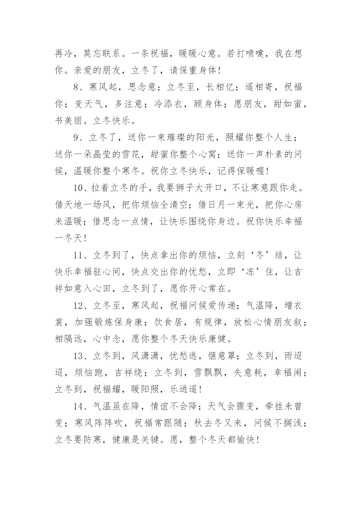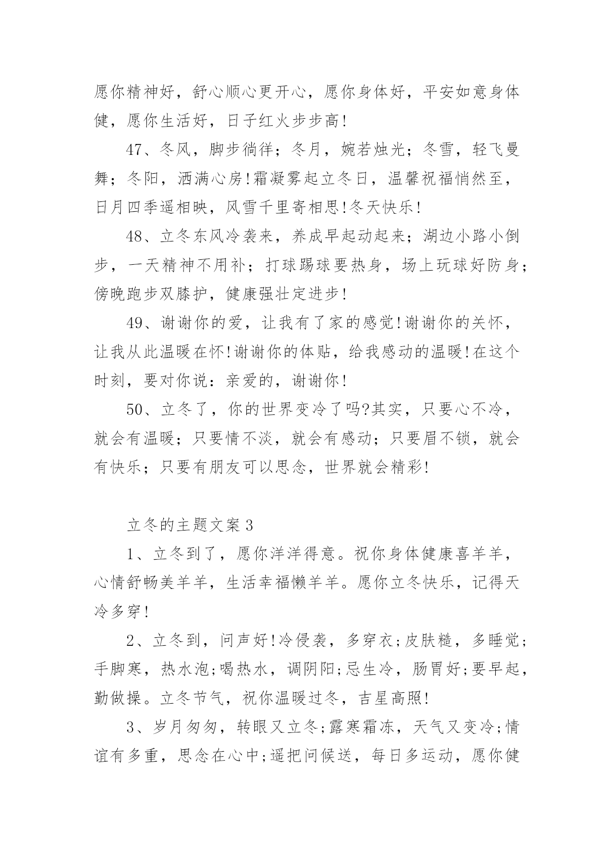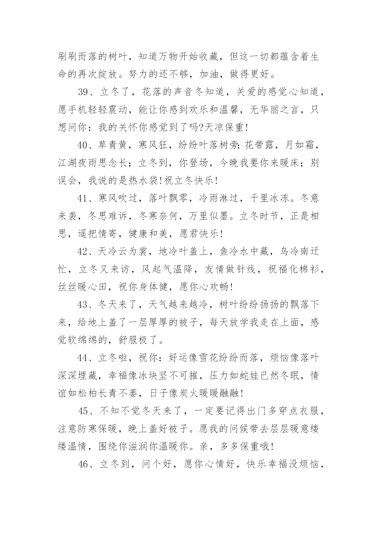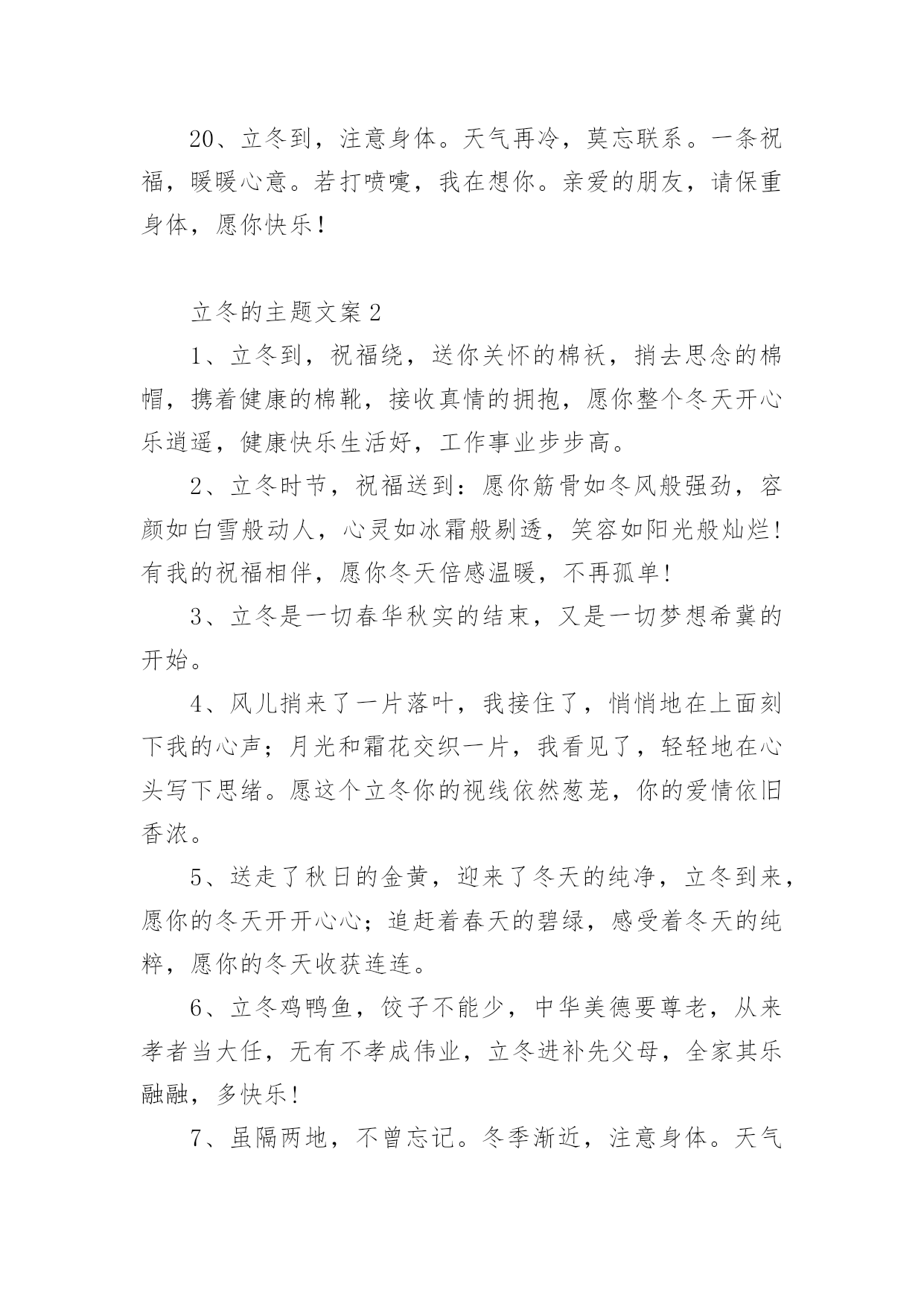 立冬的主题文案在生活、工作和学习中,大家都看到过文案吧,文案用以分享自己对生活的思考,表达自己的喜怒哀乐。你所见过的文案是什么样的呢?下面是小编整理的立冬的主题文案,欢迎大家分享。立冬的主题文案11、一句问候,带着一丝温暖;一点关怀,带着真心一片;一句祝福,送你一生平安;立冬了,要注意保暖,别冻着,祝你快乐身体健!2、饿了,饱饱胃肠;冷了,添添衣裳;烦了,外出逛逛;累了,在家躺躺;乐了,说说分享;想了,聊聊家常。立冬到了,祝你久久快乐健康!3、寒霜飘落,挡不住旭日的光线;寒意四起,冷却不了火热的心;立冬拉开冬天的大幕,祝福送上温暖的棉袄,天冷注意保暖,平安依偎康健,好运挑灯看剑,快乐吹角连营,九万里大鹏展翅,冬风送你好心情,幸福冬点兵。立冬短信飞快,祝福直抵你心,了却朋友烦恼事,留得友情长久名。4、冷天颤颤,吃饱穿暖;冷风飕飕,衣服穿厚;冷雨凄凄,衣帽带齐;冷气呼呼;健康防护。立冬之日,祝你:不怕冷寒风霜,健康永陪身旁!5、冰雪封冻的只是时间而不是挂念,黑暗驱赶的只是距离而不是亲切,寒冷困住的只是感觉而不是真心,今日立冬,我的心,愿你能懂,祝你快乐!6、立冬到,短信传,深情厚谊伴身边;寒风吹,气温降,问候声声心温暖;草木枯,花凋谢,祝福句句春光在。祝你立冬体康健,幸福生活乐无边!7、逢立冬,霜重重。日行空,意浓浓。思如风,念入梦。寄关爱,轻相送。忙碌里,多放松。心舒畅,兴冲冲。你我情,多互动。吉祥临,乐一冬!8、北风冷冷吹送,转眼迎来立冬;清霜冷絮满地,惦念暗潮涌动;添衣保暖防冻,烦恼一切随风;夜夜黄粱美梦,日日身心轻松;短短问候情长,愿你幸福一冬!9、心是近的,再远的距离也是短的;心是火的,再忙的工作也是闲的;心是诚的,再苦的日子也是甜的;有我祝福,再冷的冬天也是暖的。立冬快乐!10、岁月如风,从秋走到冬。雨雪不能把你的好运掩藏,冰霜无法将你的快乐封冻,又是立冬到,送你一件幸福霓裳,愿你暖意融融!11、立冬了,我要送你一件外套:口袋叫温暖;领子叫关怀;袖子叫体贴;扣子叫思念;让这件外套紧紧伴著你渡过每一分每一秒,一定要幸福喔!12、路再远,一步步走过,情再深,一次次培养,距离远了,联系不能断,思念深了,祝福更要传,提醒及时,寒冷才能避免,保暖尽力,温暖才能如愿,亲爱的朋友,抗寒早做起,愿你身体健康,立冬快乐。13、一叶知秋秋已远,一场风雪一场寒,一年之醉在立冬,一身素颜傲雪然,一生朋友不会变,一条短信寄上前,一句祝福声声暖,一如暖炉在身边。祝立冬快乐。14、冬天因有了梅花而倔强,因有了白雪而高傲,又因送出寒冷而自豪,朋友,出门在外注保暖!立冬了,给你最真挚的祝福:冬日健康!15、天气冷了一点,我的问候多了一点,寒冷立冬日,祝你多一点温暖,少一点寒冷,多一份幸福,少一份悲伤!让冬日里的阳光更温暖!立冬了别忘了加衣!16、立冬切记:冬风寒,衣不单,姜汤水,不能断,勤通风,病毒散,多锻炼,精力满,快快乐乐过冬天!祝:身体健康,吃嘛嘛香!17、加点温暖,那是必须的,注意防冻,那是务必的,防寒措施,那是立即的,增温设备,那是必备的,祝福问候,那是应该的,短信提醒,那是代表我的情意的,愿你健康快乐,立冬健康。立冬快乐!18、以思念为中心,以祝福为半径画圆,思念拖着长长的线,对你的关怀依然不变。立冬到啦,愿你有我的祝愿,虽然天天不能相见,祝福的话儿记心间:防寒保暖是关键,开心快乐是我最大的心愿。19、立冬到了,怕你孤独,堆一个大雪人陪你;怕你无聊,滚个大雪球砸向你;怕你心烦,做个雪糕逗乐你;怕你又冷又想我,发条暖呼呼的短信给你,轻轻地告诉你:我也想你了,朋友!立冬快乐!20、立冬到,注意身体。天气再冷,莫忘联系。一条祝福,暖暖心意。若打喷嚏,我在想你。亲爱的朋友,请保重身体,愿你快乐!立冬的主题文案21、立冬到,祝福绕,送你关怀的棉袄,捎去思念的棉帽,携着健康的棉靴,接收真情的拥抱,愿你整个冬天开心乐逍遥,健康快乐生活好,工作事业步步高。2、立冬时节,祝福送到:愿你筋骨如冬风般强劲,容颜如白雪般动人,心灵如冰霜般剔透,笑容如阳光般灿烂!有我的祝福相伴,愿你冬天倍感温暖,不再孤单!3、立冬是一切春华秋实的结束,又是一切梦想希冀的开始。4、风儿捎来了一片落叶,我接住了,悄悄地在上面刻下我的心声;月光和霜花交织一片,我看见了,轻轻地在心头写下思绪。愿这个立冬你的视线依然葱茏,你的爱情依旧香浓。5、送走了秋日的金黄,迎来了冬天的纯净,立冬到来,愿你的冬天开开心心;追赶着春天的碧绿,感受着冬天的纯粹,愿你的冬天收获连连。6、立冬鸡鸭鱼,饺子不能少,中华美德要尊老,从来孝者当大任,无有不孝成伟业,立冬进补先父母,全家其乐融融,多快乐!7、虽隔两地,不曾忘记。冬季渐近,注意身体。天气再冷,莫忘联系。一条祝福,暖暖心意。若打喷嚏,我在想你。亲爱的朋友