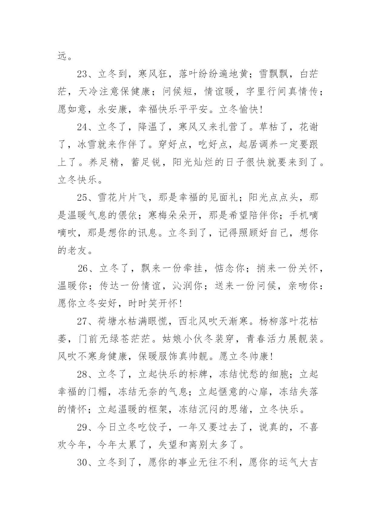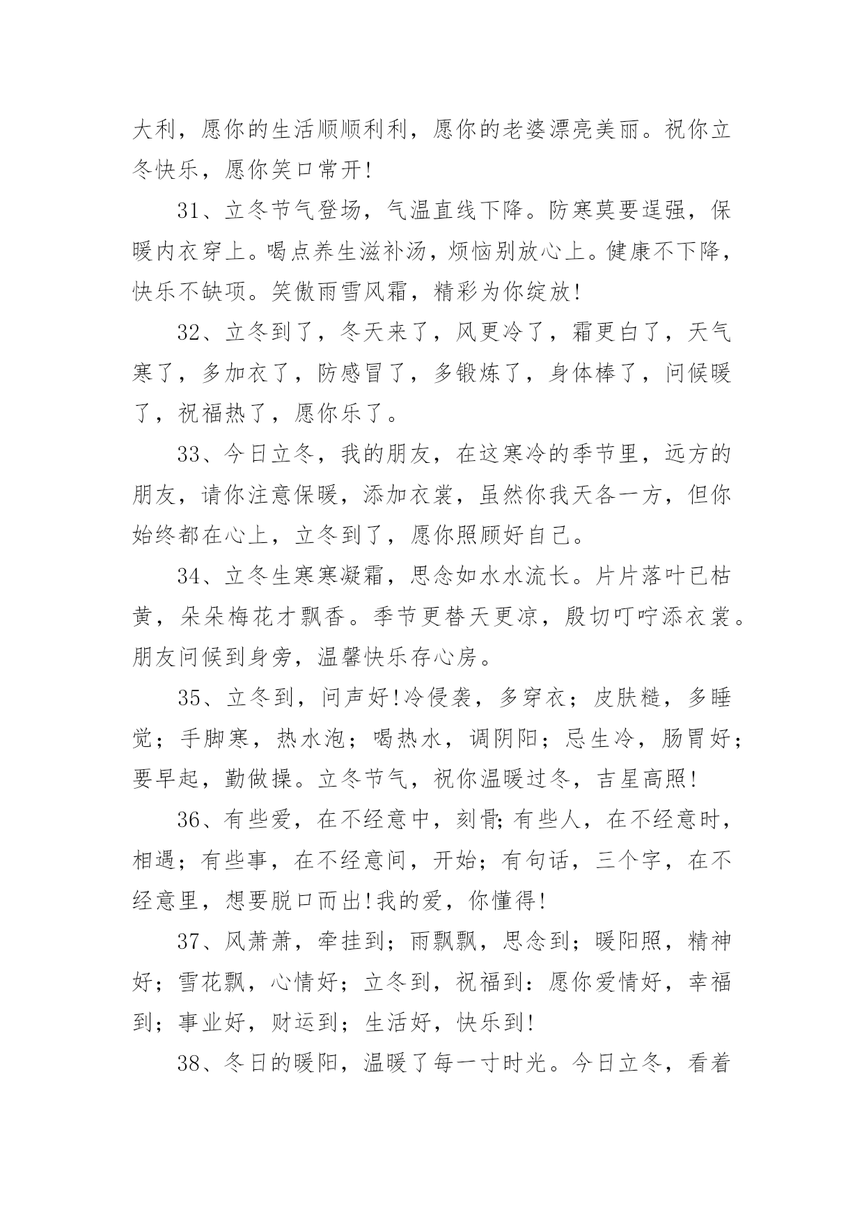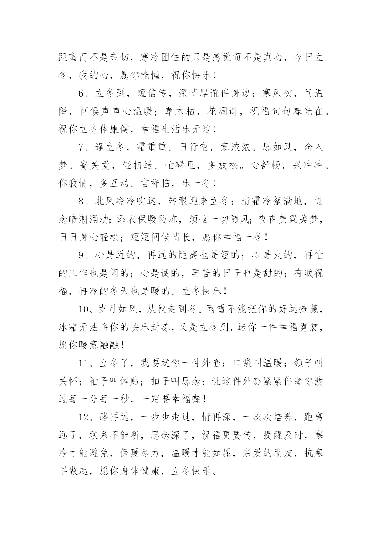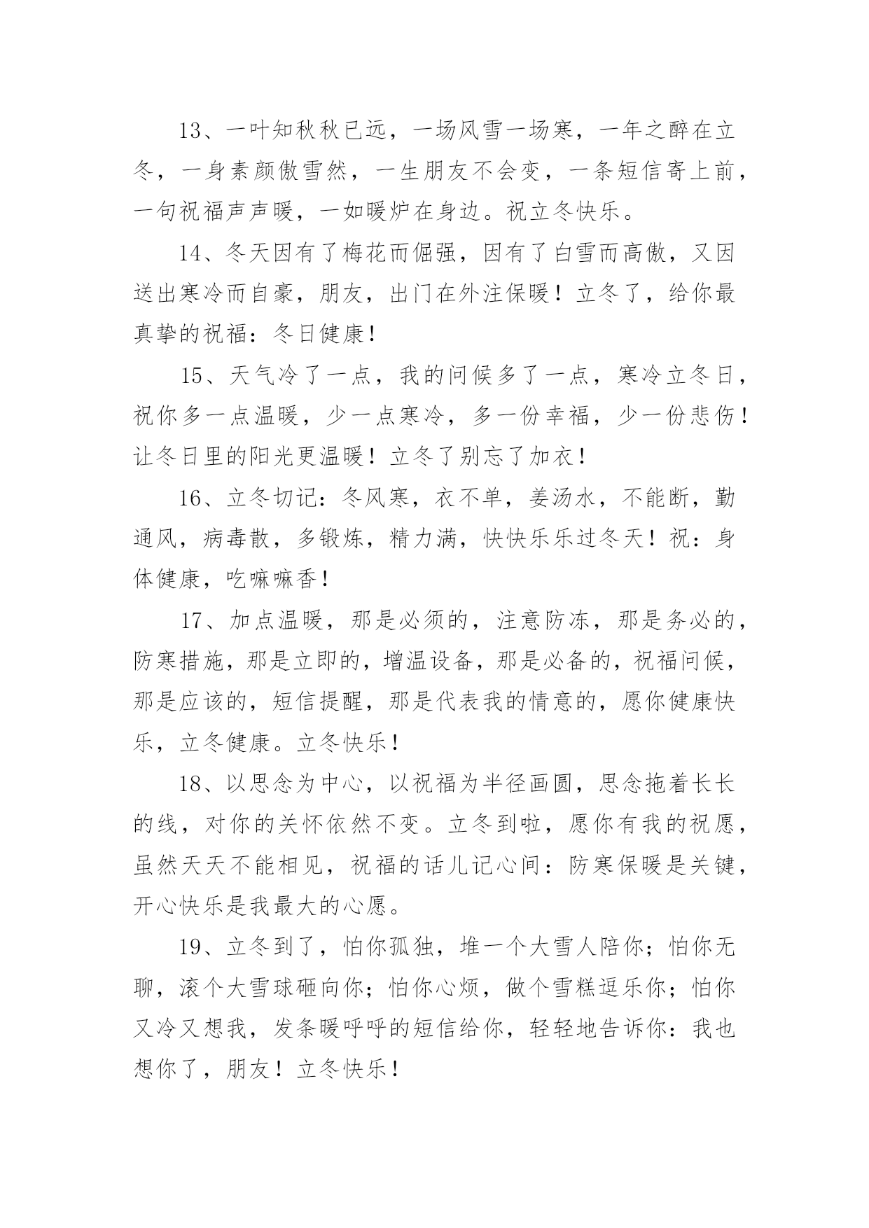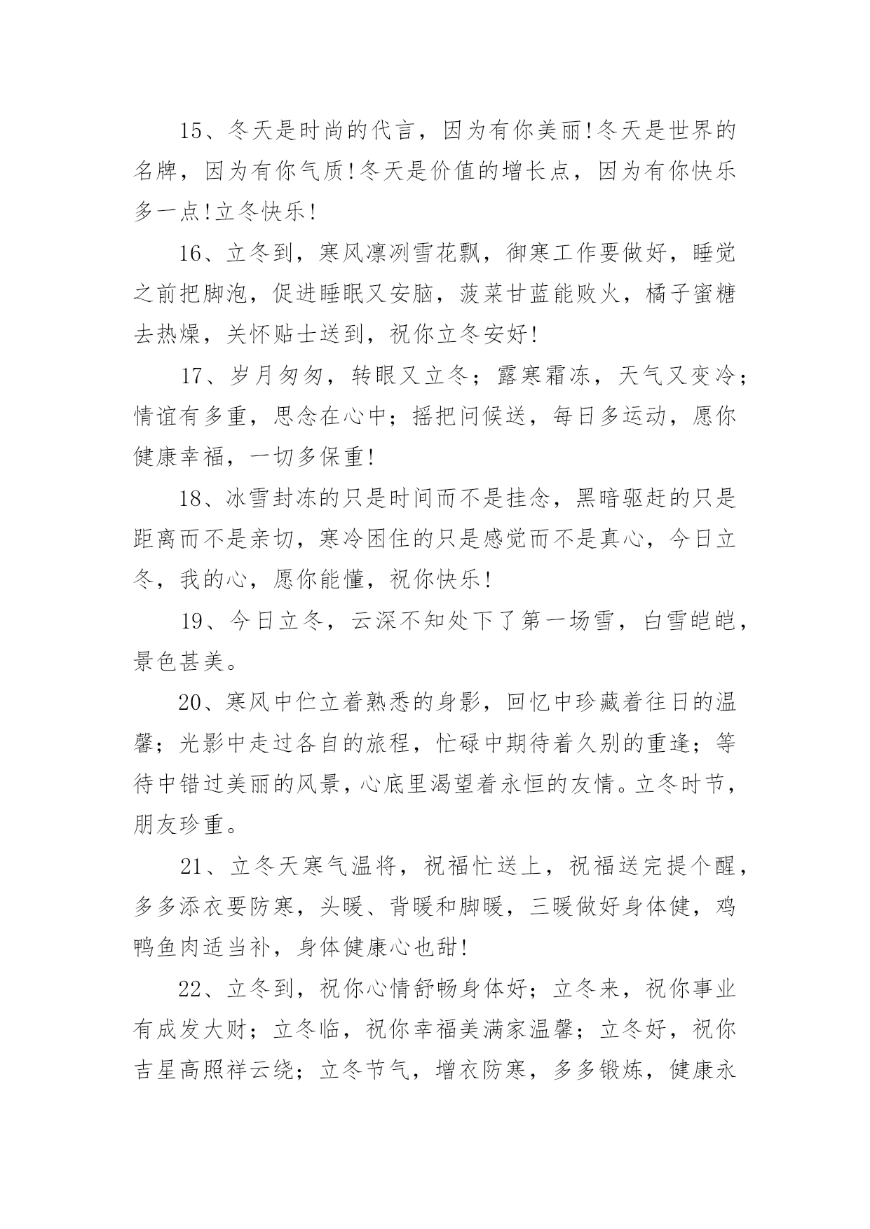 立冬的主题文案在生活、工作和学习中,大家都看到过文案吧,文案用以分享自己对生活的思考,表达自己的喜怒哀乐。你所见过的文案是什么样的呢?下面是小编整理的立冬的主题文案,欢迎大家分享。立冬的主题文案11、一句问候,带着一丝温暖;一点关怀,带着真心一片;一句祝福,送你一生平安;立冬了,要注意保暖,别冻着,祝你快乐身体健!2、饿了,饱饱胃肠;冷了,添添衣裳;烦了,外出逛逛;累了,在家躺躺;乐了,说说分享;想了,聊聊家常。立冬到了,祝你久久快乐健康!3、寒霜飘落,挡不住旭日的光线;寒意四起,冷却不了火热的心;立冬拉开冬天的大幕,祝福送上温暖的棉袄,天冷注意保暖,平安依偎康健,好运挑灯看剑,快乐吹角连营,九万里大鹏展翅,冬风送你好心情,幸福冬点兵。立冬短信飞快,祝福直抵你心,了却朋友烦恼事,留得友情长久名。4、冷天颤颤,吃饱穿暖;冷风飕飕,衣服穿厚;冷雨凄凄,衣帽带齐;冷气呼呼;健康防护。立冬之日,祝你:不怕冷寒风霜,健康永陪身旁!5、冰雪封冻的只是时间而不是挂念,黑暗驱赶的只是距离而不是亲切,寒冷困住的只是感觉而不是真心,今日立冬,我的心,愿你能懂,祝你快乐!6、立冬到,短信传,深情厚谊伴身边;寒风吹,气温降,问候声声心温暖;草木枯,花凋谢,祝福句句春光在。祝你立冬体康健,幸福生活乐无边!7、逢立冬,霜重重。日行空,意浓浓。思如风,念入梦。寄关爱,轻相送。忙碌里,多放松。心舒畅,兴冲冲。你我情,多互动。吉祥临,乐一冬!8、北风冷冷吹送,转眼迎来立冬;清霜冷絮满地,惦念暗潮涌动;添衣保暖防冻,烦恼一切随风;夜夜黄粱美梦,日日身心轻松;短短问候情长,愿你幸福一冬!9、心是近的,再远的距离也是短的;心是火的,再忙的工作也是闲的;心是诚的,再苦的日子也是甜的;有我祝福,再冷的冬天也是暖的。立冬快乐!10、岁月如风,从秋走到冬。雨雪不能把你的好运掩藏,冰霜无法将你的快乐封冻,又是立冬到,送你一件幸福霓裳,愿你暖意融融!11、立冬了,我要送你一件外套:口袋叫温暖;领子叫关怀;袖子叫体贴;扣子叫思念;让这件外套紧紧伴著你渡过每一分每一秒,一定要幸福喔!12、路再远,一步步走过,情再深,一次次培养,距离远了,联系不能断,思念深了,祝福更要传,提醒及时,寒冷才能避免,保暖尽力,温暖才能如愿,亲爱的朋友,抗寒早做起,愿你身体健康,立冬快乐。13、一叶知秋秋已远,一场风雪一场寒,一年之醉在立冬,一身素颜傲雪然,一生朋友不会变,一条短信寄上前,一句祝福声声暖,一如暖炉在身边。祝立冬快乐。14、冬天因有了梅花而倔强,因有了白雪而高傲,又因送出寒冷而自豪,朋友,出门在外注保暖!立冬了,给你最真挚的祝福:冬日健康!15、天气冷了一点,我的问候多了一点,寒冷立冬日,祝你多一点温暖,少一点寒冷,多一份幸福,少一份悲伤!让冬日里的阳光更温暖!立冬了别忘了加衣!16、立冬切记:冬风寒,衣不单,姜汤水,不能断,勤通风,病毒散,多锻炼,精力满,快快乐乐过冬天!祝:身体健康,吃嘛嘛香!17、加点温暖,那是必须的,注意防冻,那是务必的,防寒措施,那是立即的,增温设备,那是必备的,祝福问候,那是应该的,短信提醒,那是代表我的情意的,愿你健康快乐,立冬健康。立冬快乐!18、以思念为中心,以祝福为半径画圆,思念拖着长长的线,对你的关怀依然不变。立冬到啦,愿你有我的祝愿,虽然天天不能相见,祝福的话儿记心间:防寒保暖是关键,开心快乐是我最大的心愿。19、立冬到了,怕你孤独,堆一个大雪人陪你;怕你无聊,滚个大雪球砸向你;怕你心烦,做个雪糕逗乐你;怕你又冷又想我,发条暖呼呼的短信给你,轻轻地告诉你:我也想你了,朋友!立冬快乐!20、立冬到,注意身体。天气再冷,莫忘联系。一条祝福,暖暖心意。若打喷嚏,我在想你。亲爱的朋友,请保重身体,愿你快乐!立冬的主题文案21、立冬到,祝福绕,送你关怀的棉袄,捎去思念的棉帽,携着健康的棉靴,接收真情的拥抱,愿你整个冬天开心乐逍遥,健康快乐生活好,工作事业步步高。2、立冬时节,祝福送到:愿你筋骨如冬风般强劲,容颜如白雪般动人,心灵如冰霜般剔透,笑容如阳光般灿烂!有我的祝福相伴,愿你冬天倍感温暖,不再孤单!3、立冬是一切春华秋实的结束,又是一切梦想希冀的开始。4、风儿捎来了一片落叶,我接住了,悄悄地在上面刻下我的心声;月光和霜花交织一片,我看见了,轻轻地在心头写下思绪。愿这个立冬你的视线依然葱茏,你的爱情依旧香浓。5、送走了秋日的金黄,迎来了冬天的纯净,立冬到来,愿你的冬天开开心心;追赶着春天的碧绿,感受着冬天的纯粹,愿你的冬天收获连连。6、立冬鸡鸭鱼,饺子不能少,中华美德要尊老,从来孝者当大任,无有不孝成伟业,立冬进补先父母,全家其乐融融,多快乐!7、虽隔两地,不曾忘记。冬季渐近,注意身体。天气再冷,莫忘联系。一条祝福,暖暖心意。若打喷嚏,我在想你。亲爱的朋友