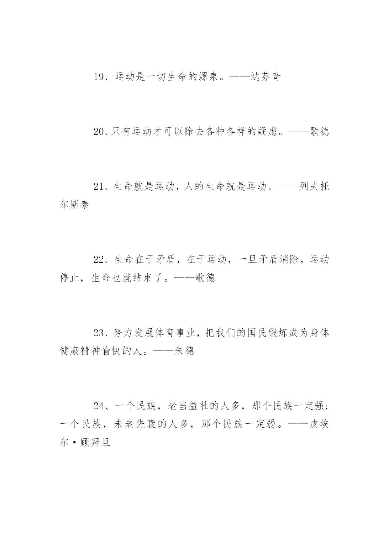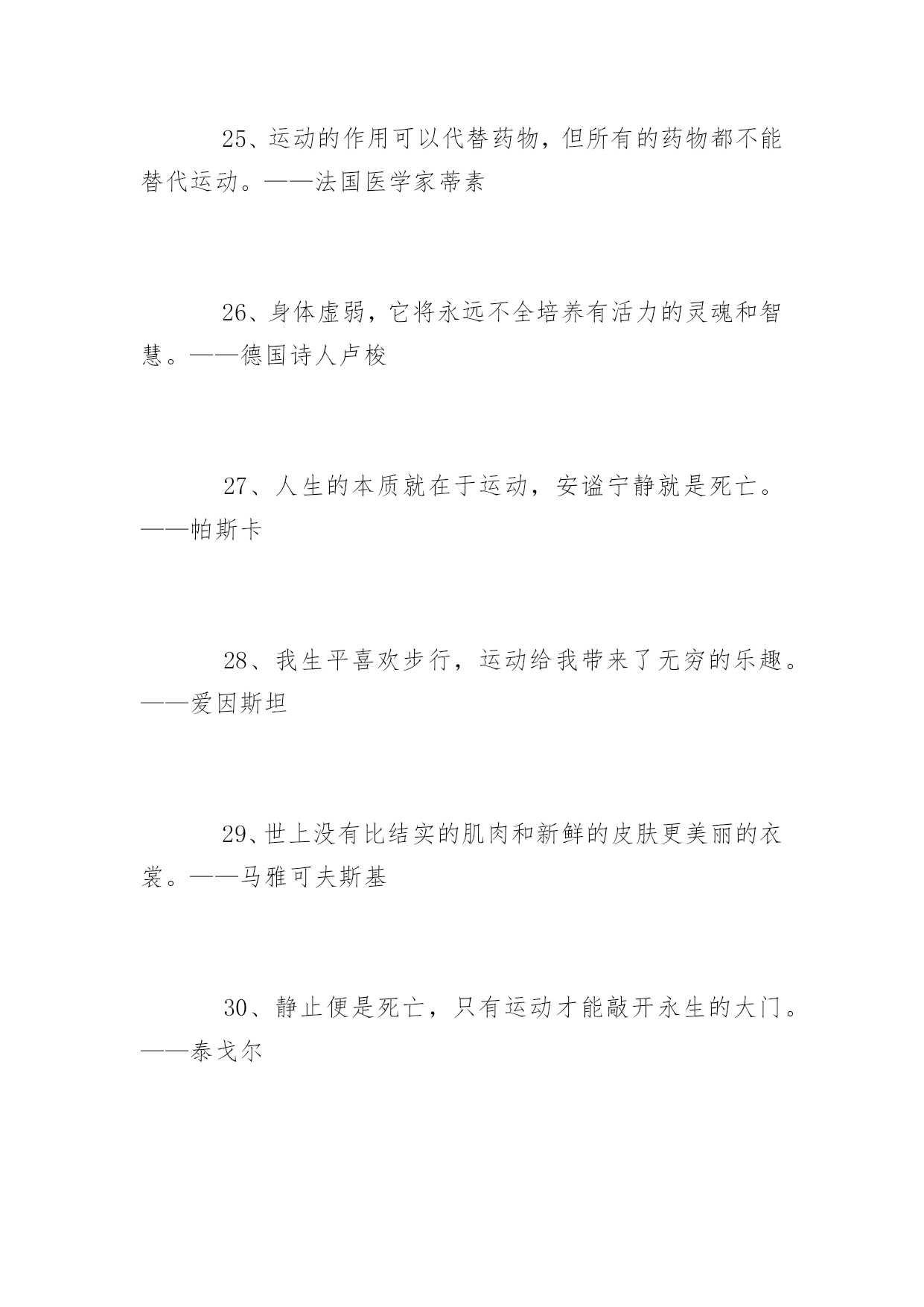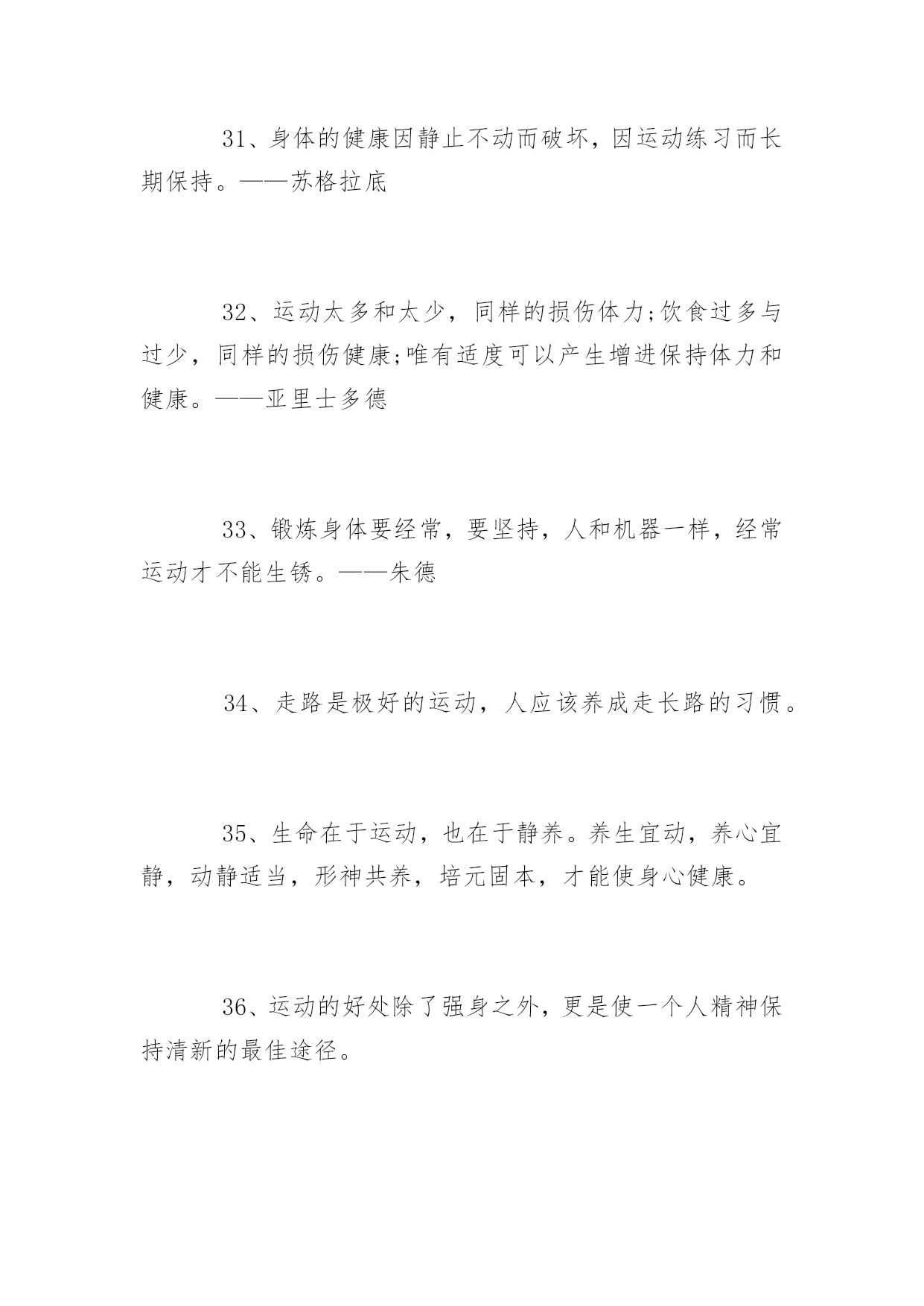 生命在于运动的名言1、不言体育而空言道德,空言智识,言者暗矣,听者心厌矣,究于事实何俾华考范文网能使他养成忍受痛苦的习惯;为了使他将来受得住关节脱落腹痛和疾病的折磨,就必须使他历尽体育锻炼的种种艰苦。2、长期的身体毛病使最光明的前途蒙上阴暗,而强健的活力就使不幸的境遇也能放金光。3、高尚的娱乐,对人生是宝贵的恩物。4、各种娱乐的高下优劣,最能显示那个人的高下优劣。5、缓慢而有恒赢得竞赛。6、活动是生活的基础!7、教育上的秘诀,便是使身心两种锻炼可以互相调剂。才能使他养成忍受痛苦的习惯;为了使他将来受得住关节脱落腹痛和疾病的折磨,就必须使他历尽体育锻炼的种种艰苦。8、日复一日地坚持练下去吧,只有活动适量才能保持训练的热情和提高运动的技能。9、身体既是心智的基础,发展心智不能使身体吃亏。10、身体教育和知识教育之间必须保持平衡。体育应造就体格健壮的勇士,并且使健全的精神寓于健全的体格。11、生命在于运动。12、体操和音乐二个方面并重,才能够成为完全的人格。因为体操能锻炼身体,音乐可以陶冶精神。13、体育竞赛之最绝妙处乃由于它只在手做,不在口说。14、一个埋头脑力劳动的人,如果不经常活动四肢,那是一件极其痛苦的事情。15、娱乐是花,实务是根。如果要欣赏花的美丽,必须首先加强根的牢固。16、运动是一切生命的源泉。17、运动太多和太少,同样的损伤体力;饮食过多与过少,同样的损伤健康;唯有适度可以产生增进保持体力和健康。18、生命在于运动。——伏尔泰19、运动是一切生命的源泉。——达芬奇20、只有运动才可以除去各种各样的疑虑。——歌德21、生命就是运动,人的生命就是运动。——列夫托尔斯泰22、生命在于矛盾,在于运动,一旦矛盾消除,运动停止,生命也就结束了。——歌德23、努力发展体育事业,把我们的国民锻炼成为身体健康精神愉快的人。——朱德24、一个民族,老当益壮的人多,那个民族一定强;一个民族,未老先衰的人多,那个民族一定弱。——皮埃尔·顾拜旦25、运动的作用可以代替药物,但所有的药物都不能替代运动。——法国医学家蒂素26、身体虚弱,它将永远不全培养有活力的灵魂和智慧。——德国诗人卢梭27、人生的本质就在于运动,安谧宁静就是死亡。——帕斯卡28、我生平喜欢步行,运动给我带来了无穷的乐趣。——爱因斯坦29、世上没有比结实的肌肉和新鲜的皮肤更美丽的衣裳。——马雅可夫斯基30、静止便是死亡,只有运动才能敲开永生的大门。——泰戈尔31、身体的健康因静止不动而破坏,因运动练习而长期保持。——苏格拉底32、运动太多和太少,同样的损伤体力;饮食过多与过少,同样的损伤健康;唯有适度可以产生增进保持体力和健康。——亚里士多德33、锻炼身体要经常,要坚持,人和机器一样,经常运动才不能生锈。——朱德34、走路是极好的运动,人应该养成走长路的习惯。35、生命在于运动,也在于静养。养生宜动,养心宜静,动静适当,形神共养,培元固本,才能使身心健康。36、运动的好处除了强身之外,更是使一个人精神保持清新的最佳途径。37、运动的要义不在趣味而在继续持久,养成习惯。38、人的健全,不但靠饮食,尤靠运动。39、健康是幸福的主要因素,锻炼是健康的重要保证。40、不靠医,不靠药,天天锻炼最见效。——谚语41、运动好比灵芝草,何必苦把仙方找。——谚语42、早起活活腰,一天精神好。——谚语