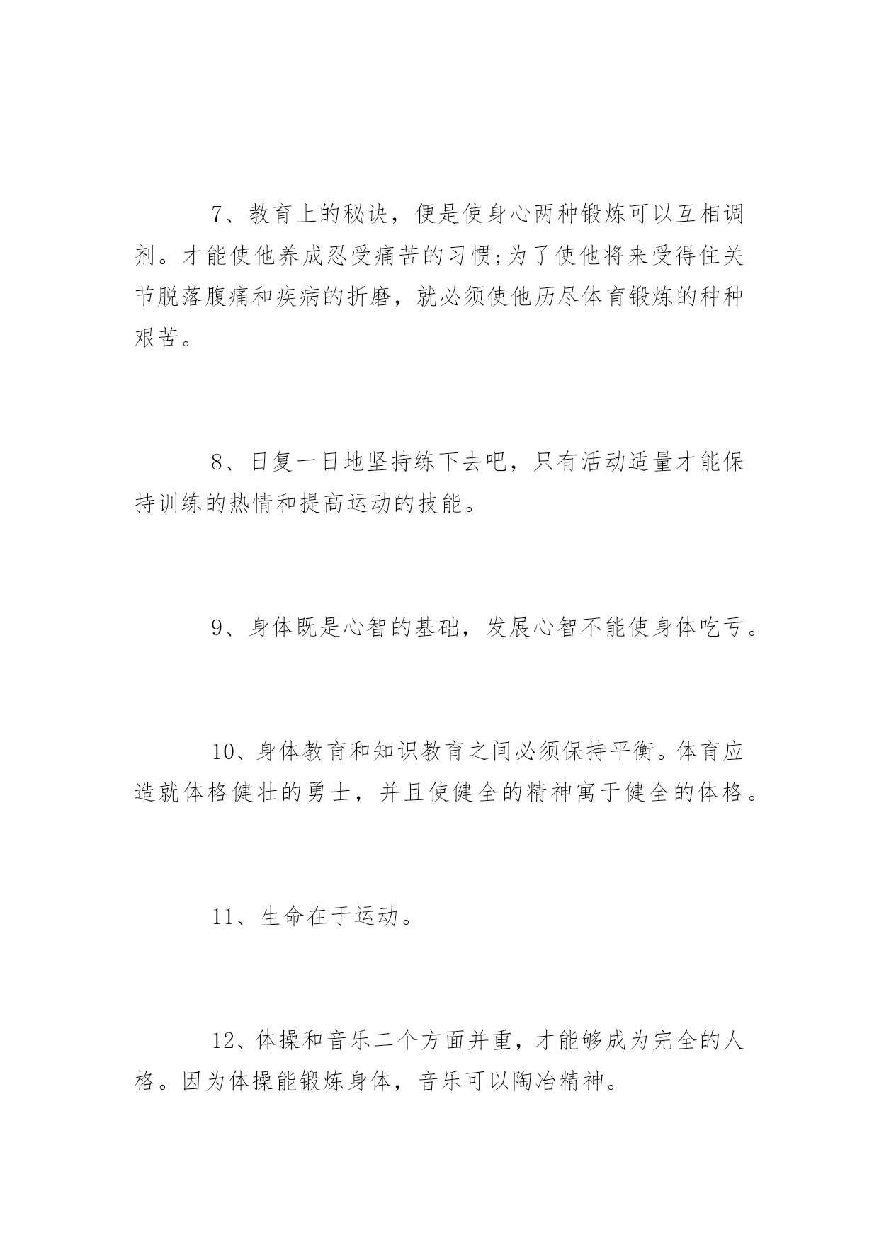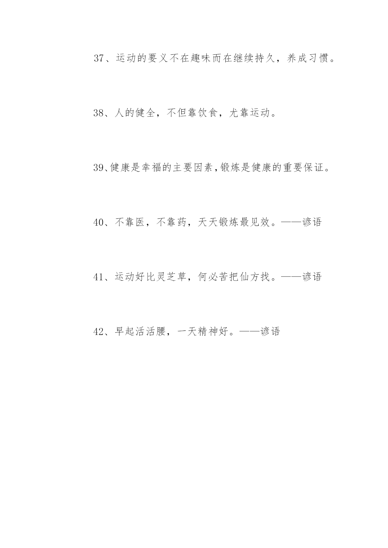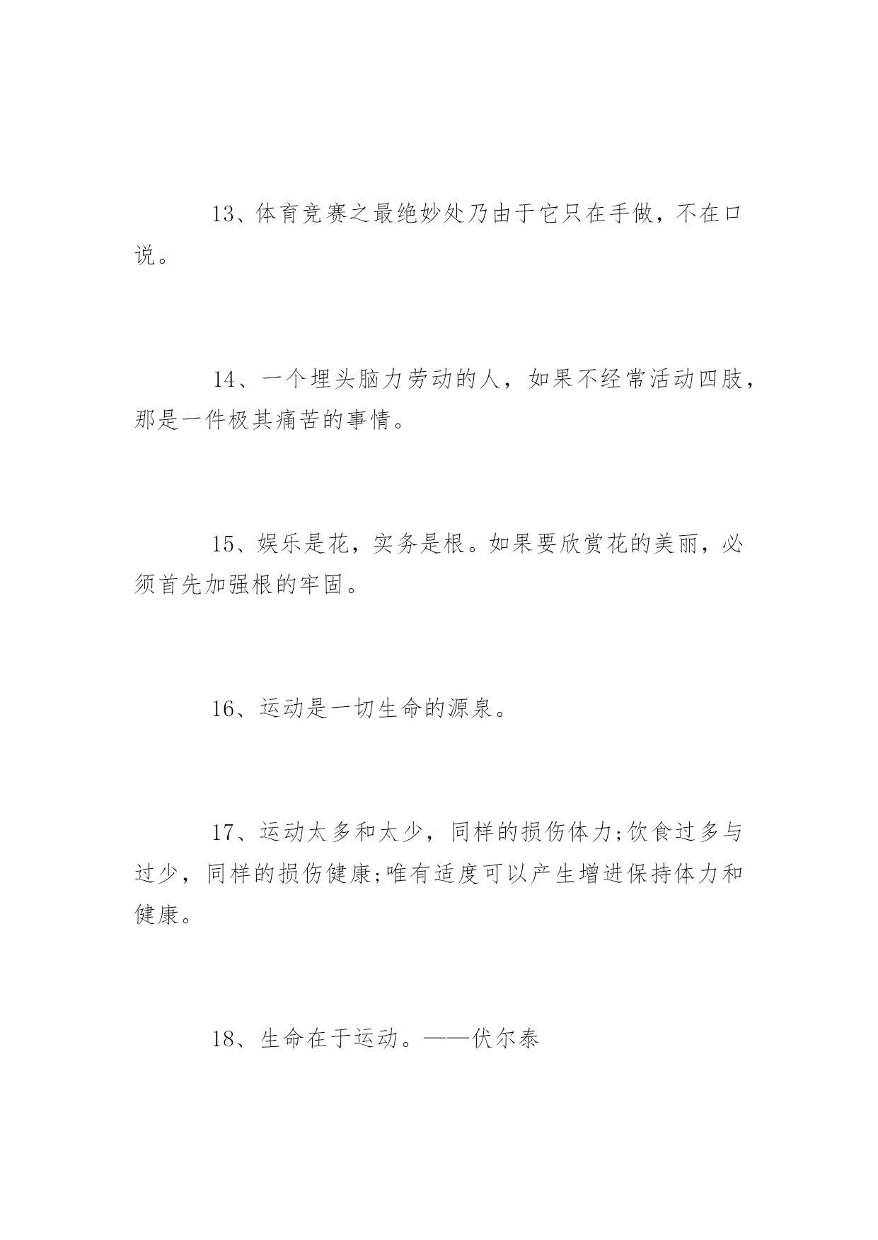 生命在于运动的名言1、不言体育而空言道德,空言智识,言者暗矣,听者心厌矣,究于事实何俾华考范文网能使他养成忍受痛苦的习惯;为了使他将来受得住关节脱落腹痛和疾病的折磨,就必须使他历尽体育锻炼的种种艰苦。2、长期的身体毛病使最光明的前途蒙上阴暗,而强健的活力就使不幸的境遇也能放金光。3、高尚的娱乐,对人生是宝贵的恩物。4、各种娱乐的高下优劣,最能显示那个人的高下优劣。5、缓慢而有恒赢得竞赛。6、活动是生活的基础!7、教育上的秘诀,便是使身心两种锻炼可以互相调剂。才能使他养成忍受痛苦的习惯;为了使他将来受得住关节脱落腹痛和疾病的折磨,就必须使他历尽体育锻炼的种种艰苦。8、日复一日地坚持练下去吧,只有活动适量才能保持训练的热情和提高运动的技能。9、身体既是心智的基础,发展心智不能使身体吃亏。10、身体教育和知识教育之间必须保持平衡。体育应造就体格健壮的勇士,并且使健全的精神寓于健全的体格。11、生命在于运动。12、体操和音乐二个方面并重,才能够成为完全的人格。因为体操能锻炼身体,音乐可以陶冶精神。13、体育竞赛之最绝妙处乃由于它只在手做,不在口说。14、一个埋头脑力劳动的人,如果不经常活动四肢,那是一件极其痛苦的事情。15、娱乐是花,实务是根。如果要欣赏花的美丽,必须首先加强根的牢固。16、运动是一切生命的源泉。17、运动太多和太少,同样的损伤体力;饮食过多与过少,同样的损伤健康;唯有适度可以产生增进保持体力和健康。18、生命在于运动。——伏尔泰19、运动是一切生命的源泉。——达芬奇20、只有运动才可以除去各种各样的疑虑。——歌德21、生命就是运动,人的生命就是运动。——列夫托尔斯泰22、生命在于矛盾,在于运动,一旦矛盾消除,运动停止,生命也就结束了。——歌德23、努力发展体育事业,把我们的国民锻炼成为身体健康精神愉快的人。——朱德24、一个民族,老当益壮的人多,那个民族一定强;一个民族,未老先衰的人多,那个民族一定弱。——皮埃尔·顾拜旦25、运动的作用可以代替药物,但所有的药物都不能替代运动。——法国医学家蒂素26、身体虚弱,它将永远不全培养有活力的灵魂和智慧。——德国诗人卢梭27、人生的本质就在于运动,安谧宁静就是死亡。——帕斯卡28、我生平喜欢步行,运动给我带来了无穷的乐趣。——爱因斯坦29、世上没有比结实的肌肉和新鲜的皮肤更美丽的衣裳。——马雅可夫斯基30、静止便是死亡,只有运动才能敲开永生的大门。——泰戈尔31、身体的健康因静止不动而破坏,因运动练习而长期保持。——苏格拉底32、运动太多和太少,同样的损伤体力;饮食过多与过少,同样的损伤健康;唯有适度可以产生增进保持体力和健康。——亚里士多德33、锻炼身体要经常,要坚持,人和机器一样,经常运动才不能生锈。——朱德34、走路是极好的运动,人应该养成走长路的习惯。35、生命在于运动,也在于静养。养生宜动,养心宜静,动静适当,形神共养,培元固本,才能使身心健康。36、运动的好处除了强身之外,更是使一个人精神保持清新的最佳途径。37、运动的要义不在趣味而在继续持久,养成习惯。38、人的健全,不但靠饮食,尤靠运动。39、健康是幸福的主要因素,锻炼是健康的重要保证。40、不靠医,不靠药,天天锻炼最见效。——谚语41、运动好比灵芝草,何必苦把仙方找。——谚语42、早起活活腰,一天精神好。——谚语