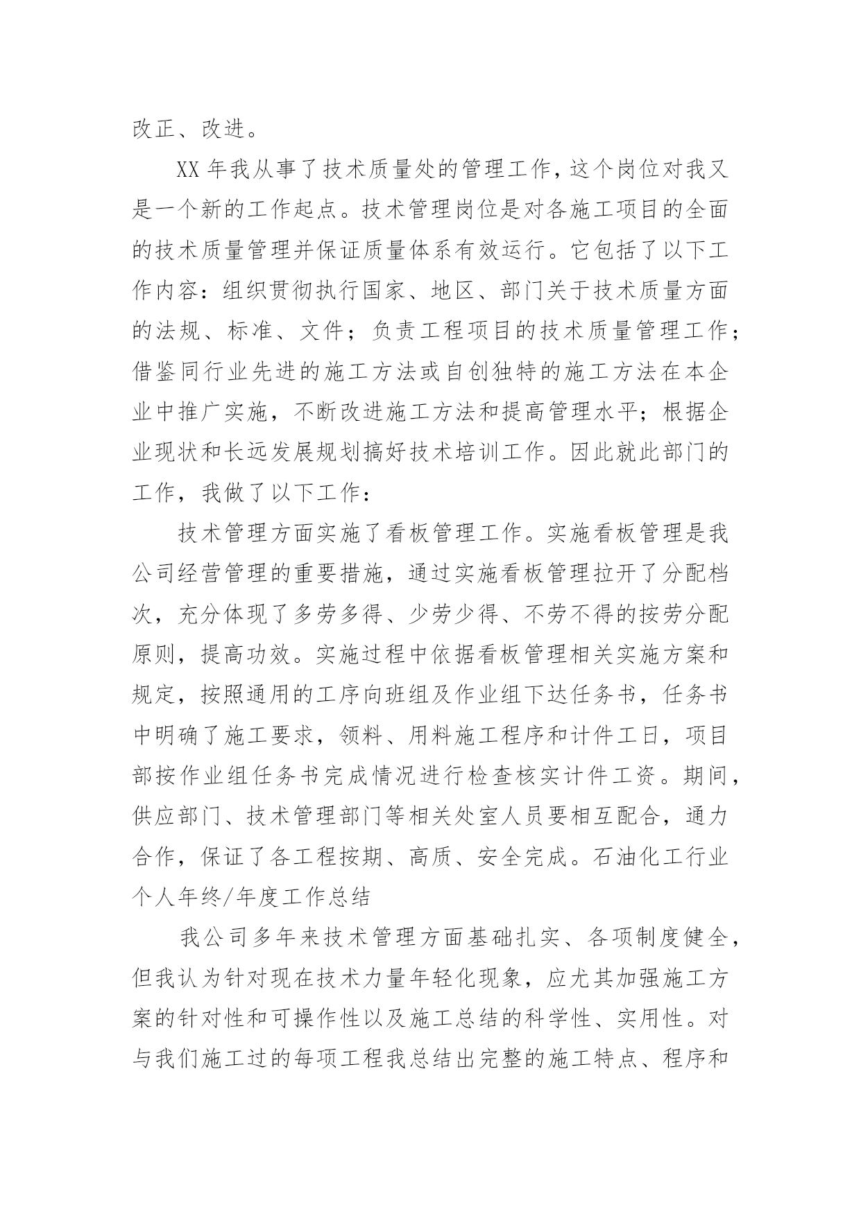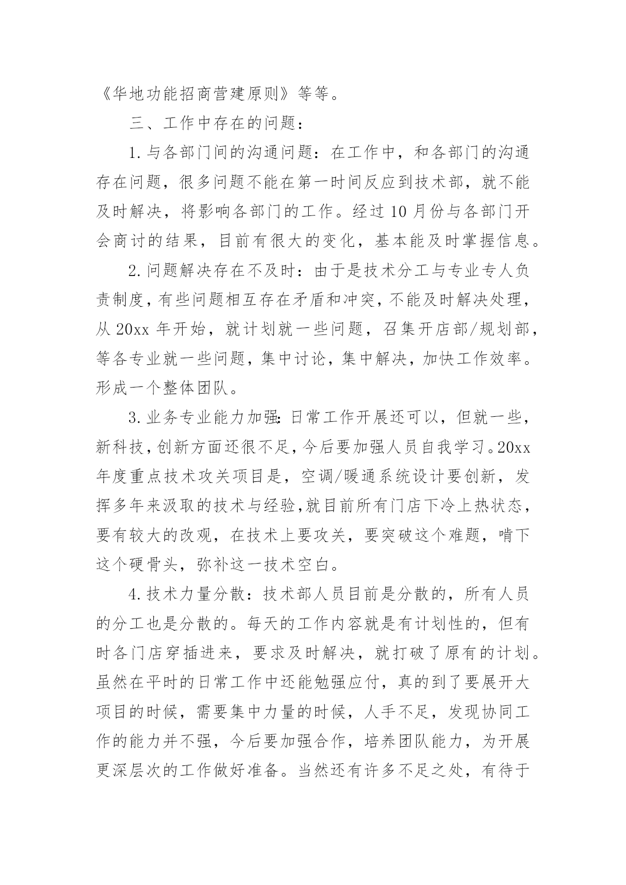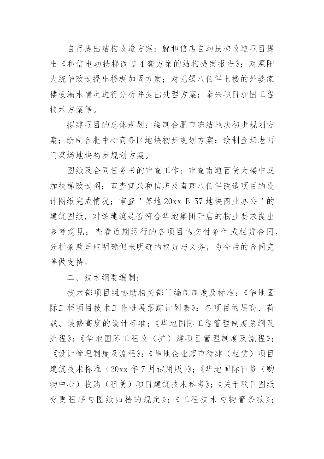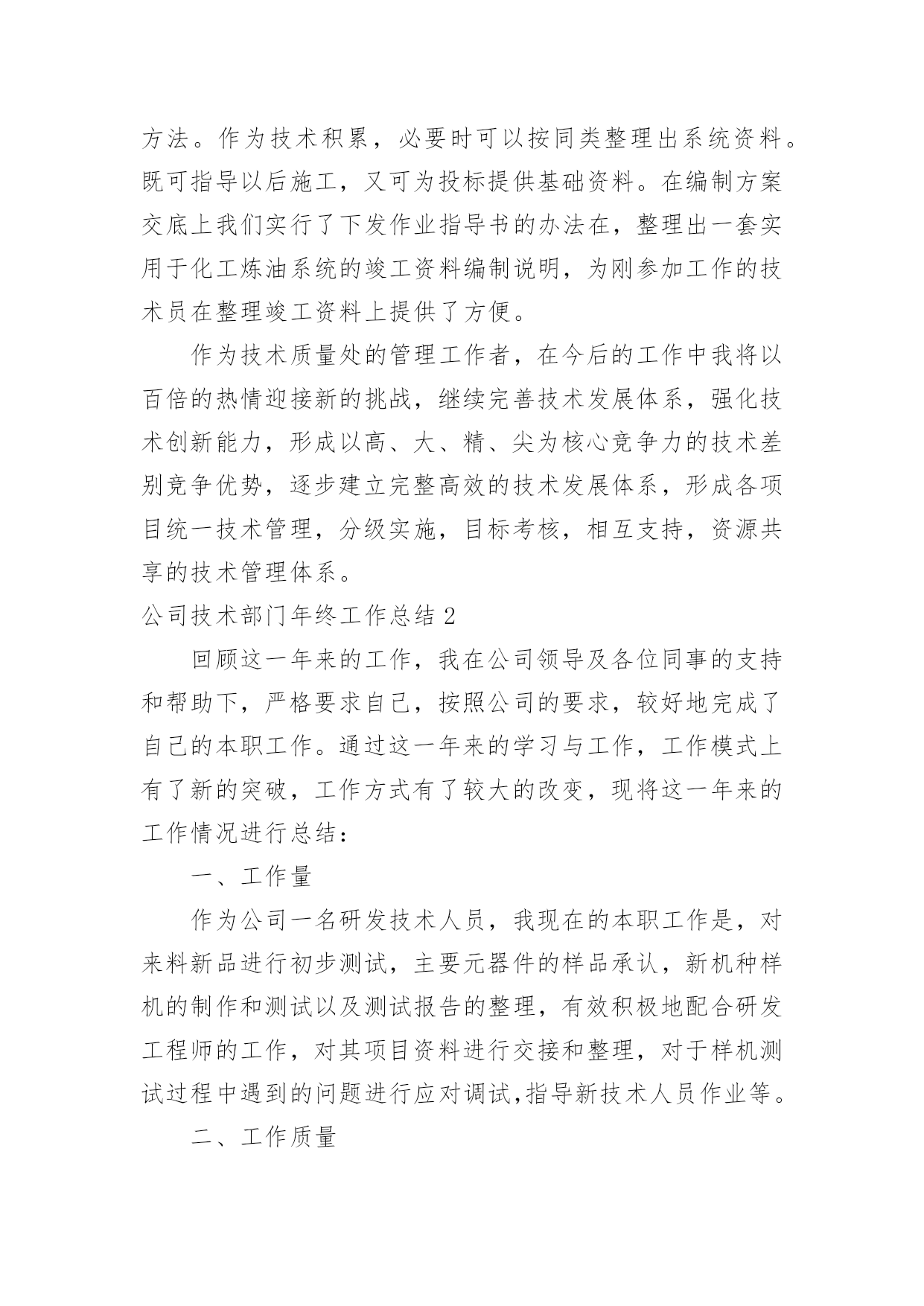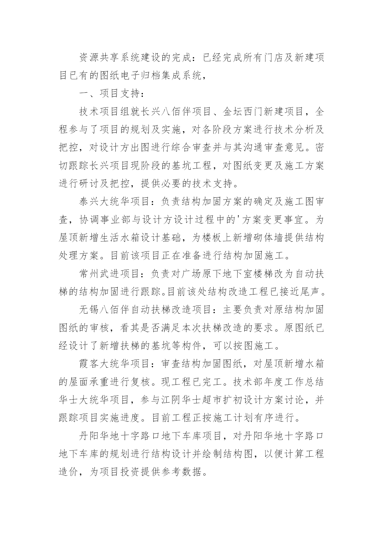 公司技术部门年终工作总结公司技术部门年终工作总结总结就是对一个时期的学习、工作或其完成情况进行一次全面系统的回顾和分析的书面材料,写总结有利于我们学习和工作能力的提高,不如静下心来好好写写总结吧。总结你想好怎么写了吗?下面是小编帮大家整理的公司技术部门年终工作总结,欢迎大家借鉴与参考,希望对大家有所帮助。公司技术部门年终工作总结1在过去的20xx年里,技术部门所有人员在不断的学习中,逐渐熟悉公司新的管理模式和新的文件流程方式;本着对工作认真负责的态度,参加各种工程会议;,认真检查、跟踪落实各分项工程施工质量及进展情况;了解工程动态,对有可能出现问题的项目进行事前预控,将损失降到最小。维护公司利益,把公司的利益放在首位;尽忠于公司,把公司的事业与自身的发展融为一体;尽责于本职工作,均没有缺习早退现象,没有任何工程师受过任何处分;互相能妥善处理好同事之间的关系,积极发挥团队合作精神,基本能按时努力完成领导下达的各项指标任务,对工程提出理论性、经验性、实际性建议,促使工程顺利圆满。在过去一年中,技术部的工作任务是繁杂/繁琐的一年,回顾20xx年的工作,技术部工作总结如下:资源共享系统建设的完成:已经完成所有门店及新建项目已有的图纸电子归档集成系统,一、项目支持:技术项目组就长兴八佰伴项目、金坛西门新建项目,全程参与了项目的规划及实施,对各阶段方案进行技术分析及把控,对设计方出图进行综合审查并与其沟通审查意见。密切跟踪长兴项目现阶段的基坑工程,对图纸变更及施工方案进行研讨及把控,提供必要的技术支持。泰兴大统华项目:负责结构加固方案的确定及施工图审查,协调事业部与设计方设计过程中的'方案变更事宜。为屋顶新增生活水箱设计基础,为楼板上新增砌体墙提供结构处理方案。目前该项目正在准备进行结构加固施工。常州武进项目:负责对广场原下地下室楼梯改为自动扶梯的结构加固进行跟踪。目前该处结构改造工程已接近尾声。无锡八佰伴自动扶梯改造项目:主要负责对原结构加固图纸的审核,看其是否满足本次扶梯改造的要求。原图纸已经设计了新增扶梯的基坑等构件,可以按图施工。霞客大统华项目:审查结构加固图纸,对屋顶新增水箱的屋面承重进行复核。现工程已完工。技术部年度工作总结华士大统华项目,参与江阴华士超市扩初设计方案讨论,并跟踪项目实施进度。目前工程正按施工计划有序进行。丹阳华地十字路口地下车库项目,对丹阳华地十字路口地下车库的规划进行结构设计并绘制结构图,以便计算工程造价,为项目投资提供参考数据。自行提出结构改造方案:就和信店自动扶梯改造项目提出《和信电动扶梯改造4套方案的结构提案报告》;对溧阳大统华改造提出楼板加固方案;对无锡八佰伴七楼的外婆家楼板漏水情况进行分析并提出处理方案;泰兴项目加固工程技术方案等。拟建项目的总体规划:绘制合肥市冻结地块初步规划方案;绘制合肥中心商务区地块初步规划方案;绘制金坛老西门菜场地块初步规划方案。图纸及合同任务书的审查工作:审查南通百货大楼中庭加扶梯改造图;审查宜兴和信店及南京八佰伴改造项目的设计图纸完成情况;审查"苏地20xx-B-57地块商业办公"的建筑图纸,对该建筑是否符合华地集团开店的物业要求提出参考意见;查看近期运行的各项目的交付条件或租赁合同,分析条款里应明确但未明确的权责与义务,为今后的合同完善做支持。二、技术纲要编制:技术部项目组协助相关部门编制制度及标准:《华地国际工程项目技术工作进展跟踪计划表》;各项目的层高、荷载、装修高度的设计标准;《华地国际工程管理制度总纲及流程》;《华地国际工程改(扩)建项目管理制度及流程》;《设计管理制度及流程》;《华地企业超市待建(租赁)项目建筑技术标准(20xx年7月试用版)》;《华地国际百货(购物中心)收购(租赁)项目建筑技术参考》;《关于项目图纸变更程序与图纸归档的规定》;《工程技术与物管条款》;《华地功能招商营建原则》等等。三、工作中存在的问题:1.与各部门间的沟通问题:在工作中,和各部门的沟通存在问题,很多问题不能在第一时间反应到技术部,就不能及时解决,将影响各部门的工作。经过10月份与各部门开会商讨的结果,目前有很大的变化,基本能及时掌握信息。2.问题解决存在不及时:由于是技术分工与专业专人负责制度,有些问题相互存在矛盾和冲突,不能及时解决处理,从20xx年开始,就计划就一些问题,召集开店部/规划部,等各专业就一些问题,集中讨论,集中解决,加快工作效率。形成一个整体团队。3.业务专业能力加强:日常工作开展还可以,但就一些,新科技,创新方面还很不足,今后要加强人员自我学习。20xx年度重点技术攻关项目是,空调/暖通系统设计要创新,发挥多年来汲取的技术与经验,就目前所有门店下冷上热状态,要有较大的改观,在技术上要攻关,要突破这个难题,啃下这个硬骨头,弥补这一技术空白。4.技术力量分