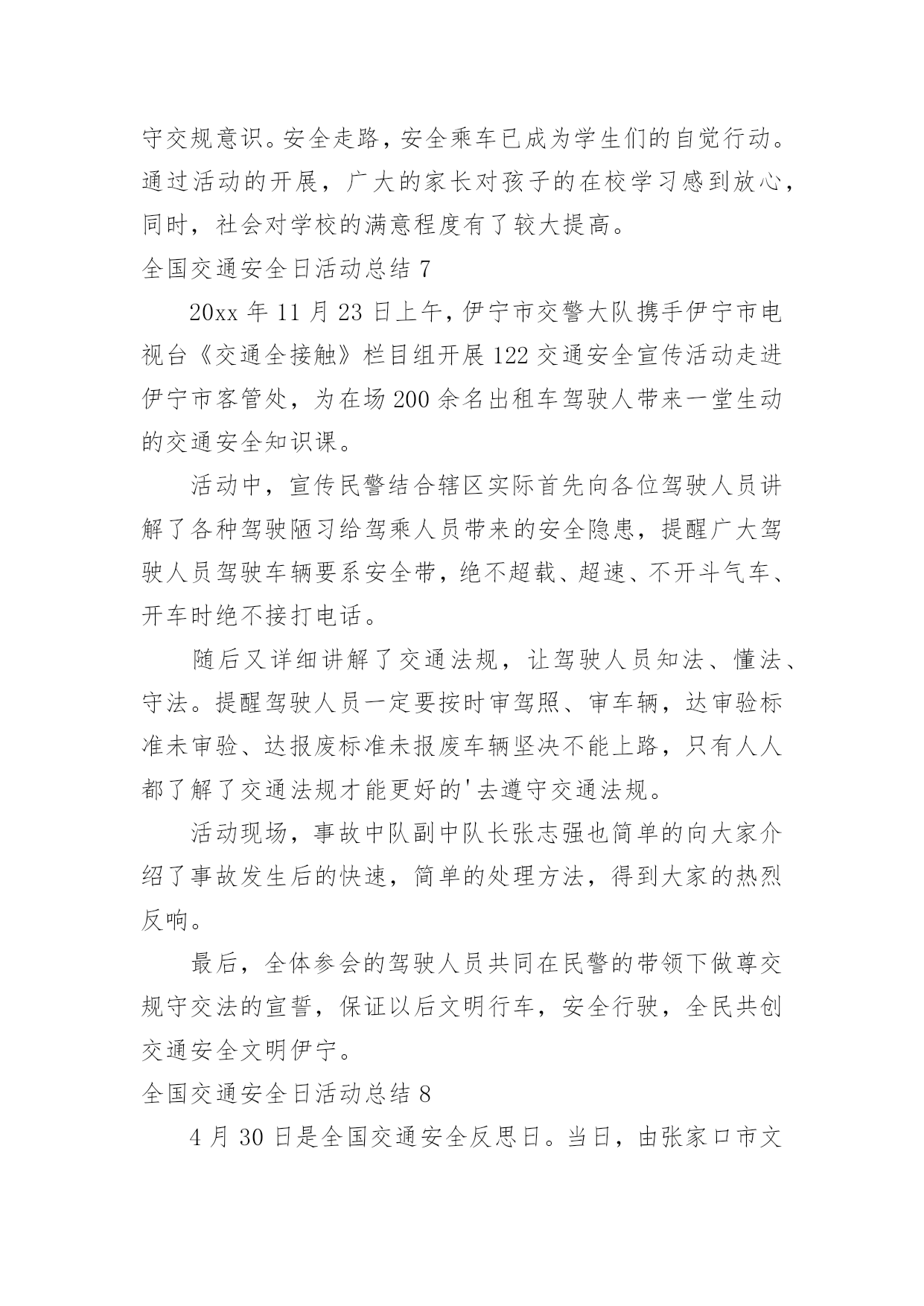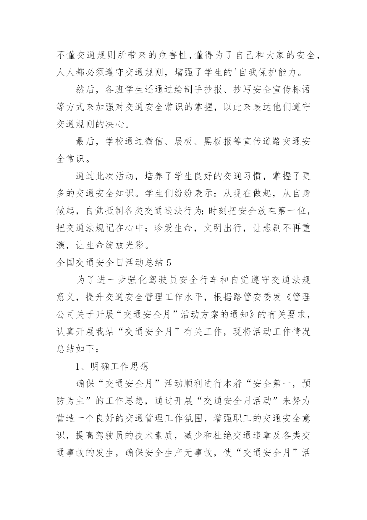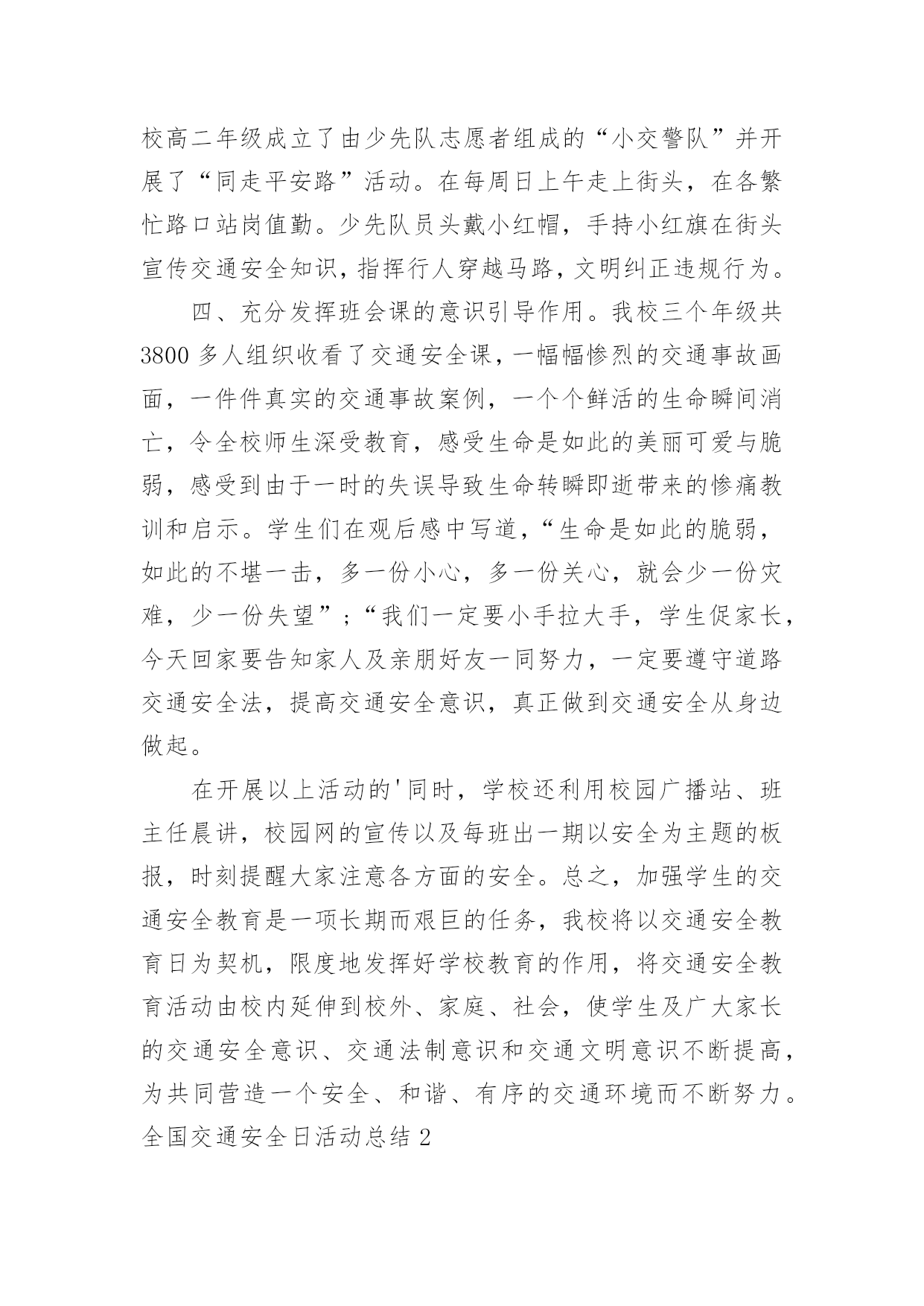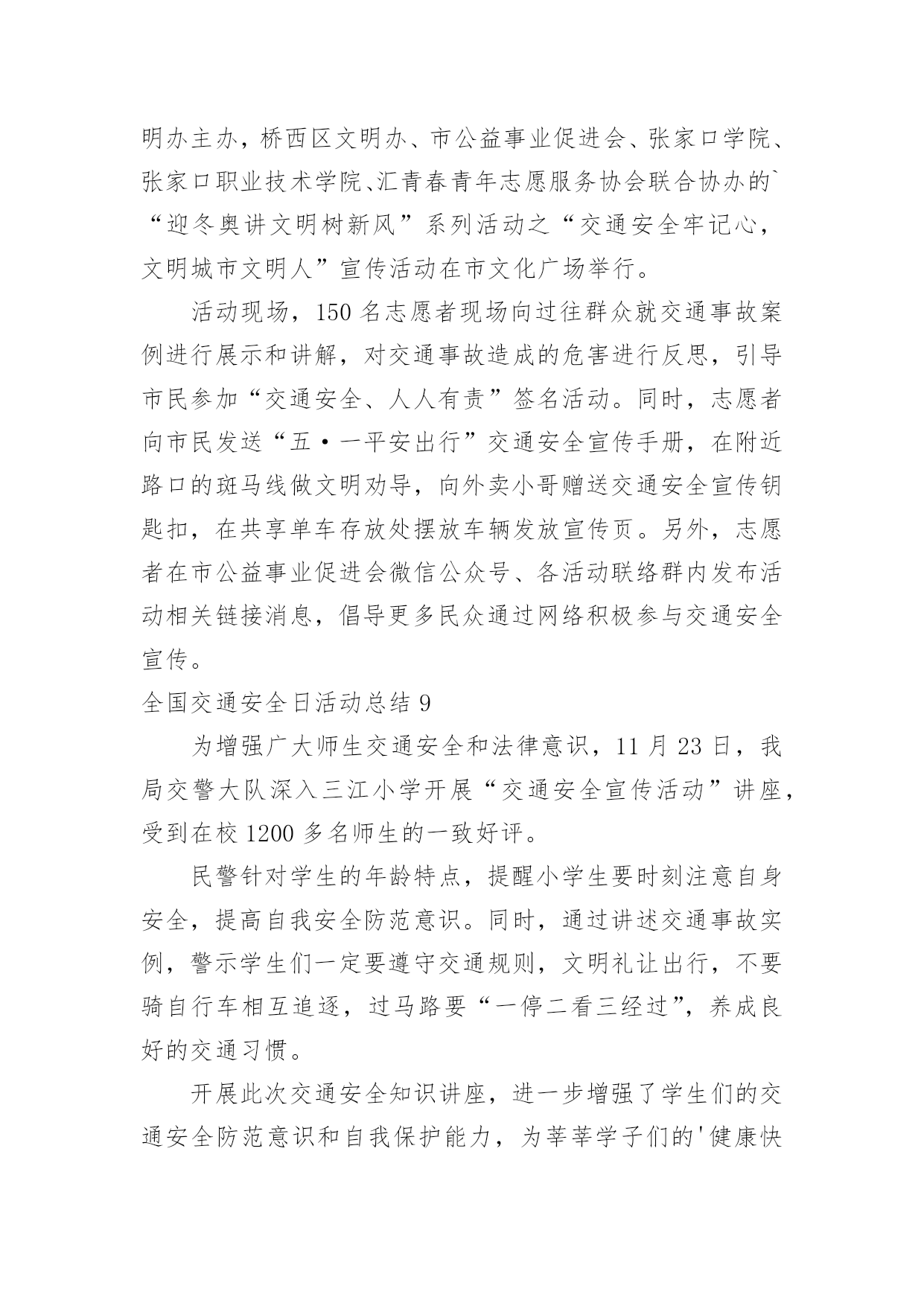 全国交通安全日活动总结全国交通安全日活动总结(合集15篇)总结是把一定阶段内的有关情况分析研究,做出有指导性结论的书面材料,它能够使头脑更加清醒,目标更加明确,不如我们来制定一份总结吧。如何把总结做到重点突出呢?下面是小编整理的全国交通安全日活动总结,希望能够帮助到大家。全国交通安全日活动总结1为了进一步提高我校师生的交通安全法制意识,预防和减少涉及学生的交通事故,我校开展了形式多样的安全教育活动,大力宣传了交通安全的重要性,提高了全体师生对交通安全重要性的认识,使“安全”一词更加深入人心。现就开展情况总结如下:一、利用国旗下讲话进行安全教育。12月3日周一课间操,我校学生处和德育处以交通安全为主题进行了讲话,提醒全校师生安全意识贵在平时,使大家受到了良好的安全教育。二、学生处在家长会时,给每位家长发放“致家长的一封信”,呼吁大家维护校园秩序和交通秩序,提高安全意识,为孩子的学习和生活创造良好的环境。三、“小交警”走上街头助岗值勤。自本学期开始,我校高二年级成立了由少先队志愿者组成的“小交警队”并开展了“同走平安路”活动。在每周日上午走上街头,在各繁忙路口站岗值勤。少先队员头戴小红帽,手持小红旗在街头宣传交通安全知识,指挥行人穿越马路,文明纠正违规行为。四、充分发挥班会课的意识引导作用。我校三个年级共3800多人组织收看了交通安全课,一幅幅惨烈的交通事故画面,一件件真实的交通事故案例,一个个鲜活的生命瞬间消亡,令全校师生深受教育,感受生命是如此的美丽可爱与脆弱,感受到由于一时的失误导致生命转瞬即逝带来的惨痛教训和启示。学生们在观后感中写道,“生命是如此的脆弱,如此的不堪一击,多一份小心,多一份关心,就会少一份灾难,少一份失望”;“我们一定要小手拉大手,学生促家长,今天回家要告知家人及亲朋好友一同努力,一定要遵守道路交通安全法,提高交通安全意识,真正做到交通安全从身边做起。在开展以上活动的'同时,学校还利用校园广播站、班主任晨讲,校园网的宣传以及每班出一期以安全为主题的板报,时刻提醒大家注意各方面的安全。总之,加强学生的交通安全教育是一项长期而艰巨的任务,我校将以交通安全教育日为契机,限度地发挥好学校教育的作用,将交通安全教育活动由校内延伸到校外、家庭、社会,使学生及广大家长的交通安全意识、交通法制意识和交通文明意识不断提高,为共同营造一个安全、和谐、有序的交通环境而不断努力。全国交通安全日活动总结24月30日讯4月30日,是全国交通安全反思日。为培养学生的交通安全意识,提高自我防范能力,滨州市沾化区富国街道开展“文明交通安全出行”主题宣传活动。活动中,民警通过讲解交通标识、发放各类宣传资料,分别从怎样安全走路、安全乘车等方面进行了详细的讲解,深入浅出地分析了遵守交通法规的重要性,教育学生们要从小养成遵守交通法规的好习惯,安全文明出行。沾化区富国街道明德小学学生xxx说:“通过这个活动,我会自主的学习关于交通安全的.知识,同时,在保证自己人身安全的同时也会尽可能保护他人。”通过此次活动,让学生们从小养成遵守交通法规、文明出行的良好习惯,确保他们健康快乐的成长,安全幸福的生活。全国交通安全日活动总结34月30日是“全国交通安全反思日”,为进一步强化师生交通安全意识,倡议同学们注意交通安全,学习,遵守交通规则,在今年的全国交通安全反思日来临之际,里塘小学围绕“遵守交通规则,保障生命安全”这一主题开展了系列活动。首先,各班级利用班会进行交通,在班会上,各班班主任首先介绍了“全国交通安全反思日”的由来,告诫学生要尊重人的生存价值及生存权利,珍惜对于每个人只有一次的宝贵生命。接着,班主任重点讲解了交通安全常识及有关的交通安全法规,增加了学生对交通安全知识的储备。通过观看《小学生交通安全宣传片》使学生更加直观地认识不懂交通规则所带来的危害性,懂得为了自己和大家的安全,人人都必须遵守交通规则,增强了学生的自我保护能力。然后,各班学生还通过绘制、抄写安全宣传等方式来加强对交通安全常识的.掌握,以此来表达他们遵守交通规则的决心。最后,学校通过微信、展板、等宣传道路交通安全常识。通过此次活动,培养了学生良好的交通习惯,掌握了更多的交通安全知识。学生们纷纷表示:从现在做起,从自身做起,自觉抵制各类交通违法行为;时刻把安全放在第一位,把交通法规记在心中;珍爱生命,文明出行,让悲剧不再重演,让生命绽放光彩。全国交通安全日活动总结44月30日是“全国交通安全反思日”,为进一步强化师生交通安全意识,倡议同学们注意交通安全,学习交通安全知识,遵守交通规则,在今年的全国交通安全反思日来临之际,里塘小学围绕“遵守交通规则,保障生命安全”这一主题开展了系列活动。首先,各班级利用班会进行交通安全教育,在班会上,各班班主任首先介绍了“全国交通安全反思日”的由来,告诫