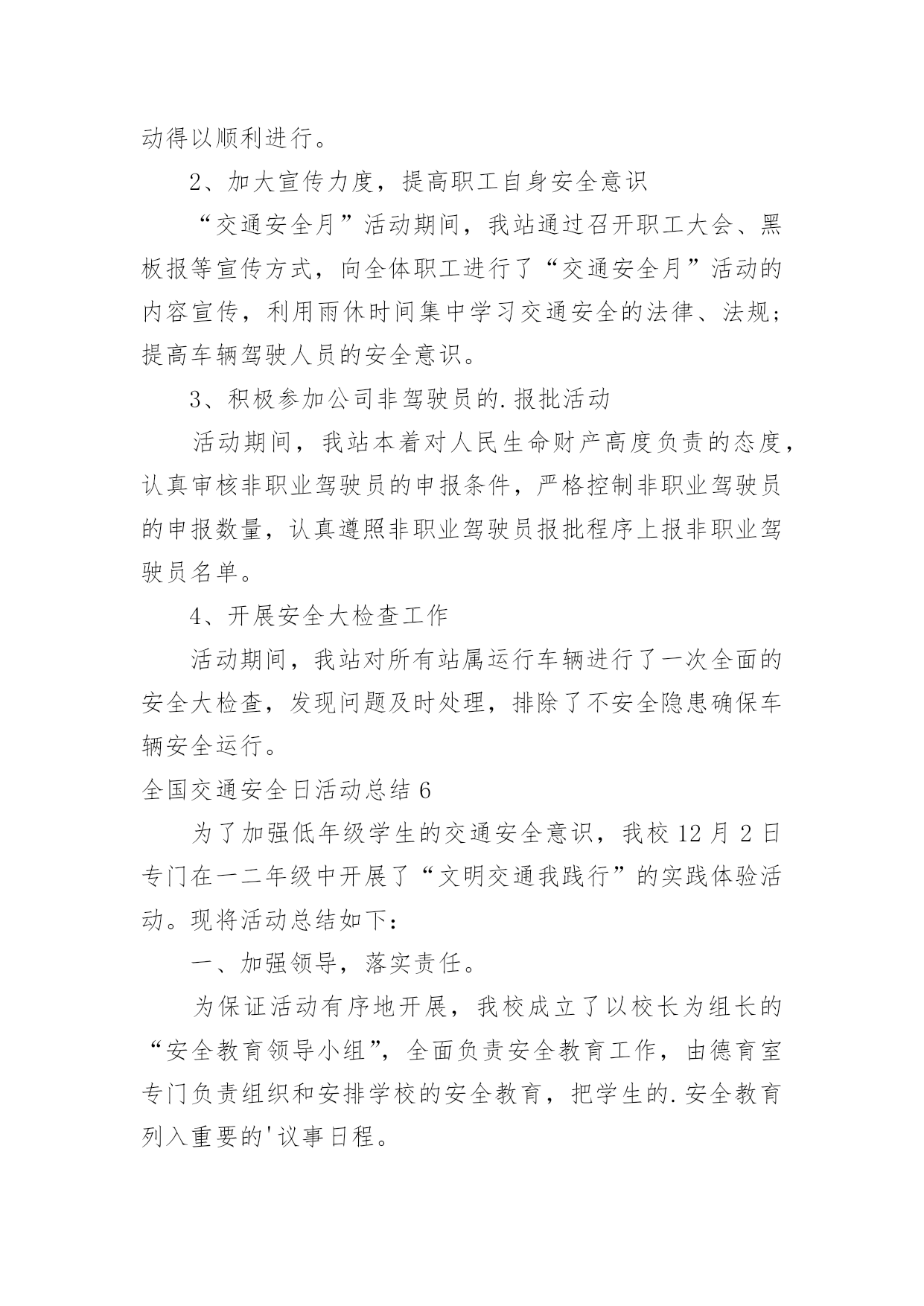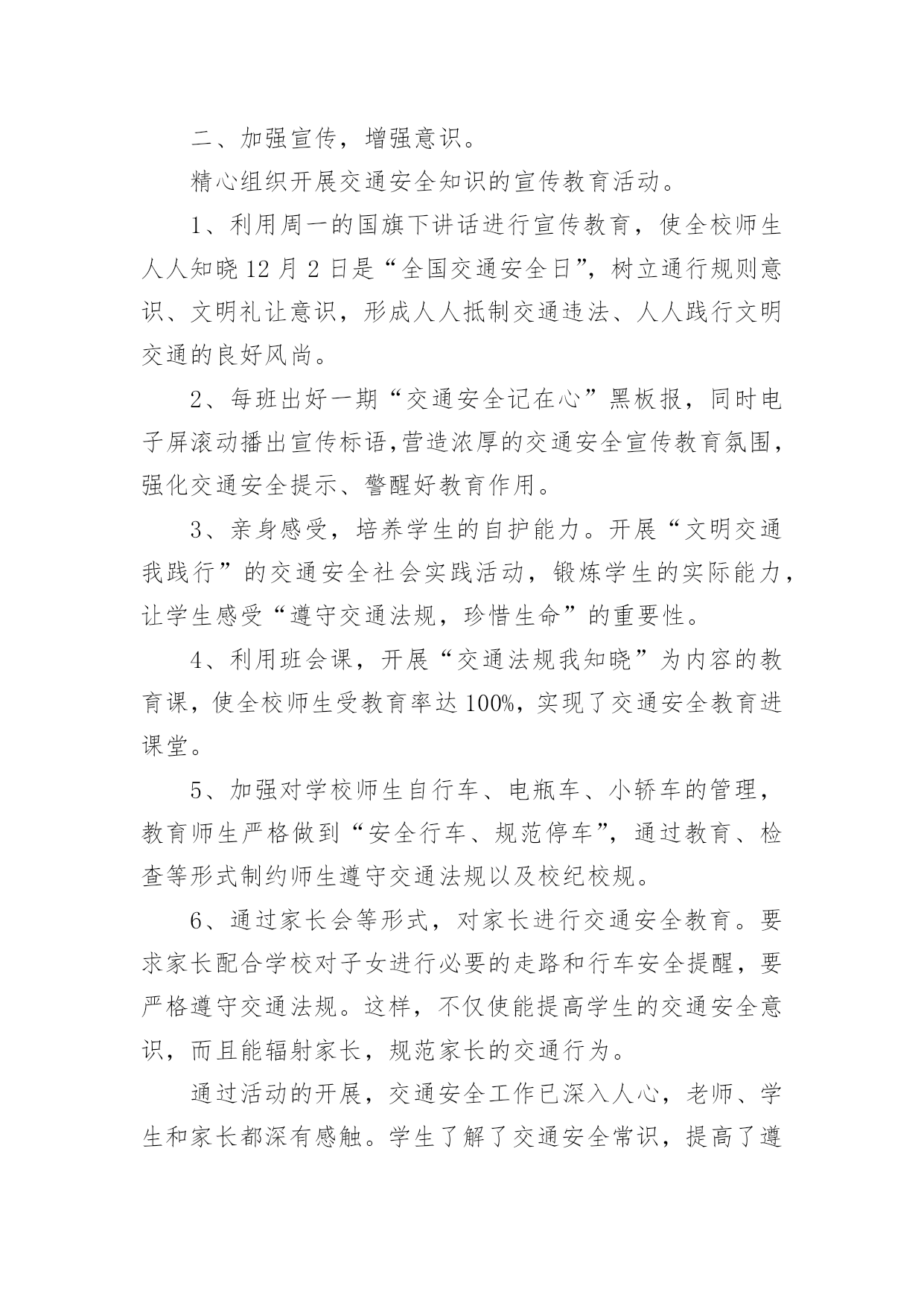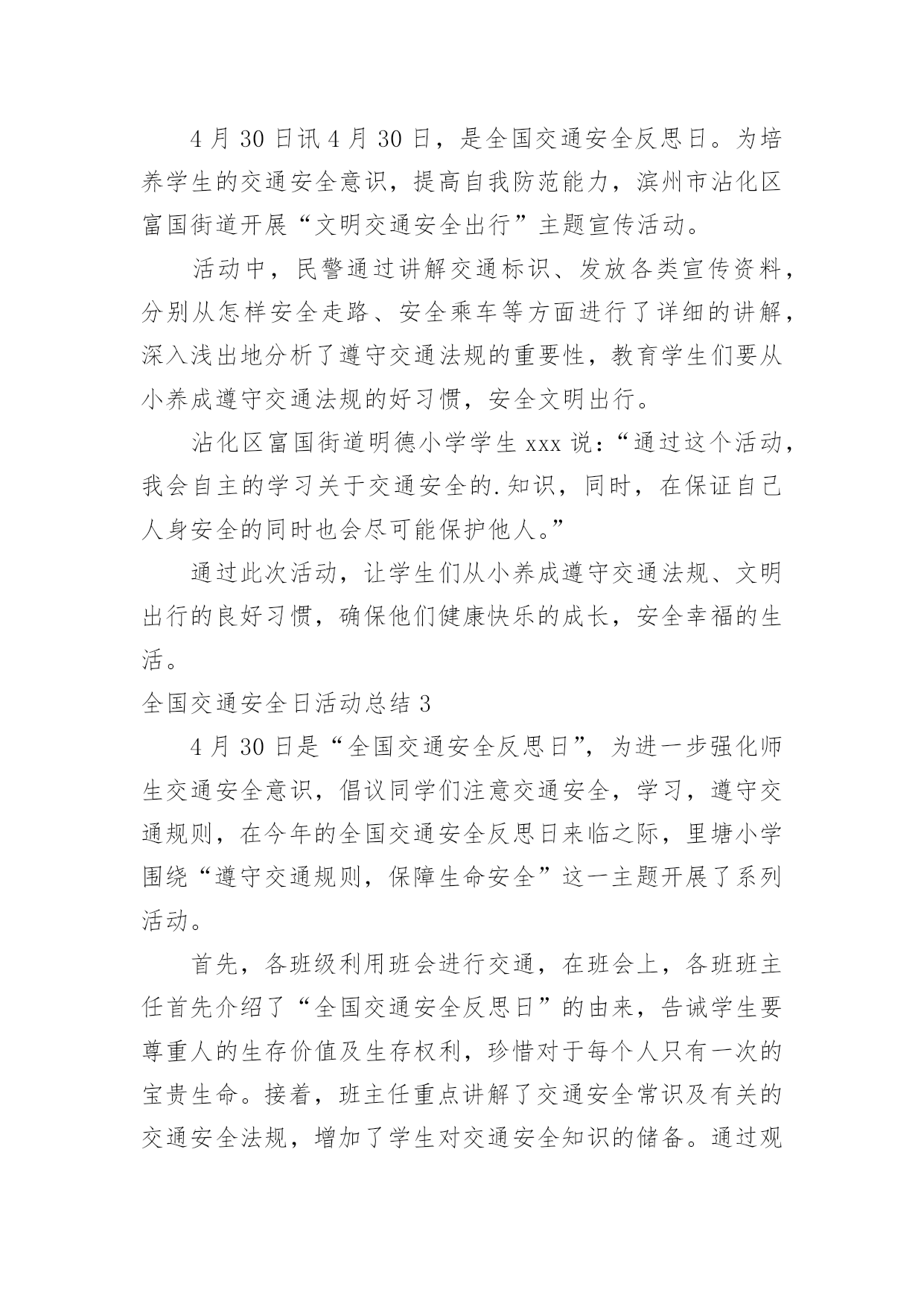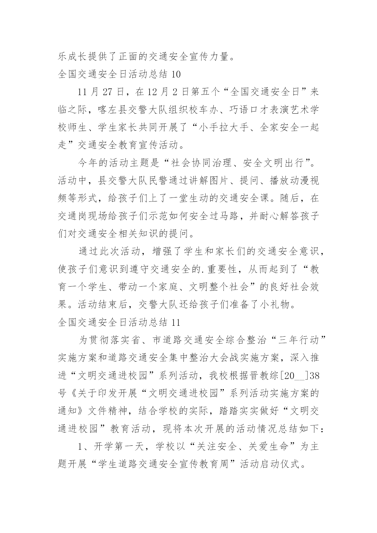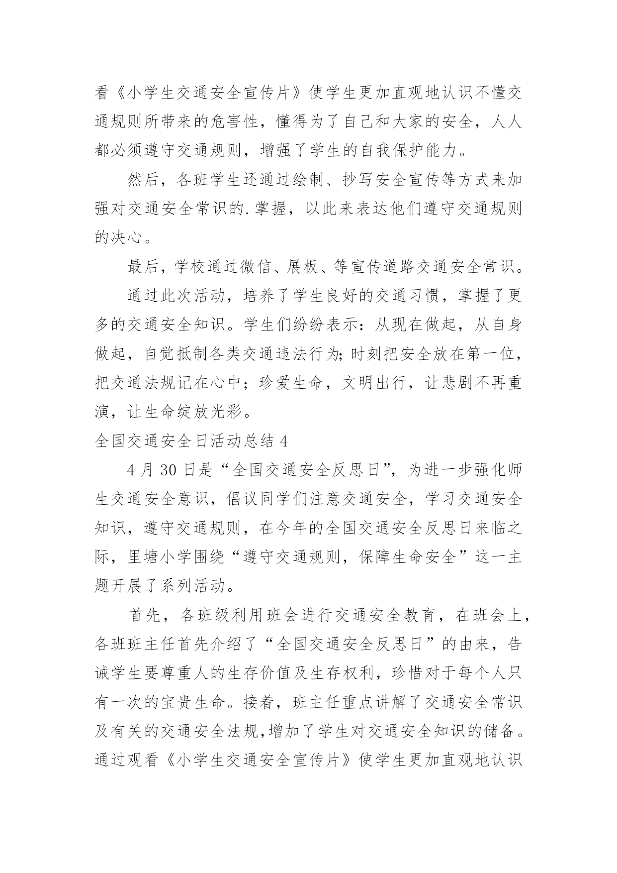 全国交通安全日活动总结全国交通安全日活动总结(合集15篇)总结是把一定阶段内的有关情况分析研究,做出有指导性结论的书面材料,它能够使头脑更加清醒,目标更加明确,不如我们来制定一份总结吧。如何把总结做到重点突出呢?下面是小编整理的全国交通安全日活动总结,希望能够帮助到大家。全国交通安全日活动总结1为了进一步提高我校师生的交通安全法制意识,预防和减少涉及学生的交通事故,我校开展了形式多样的安全教育活动,大力宣传了交通安全的重要性,提高了全体师生对交通安全重要性的认识,使“安全”一词更加深入人心。现就开展情况总结如下:一、利用国旗下讲话进行安全教育。12月3日周一课间操,我校学生处和德育处以交通安全为主题进行了讲话,提醒全校师生安全意识贵在平时,使大家受到了良好的安全教育。二、学生处在家长会时,给每位家长发放“致家长的一封信”,呼吁大家维护校园秩序和交通秩序,提高安全意识,为孩子的学习和生活创造良好的环境。三、“小交警”走上街头助岗值勤。自本学期开始,我校高二年级成立了由少先队志愿者组成的“小交警队”并开展了“同走平安路”活动。在每周日上午走上街头,在各繁忙路口站岗值勤。少先队员头戴小红帽,手持小红旗在街头宣传交通安全知识,指挥行人穿越马路,文明纠正违规行为。四、充分发挥班会课的意识引导作用。我校三个年级共3800多人组织收看了交通安全课,一幅幅惨烈的交通事故画面,一件件真实的交通事故案例,一个个鲜活的生命瞬间消亡,令全校师生深受教育,感受生命是如此的美丽可爱与脆弱,感受到由于一时的失误导致生命转瞬即逝带来的惨痛教训和启示。学生们在观后感中写道,“生命是如此的脆弱,如此的不堪一击,多一份小心,多一份关心,就会少一份灾难,少一份失望”;“我们一定要小手拉大手,学生促家长,今天回家要告知家人及亲朋好友一同努力,一定要遵守道路交通安全法,提高交通安全意识,真正做到交通安全从身边做起。在开展以上活动的'同时,学校还利用校园广播站、班主任晨讲,校园网的宣传以及每班出一期以安全为主题的板报,时刻提醒大家注意各方面的安全。总之,加强学生的交通安全教育是一项长期而艰巨的任务,我校将以交通安全教育日为契机,限度地发挥好学校教育的作用,将交通安全教育活动由校内延伸到校外、家庭、社会,使学生及广大家长的交通安全意识、交通法制意识和交通文明意识不断提高,为共同营造一个安全、和谐、有序的交通环境而不断努力。全国交通安全日活动总结24月30日讯4月30日,是全国交通安全反思日。为培养学生的交通安全意识,提高自我防范能力,滨州市沾化区富国街道开展“文明交通安全出行”主题宣传活动。活动中,民警通过讲解交通标识、发放各类宣传资料,分别从怎样安全走路、安全乘车等方面进行了详细的讲解,深入浅出地分析了遵守交通法规的重要性,教育学生们要从小养成遵守交通法规的好习惯,安全文明出行。沾化区富国街道明德小学学生xxx说:“通过这个活动,我会自主的学习关于交通安全的.知识,同时,在保证自己人身安全的同时也会尽可能保护他人。”通过此次活动,让学生们从小养成遵守交通法规、文明出行的良好习惯,确保他们健康快乐的成长,安全幸福的生活。全国交通安全日活动总结34月30日是“全国交通安全反思日”,为进一步强化师生交通安全意识,倡议同学们注意交通安全,学习,遵守交通规则,在今年的全国交通安全反思日来临之际,里塘小学围绕“遵守交通规则,保障生命安全”这一主题开展了系列活动。首先,各班级利用班会进行交通,在班会上,各班班主任首先介绍了“全国交通安全反思日”的由来,告诫学生要尊重人的生存价值及生存权利,珍惜对于每个人只有一次的宝贵生命。接着,班主任重点讲解了交通安全常识及有关的交通安全法规,增加了学生对交通安全知识的储备。通过观看《小学生交通安全宣传片》使学生更加直观地认识不懂交通规则所带来的危害性,懂得为了自己和大家的安全,人人都必须遵守交通规则,增强了学生的自我保护能力。然后,各班学生还通过绘制、抄写安全宣传等方式来加强对交通安全常识的.掌握,以此来表达他们遵守交通规则的决心。最后,学校通过微信、展板、等宣传道路交通安全常识。通过此次活动,培养了学生良好的交通习惯,掌握了更多的交通安全知识。学生们纷纷表示:从现在做起,从自身做起,自觉抵制各类交通违法行为;时刻把安全放在第一位,把交通法规记在心中;珍爱生命,文明出行,让悲剧不再重演,让生命绽放光彩。全国交通安全日活动总结44月30日是“全国交通安全反思日”,为进一步强化师生交通安全意识,倡议同学们注意交通安全,学习交通安全知识,遵守交通规则,在今年的全国交通安全反思日来临之际,里塘小学围绕“遵守交通规则,保障生命安全”这一主题开展了系列活动。首先,各班级利用班会进行交通安全教育,在班会上,各班班主任首先介绍了“全国交通安全反思日”的由来,告诫