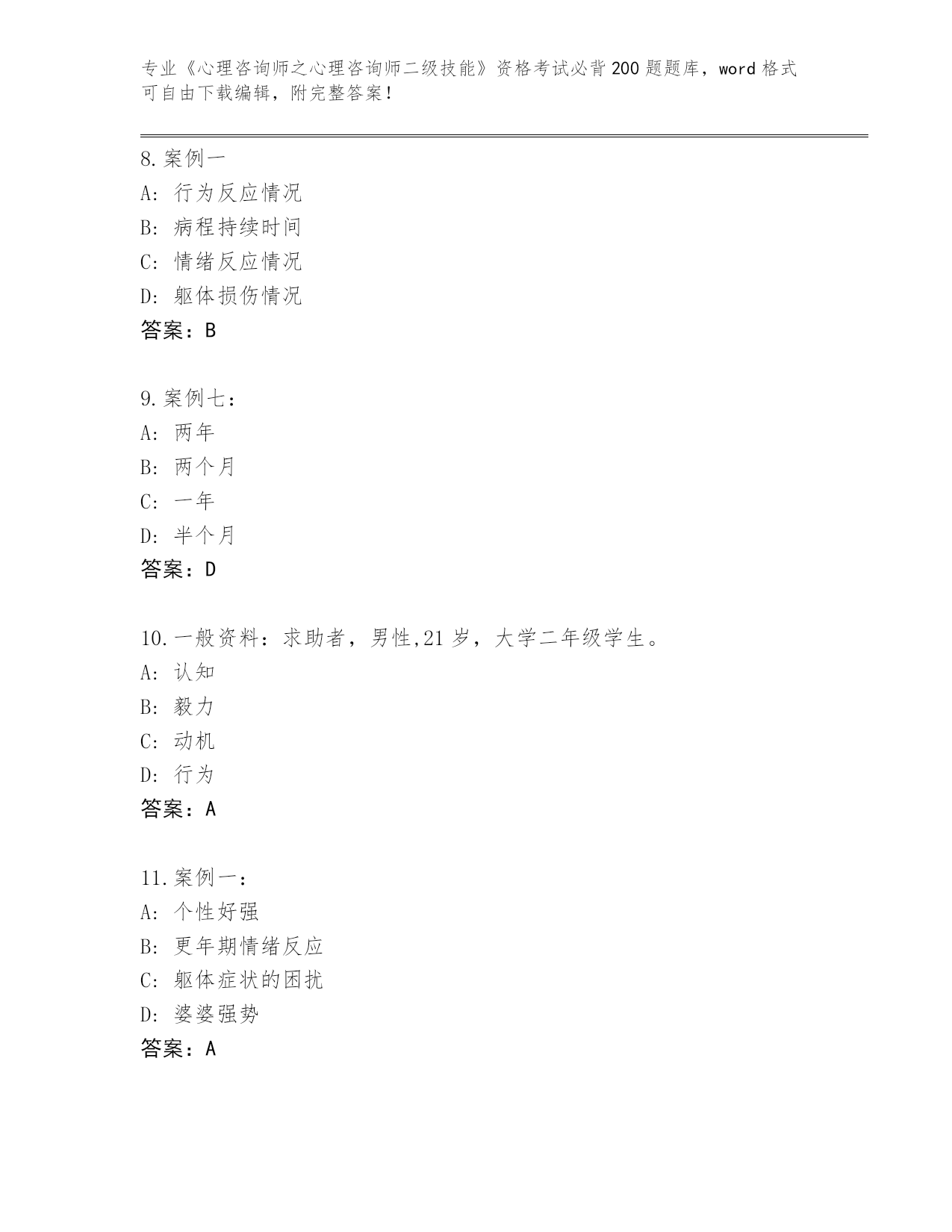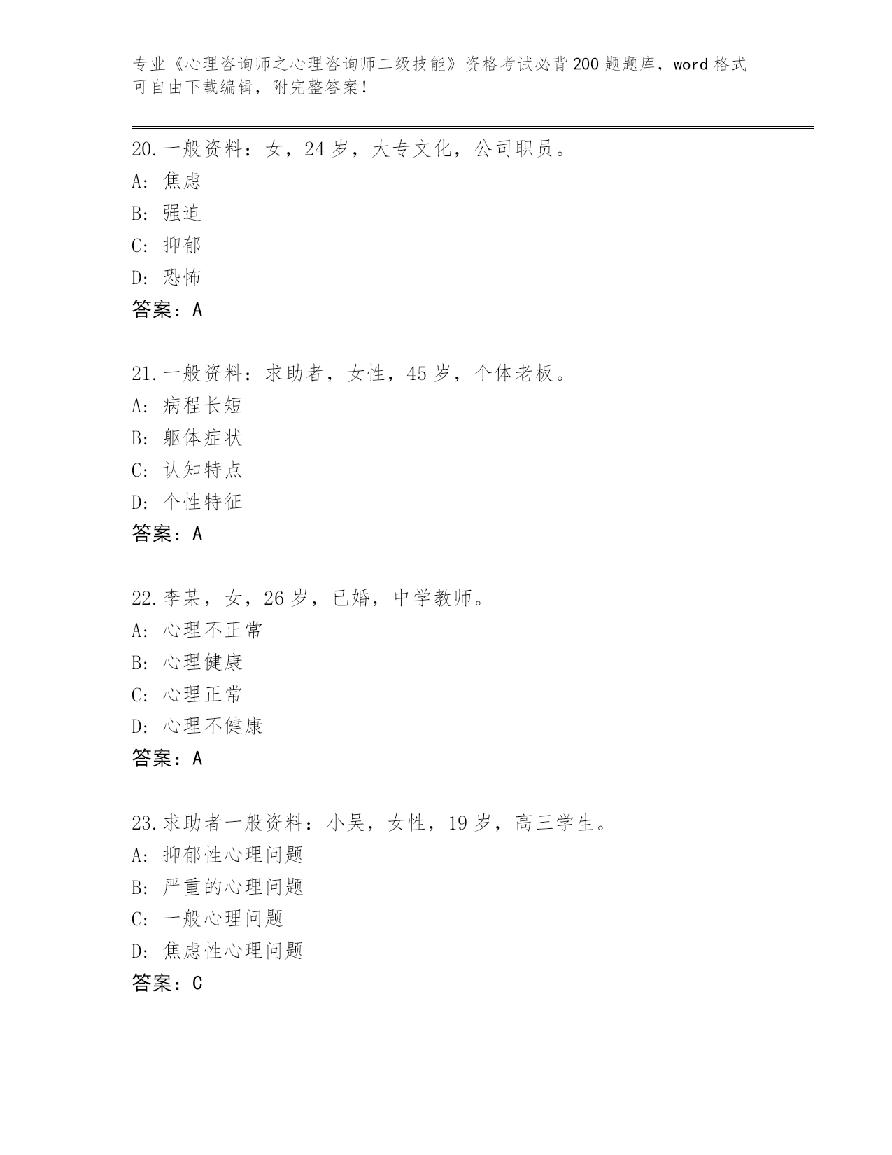 河南省上蔡县2024年《心理咨询师之心理咨询师二级技能》资格考试必背200题通关秘籍题库附答案【预热题】