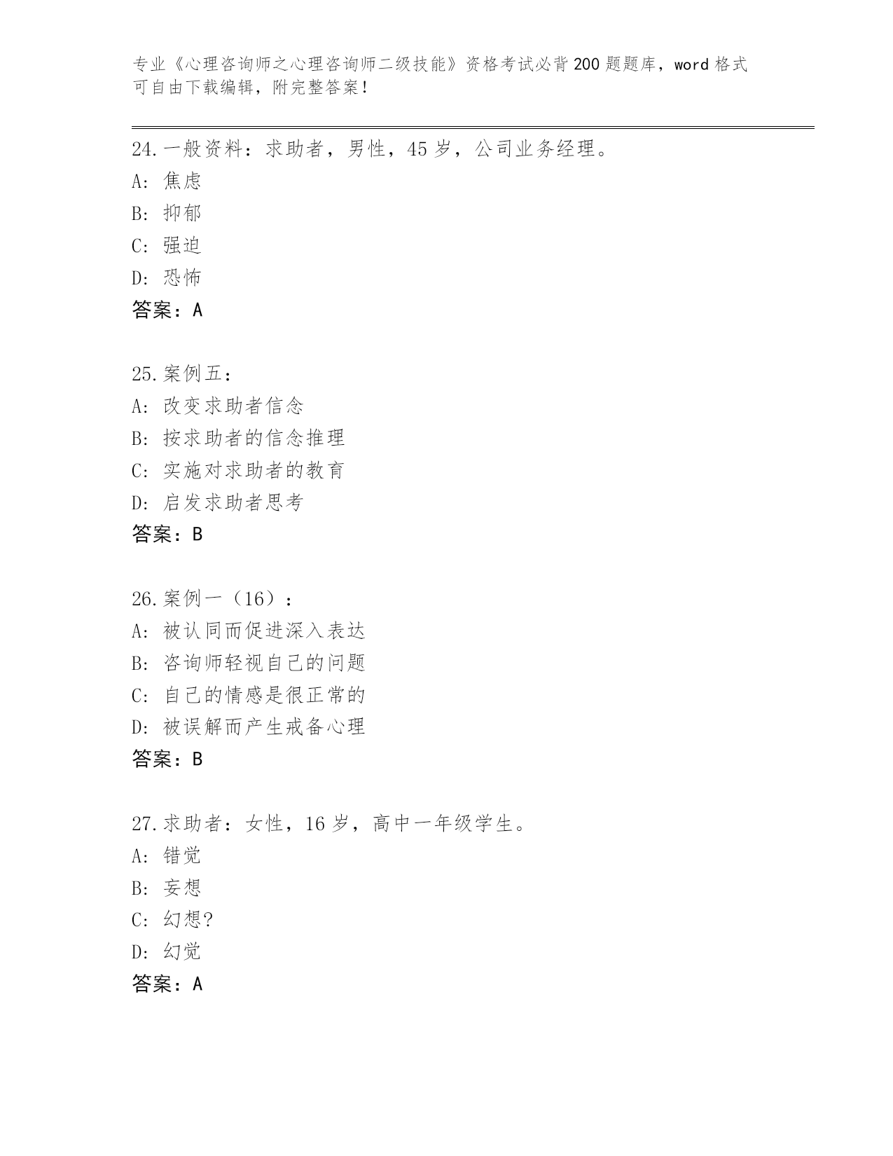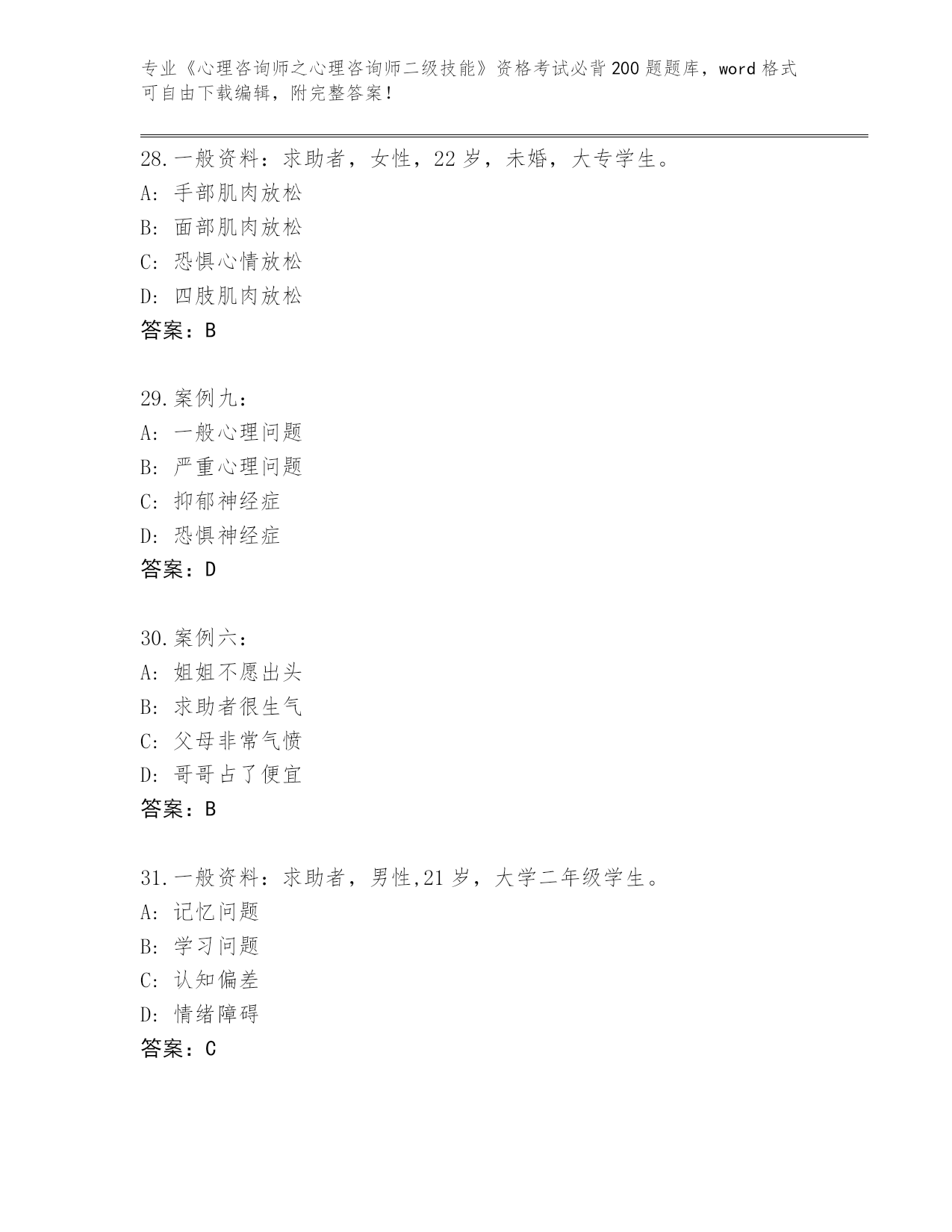 河南省上蔡县2024年《心理咨询师之心理咨询师二级技能》资格考试必背200题真题题库及1套参考答案