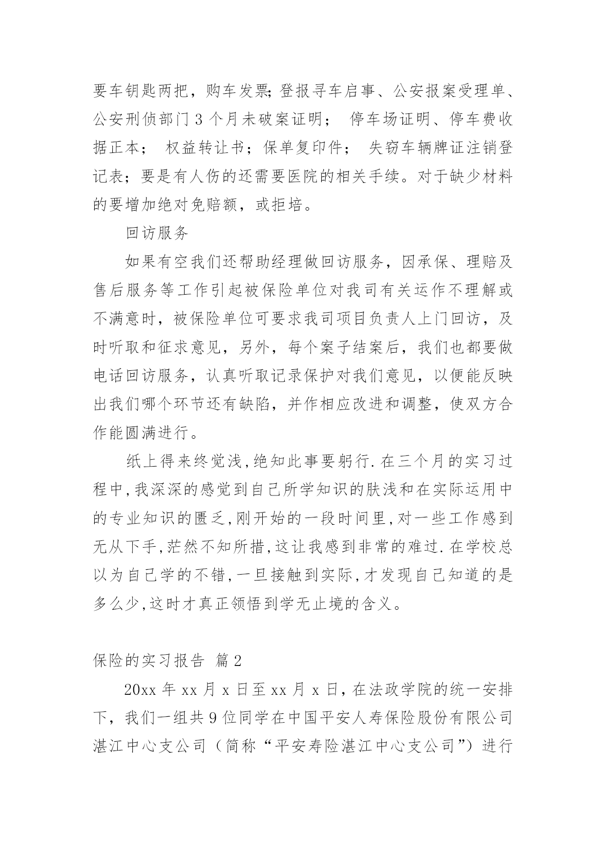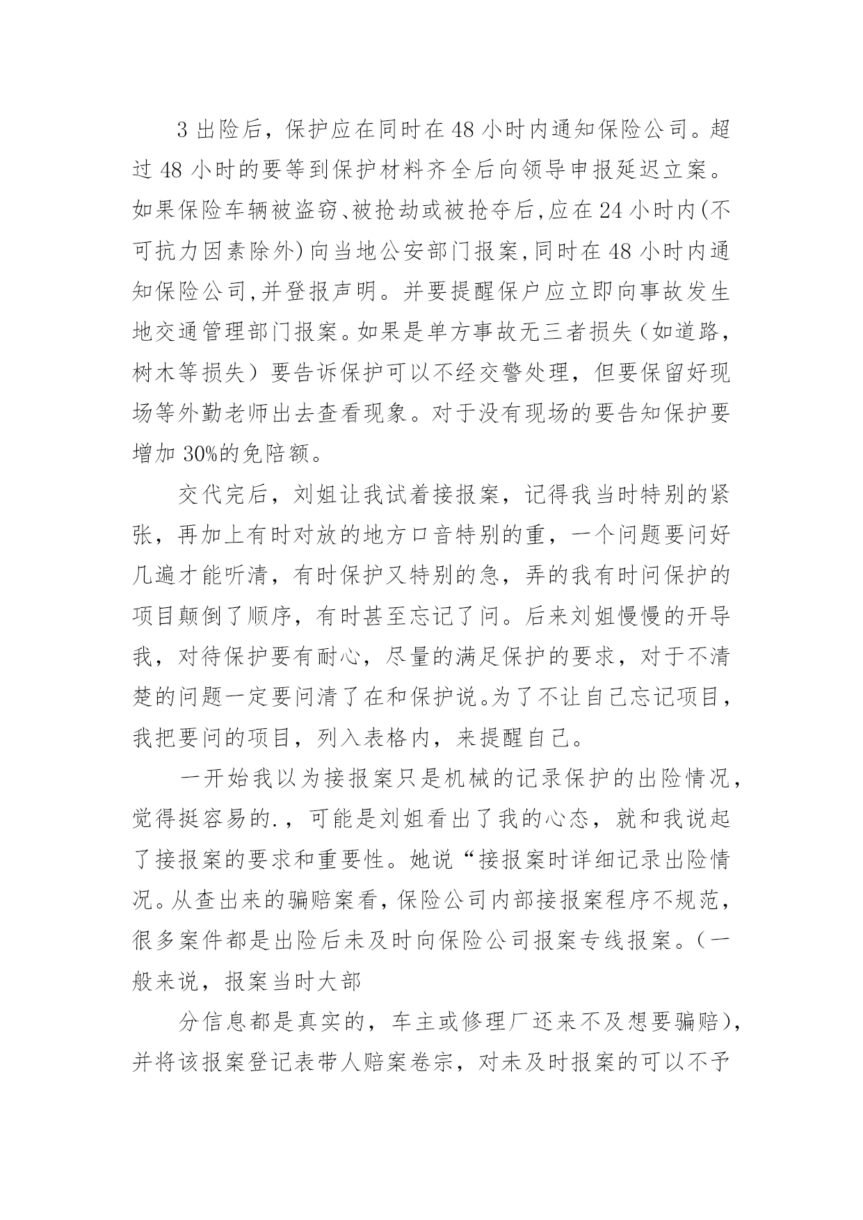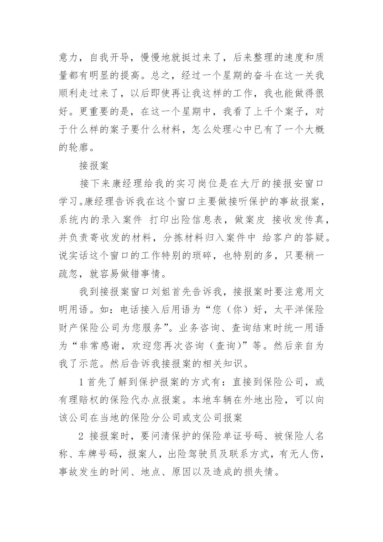 保险的实习报告保险的实习报告模板锦集五篇在经济发展迅速的今天,报告对我们来说并不陌生,写报告的时候要注意内容的完整。你还在对写报告感到一筹莫展吗?下面是小编收集整理的保险的实习报告5篇,希望对大家有所帮助。保险的实习报告篇1三个月的实习匆匆结束了.这次实习,虽然时间短暂,但是意义深远。在实习中,我体会到了付出与回报的快乐,接受了保险公司的新观念、新知识。。刚一进公司首先就是面临着和同事相处的问题。在公司刚开始的那几天,由于没有分给我什么具体的工作,我只能看着那些同事忙忙碌碌的,我不知道该做些什么和说些什么,当时在办公室坐着觉得特别的不自在。后来,我自己想了想,自己现在已经是快要进入社会的人了,应该融入这样的一个大环境,而不能仅仅像以前那样老是自己想怎么样就怎么样。现在是公司给我一个实习的机会,这样的机会很不容易,我应该要好好地利用起来锻炼自己的口才以及人际交往能力。想到这些,和同事们见了面就主动和他们打招呼。在不知不觉中和他们熟悉起来,一些力所能及的事也开始吩咐我做了。就这样慢慢的我就溶入了他们的圈子,溶入了公司,对于不懂得问题我会及时的请教,他们也悉心的给我指导。他们成了我的师傅和朋友。现在我是深知交流对理陪工作的重要性,因为我们外勤是保护出事故后,第一个和保护接触的人,我们的一言一行都代表着公司的形象。我们每天要面对的是那些刚出了事故的保户或他的亲人朋友,这些人往往还沉溺在痛苦中,情绪都很激动。所以我们要选择正确的交流方式方法,坚决避免过激的词语,对于前来的保护不但要指导他们完成相关操作流程,更要好言安慰,让他们满意放心而归。经理首先给我们介绍了案件的流程:事故发生----是否需向交警报案案----向太平洋保险报案----调度----是否需要现场查勘----现场查勘----定损----审核赔案、理算赔款-----事故车辆修复-----办理索赔手续----结案----回访----归档归档在整理案件做归档时,使我深深地体会到了“从事任何工作都不能浮躁,努力做到一丝不苟。”深刻含义。我刚进公司的时候,康经理交给我的第一项任务就是整理已结案件的材料,(粘贴票据,给材料排序,写归档号,装订,给每页打号,装归档盒,进库房。)为了让我们熟悉案件,知道什么样的案子需要什么样的材料。刚开始合同因为觉得新鲜,一天下来感觉还挺好,但两三天之后我就有点心浮气躁了,整理速度明显减慢了,而且容易走神。尤其是装订,打通穿线,简直就是女人该做的活嘛!确让我一个小伙子来做,当时很是不厌烦。但我知道这是个磨合阶段,于是尽力集中注意力,自我开导,慢慢地就挺过来了,后来整理的速度和质量都有明显的提高。总之,经过一个星期的奋斗在这一关我顺利走过来了,以后即使再让我这样的工作,我也能做得很好。更重要的是,在这一个星期中,我看了上千个案子,对于什么样的案子要什么材料,怎么处理心中已有了一个大概的轮廓。接报案接下来康经理给我的实习岗位是在大厅的接报安窗口学习。康经理告诉我在这个窗口主要做接听保护的事故报案,系统内的录入案件打印出险信息表,做案皮接收发传真,并负责寄收发的材料,分拣材料归入案件中给客户的答疑。说实话这个窗口的工作特别的琐碎,也特别的多,只要稍一疏忽,就容易做错事情。我到接报案窗口刘姐首先告诉我,接报案时要注意用文明用语。如:电话接入后用语为“您(你)好,太平洋保险财产保险公司为您服务”。业务咨询、查询结束时统一用语为“非常感谢,欢迎您再次咨询(查询)”等。然后亲自为我了示范。然后告诉我接报案的相关知识。1首先了解到保护报案的方式有:直接到保险公司,或有理赔权的保险代办点报案。本地车辆在外地出险,可以向该公司在当地的保险分公司或支公司报案2接报案时,要问清保护的保险单证号码、被保险人名称、车牌号码,报案人,出险驾驶员及联系方式,有无人伤,事故发生的时间、地点、原因以及造成的损失情。3出险后,保护应在同时在48小时内通知保险公司。超过48小时的要等到保护材料齐全后向领导申报延迟立案。如果保险车辆被盗窃、被抢劫或被抢夺后,应在24小时内(不可抗力因素除外)向当地公安部门报案,同时在48小时内通知保险公司,并登报声明。并要提醒保户应立即向事故发生地交通管理部门报案。如果是单方事故无三者损失(如道路,树木等损失)要告诉保护可以不经交警处理,但要保留好现场等外勤老师出去查看现象。对于没有现场的要告知保护要增加30%的免陪额。交代完后,刘姐让我试着接报案,记得我当时特别的紧张,再加上有时对放的地方口音特别的重,一个问题要问好几遍才能听清,有时保护又特别的急,弄的我有时问保护的项目颠倒了顺序,有时甚至忘记了问。后来刘姐慢慢的开导我,对待保护要有耐心,尽量的满足保护的要求,对于不清楚的问题一定要问清了在和保护说。为了不让自己忘记项目,我把要问的项目,列入表格内,来提醒自