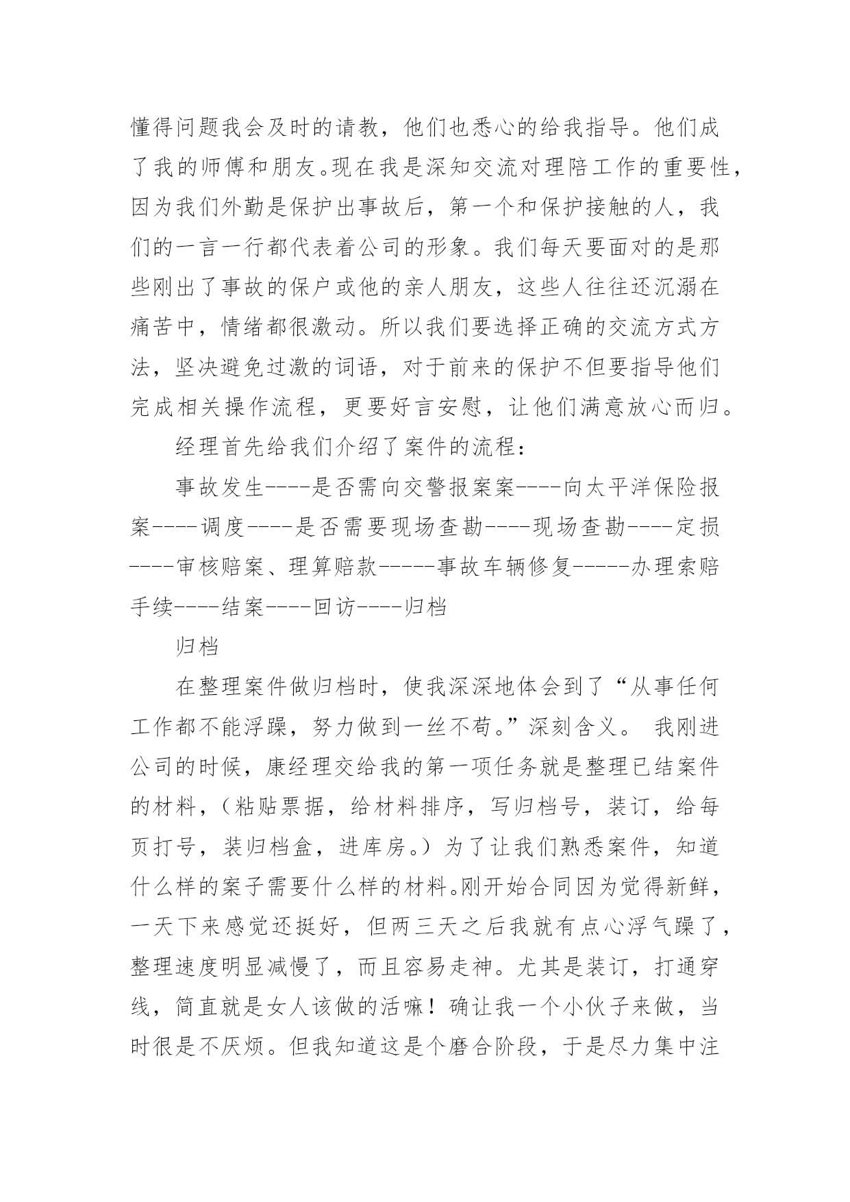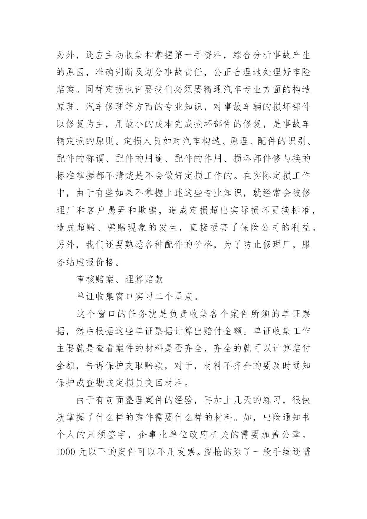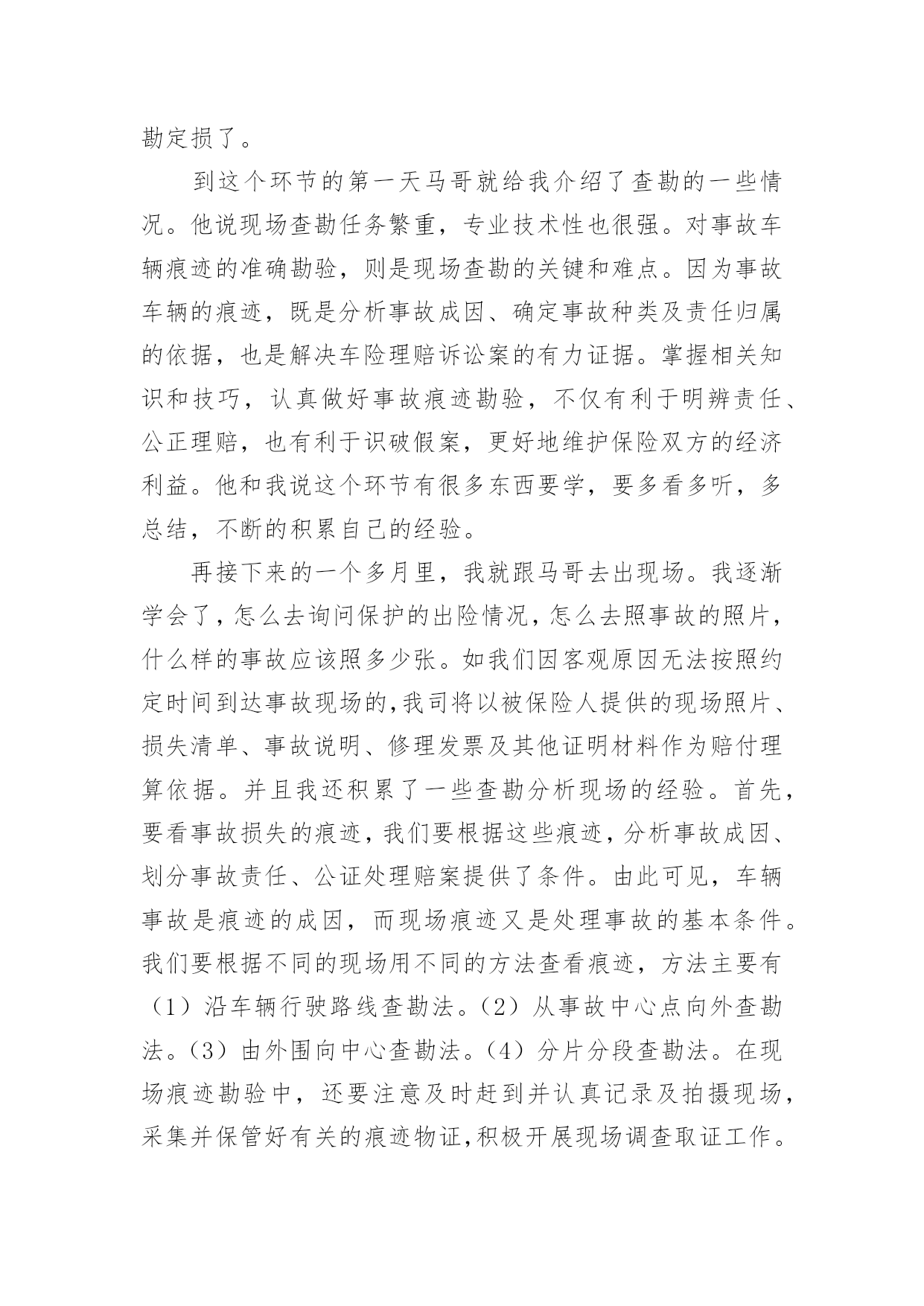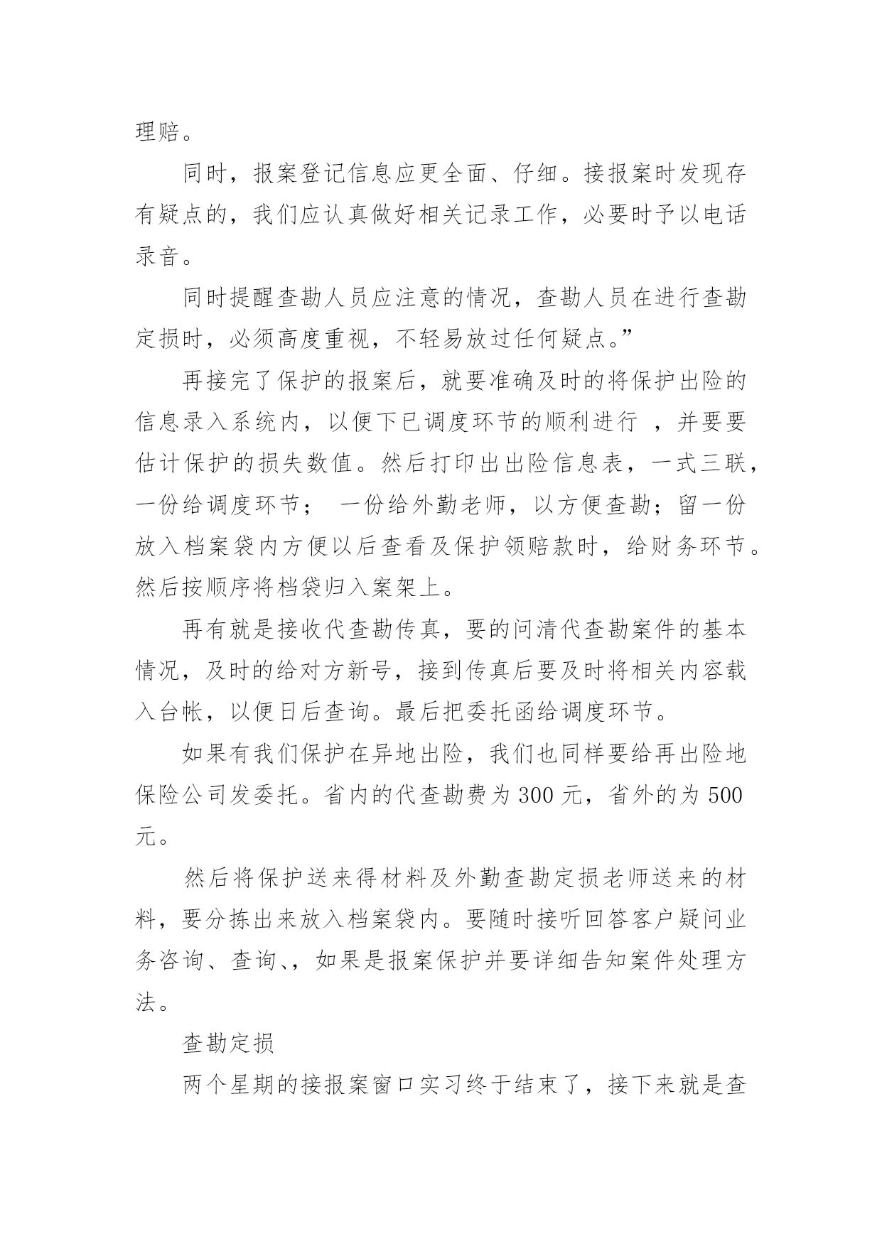 保险的实习报告保险的实习报告模板锦集五篇在经济发展迅速的今天,报告对我们来说并不陌生,写报告的时候要注意内容的完整。你还在对写报告感到一筹莫展吗?下面是小编收集整理的保险的实习报告5篇,希望对大家有所帮助。保险的实习报告篇1三个月的实习匆匆结束了.这次实习,虽然时间短暂,但是意义深远。在实习中,我体会到了付出与回报的快乐,接受了保险公司的新观念、新知识。。刚一进公司首先就是面临着和同事相处的问题。在公司刚开始的那几天,由于没有分给我什么具体的工作,我只能看着那些同事忙忙碌碌的,我不知道该做些什么和说些什么,当时在办公室坐着觉得特别的不自在。后来,我自己想了想,自己现在已经是快要进入社会的人了,应该融入这样的一个大环境,而不能仅仅像以前那样老是自己想怎么样就怎么样。现在是公司给我一个实习的机会,这样的机会很不容易,我应该要好好地利用起来锻炼自己的口才以及人际交往能力。想到这些,和同事们见了面就主动和他们打招呼。在不知不觉中和他们熟悉起来,一些力所能及的事也开始吩咐我做了。就这样慢慢的我就溶入了他们的圈子,溶入了公司,对于不懂得问题我会及时的请教,他们也悉心的给我指导。他们成了我的师傅和朋友。现在我是深知交流对理陪工作的重要性,因为我们外勤是保护出事故后,第一个和保护接触的人,我们的一言一行都代表着公司的形象。我们每天要面对的是那些刚出了事故的保户或他的亲人朋友,这些人往往还沉溺在痛苦中,情绪都很激动。所以我们要选择正确的交流方式方法,坚决避免过激的词语,对于前来的保护不但要指导他们完成相关操作流程,更要好言安慰,让他们满意放心而归。经理首先给我们介绍了案件的流程:事故发生----是否需向交警报案案----向太平洋保险报案----调度----是否需要现场查勘----现场查勘----定损----审核赔案、理算赔款-----事故车辆修复-----办理索赔手续----结案----回访----归档归档在整理案件做归档时,使我深深地体会到了“从事任何工作都不能浮躁,努力做到一丝不苟。”深刻含义。我刚进公司的时候,康经理交给我的第一项任务就是整理已结案件的材料,(粘贴票据,给材料排序,写归档号,装订,给每页打号,装归档盒,进库房。)为了让我们熟悉案件,知道什么样的案子需要什么样的材料。刚开始合同因为觉得新鲜,一天下来感觉还挺好,但两三天之后我就有点心浮气躁了,整理速度明显减慢了,而且容易走神。尤其是装订,打通穿线,简直就是女人该做的活嘛!确让我一个小伙子来做,当时很是不厌烦。但我知道这是个磨合阶段,于是尽力集中注意力,自我开导,慢慢地就挺过来了,后来整理的速度和质量都有明显的提高。总之,经过一个星期的奋斗在这一关我顺利走过来了,以后即使再让我这样的工作,我也能做得很好。更重要的是,在这一个星期中,我看了上千个案子,对于什么样的案子要什么材料,怎么处理心中已有了一个大概的轮廓。接报案接下来康经理给我的实习岗位是在大厅的接报安窗口学习。康经理告诉我在这个窗口主要做接听保护的事故报案,系统内的录入案件打印出险信息表,做案皮接收发传真,并负责寄收发的材料,分拣材料归入案件中给客户的答疑。说实话这个窗口的工作特别的琐碎,也特别的多,只要稍一疏忽,就容易做错事情。我到接报案窗口刘姐首先告诉我,接报案时要注意用文明用语。如:电话接入后用语为“您(你)好,太平洋保险财产保险公司为您服务”。业务咨询、查询结束时统一用语为“非常感谢,欢迎您再次咨询(查询)”等。然后亲自为我了示范。然后告诉我接报案的相关知识。1首先了解到保护报案的方式有:直接到保险公司,或有理赔权的保险代办点报案。本地车辆在外地出险,可以向该公司在当地的保险分公司或支公司报案2接报案时,要问清保护的保险单证号码、被保险人名称、车牌号码,报案人,出险驾驶员及联系方式,有无人伤,事故发生的时间、地点、原因以及造成的损失情。3出险后,保护应在同时在48小时内通知保险公司。超过48小时的要等到保护材料齐全后向领导申报延迟立案。如果保险车辆被盗窃、被抢劫或被抢夺后,应在24小时内(不可抗力因素除外)向当地公安部门报案,同时在48小时内通知保险公司,并登报声明。并要提醒保户应立即向事故发生地交通管理部门报案。如果是单方事故无三者损失(如道路,树木等损失)要告诉保护可以不经交警处理,但要保留好现场等外勤老师出去查看现象。对于没有现场的要告知保护要增加30%的免陪额。交代完后,刘姐让我试着接报案,记得我当时特别的紧张,再加上有时对放的地方口音特别的重,一个问题要问好几遍才能听清,有时保护又特别的急,弄的我有时问保护的项目颠倒了顺序,有时甚至忘记了问。后来刘姐慢慢的开导我,对待保护要有耐心,尽量的满足保护的要求,对于不清楚的问题一定要问清了在和保护说。为了不让自己忘记项目,我把要问的项目,列入表格内,来提醒自