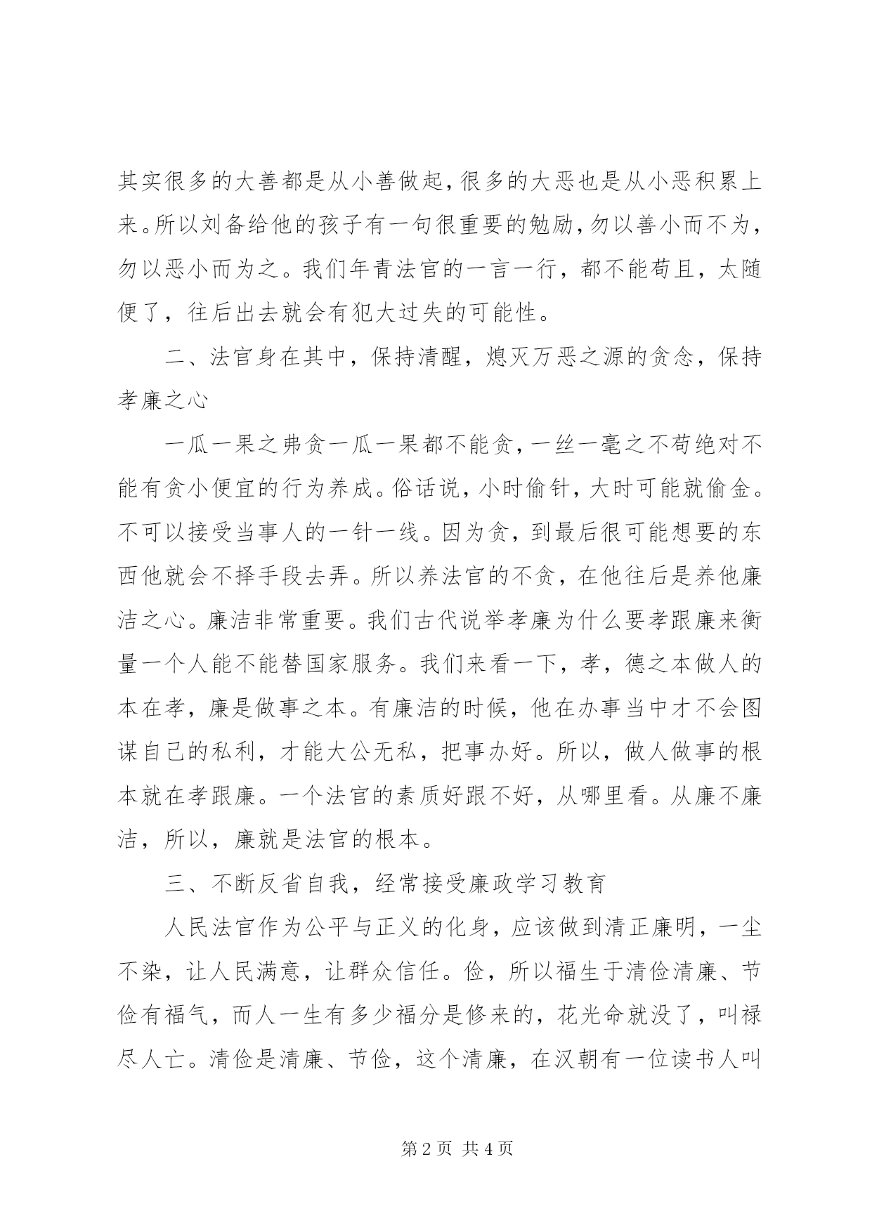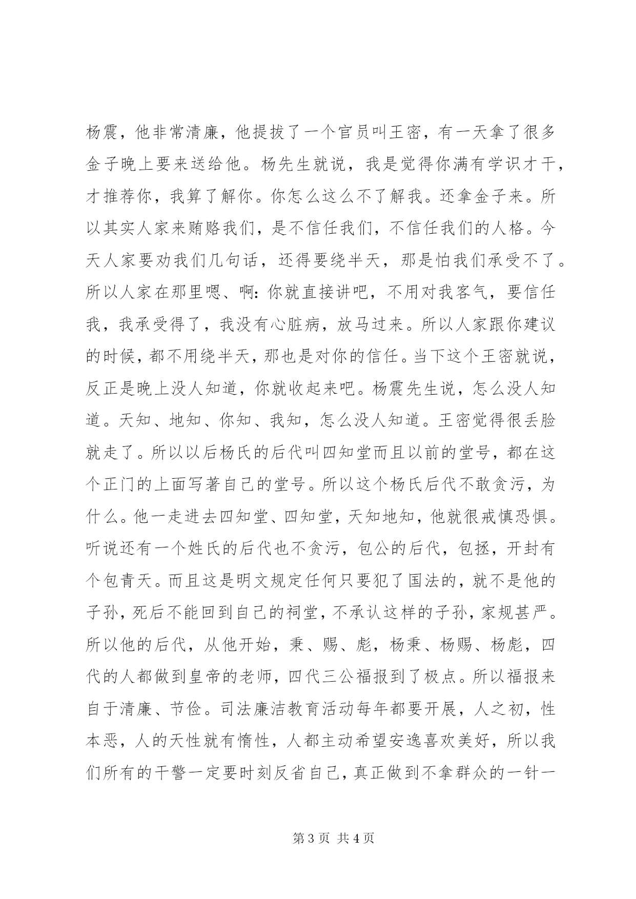 第PAGE\*Arabic\*MERGEFORMAT4页共NUMPAGES\*MERGEFORMAT4页司法廉洁教育活动开展心得体会新年伊始,院党组就组织全院干警开展群众路线教育实践活动和司法廉洁教育活动开展之心得体会。通过听讲座、观看影片、组织青年干警座谈等方式,全院干警都接受着一次廉政作风建设与廉政学习教育的洗礼。一、提前预防,防微杜渐,养成廉洁有守的品格所以我们的学业、我们的事业、家业要好好经营,让父母能够安心,让党和国家能够放心。我们选择了法官这一职业,就要尽心尽力去做好审判工作,绝对不能好高骛远。很多人在这个时代当中常常都要想快速发展致富其实天下哪有白吃的午餐。所谓欲速则不达往往在司法工作中,心非常地躁动,为一己之私损害了人民的利益,走上违法犯罪的道路。法官担待者社会公平正义的责任。做人要稳扎稳打,不可躁动。防微杜渐,提前预防。我们的法院干警一定要守得住清贫、耐得住寂寞。特别是我们年轻人,贪玩一些,喜欢交朋友,觉得我们还是一个小小的助理审判员,那些当事人呀律师呀不会找到我们来帮忙,所以无所谓,觉得反腐跟我们无关,防腐拒腐应该都是那些有些衔头的老干警的事。其实不然,我们也必须特别注意自己的身份,我们身上有当事人所看重的权力这些因素必然有腐败的可能性,而我们必须杜绝这种可能性。其实,很多时候我们不去赴那些所谓的应酬这些糖衣爆弹就没法接近我们。事虽小。勿擅为。苟擅为。子道亏。其实很多的大善都是从小善做起,很多的大恶也是从小恶积累上来。所以刘备给他的孩子有一句很重要的勉励,勿以善小而不为,勿以恶小而为之。我们年青法官的一言一行,都不能苟且,太随便了,往后出去就会有犯大过失的可能性。二、法官身在其中,保持清醒,熄灭万恶之源的贪念,保持孝廉之心一瓜一果之弗贪一瓜一果都不能贪,一丝一毫之不苟绝对不能有贪小便宜的行为养成。俗话说,小时偷针,大时可能就偷金。不可以接受当事人的一针一线。因为贪,到最后很可能想要的东西他就会不择手段去弄。所以养法官的不贪,在他往后是养他廉洁之心。廉洁非常重要。我们古代说举孝廉为什么要孝跟廉来衡量一个人能不能替国家服务。我们来看一下,孝,德之本做人的本在孝,廉是做事之本。有廉洁的时候,他在办事当中才不会图谋自己的私利,才能大公无私,把事办好。所以,做人做事的根本就在孝跟廉。一个法官的素质好跟不好,从哪里看。从廉不廉洁,所以,廉就是法官的根本。三、不断反省自我,经常接受廉政学习教育人民法官作为公平与正义的化身,应该做到清正廉明,一尘不染,让人民满意,让群众信任。俭,所以福生于清俭清廉、节俭有福气,而人一生有多少福分是修来的,花光命就没了,叫禄尽人亡。清俭是清廉、节俭,这个清廉,在汉朝有一位读书人叫杨震,他非常清廉,他提拔了一个官员叫王密,有一天拿了很多金子晚上要来送给他。杨先生就说,我是觉得你满有学识才干,才推荐你,我算了解你。你怎么这么不了解我。还拿金子来。所以其实人家来贿赂我们,是不信任我们,不信任我们的人格。今天人家要劝我们几句话,还得要绕半天,那是怕我们承受不了。所以人家在那里嗯、啊:你就直接讲吧,不用对我客气,要信任我,我承受得了,我没有心脏病,放马过来。所以人家跟你建议的时候,都不用绕半天,那也是对你的信任。当下这个王密就说,反正是晚上没人知道,你就收起来吧。杨震先生说,怎么没人知道。天知、地知、你知、我知,怎么没人知道。王密觉得很丢脸就走了。所以以后杨氏的后代叫四知堂而且以前的堂号,都在这个正门的上面写著自己的堂号。所以这个杨氏后代不敢贪污,为什么。他一走进去四知堂、四知堂,天知地知,他就很戒慎恐惧。听说还有一个姓氏的后代也不贪污,包公的后代,包拯,开封有个包青天。而且这是明文规定任何只要犯了国法的,就不是他的子孙,死后不能回到自己的祠堂,不承认这样的子孙,家规甚严。所以他的后代,从他开始,秉、赐、彪,杨秉、杨赐、杨彪,四代的人都做到皇帝的老师,四代三公福报到了极点。所以福报来自于清廉、节俭。司法廉洁教育活动每年都要开展,人之初,性本恶,人的天性就有惰性,人都主动希望安逸喜欢美好,所以我们所有的干警一定要时刻反省自己,真正做到不拿群众的一针一线。人生的路还很长,法院的工作愈加难做,法官的事业才刚刚开始,我自己将和全体法院同仁一起共勉:守住清贫、耐住寂寞;守住天平、不偏不倚;守住良知、一生甘为孺子牛。