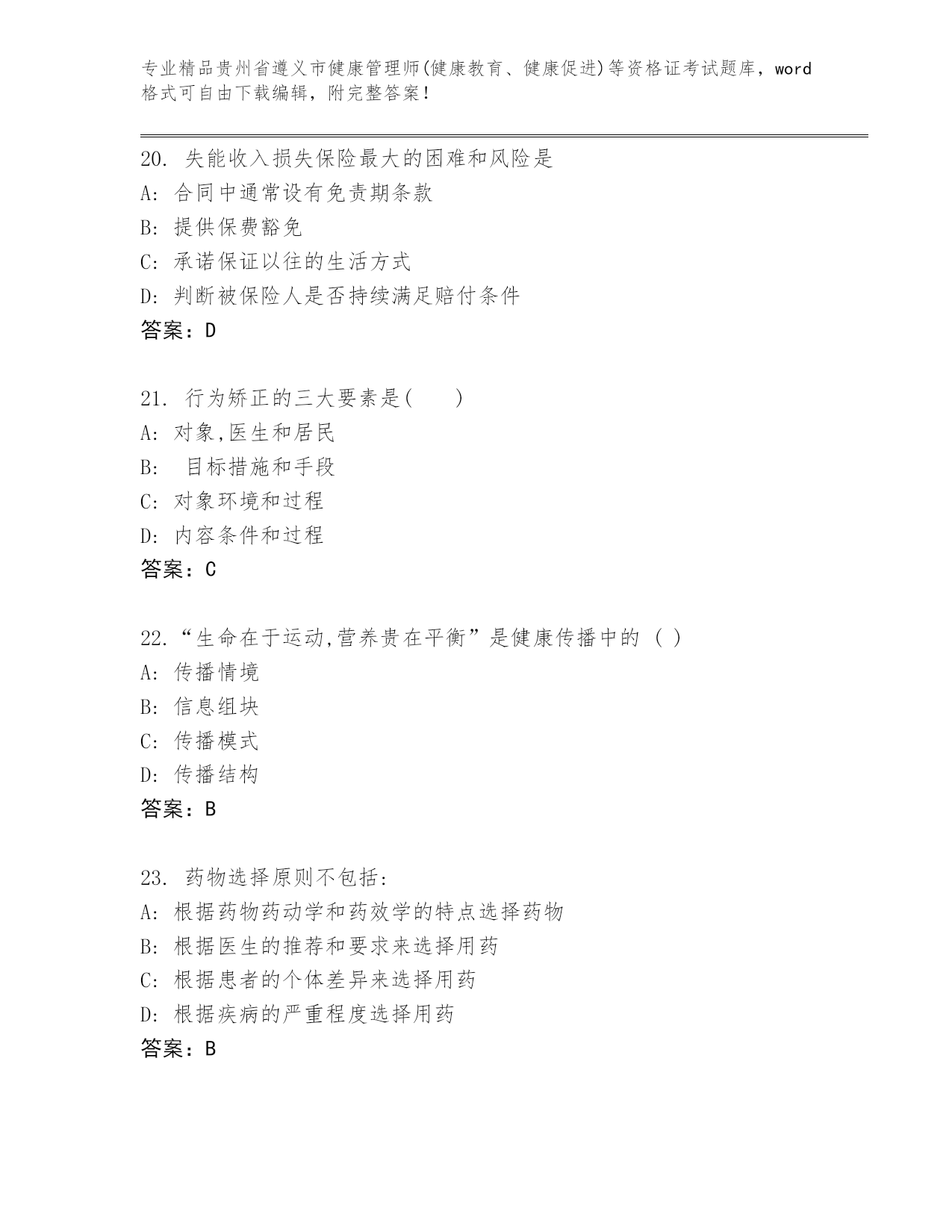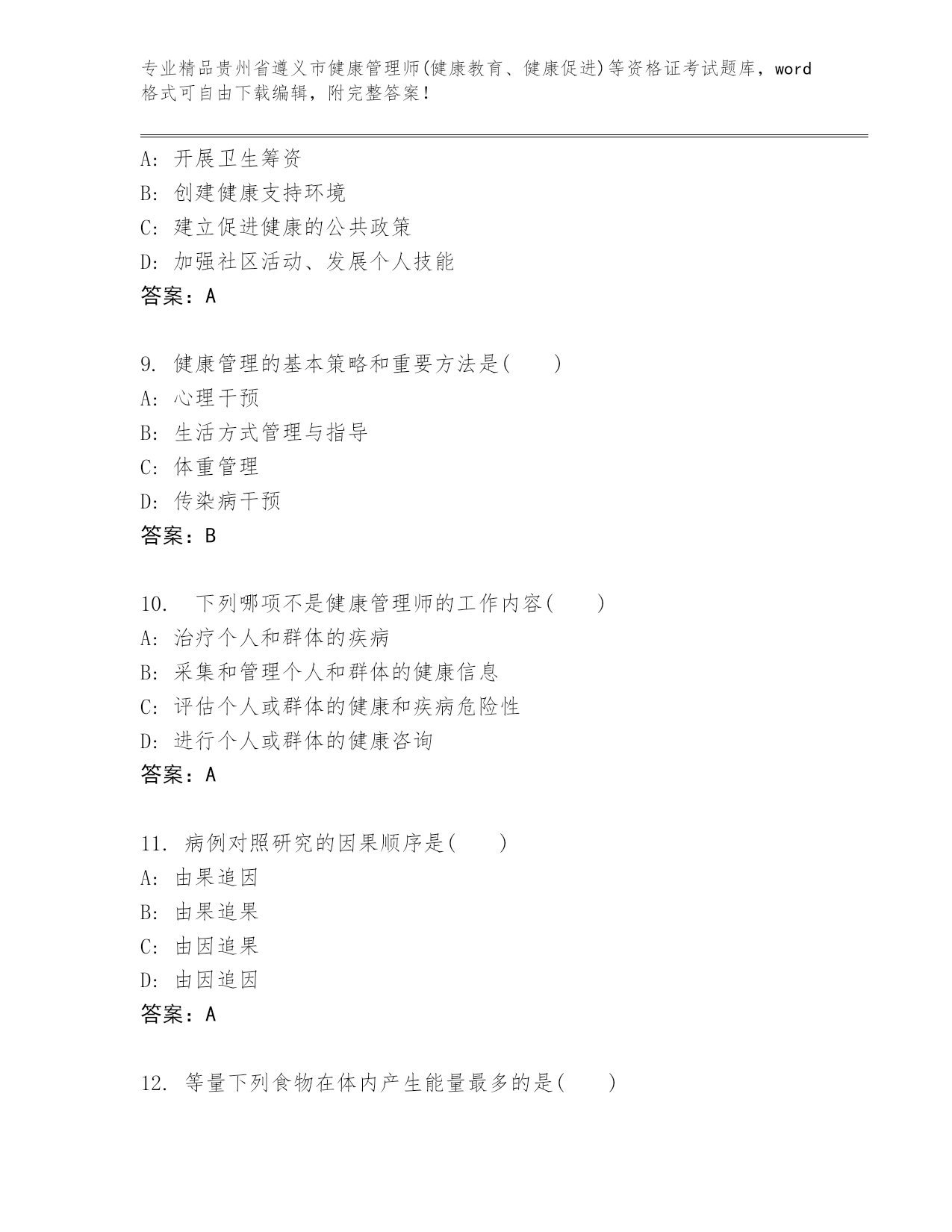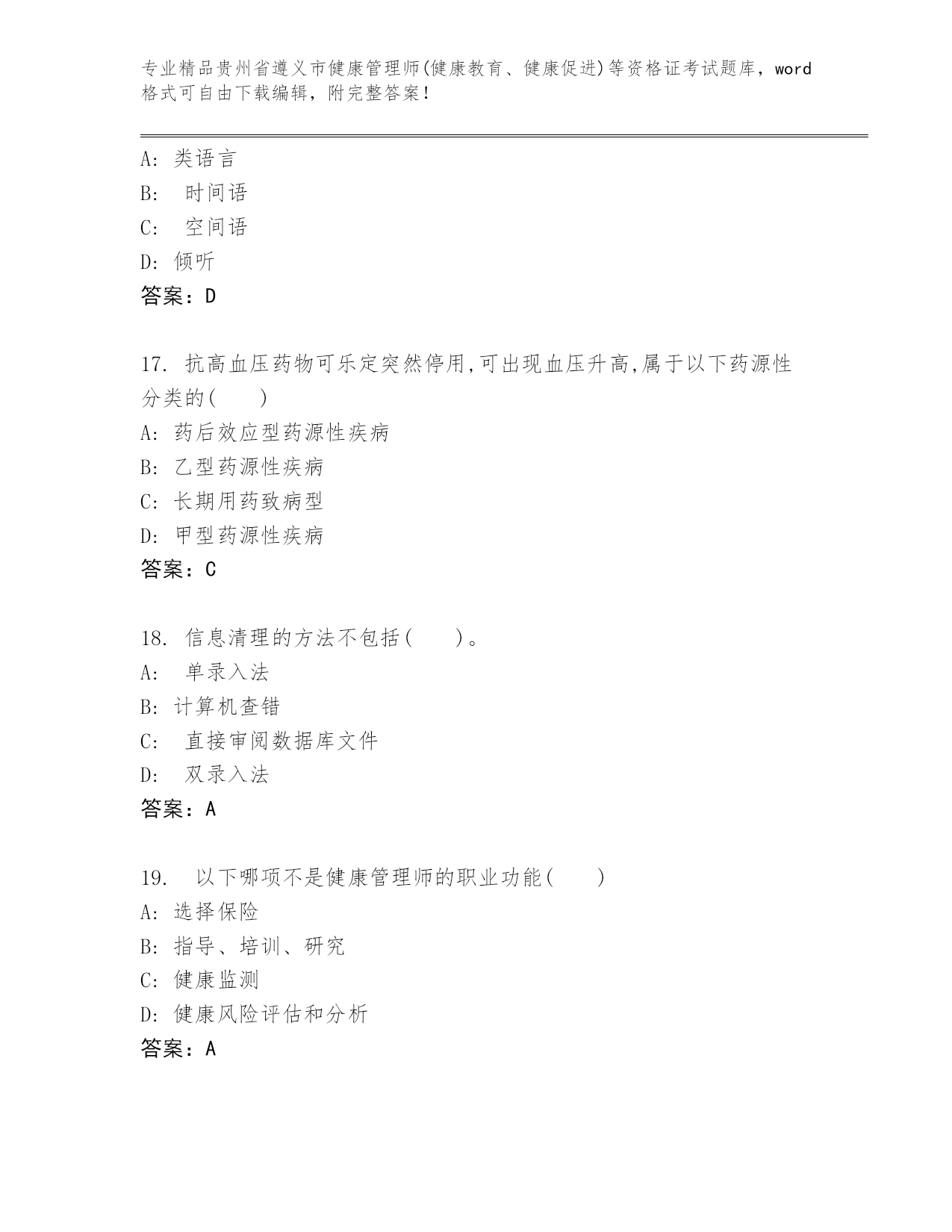 精品贵州省遵义市健康管理师(健康教育、健康促进)等资格证考试及下载答案