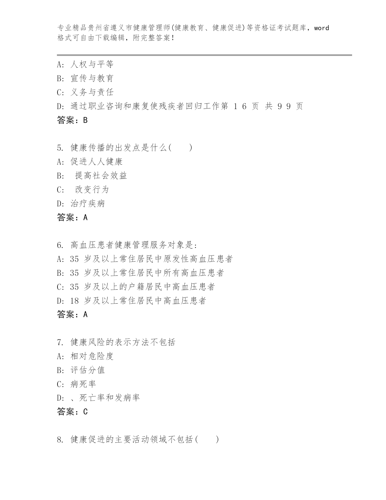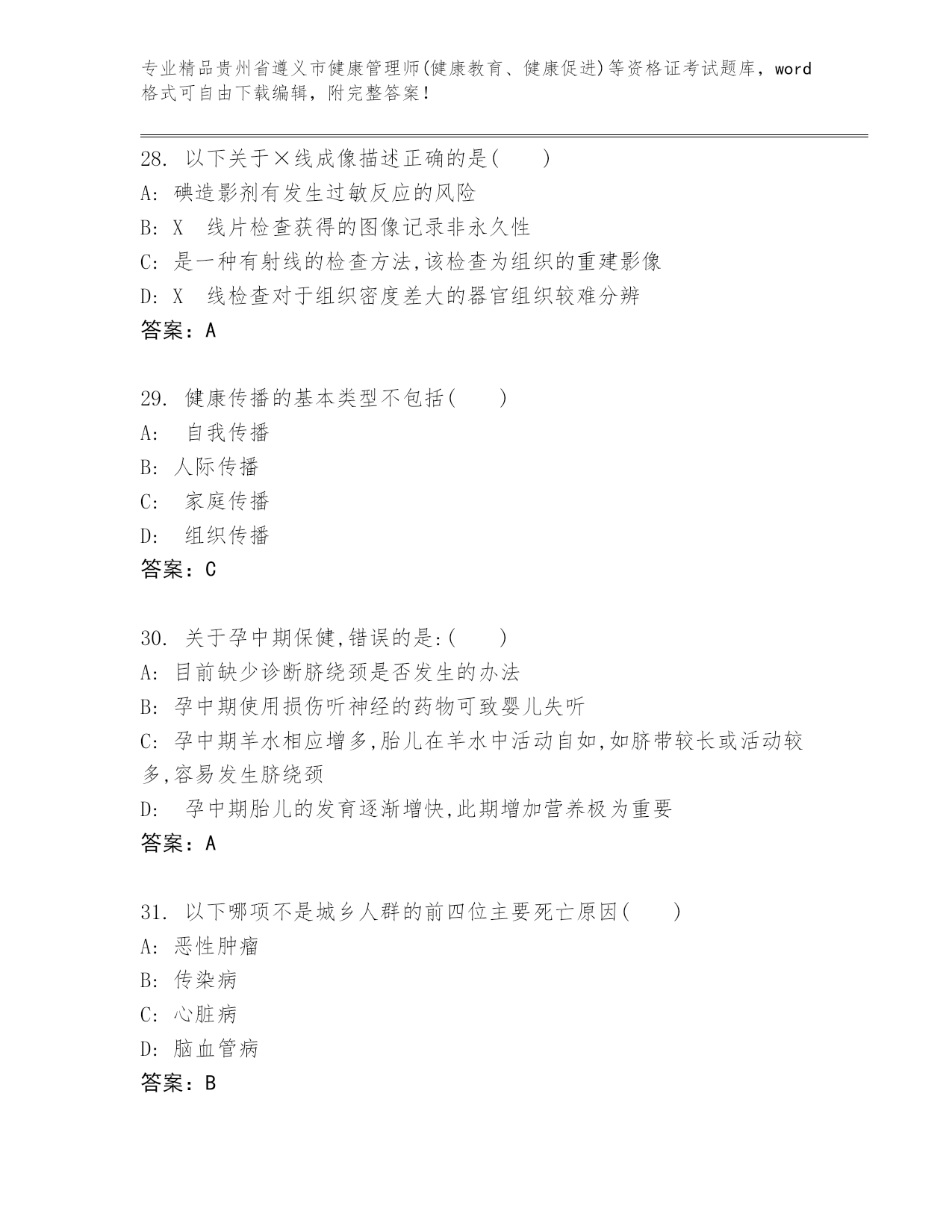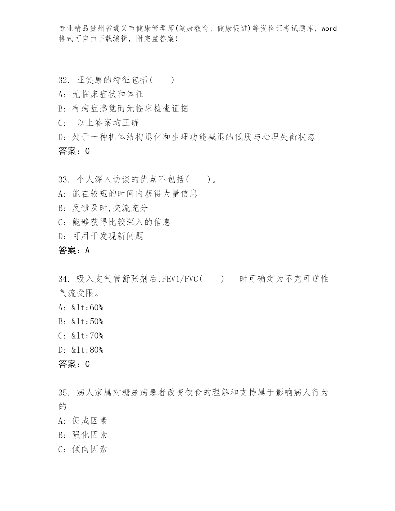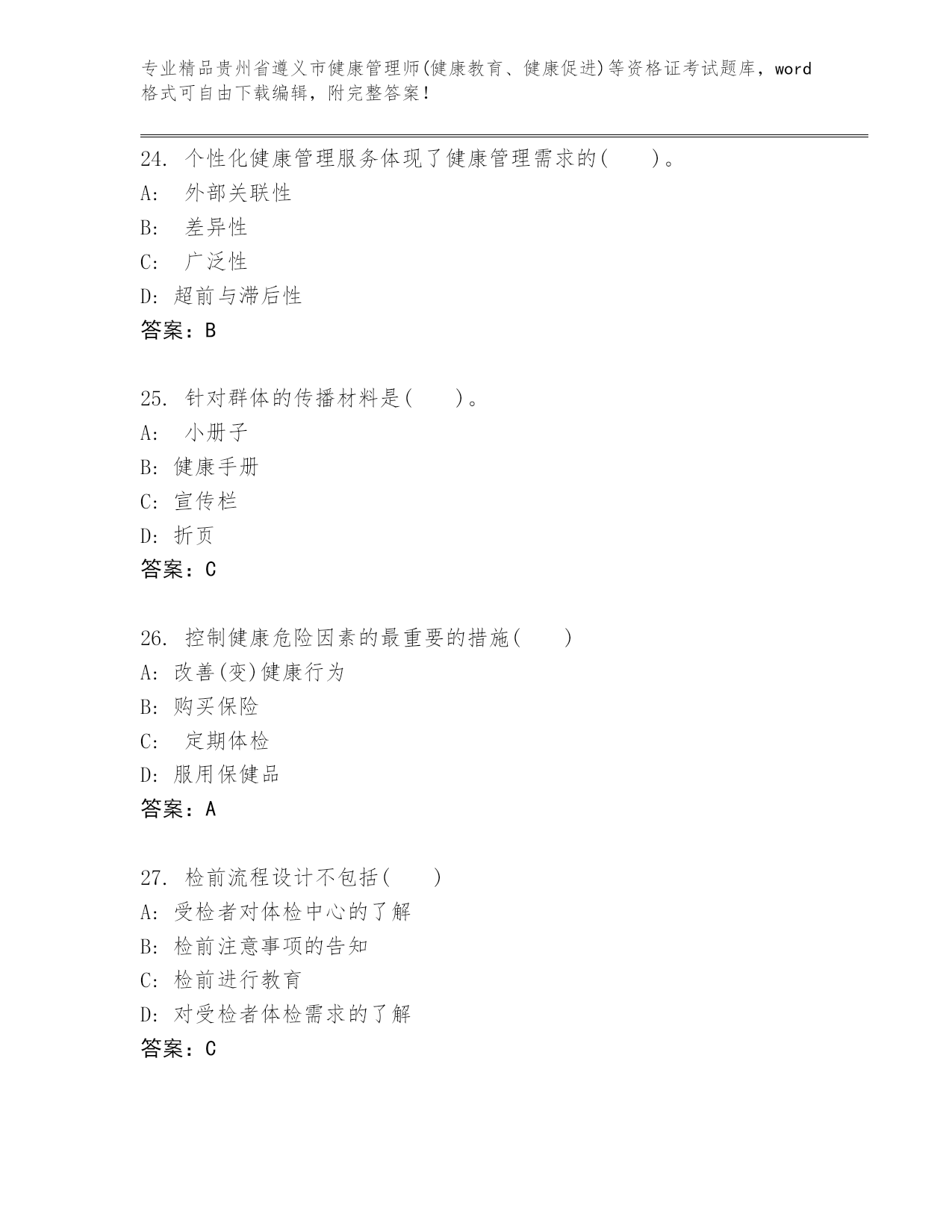 精品贵州省遵义市健康管理师(健康教育、健康促进)等资格证考试及下载答案