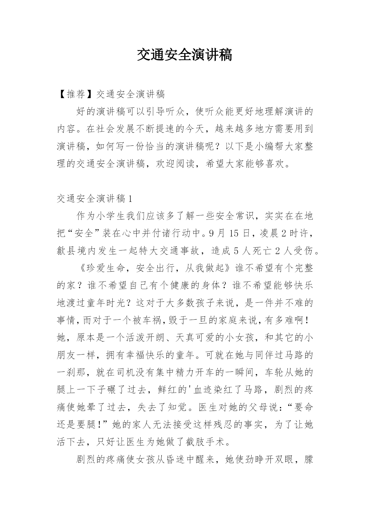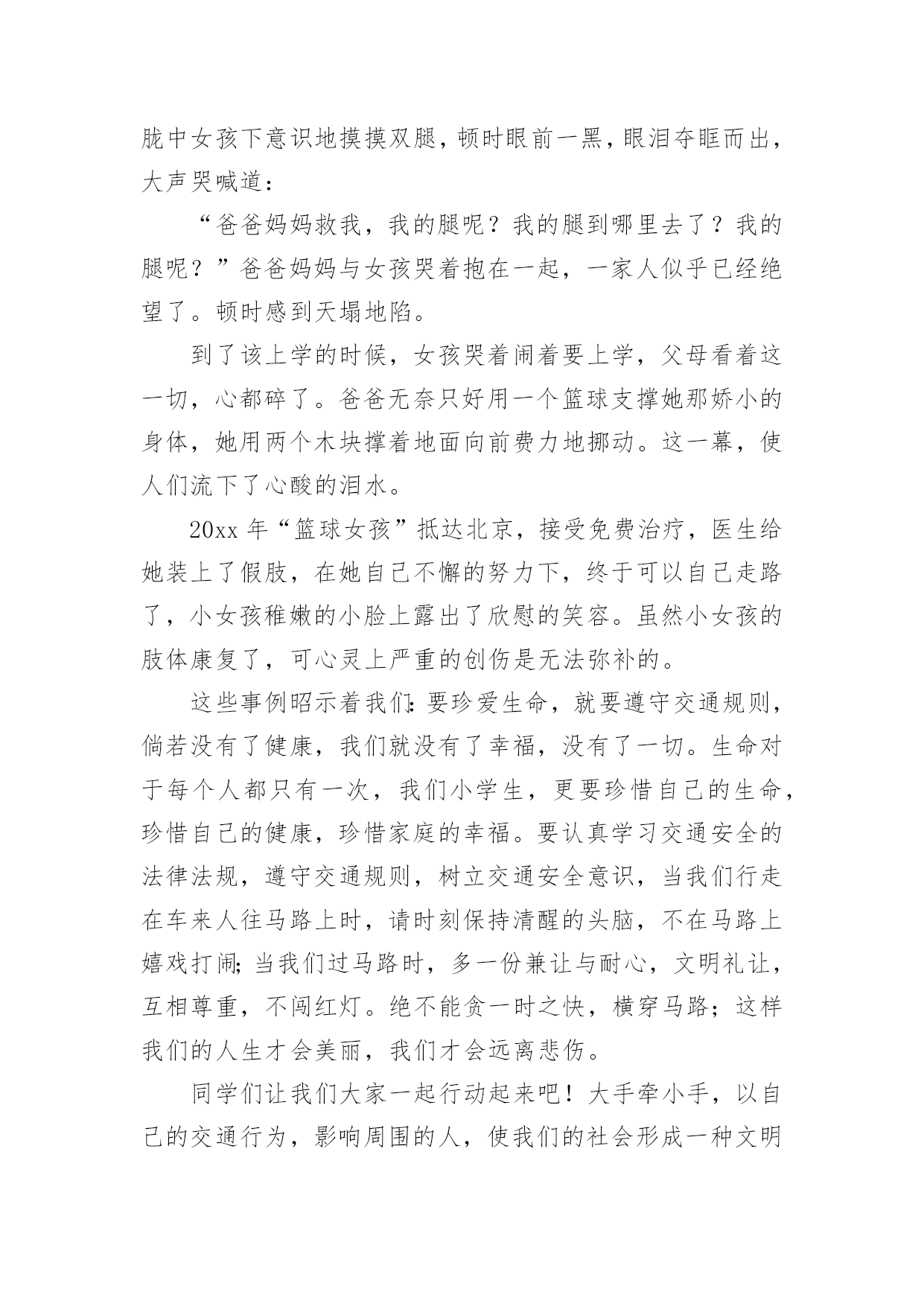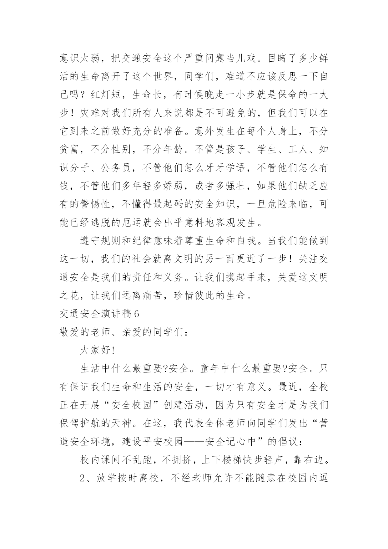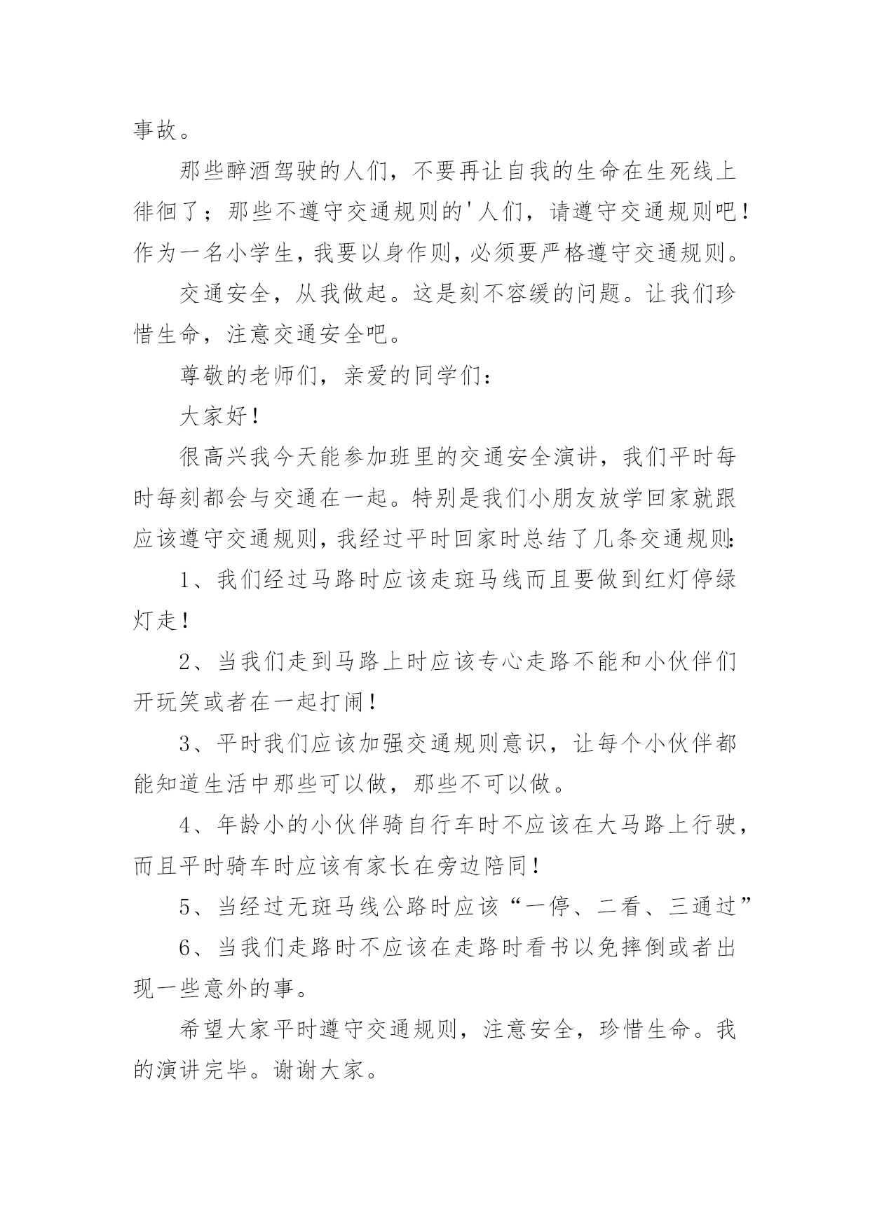 交通安全演讲稿【推荐】交通安全演讲稿好的演讲稿可以引导听众,使听众能更好地理解演讲的内容。在社会发展不断提速的今天,越来越多地方需要用到演讲稿,如何写一份恰当的演讲稿呢?以下是小编帮大家整理的交通安全演讲稿,欢迎阅读,希望大家能够喜欢。交通安全演讲稿1作为小学生我们应该多了解一些安全常识,实实在在地把“安全”装在心中并付诸行动中。9月15日,凌晨2时许,歙县境内发生一起特大交通事故,造成5人死亡2人受伤。《珍爱生命,安全出行,从我做起》谁不希望有个完整的家?谁不希望自己有个健康的身体?谁不希望能够快乐地渡过童年时光?这对于大多数孩子来说,是一件并不难的事情,而对于一个被车祸,毁于一旦的家庭来说,有多难啊!她,原本是一个活泼开朗、天真可爱的小女孩,和其它的小朋友一样,拥有幸福快乐的童年。可就在她与同伴过马路的一刹那,就在司机没有集中精力开车的一瞬间,车轮从她的腿上一下子碾了过去,鲜红的'血迹染红了马路,剧烈的疼痛使她晕了过去,失去了知觉。医生对她的父母说:“要命还是要腿!”她的家人无法接受这样残忍的事实,为了让她活下去,只好让医生为她做了截肢手术。剧烈的疼痛使女孩从昏迷中醒来,她使劲睁开双眼,朦胧中女孩下意识地摸摸双腿,顿时眼前一黑,眼泪夺眶而出,大声哭喊道:“爸爸妈妈救我,我的腿呢?我的腿到哪里去了?我的腿呢?”爸爸妈妈与女孩哭着抱在一起,一家人似乎已经绝望了。顿时感到天塌地陷。到了该上学的时候,女孩哭着闹着要上学,父母看着这一切,心都碎了。爸爸无奈只好用一个篮球支撑她那娇小的身体,她用两个木块撑着地面向前费力地挪动。这一幕,使人们流下了心酸的泪水。20xx年“篮球女孩”抵达北京,接受免费治疗,医生给她装上了假肢,在她自己不懈的努力下,终于可以自己走路了,小女孩稚嫩的小脸上露出了欣慰的笑容。虽然小女孩的肢体康复了,可心灵上严重的创伤是无法弥补的。这些事例昭示着我们:要珍爱生命,就要遵守交通规则,倘若没有了健康,我们就没有了幸福,没有了一切。生命对于每个人都只有一次,我们小学生,更要珍惜自己的生命,珍惜自己的健康,珍惜家庭的幸福。要认真学习交通安全的法律法规,遵守交通规则,树立交通安全意识,当我们行走在车来人往马路上时,请时刻保持清醒的头脑,不在马路上嬉戏打闹;当我们过马路时,多一份兼让与耐心,文明礼让,互相尊重,不闯红灯。绝不能贪一时之快,横穿马路;这样我们的人生才会美丽,我们才会远离悲伤。同学们让我们大家一起行动起来吧!大手牵小手,以自己的交通行为,影响周围的人,使我们的社会形成一种文明交通的良好风尚。同时也使我们的生命之花开得更加鲜艳,更加美丽!然而由于有些人交通安全意识的淡薄,在车水马龙的马路上演了一幕幕不可挽回的悲剧。当你看到一个个鲜活的生命消失于车轮之下,当你发现一阵阵欢声笑语湮没在尖锐的汽笛声。交通安全演讲稿2各位老师、亲爱的同学们:大家好!在现代化的社会,我们的生活已经离不开交通了,而交通安全,也是不可忽视的问题,而且务必言出即行,从我做起。但是有些人却不重视交通安全,你是否想过,也许就是一点小疏忽,就有可能造成你一生的遗憾。记得有一次,我正走在放学回家的路上,忽然听见不远处传来一阵“嘶——”的紧急刹车声和撞击声。我闻声望去,原先是一辆校车和一辆正在拐弯的小轿车撞上了,小轿车的车头撞到了校车的尾部,校车的油漆被撞掉了一块,还有一部分畸形了,而小轿车的车灯也撞了下来。我当时心猛地一震,想:校车上那么多的学生多危险啊!要是司机的反应慢了一点点,那一车含苞待放的小花朵,或许还没来得及绽放,就被这场车祸葬送了性命。想到这,吓得我出了一身的冷汗。这时双方车主争论了起来,我靠近了一点儿,闻道小轿车车主的身上有一股难闻的酒气,显然是喝了许多的酒。这时,交警也赶到了现场来处理这场交通事故。那些醉酒驾驶的人们,不要再让自我的生命在生死线上徘徊了;那些不遵守交通规则的'人们,请遵守交通规则吧!作为一名小学生,我要以身作则,必须要严格遵守交通规则。交通安全,从我做起。这是刻不容缓的问题。让我们珍惜生命,注意交通安全吧。尊敬的老师们,亲爱的同学们:大家好!很高兴我今天能参加班里的交通安全演讲,我们平时每时每刻都会与交通在一起。特别是我们小朋友放学回家就跟应该遵守交通规则,我经过平时回家时总结了几条交通规则:1、我们经过马路时应该走斑马线而且要做到红灯停绿灯走!2、当我们走到马路上时应该专心走路不能和小伙伴们开玩笑或者在一起打闹!3、平时我们应该加强交通规则意识,让每个小伙伴都能知道生活中那些可以做,那些不可以做。4、年龄小的小伙伴骑自行车时不应该在大马路上行驶,而且平时骑车时应该有家长在旁边陪同!5、当经过无斑马线公路时应该“一停、二看、三通过”6、当我们走路时不应该在走路时看书以免摔倒或者出现一些意外的事。希望大家平时遵守交通规则