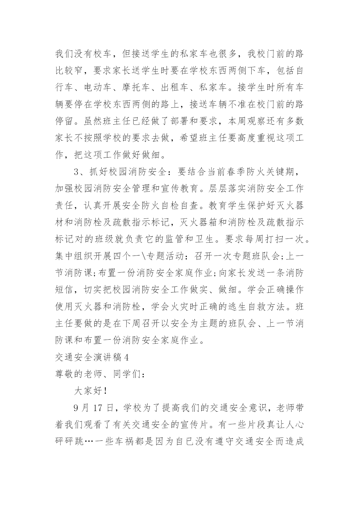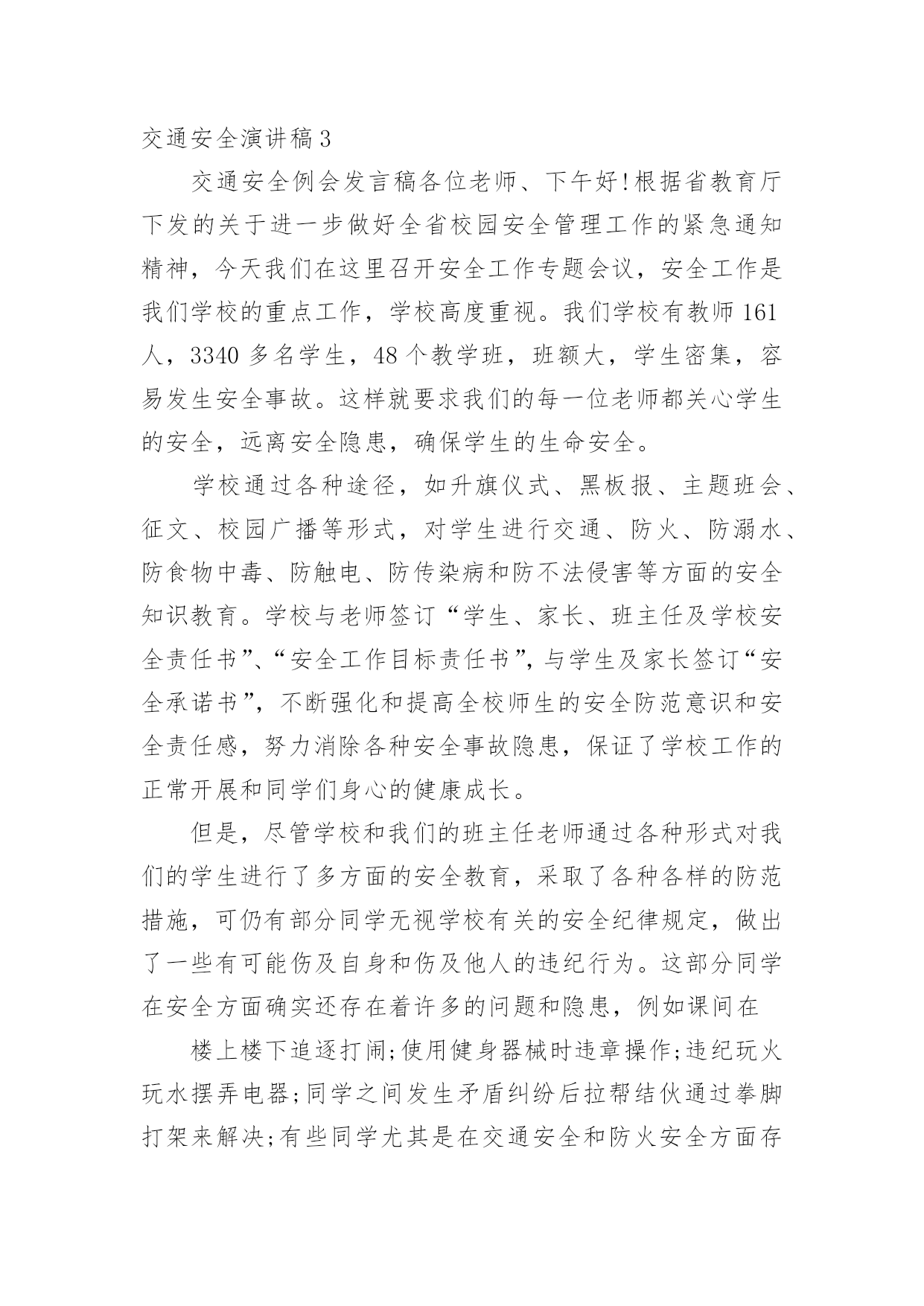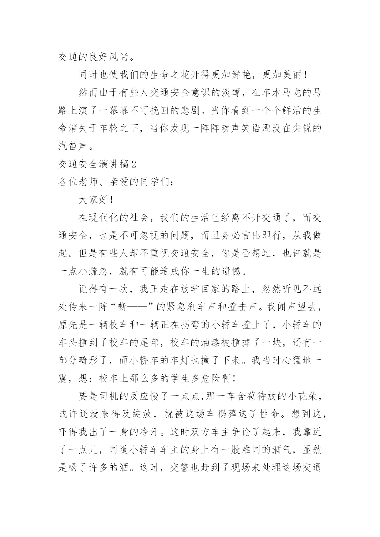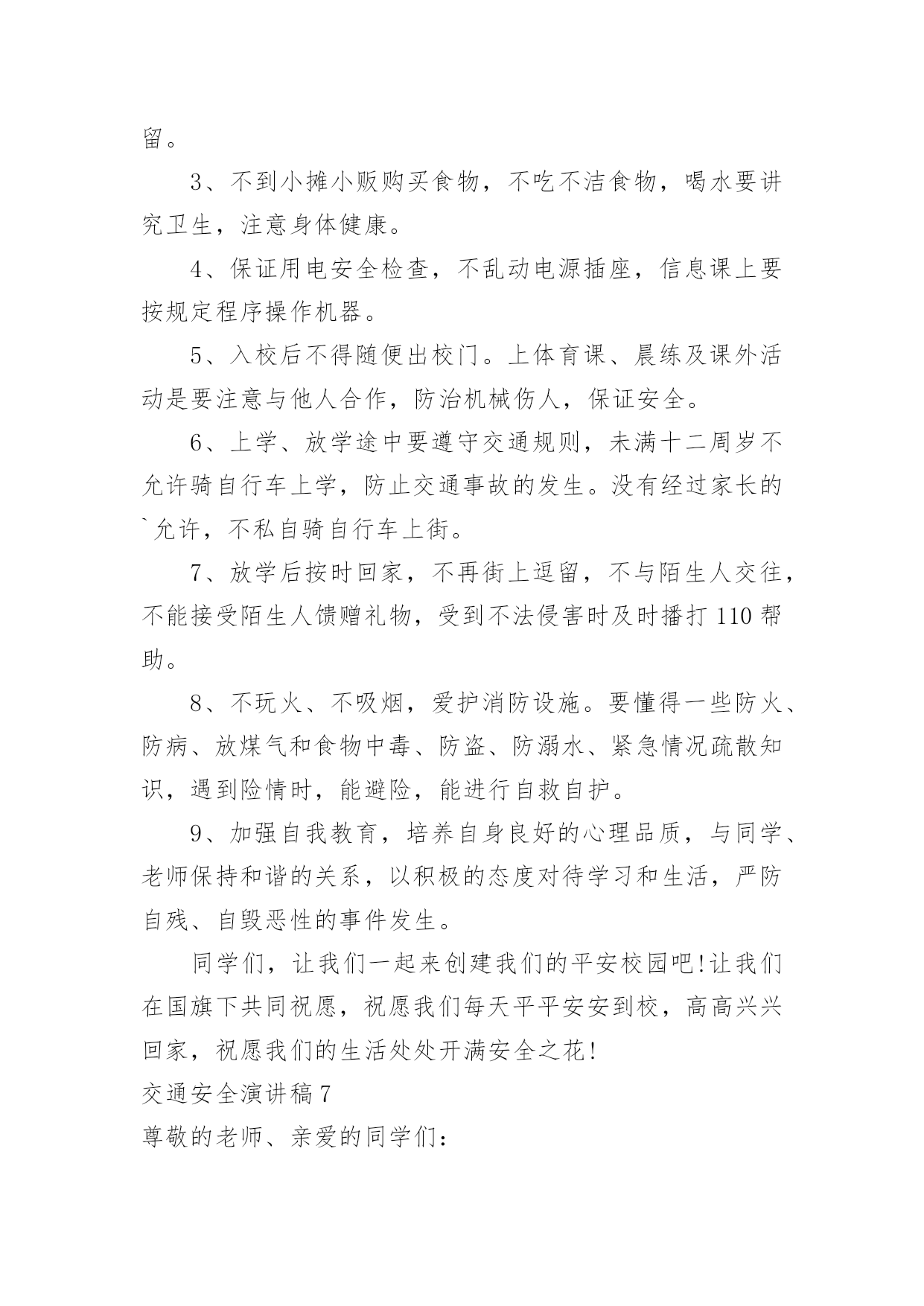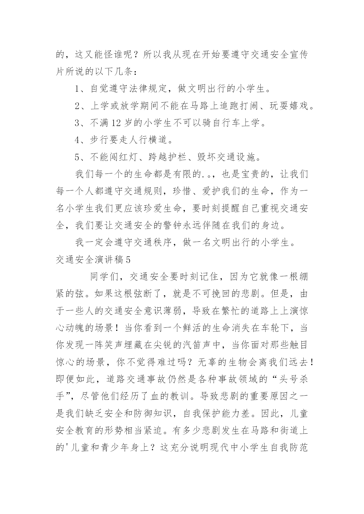 交通安全演讲稿【推荐】交通安全演讲稿好的演讲稿可以引导听众,使听众能更好地理解演讲的内容。在社会发展不断提速的今天,越来越多地方需要用到演讲稿,如何写一份恰当的演讲稿呢?以下是小编帮大家整理的交通安全演讲稿,欢迎阅读,希望大家能够喜欢。交通安全演讲稿1作为小学生我们应该多了解一些安全常识,实实在在地把“安全”装在心中并付诸行动中。9月15日,凌晨2时许,歙县境内发生一起特大交通事故,造成5人死亡2人受伤。《珍爱生命,安全出行,从我做起》谁不希望有个完整的家?谁不希望自己有个健康的身体?谁不希望能够快乐地渡过童年时光?这对于大多数孩子来说,是一件并不难的事情,而对于一个被车祸,毁于一旦的家庭来说,有多难啊!她,原本是一个活泼开朗、天真可爱的小女孩,和其它的小朋友一样,拥有幸福快乐的童年。可就在她与同伴过马路的一刹那,就在司机没有集中精力开车的一瞬间,车轮从她的腿上一下子碾了过去,鲜红的'血迹染红了马路,剧烈的疼痛使她晕了过去,失去了知觉。医生对她的父母说:“要命还是要腿!”她的家人无法接受这样残忍的事实,为了让她活下去,只好让医生为她做了截肢手术。剧烈的疼痛使女孩从昏迷中醒来,她使劲睁开双眼,朦胧中女孩下意识地摸摸双腿,顿时眼前一黑,眼泪夺眶而出,大声哭喊道:“爸爸妈妈救我,我的腿呢?我的腿到哪里去了?我的腿呢?”爸爸妈妈与女孩哭着抱在一起,一家人似乎已经绝望了。顿时感到天塌地陷。到了该上学的时候,女孩哭着闹着要上学,父母看着这一切,心都碎了。爸爸无奈只好用一个篮球支撑她那娇小的身体,她用两个木块撑着地面向前费力地挪动。这一幕,使人们流下了心酸的泪水。20xx年“篮球女孩”抵达北京,接受免费治疗,医生给她装上了假肢,在她自己不懈的努力下,终于可以自己走路了,小女孩稚嫩的小脸上露出了欣慰的笑容。虽然小女孩的肢体康复了,可心灵上严重的创伤是无法弥补的。这些事例昭示着我们:要珍爱生命,就要遵守交通规则,倘若没有了健康,我们就没有了幸福,没有了一切。生命对于每个人都只有一次,我们小学生,更要珍惜自己的生命,珍惜自己的健康,珍惜家庭的幸福。要认真学习交通安全的法律法规,遵守交通规则,树立交通安全意识,当我们行走在车来人往马路上时,请时刻保持清醒的头脑,不在马路上嬉戏打闹;当我们过马路时,多一份兼让与耐心,文明礼让,互相尊重,不闯红灯。绝不能贪一时之快,横穿马路;这样我们的人生才会美丽,我们才会远离悲伤。同学们让我们大家一起行动起来吧!大手牵小手,以自己的交通行为,影响周围的人,使我们的社会形成一种文明交通的良好风尚。同时也使我们的生命之花开得更加鲜艳,更加美丽!然而由于有些人交通安全意识的淡薄,在车水马龙的马路上演了一幕幕不可挽回的悲剧。当你看到一个个鲜活的生命消失于车轮之下,当你发现一阵阵欢声笑语湮没在尖锐的汽笛声。交通安全演讲稿2各位老师、亲爱的同学们:大家好!在现代化的社会,我们的生活已经离不开交通了,而交通安全,也是不可忽视的问题,而且务必言出即行,从我做起。但是有些人却不重视交通安全,你是否想过,也许就是一点小疏忽,就有可能造成你一生的遗憾。记得有一次,我正走在放学回家的路上,忽然听见不远处传来一阵“嘶——”的紧急刹车声和撞击声。我闻声望去,原先是一辆校车和一辆正在拐弯的小轿车撞上了,小轿车的车头撞到了校车的尾部,校车的油漆被撞掉了一块,还有一部分畸形了,而小轿车的车灯也撞了下来。我当时心猛地一震,想:校车上那么多的学生多危险啊!要是司机的反应慢了一点点,那一车含苞待放的小花朵,或许还没来得及绽放,就被这场车祸葬送了性命。想到这,吓得我出了一身的冷汗。这时双方车主争论了起来,我靠近了一点儿,闻道小轿车车主的身上有一股难闻的酒气,显然是喝了许多的酒。这时,交警也赶到了现场来处理这场交通事故。那些醉酒驾驶的人们,不要再让自我的生命在生死线上徘徊了;那些不遵守交通规则的'人们,请遵守交通规则吧!作为一名小学生,我要以身作则,必须要严格遵守交通规则。交通安全,从我做起。这是刻不容缓的问题。让我们珍惜生命,注意交通安全吧。尊敬的老师们,亲爱的同学们:大家好!很高兴我今天能参加班里的交通安全演讲,我们平时每时每刻都会与交通在一起。特别是我们小朋友放学回家就跟应该遵守交通规则,我经过平时回家时总结了几条交通规则:1、我们经过马路时应该走斑马线而且要做到红灯停绿灯走!2、当我们走到马路上时应该专心走路不能和小伙伴们开玩笑或者在一起打闹!3、平时我们应该加强交通规则意识,让每个小伙伴都能知道生活中那些可以做,那些不可以做。4、年龄小的小伙伴骑自行车时不应该在大马路上行驶,而且平时骑车时应该有家长在旁边陪同!5、当经过无斑马线公路时应该“一停、二看、三通过”6、当我们走路时不应该在走路时看书以免摔倒或者出现一些意外的事。希望大家平时遵守交通规则