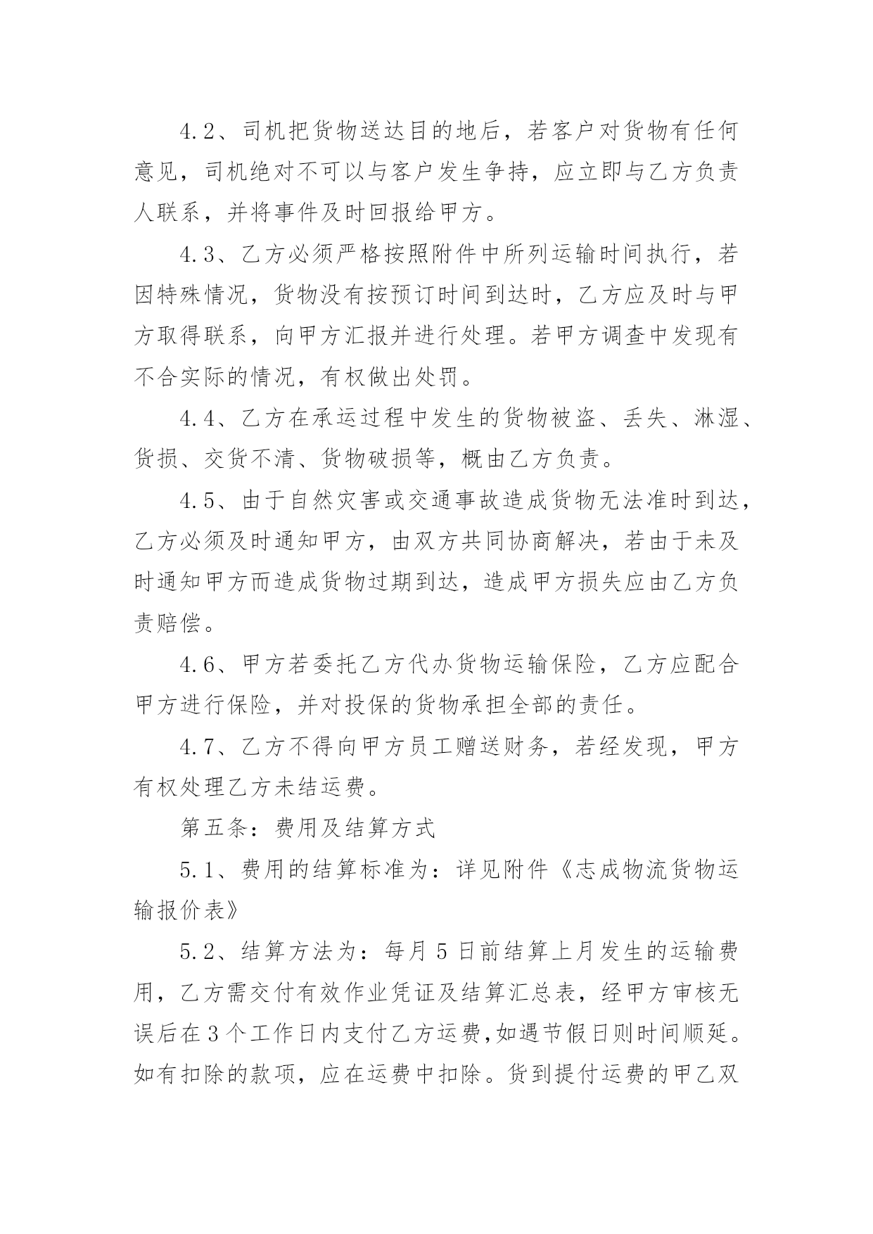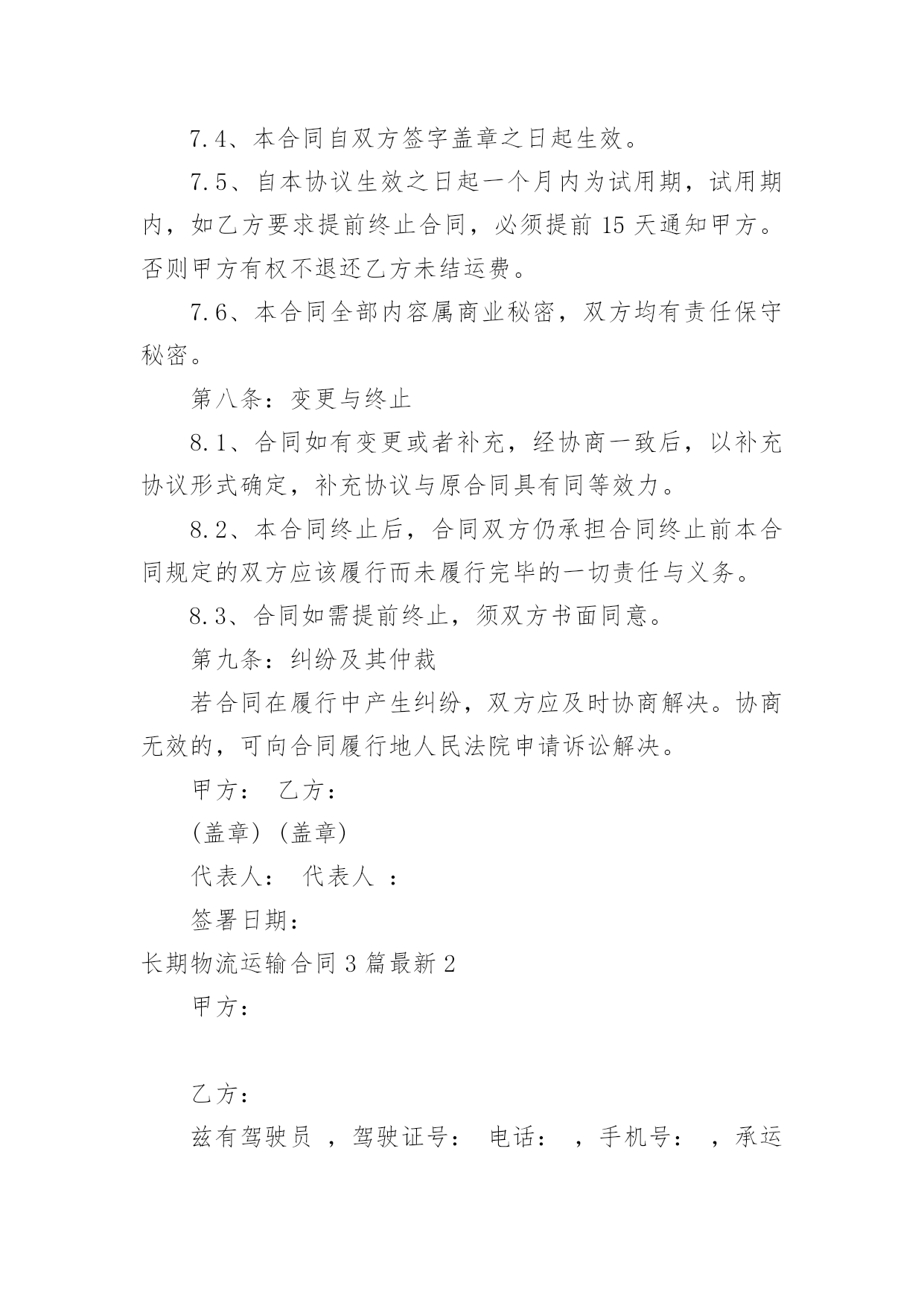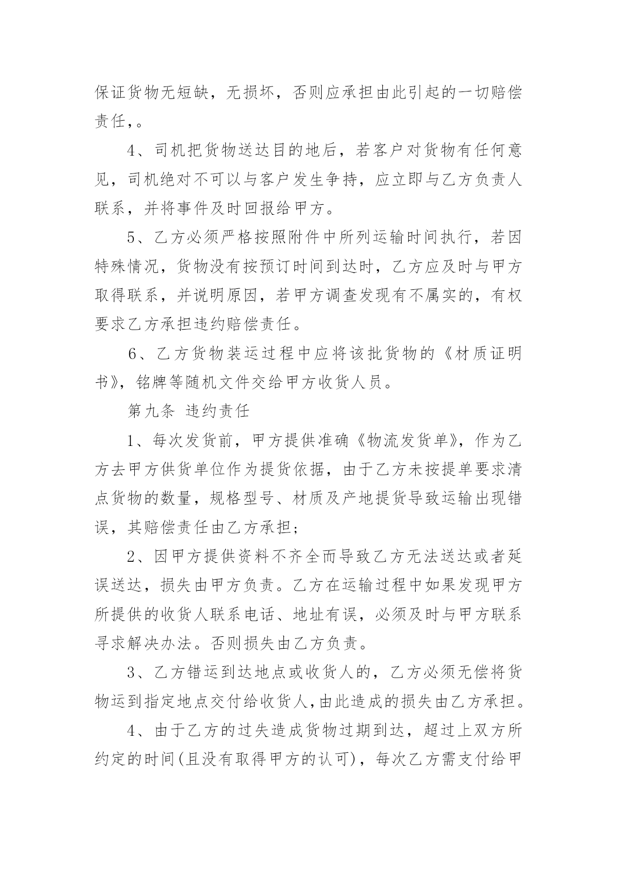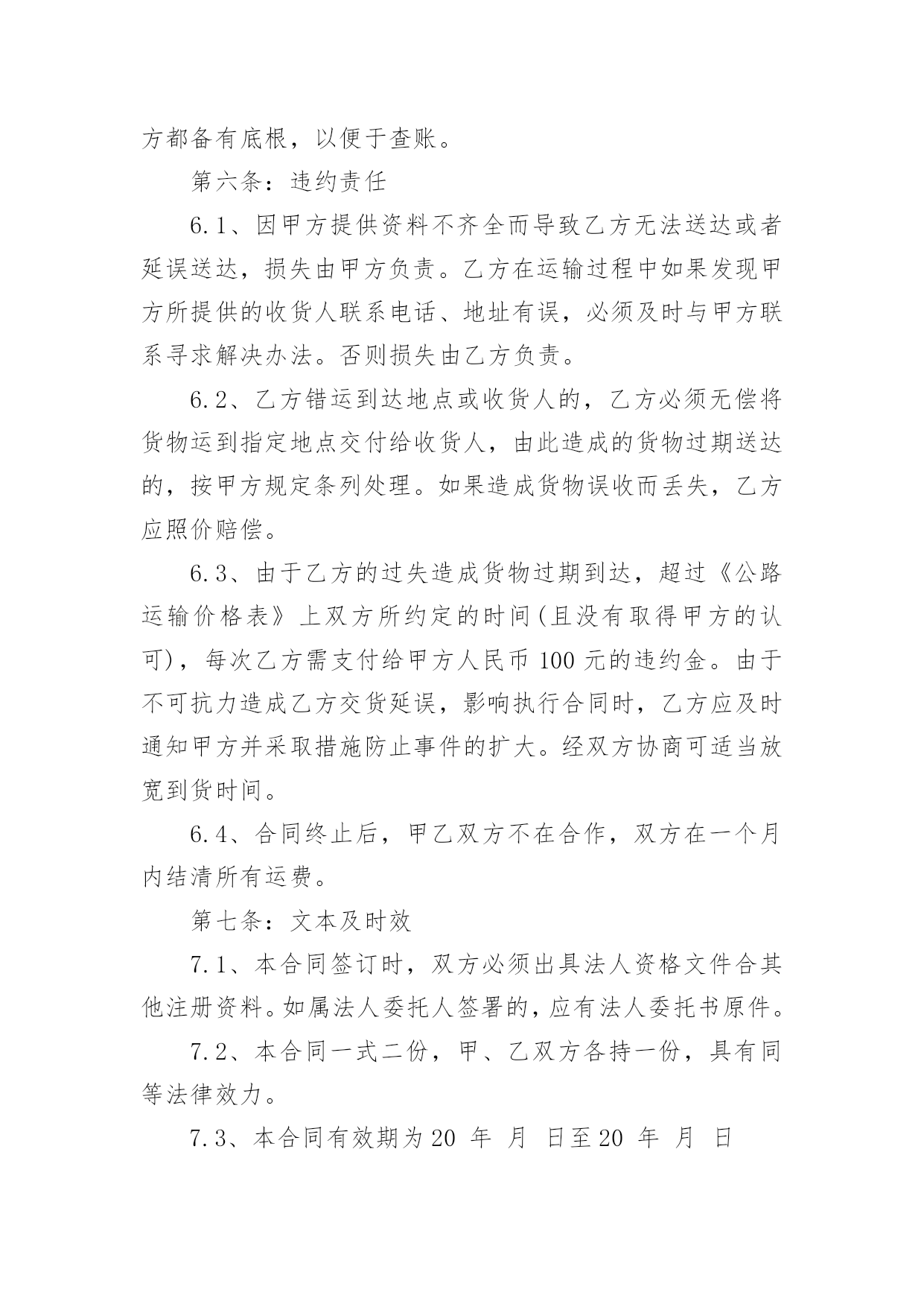 长期物流运输合同最新长期物流运输合同3篇最新随着时间的推移,合同的使用频率呈上升趋势,它也是减少和防止发生争议的重要措施。那么大家知道合法的合同书怎么写吗?以下是小编收集整理的长期物流运输合同3篇最新,希望对大家有所帮助。长期物流运输合同3篇最新1甲方(托运方):地址:传真:乙方(承运方):地址:电话:传真:甲方指定乙方为甲方货物提供公路运输服务。双方经友好协商,就具体事宜达成如下协议:第一条:承运货物及起止地点1.1、托运的主要货物为:、包装:甲方确保产品符合有关国家规定的标准包装。属性:化工产品1.2、货物的起运地点:1.3、到达地点:永红化工指定的送货地点。1.4、甲方托运的其它货物及服务内容,以货物运单或补充协议说明。第二条:操作流程(1)甲方发出运输指令(2)乙方回复认可书(3)甲方装货(4)双方验货签收(5)发往目的地交货(6)收货单位验签(7)验收后取回单(8)将回单交回甲方(9)甲方承付运费。第三条:甲方的义务和责任3.1、甲方至少提前8小时以电话或书面传真形式向乙方发出运输指令,通知内容包含发运时间、运输方式、货物名称、数量;并准确提供发运地方和目的地址及联络方式方法等信息。如发生特殊情况,甲方在乙方派出车辆前3小时有权对合理的内容进行变更。3.2、甲方保证所托运的货物不属于国家违禁品。3.3、甲方负责对乙方有关责任人和操作人员进行必要的运作要求培训。3.4、因甲方交代不清而引起的无法抵达目的地或找不到收货人所造成的损失由甲方负责。3.5、甲方保证按合同要求在乙方向甲方提交相关单据时及时结算运费给乙方。第四条:乙方责任4.1、乙方接受甲方的委托,为其提供货物运输服务,乙方应及时操作转运货物,安全、准时、准确地将货物运至甲方指定的目的地并派送到门。4.2、司机把货物送达目的地后,若客户对货物有任何意见,司机绝对不可以与客户发生争持,应立即与乙方负责人联系,并将事件及时回报给甲方。4.3、乙方必须严格按照附件中所列运输时间执行,若因特殊情况,货物没有按预订时间到达时,乙方应及时与甲方取得联系,向甲方汇报并进行处理。若甲方调查中发现有不合实际的情况,有权做出处罚。4.4、乙方在承运过程中发生的货物被盗、丢失、淋湿、货损、交货不清、货物破损等,概由乙方负责。4.5、由于自然灾害或交通事故造成货物无法准时到达,乙方必须及时通知甲方,由双方共同协商解决,若由于未及时通知甲方而造成货物过期到达,造成甲方损失应由乙方负责赔偿。4.6、甲方若委托乙方代办货物运输保险,乙方应配合甲方进行保险,并对投保的货物承担全部的责任。4.7、乙方不得向甲方员工赠送财务,若经发现,甲方有权处理乙方未结运费。第五条:费用及结算方式5.1、费用的结算标准为:详见附件《志成物流货物运输报价表》5.2、结算方法为:每月5日前结算上月发生的运输费用,乙方需交付有效作业凭证及结算汇总表,经甲方审核无误后在3个工作日内支付乙方运费,如遇节假日则时间顺延。如有扣除的款项,应在运费中扣除。货到提付运费的甲乙双方都备有底根,以便于查账。第六条:违约责任6.1、因甲方提供资料不齐全而导致乙方无法送达或者延误送达,损失由甲方负责。乙方在运输过程中如果发现甲方所提供的收货人联系电话、地址有误,必须及时与甲方联系寻求解决办法。否则损失由乙方负责。6.2、乙方错运到达地点或收货人的,乙方必须无偿将货物运到指定地点交付给收货人,由此造成的货物过期送达的,按甲方规定条列处理。如果造成货物误收而丢失,乙方应照价赔偿。6.3、由于乙方的过失造成货物过期到达,超过《公路运输价格表》上双方所约定的时间(且没有取得甲方的认可),每次乙方需支付给甲方人民币100元的违约金。由于不可抗力造成乙方交货延误,影响执行合同时,乙方应及时通知甲方并采取措施防止事件的扩大。经双方协商可适当放宽到货时间。6.4、合同终止后,甲乙双方不在合作,双方在一个月内结清所有运费。第七条:文本及时效7.1、本合同签订时,双方必须出具法人资格文件合其他注册资料。如属法人委托人签署的,应有法人委托书原件。7.2、本合同一式二份,甲、乙双方各持一份,具有同等法律效力。7.3、本合同有效期为20年月日至20年月日7.4、本合同自双方签字盖章之日起生效。7.5、自本协议生效之日起一个月内为试用期,试用期内,如乙方要求提前终止合同,必须提前15天通知甲方。否则甲方有权不退还乙方未结运费。7.6、本合同全部内容属商业秘密,双方均有责任保守秘密。第八条:变更与终止8.1、合同如有变更或者补充,经协商一致后,以补充协议形式确定,补充协议与原合同具有同等效力。8.2、本合同终止后,合同双方仍承担合同终止前本合同规定的双方应该履行而未履行完毕的一切责任与义务。8.3、合同如需提前终止,须双方书面同意。第九条:纠纷及其仲裁若合同在履