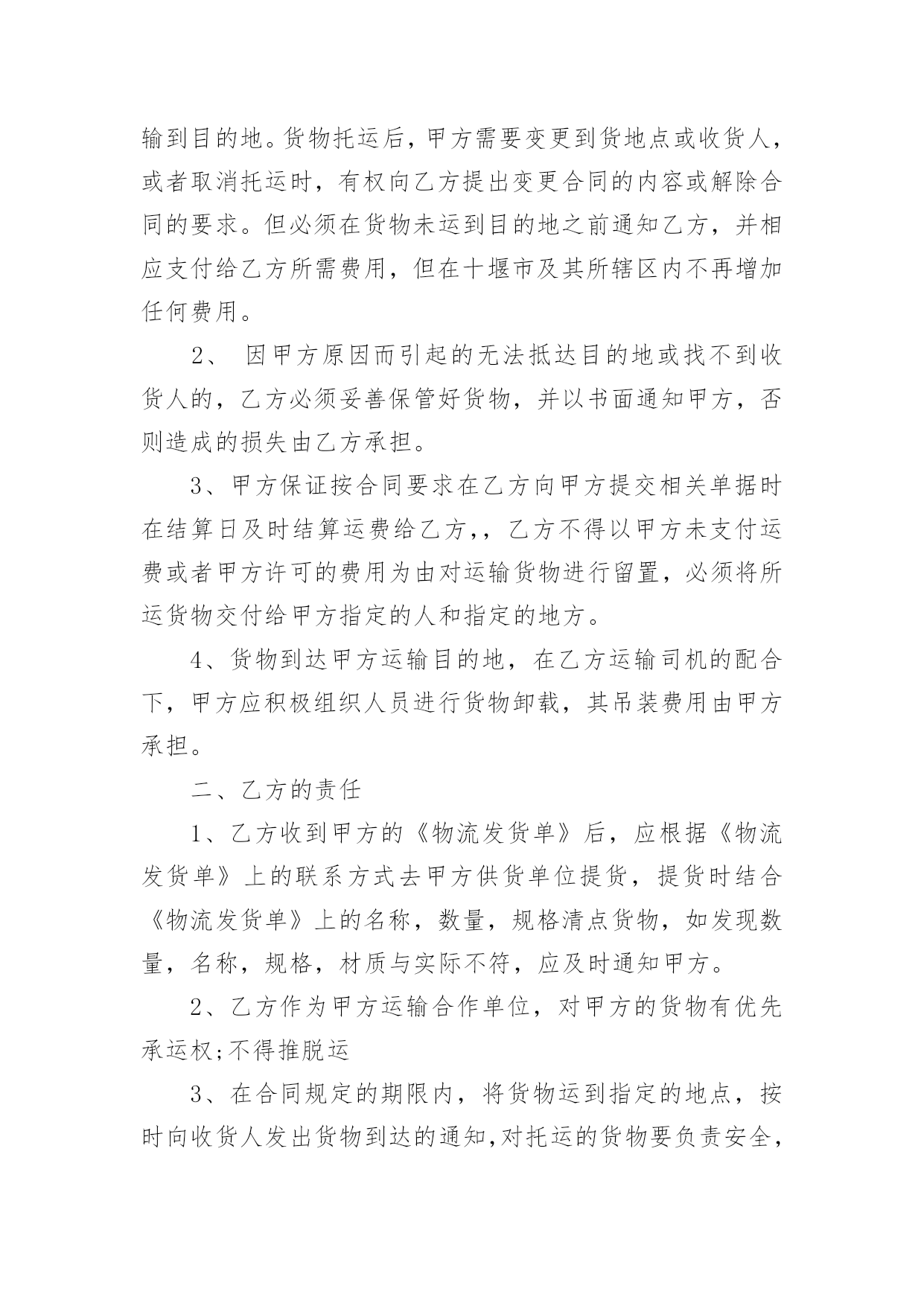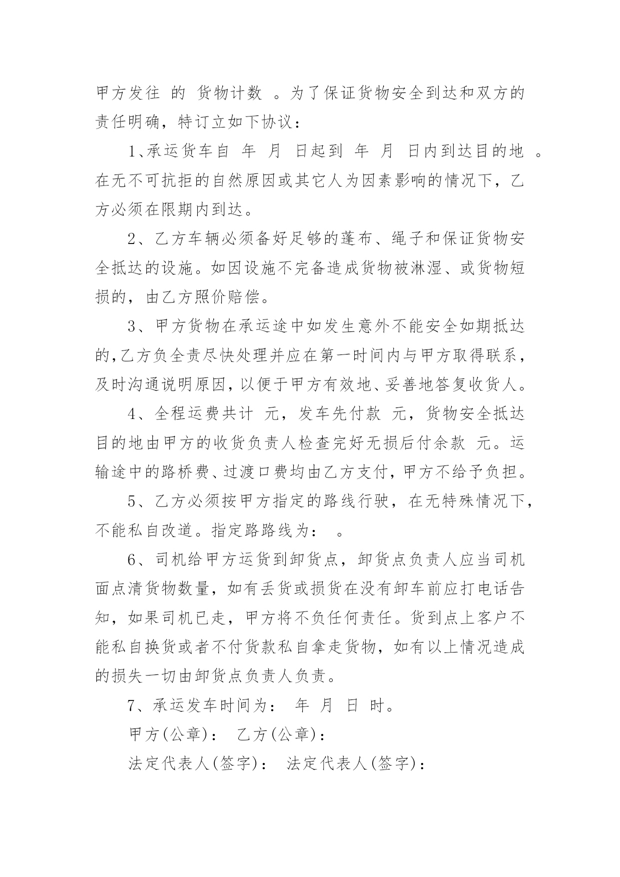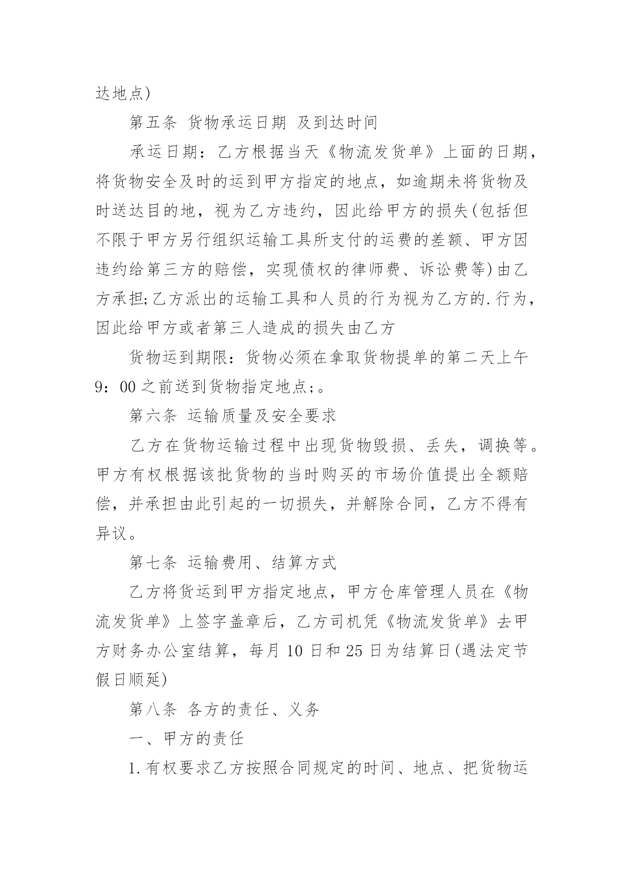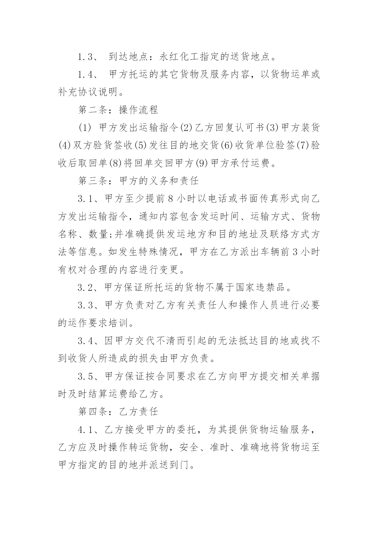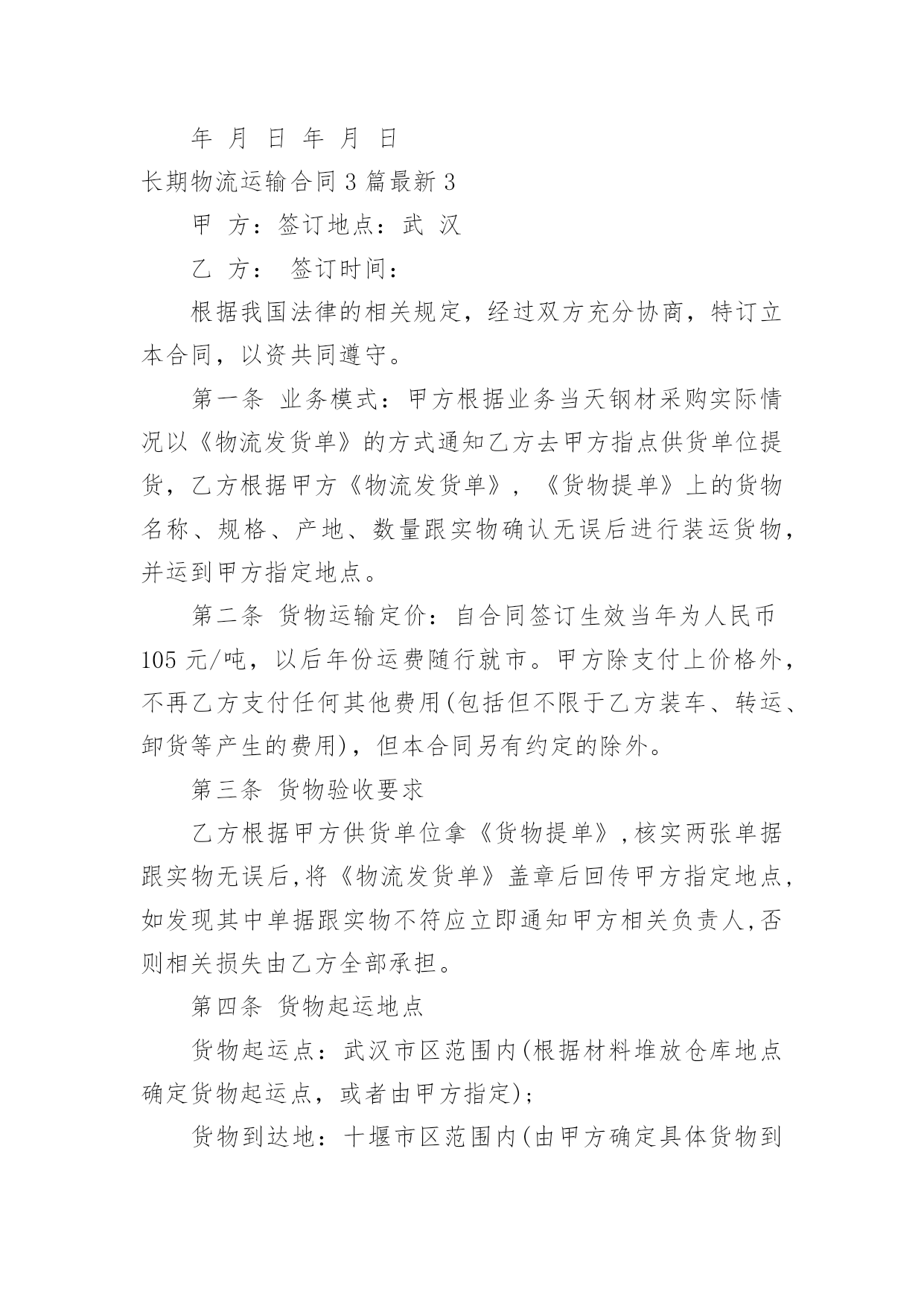 长期物流运输合同最新长期物流运输合同3篇最新随着时间的推移,合同的使用频率呈上升趋势,它也是减少和防止发生争议的重要措施。那么大家知道合法的合同书怎么写吗?以下是小编收集整理的长期物流运输合同3篇最新,希望对大家有所帮助。长期物流运输合同3篇最新1甲方(托运方):地址:传真:乙方(承运方):地址:电话:传真:甲方指定乙方为甲方货物提供公路运输服务。双方经友好协商,就具体事宜达成如下协议:第一条:承运货物及起止地点1.1、托运的主要货物为:、包装:甲方确保产品符合有关国家规定的标准包装。属性:化工产品1.2、货物的起运地点:1.3、到达地点:永红化工指定的送货地点。1.4、甲方托运的其它货物及服务内容,以货物运单或补充协议说明。第二条:操作流程(1)甲方发出运输指令(2)乙方回复认可书(3)甲方装货(4)双方验货签收(5)发往目的地交货(6)收货单位验签(7)验收后取回单(8)将回单交回甲方(9)甲方承付运费。第三条:甲方的义务和责任3.1、甲方至少提前8小时以电话或书面传真形式向乙方发出运输指令,通知内容包含发运时间、运输方式、货物名称、数量;并准确提供发运地方和目的地址及联络方式方法等信息。如发生特殊情况,甲方在乙方派出车辆前3小时有权对合理的内容进行变更。3.2、甲方保证所托运的货物不属于国家违禁品。3.3、甲方负责对乙方有关责任人和操作人员进行必要的运作要求培训。3.4、因甲方交代不清而引起的无法抵达目的地或找不到收货人所造成的损失由甲方负责。3.5、甲方保证按合同要求在乙方向甲方提交相关单据时及时结算运费给乙方。第四条:乙方责任4.1、乙方接受甲方的委托,为其提供货物运输服务,乙方应及时操作转运货物,安全、准时、准确地将货物运至甲方指定的目的地并派送到门。4.2、司机把货物送达目的地后,若客户对货物有任何意见,司机绝对不可以与客户发生争持,应立即与乙方负责人联系,并将事件及时回报给甲方。4.3、乙方必须严格按照附件中所列运输时间执行,若因特殊情况,货物没有按预订时间到达时,乙方应及时与甲方取得联系,向甲方汇报并进行处理。若甲方调查中发现有不合实际的情况,有权做出处罚。4.4、乙方在承运过程中发生的货物被盗、丢失、淋湿、货损、交货不清、货物破损等,概由乙方负责。4.5、由于自然灾害或交通事故造成货物无法准时到达,乙方必须及时通知甲方,由双方共同协商解决,若由于未及时通知甲方而造成货物过期到达,造成甲方损失应由乙方负责赔偿。4.6、甲方若委托乙方代办货物运输保险,乙方应配合甲方进行保险,并对投保的货物承担全部的责任。4.7、乙方不得向甲方员工赠送财务,若经发现,甲方有权处理乙方未结运费。第五条:费用及结算方式5.1、费用的结算标准为:详见附件《志成物流货物运输报价表》5.2、结算方法为:每月5日前结算上月发生的运输费用,乙方需交付有效作业凭证及结算汇总表,经甲方审核无误后在3个工作日内支付乙方运费,如遇节假日则时间顺延。如有扣除的款项,应在运费中扣除。货到提付运费的甲乙双方都备有底根,以便于查账。第六条:违约责任6.1、因甲方提供资料不齐全而导致乙方无法送达或者延误送达,损失由甲方负责。乙方在运输过程中如果发现甲方所提供的收货人联系电话、地址有误,必须及时与甲方联系寻求解决办法。否则损失由乙方负责。6.2、乙方错运到达地点或收货人的,乙方必须无偿将货物运到指定地点交付给收货人,由此造成的货物过期送达的,按甲方规定条列处理。如果造成货物误收而丢失,乙方应照价赔偿。6.3、由于乙方的过失造成货物过期到达,超过《公路运输价格表》上双方所约定的时间(且没有取得甲方的认可),每次乙方需支付给甲方人民币100元的违约金。由于不可抗力造成乙方交货延误,影响执行合同时,乙方应及时通知甲方并采取措施防止事件的扩大。经双方协商可适当放宽到货时间。6.4、合同终止后,甲乙双方不在合作,双方在一个月内结清所有运费。第七条:文本及时效7.1、本合同签订时,双方必须出具法人资格文件合其他注册资料。如属法人委托人签署的,应有法人委托书原件。7.2、本合同一式二份,甲、乙双方各持一份,具有同等法律效力。7.3、本合同有效期为20年月日至20年月日7.4、本合同自双方签字盖章之日起生效。7.5、自本协议生效之日起一个月内为试用期,试用期内,如乙方要求提前终止合同,必须提前15天通知甲方。否则甲方有权不退还乙方未结运费。7.6、本合同全部内容属商业秘密,双方均有责任保守秘密。第八条:变更与终止8.1、合同如有变更或者补充,经协商一致后,以补充协议形式确定,补充协议与原合同具有同等效力。8.2、本合同终止后,合同双方仍承担合同终止前本合同规定的双方应该履行而未履行完毕的一切责任与义务。8.3、合同如需提前终止,须双方书面同意。第九条:纠纷及其仲裁若合同在履