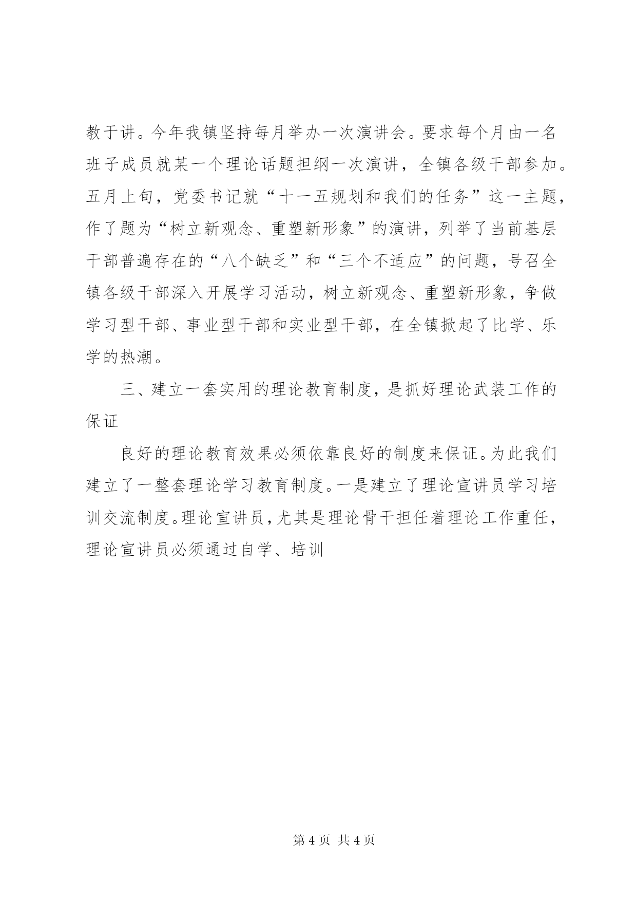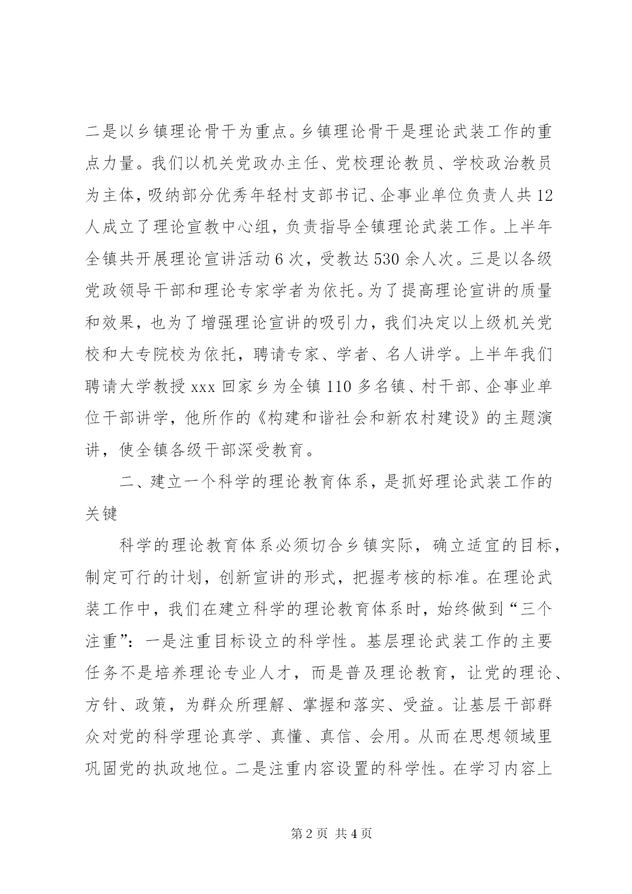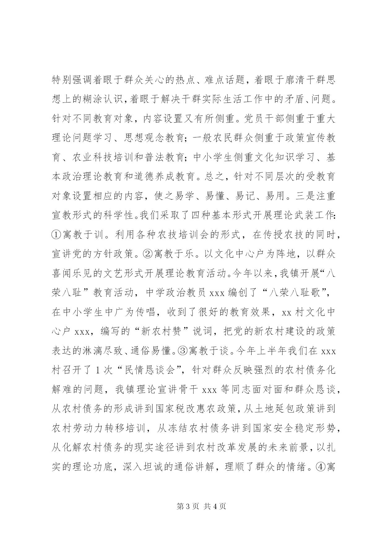 第PAGE\*Arabic\*MERGEFORMAT4页共NUMPAGES\*MERGEFORMAT4页乡镇理论武装工作总结找准切入点创新求实效——xx镇理论武装工作总结理论武装工作是宣传思想政治工作的一个重要方面,我们党历来主张以科学的理论武装人,但由于理论本身的抽象性、复杂性,往往导致理论教育、理论武装陷于单调、枯燥和缺乏吸引力的境地,如何使理论武装工作做到深入浅出、通俗易懂、学以致用、富有成效,一直是我镇党委不断探索和实践的重要课题。我们的体会是理论武装工作必须坚持“以人为本,创新思路,找准切入点,增强吸引力。”就是要以干群普遍关心的热点、难点话题为切入点。我们的具体做法是:一、建立一支优秀的理论宣教队伍是抓好理论武装工作的前提要增强理论武装工作的实效性,必须建立一支素质精良的理论宣教队伍,为此我们从三个层面来组建这支队伍:一是以基层政工干部为基础。我们在每个村和每个单位分别配套了2名和1名理论宣讲员,理论宣讲员由负责党务或政工的班子成员担任,在农村还从退休教师、离职村干部中聘请了一名理论宣讲员。依靠基层宣讲员开展“面对面”宣讲活动。今年以来全镇农村开展群众性理论宣讲活动50余场。四月下旬组织全镇在xx村召开了理论宣讲观摩会,年轻优秀的村支部书记,结合实际向村民讲解了党中央关于加快新农村建设的决定,使村民大受教育和鼓舞。二是以乡镇理论骨干为重点。乡镇理论骨干是理论武装工作的重点力量。我们以机关党政办主任、党校理论教员、学校政治教员为主体,吸纳部分优秀年轻村支部书记、企事业单位负责人共12人成立了理论宣教中心组,负责指导全镇理论武装工作。上半年全镇共开展理论宣讲活动6次,受教达530余人次。三是以各级党政领导干部和理论专家学者为依托。为了提高理论宣讲的质量和效果,也为了增强理论宣讲的吸引力,我们决定以上级机关党校和大专院校为依托,聘请专家、学者、名人讲学。上半年我们聘请大学教授xxx回家乡为全镇110多名镇、村干部、企事业单位干部讲学,他所作的《构建和谐社会和新农村建设》的主题演讲,使全镇各级干部深受教育。二、建立一个科学的理论教育体系,是抓好理论武装工作的关键科学的理论教育体系必须切合乡镇实际,确立适宜的目标,制定可行的计划,创新宣讲的形式,把握考核的标准。在理论武装工作中,我们在建立科学的理论教育体系时,始终做到“三个注重”:一是注重目标设立的科学性。基层理论武装工作的主要任务不是培养理论专业人才,而是普及理论教育,让党的理论、方针、政策,为群众所理解、掌握和落实、受益。让基层干部群众对党的科学理论真学、真懂、真信、会用。从而在思想领域里巩固党的执政地位。二是注重内容设置的科学性。在学习内容上特别强调着眼于群众关心的热点、难点话题,着眼于廓清干群思想上的糊涂认识,着眼于解决干群实际生活工作中的矛盾、问题。针对不同教育对象,内容设置又有所侧重。党员干部侧重于重大理论问题学习、思想观念教育;一般农民群众侧重于政策宣传教育、农业科技培训和普法教育;中小学生侧重文化知识学习、基本政治理论教育和道德养成教育。总之,针对不同层次的受教育对象设置相应的内容,使之易学、易懂、易记、易用。三是注重宣教形式的科学性。我们采取了四种基本形式开展理论武装工作:①寓教于训。利用各种农技培训会的形式,在传授农技的同时,宣讲党的方针政策。②寓教于乐。以文化中心户为阵地,以群众喜闻乐见的文艺形式开展理论教育活动。今年以来,我镇开展“八荣八耻”教育活动,中学政治教员xxx编创了“八荣八耻歌”,在中小学生中广为传唱,收到了很好的教育效果,xx村文化中心户xxx,编写的“新农村赞”说词,把党的新农村建设的政策表达的淋漓尽致、通俗易懂。③寓教于谈。今年上半年我们在xxx村召开了1次“民情恳谈会”,针对群众反映强烈的农村债务化解难的问题,我镇理论宣讲骨干xxx等同志面对面和群众恳谈,从农村债务的形成讲到国家税改惠农政策,从土地延包政策讲到农村劳动力转移培训,从冻结农村债务讲到国家安全稳定形势,从化解农村债务的现实途径讲到农村改革发展的未来前景,以扎实的理论功底,深入坦诚的通俗讲解,理顺了群众的情绪。④寓教于讲。今年我镇坚持每月举办一次演讲会。要求每个月由一名班子成员就某一个理论话题担纲一次演讲,全镇各级干部参加。五月上旬,党委书记就“十一五规划和我们的任务”这一主题,作了题为“树立新观念、重塑新形象”的演讲,列举了当前基层干部普遍存在的“八个缺乏”和“三个不适应”的问题,号召全镇各级干部深入开展学习活动,树立新观念、重塑新形象,争做学习型干部、事业型干部和实业型干部,在全镇掀起了比学、乐学的热潮。三、建立一套实用的理论教育制度,是抓好理论武装工作的保证良好的理论教育效果必须依靠良好的制度来保证。为此我们建立了一整套理论学习教育制度。一