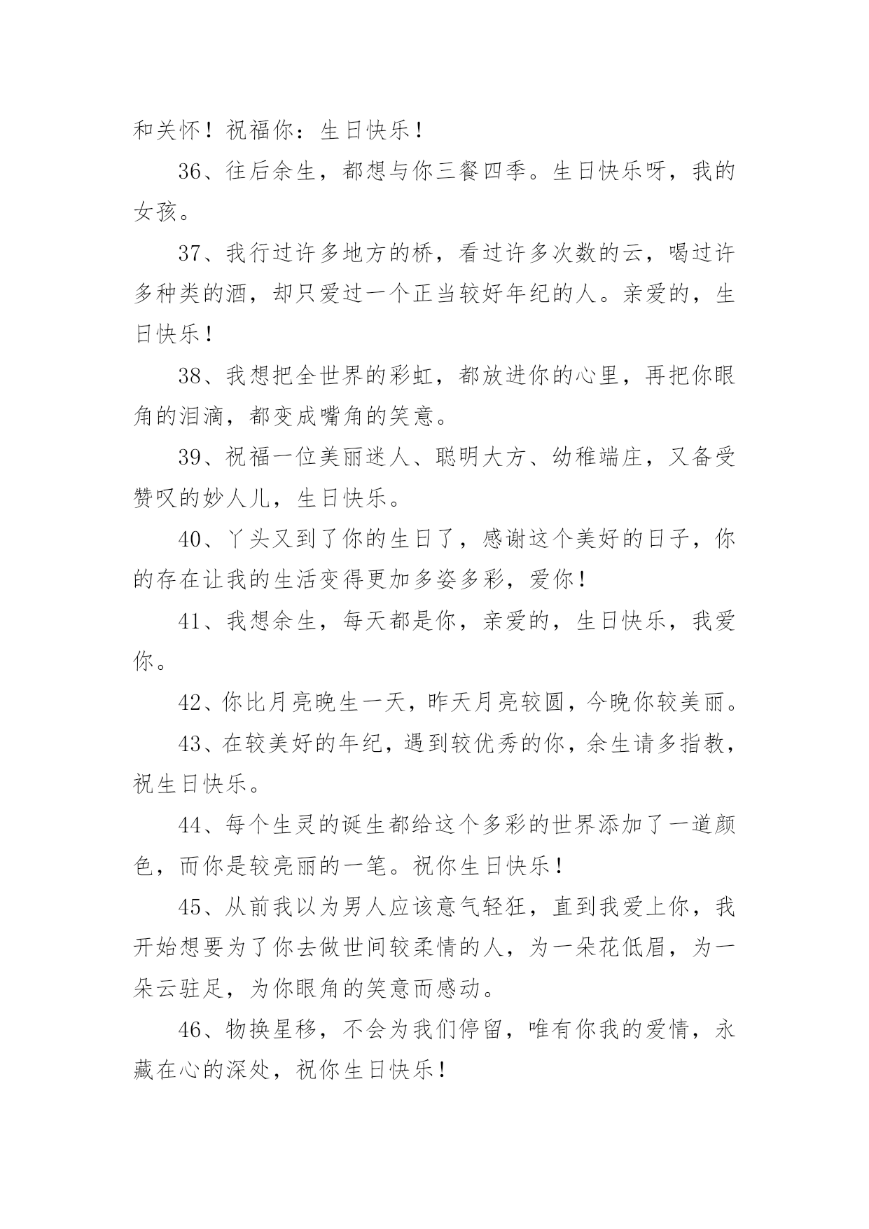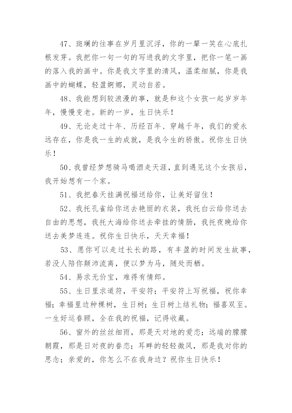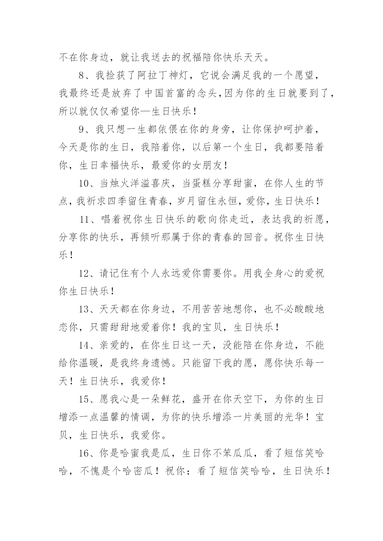 女朋友生日快乐文案女朋友生日快乐文案(精选600句)随着移动互联网和社交网络的发展,越来越多人喜欢发表文案,文案用于记录和分享生活中有意义的事。你还在找有意思的文案吗?以下是小编为大家整理的女朋友生日快乐文案,仅供参考,欢迎大家阅读。1、去年这一天和你在一起很快乐,因为那天是你生日。今天虽没有和你在再一起,仍希望你能快乐、健康、美丽!生日快乐!2、生命和爱是人类最高的意义。在试着把握生命的同时,愿你早日找到爱!生日快乐!3、让短信捎给你我的祝福言语,浓浓情意都在这一份真挚的心思里,愿你的生日充满无穷快乐,愿你的回忆充满温馨,愿你在新的一年里梦想成真。4、愿你每一年的每一天都充满快乐明媚和爱。祝你生日快乐!5、山动的短信是我跳动的心,跳跃的字符是我热情的爱!欢快的消息音?当然就是我对你的赞美了,祝我最亲爱的你生日快乐。6、全宇宙最可爱的小仙女,生日快乐!喜欢你没道理,愿你美丽依旧,幸运有你!7、千万里的距离,也割不断我对你的思念;无数日夜的轮换,也冲淡不了我对你的眷恋。今天是你的生日,而我不在你身边,就让我送去的祝福陪你快乐天天。8、我捡获了阿拉丁神灯,它说会满足我的一个愿望,我最终还是放弃了中国首富的念头,因为你的生日就要到了,所以就仅仅希望你—生日快乐!9、我只想一生都依偎在你的身旁,让你保护呵护着,今天是你的生日,我陪着你,以后第一个生日,我都要陪着你,生日幸福快乐,最爱你的女朋友!10、当烛火洋溢喜庆,当蛋糕分享甜蜜,在你人生的节点,我祈求四季留住青春,岁月留住永恒,爱你,生日快乐!11、唱着祝你生日快乐的歌向你走近,表达我的祈愿,分享你的快乐,再倾听那属于你的青春的回音。祝你生日快乐!12、请记住有个人永远爱你需要你。用我全身心的爱祝你生日快乐!13、天天都在你身边,不用苦苦地想你,也不必酸酸地恋你,只需甜甜地爱着你!我的宝贝,生日快乐!14、亲爱的,在你生日这一天,没能陪在你身边,不能给你温暖,是我终身遗憾。只能留下我的愿,愿你快乐每一天!生日快乐,我爱你!15、愿我心是一朵鲜花,盛开在你天空下,为你的生日增添一点温馨的情调,为你的快乐增添一片美丽的光华!宝贝,生日快乐,我爱你。16、你是哈蜜我是瓜,生日你不笨瓜瓜,看了短信笑哈哈,不愧是个哈密瓜!祝你:看了短信笑哈哈,生日快乐!17、今天使你的生日,你不再我的眼前。在这春日的风里,做一只风筝送你,载有我无尽的思念。18、正如玫瑰逗人喜爱,愿你的生日带给你愉快,因为你是最可爱的妹妹,愿你生日焕发光彩,伴随着喜悦和欢笑,从天明到日落。19、生日,是纪念一个人来到这个世界的日子,无论在多么忙碌的日子里,有一些人的纪念日我们一定要记住—爱着我们的人!祝你:生日快乐!20、只有懂得生活的人,才干领略鲜花的娇艳,只有懂得爱的人,才干领略到心中芬芳,祝你有一个特别的生日。21、最爱的生日送上祝福:你是一片云,我也是一片云,缘分如风让你我相遇,爱情的火花立刻开始电鸣,和我开始恋爱的大雨吧,相信我们恋爱过后,会有幸福的彩虹!22、今天阳光如珍珠般明媚,空气如泉水般清新,花草树木如画般美丽,鸟儿的鸣叫如流淌的小溪一样明快,原来今天是你的生日,祝你生日快乐,幸福常伴。23、祝我的爱人生日快乐,时光飞逝,但我对你的爱却更醇厚。在这特殊的日子里,我想告诉你,你的爱使我的生命变得完整。24、无言又无语,若即又若离。我思念着你,天天在一起;我深爱着你,默默在心底;我祝福着你:生日快乐!25、或许你其真不是为我而生,可我却有幸与你相伴。愿我有生之年,年年为你点燃生日的烛焰,生日快乐哦!26、在宁静的夜晚,伴着梦幻的烛光,听着轻轻的音乐,品着浓浓的葡萄酒,让我陪伴你渡过一个难忘的生日!27、昨日的风雨,已经远去。今天的你我,还将继续。忘记所有的哭泣,明天的你依然美丽。生日快乐!开心度过!28、从没有让别人给自己过过生日,只是自己记得自己的生日。29、较爱的生日送上祝福:你是一片云,我也是一片云,缘分如风让你我相遇,爱情的火花立刻开始电鸣,和我开始恋爱的大雨吧,相信我们恋爱过后,会有幸福的彩虹!30、自信和勇气,你给,你给我的是一个全新的世界。有了你,我是所有快乐,所有的喜悦!我爱你,它的钱。31、祝愿你,在这特别的日子里,幸福平安,心情美丽;祝愿你,在这美好的日子里,爱情甜蜜,事事如意;祝愿你,在这特别的日子里,一切顺利。生日快乐!32、祝你生日快乐,然后每天都比生日快乐!日子越过越快活,每天都像过生日一样乐呵呵!爱情事业都红火,礼多人不怪,再次祝福你生日快乐好运多!33、祝你生日快乐!你的才干使这个世界变得更加美好,愿这完全属于你的一天带给你快乐,愿未来的日子锦上添花!34、祝福的话语来自电波:生活的美好要努力拼搏,日子的甜美要品尝波折,快意的心境需精心打磨,乐悠闲适的知足较难得。35、祝福的