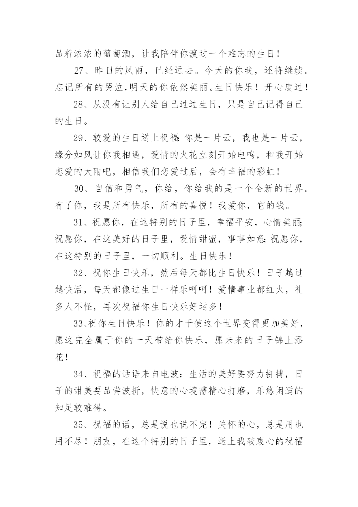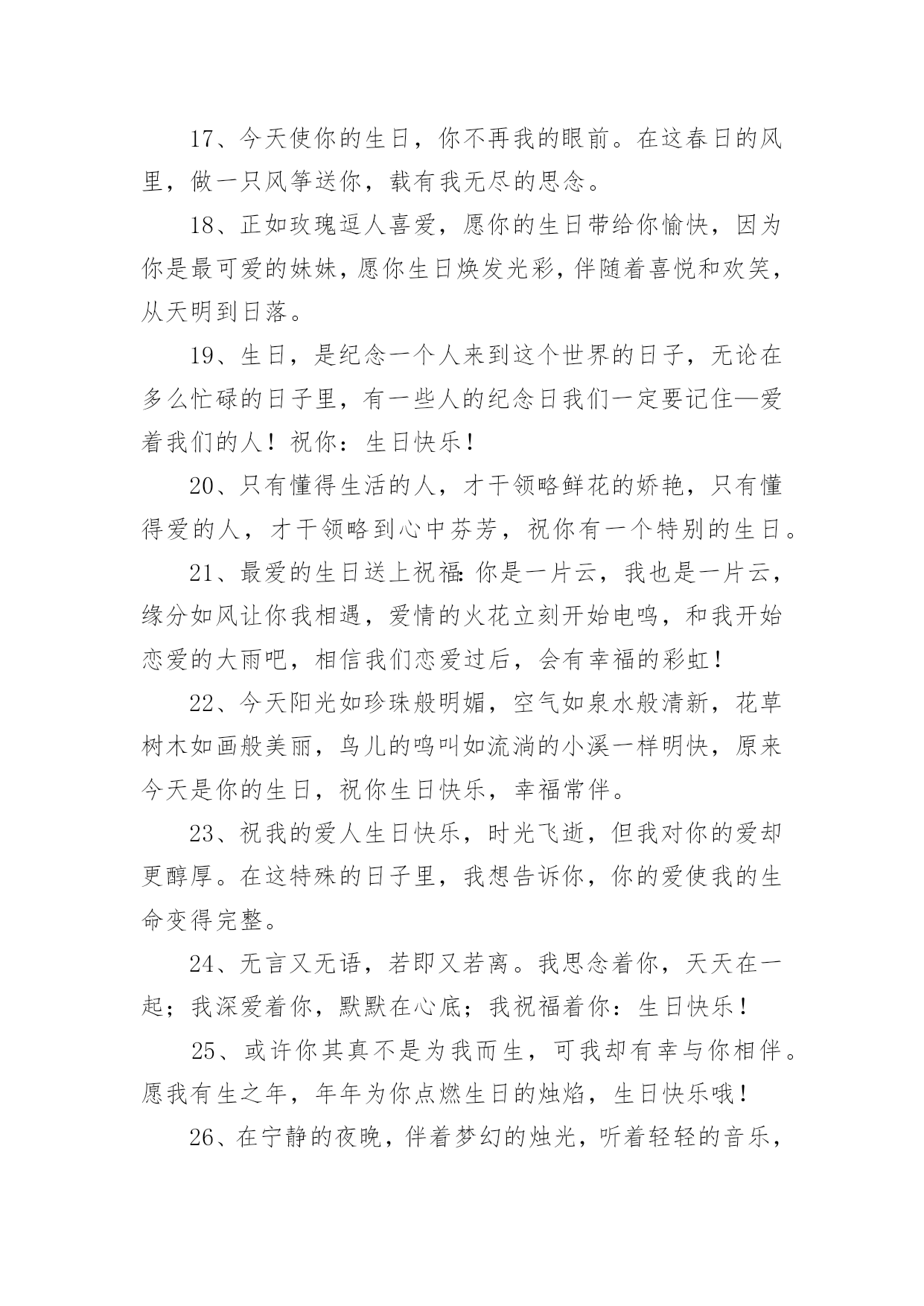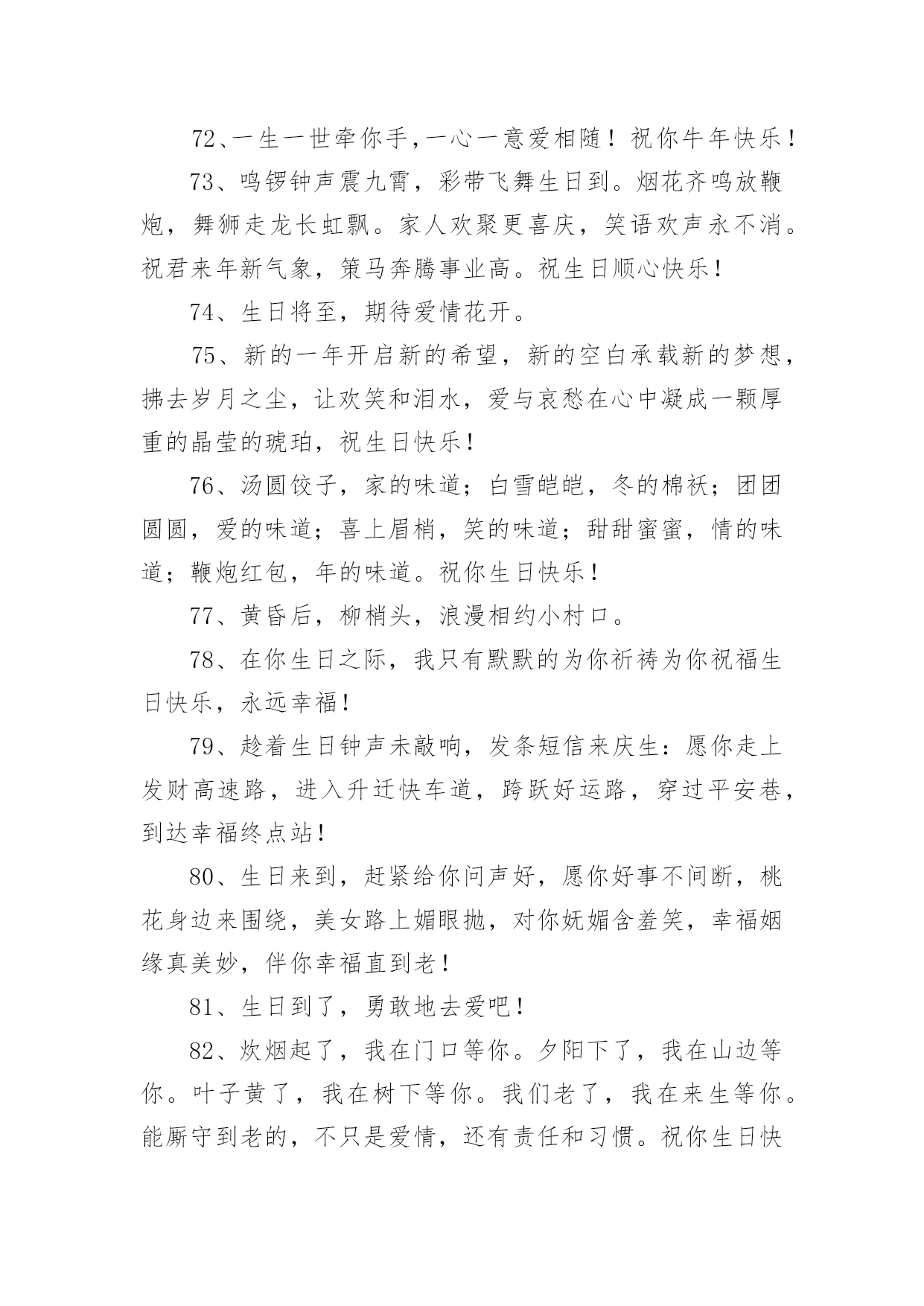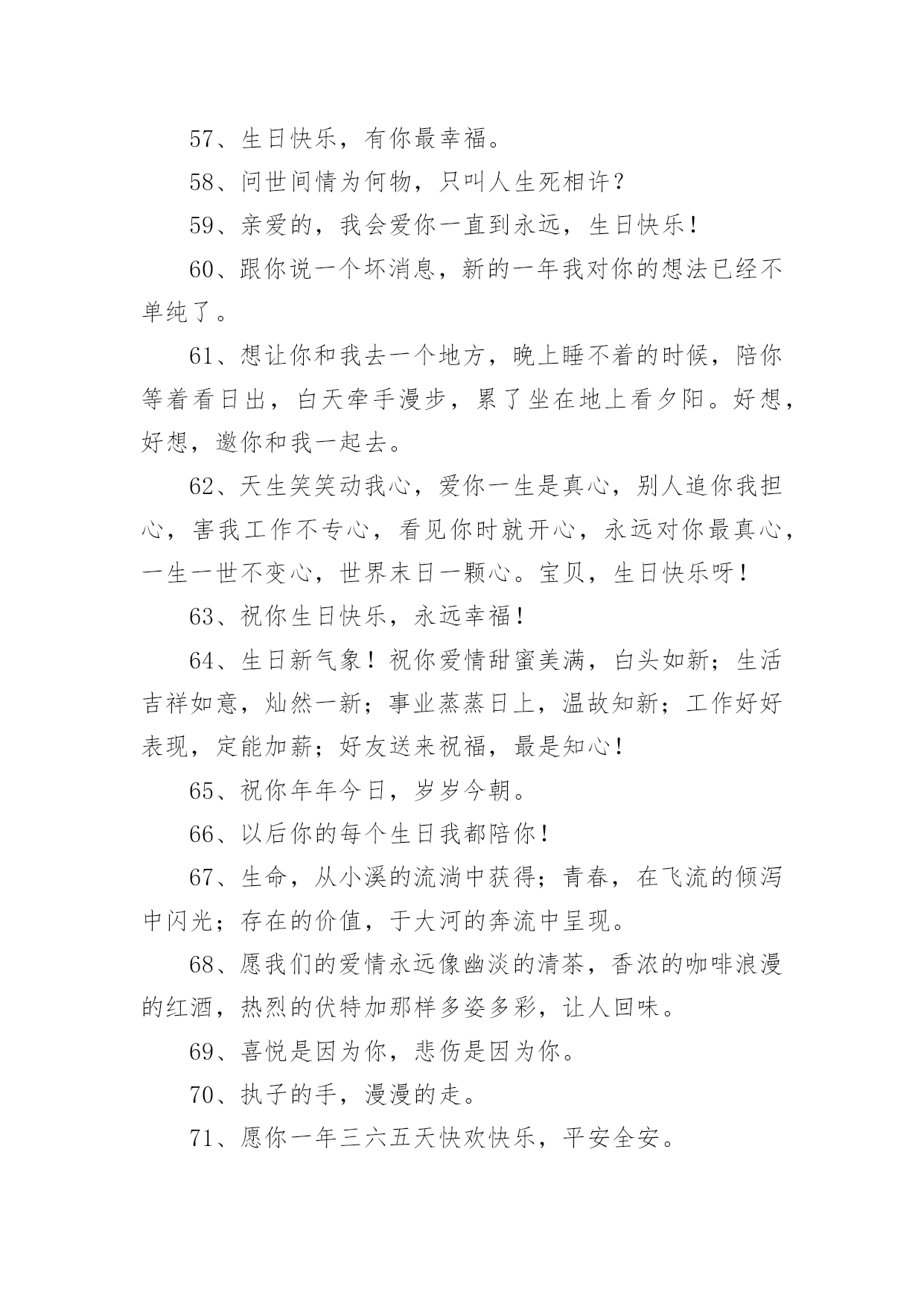 女朋友生日快乐文案女朋友生日快乐文案(精选600句)随着移动互联网和社交网络的发展,越来越多人喜欢发表文案,文案用于记录和分享生活中有意义的事。你还在找有意思的文案吗?以下是小编为大家整理的女朋友生日快乐文案,仅供参考,欢迎大家阅读。1、去年这一天和你在一起很快乐,因为那天是你生日。今天虽没有和你在再一起,仍希望你能快乐、健康、美丽!生日快乐!2、生命和爱是人类最高的意义。在试着把握生命的同时,愿你早日找到爱!生日快乐!3、让短信捎给你我的祝福言语,浓浓情意都在这一份真挚的心思里,愿你的生日充满无穷快乐,愿你的回忆充满温馨,愿你在新的一年里梦想成真。4、愿你每一年的每一天都充满快乐明媚和爱。祝你生日快乐!5、山动的短信是我跳动的心,跳跃的字符是我热情的爱!欢快的消息音?当然就是我对你的赞美了,祝我最亲爱的你生日快乐。6、全宇宙最可爱的小仙女,生日快乐!喜欢你没道理,愿你美丽依旧,幸运有你!7、千万里的距离,也割不断我对你的思念;无数日夜的轮换,也冲淡不了我对你的眷恋。今天是你的生日,而我不在你身边,就让我送去的祝福陪你快乐天天。8、我捡获了阿拉丁神灯,它说会满足我的一个愿望,我最终还是放弃了中国首富的念头,因为你的生日就要到了,所以就仅仅希望你—生日快乐!9、我只想一生都依偎在你的身旁,让你保护呵护着,今天是你的生日,我陪着你,以后第一个生日,我都要陪着你,生日幸福快乐,最爱你的女朋友!10、当烛火洋溢喜庆,当蛋糕分享甜蜜,在你人生的节点,我祈求四季留住青春,岁月留住永恒,爱你,生日快乐!11、唱着祝你生日快乐的歌向你走近,表达我的祈愿,分享你的快乐,再倾听那属于你的青春的回音。祝你生日快乐!12、请记住有个人永远爱你需要你。用我全身心的爱祝你生日快乐!13、天天都在你身边,不用苦苦地想你,也不必酸酸地恋你,只需甜甜地爱着你!我的宝贝,生日快乐!14、亲爱的,在你生日这一天,没能陪在你身边,不能给你温暖,是我终身遗憾。只能留下我的愿,愿你快乐每一天!生日快乐,我爱你!15、愿我心是一朵鲜花,盛开在你天空下,为你的生日增添一点温馨的情调,为你的快乐增添一片美丽的光华!宝贝,生日快乐,我爱你。16、你是哈蜜我是瓜,生日你不笨瓜瓜,看了短信笑哈哈,不愧是个哈密瓜!祝你:看了短信笑哈哈,生日快乐!17、今天使你的生日,你不再我的眼前。在这春日的风里,做一只风筝送你,载有我无尽的思念。18、正如玫瑰逗人喜爱,愿你的生日带给你愉快,因为你是最可爱的妹妹,愿你生日焕发光彩,伴随着喜悦和欢笑,从天明到日落。19、生日,是纪念一个人来到这个世界的日子,无论在多么忙碌的日子里,有一些人的纪念日我们一定要记住—爱着我们的人!祝你:生日快乐!20、只有懂得生活的人,才干领略鲜花的娇艳,只有懂得爱的人,才干领略到心中芬芳,祝你有一个特别的生日。21、最爱的生日送上祝福:你是一片云,我也是一片云,缘分如风让你我相遇,爱情的火花立刻开始电鸣,和我开始恋爱的大雨吧,相信我们恋爱过后,会有幸福的彩虹!22、今天阳光如珍珠般明媚,空气如泉水般清新,花草树木如画般美丽,鸟儿的鸣叫如流淌的小溪一样明快,原来今天是你的生日,祝你生日快乐,幸福常伴。23、祝我的爱人生日快乐,时光飞逝,但我对你的爱却更醇厚。在这特殊的日子里,我想告诉你,你的爱使我的生命变得完整。24、无言又无语,若即又若离。我思念着你,天天在一起;我深爱着你,默默在心底;我祝福着你:生日快乐!25、或许你其真不是为我而生,可我却有幸与你相伴。愿我有生之年,年年为你点燃生日的烛焰,生日快乐哦!26、在宁静的夜晚,伴着梦幻的烛光,听着轻轻的音乐,品着浓浓的葡萄酒,让我陪伴你渡过一个难忘的生日!27、昨日的风雨,已经远去。今天的你我,还将继续。忘记所有的哭泣,明天的你依然美丽。生日快乐!开心度过!28、从没有让别人给自己过过生日,只是自己记得自己的生日。29、较爱的生日送上祝福:你是一片云,我也是一片云,缘分如风让你我相遇,爱情的火花立刻开始电鸣,和我开始恋爱的大雨吧,相信我们恋爱过后,会有幸福的彩虹!30、自信和勇气,你给,你给我的是一个全新的世界。有了你,我是所有快乐,所有的喜悦!我爱你,它的钱。31、祝愿你,在这特别的日子里,幸福平安,心情美丽;祝愿你,在这美好的日子里,爱情甜蜜,事事如意;祝愿你,在这特别的日子里,一切顺利。生日快乐!32、祝你生日快乐,然后每天都比生日快乐!日子越过越快活,每天都像过生日一样乐呵呵!爱情事业都红火,礼多人不怪,再次祝福你生日快乐好运多!33、祝你生日快乐!你的才干使这个世界变得更加美好,愿这完全属于你的一天带给你快乐,愿未来的日子锦上添花!34、祝福的话语来自电波:生活的美好要努力拼搏,日子的甜美要品尝波折,快意的心境需精心打磨,乐悠闲适的知足较难得。35、祝福的
