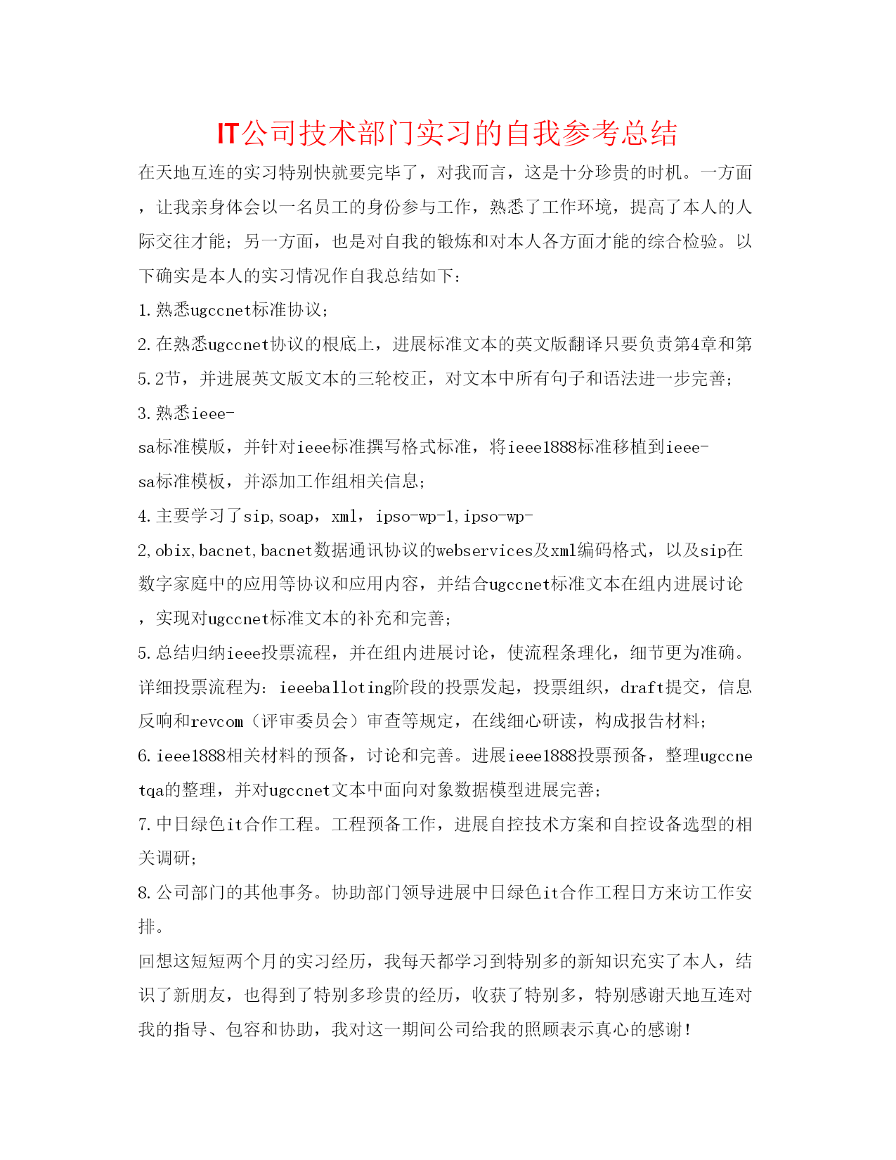 2022IT公司技术部门实习的自我参考总结