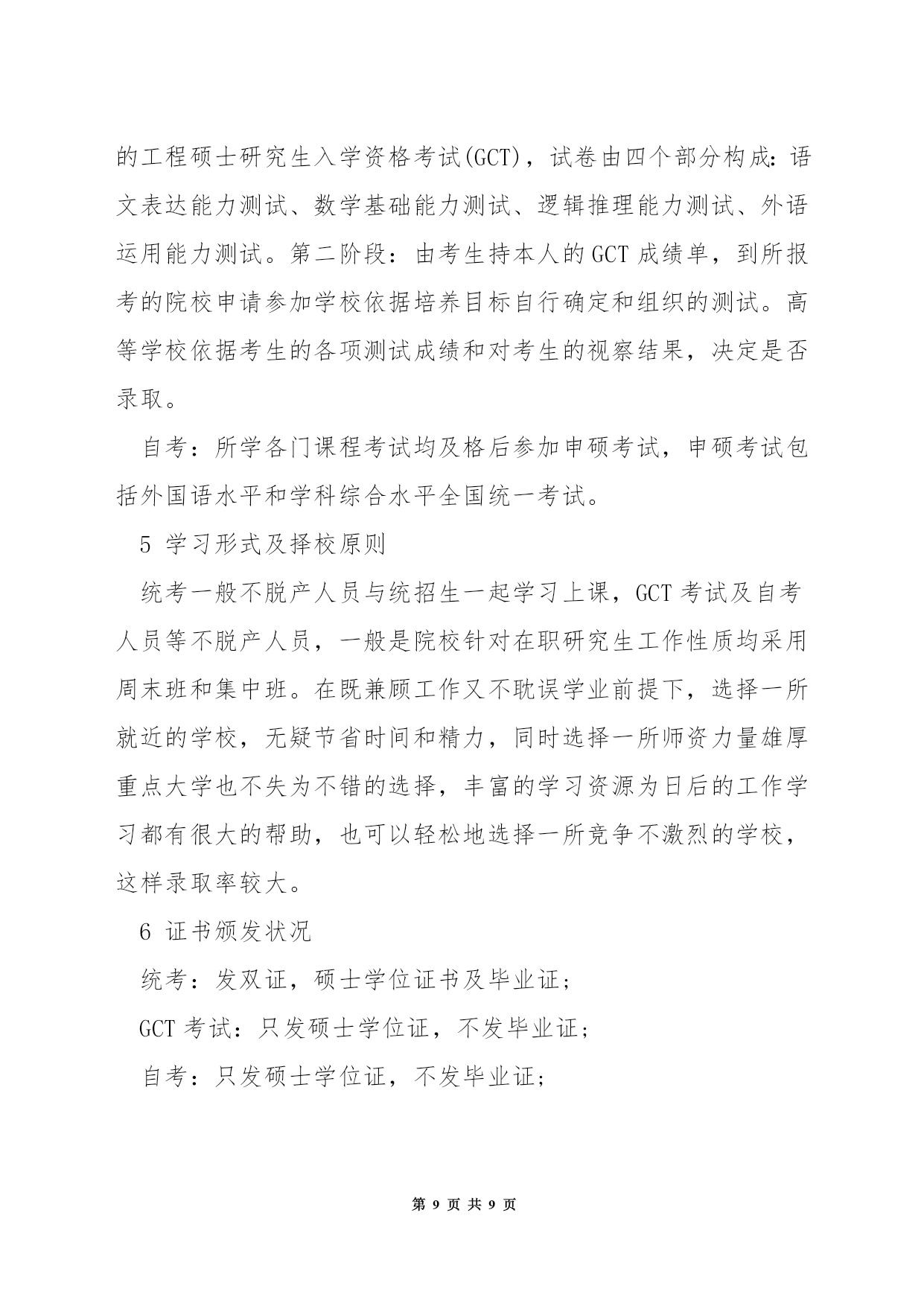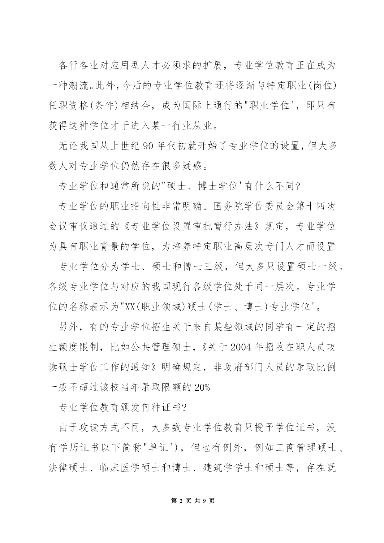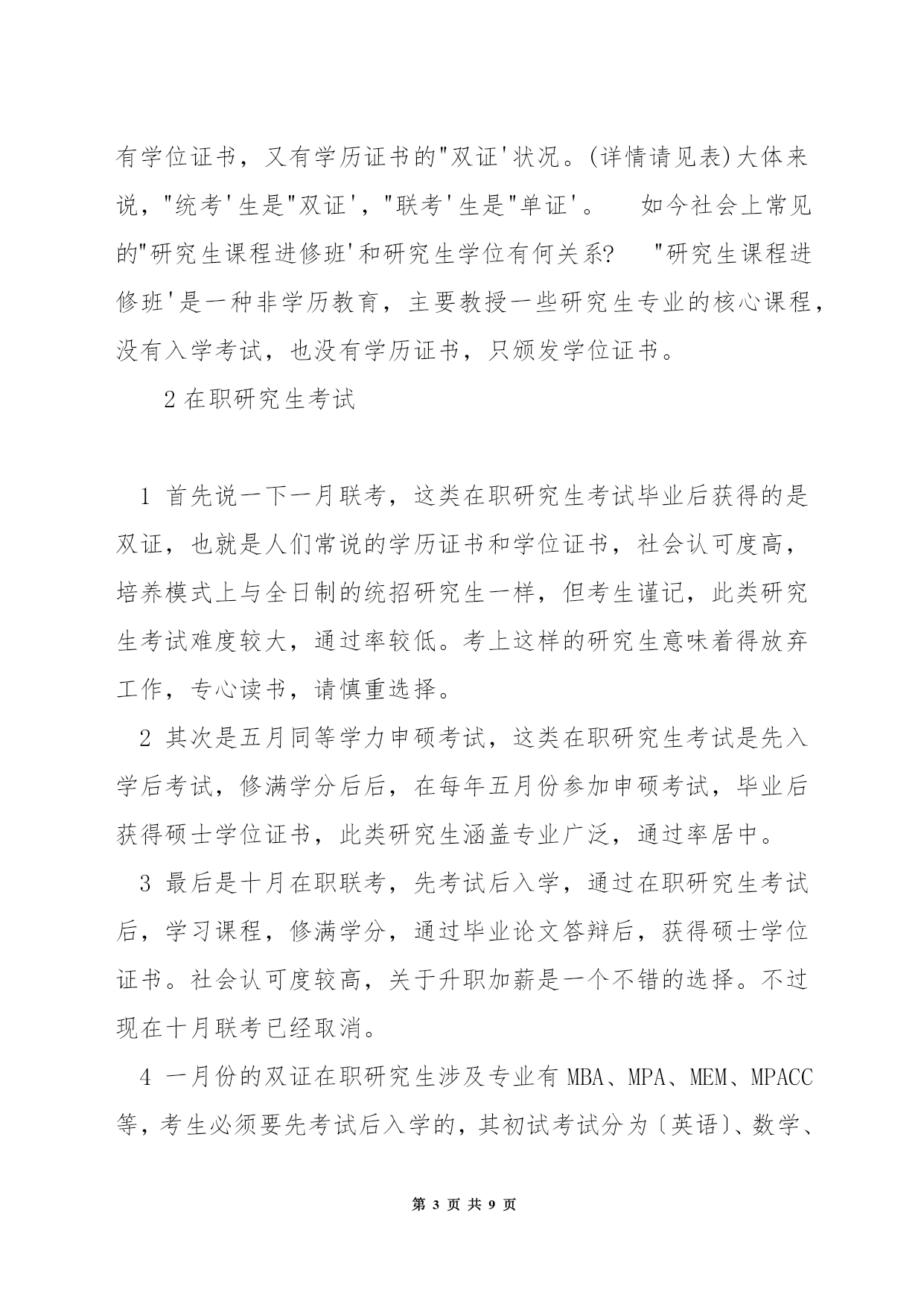 第PAGE\*MERGEFORMAT9页共NUMPAGES\*MERGEFORMAT9页在职硕士研究生考试专业学位关于很多人来说或许很陌生,但说到〔MBA〕、MPA非常熟悉。其实,MBA、MPA正是专业学位中的两种类别。目前,我国经批准设置的专业学位已达39类。(一)在职人员攻读硕士专业学位,包括法律硕士(J.M)、教育硕士(Ed.M)、体育硕士、艺术硕士(MFA)、工程硕士、农业推广硕士、兽医硕士、风光园林硕士(MLA)公共卫生硕士(MPH)、军事硕士、工商〔管理〕硕士(MBA)、〔会计〕硕士(MPAcc)、公共管理硕士(MPA)。(二)高等学校〔教师〕在职攻读硕士学位。(三)中等职业学校教师在职攻读硕士学位。专业学位教育是我国研究生教育的一种形式。区别于一般意义上侧重理论、学术研究的研究生教育,专业学位教育旨在针对一定的职业背景、培养高层次、应用型人才。据了解,在西方国家,专业学位教育是后高等教育里一个非常重要的组成部分。它的职业指向非常明确,就是针对职业要求培养职业领域必须要的应用型人才。从专业学位教育的对象来说,都是工作了一段时间,有了一定的工作经验,并明确了自身今后的职业发展领域,从而选择攻读相应的专业学位。各行各业对应用型人才必须求的扩展,专业学位教育正在成为一种潮流。此外,今后的专业学位教育还将逐渐与特定职业(岗位)任职资格(条件)相结合,成为国际上通行的"职业学位',即只有获得这种学位才干进入某一行业从业。无论我国从上世纪90年代初就开始了专业学位的设置,但大多数人对专业学位仍然存在很多疑惑。专业学位和通常所说的"硕士、博士学位'有什么不同?专业学位的职业指向性非常明确。国务院学位委员会第十四次会议审议通过的《专业学位设置审批暂行办法》规定,专业学位为具有职业背景的学位,为培养特定职业高层次专门人才而设置专业学位分为学士、硕士和博士三级,但大多只设置硕士一级。各级专业学位与对应的我国现行各级学位处于同一层次。专业学位的名称表示为"XX(职业领域)硕士(学士、博士)专业学位'。另外,有的专业学位招生关于来自某些领域的同学有一定的招生额度限制,比如公共管理硕士,《关于2004年招收在职人员攻读硕士学位工作的通知》明确规定,非政府部门人员的录取比例一般不超过该校当年录取限额的20%专业学位教育颁发何种证书?由于攻读方式不同,大多数专业学位教育只授予学位证书,没有学历证书以下简称"单证'),但也有例外,例如工商管理硕士、法律硕士、临床医学硕士和博士、建筑学学士和硕士等,存在既有学位证书,又有学历证书的"双证'状况。(详情请见表)大体来说,"统考'生是"双证',"联考'生是"单证'。如今社会上常见的"研究生课程进修班'和研究生学位有何关系?"研究生课程进修班'是一种非学历教育,主要教授一些研究生专业的核心课程,没有入学考试,也没有学历证书,只颁发学位证书。2在职研究生考试1首先说一下一月联考,这类在职研究生考试毕业后获得的是双证,也就是人们常说的学历证书和学位证书,社会认可度高,培养模式上与全日制的统招研究生一样,但考生谨记,此类研究生考试难度较大,通过率较低。考上这样的研究生意味着得放弃工作,专心读书,请慎重选择。2其次是五月同等学力申硕考试,这类在职研究生考试是先入学后考试,修满学分后后,在每年五月份参加申硕考试,毕业后获得硕士学位证书,此类研究生涵盖专业广泛,通过率居中。3最后是十月在职联考,先考试后入学,通过在职研究生考试后,学习课程,修满学分,通过毕业论文答辩后,获得硕士学位证书。社会认可度较高,关于升职加薪是一个不错的选择。不过现在十月联考已经取消。4一月份的双证在职研究生涉及专业有MBA、MPA、MEM、MPACC等,考生必须要先考试后入学的,其初试考试分为〔英语〕、数学、逻辑和写作,其中英语难度在大学四级和六级之间,必须要考生努力认真的学习。5然后是复试,双证在职研究生的复试考试分为笔试和面试,其中笔试所考内容是一下专业理论,来视察同学对专业知识的掌握状况。而面试是比较重要的,主要视察同学专业课外知识和技能的掌握程度,进而视察同学应变思维和思想素养等。6最后是录取,各院校会依据复试排名进行录取,录取时秉承择优的原则,因此考试难度相对较大,但是只要认真学习也是很容易通过。7五月同等学力考试课程采纳的是免试入学,不用进行复试。学员在完成规定的课程和考试后,就可以获得报考院校的结业证书,关于符合申硕条件的学员,还可以参加申硕考试。8同等学力申硕考试科目为外国语和学科综合。其中外国语包括英语、〔日语〕、〔法语〕、〔俄语〕、〔德语〕五种,考生可以从中任选其一,大部分院校会选择英语作为测试的语种,英语的考试难度大约在大学英语的四级左右,所以学员不用担心。学科综合测试的是课上所学习的专业,考