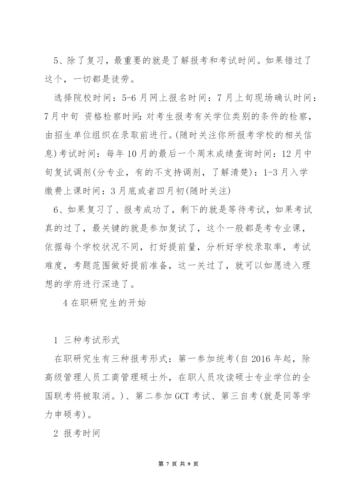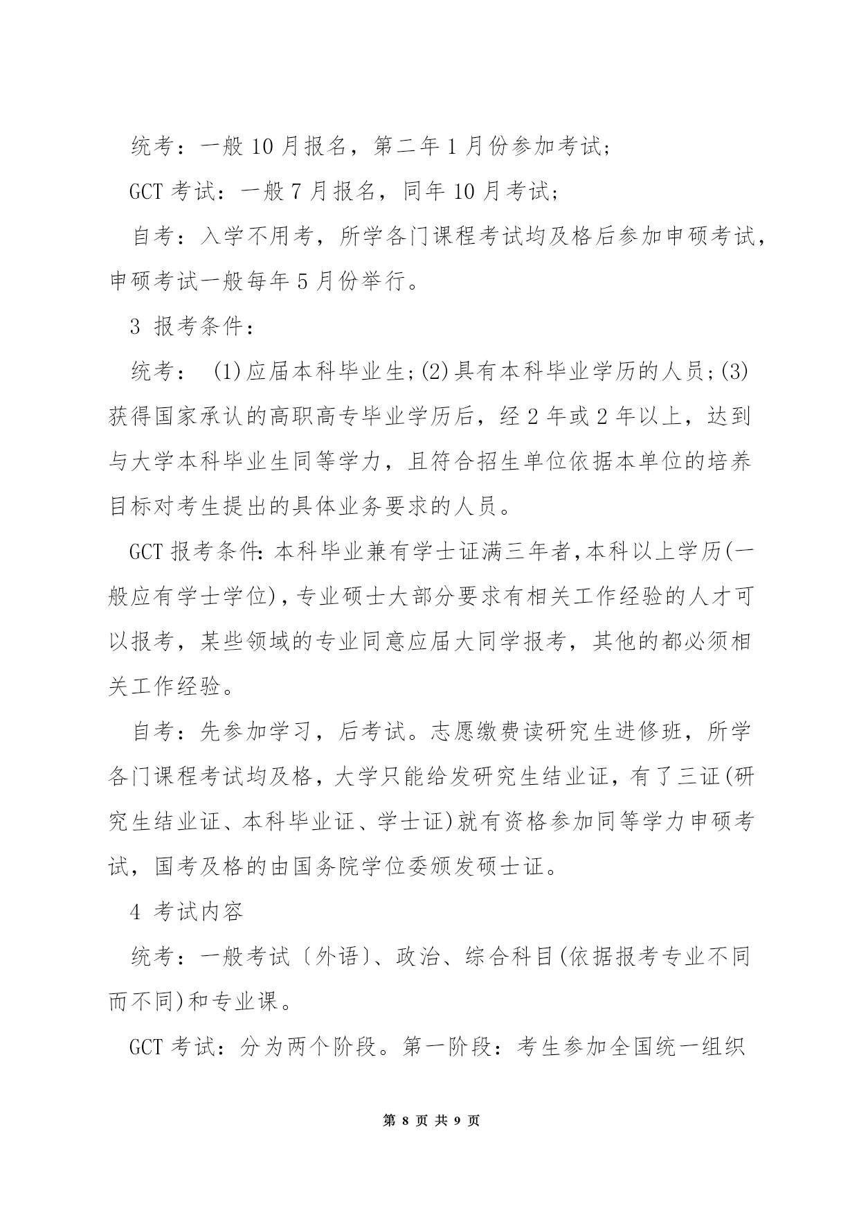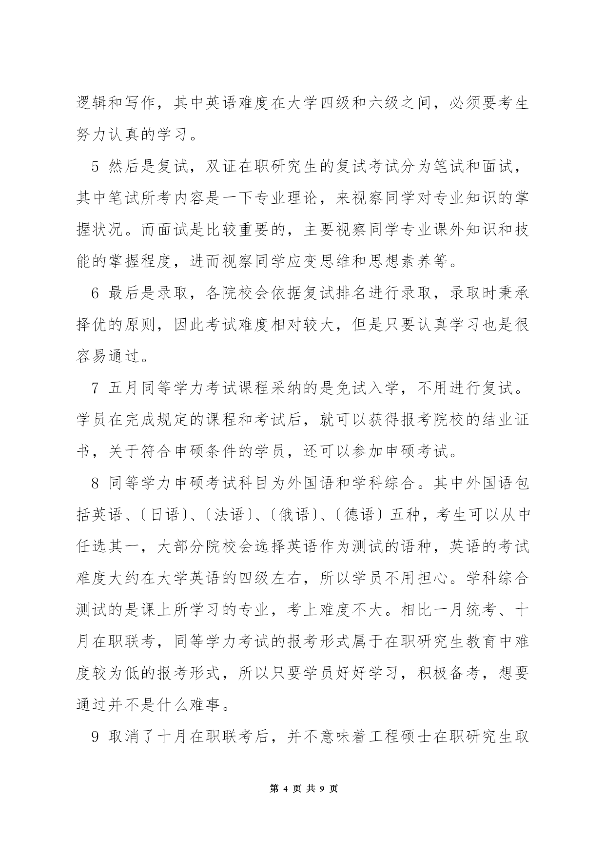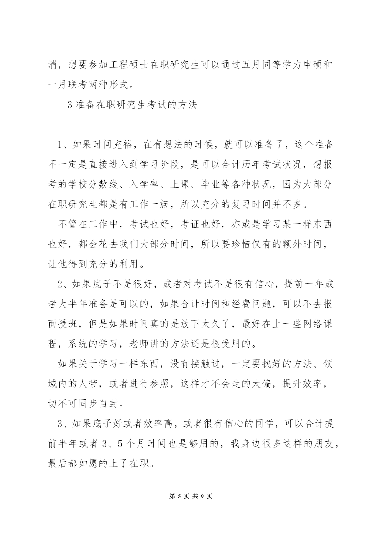 第PAGE\*MERGEFORMAT9页共NUMPAGES\*MERGEFORMAT9页在职硕士研究生考试专业学位关于很多人来说或许很陌生,但说到〔MBA〕、MPA非常熟悉。其实,MBA、MPA正是专业学位中的两种类别。目前,我国经批准设置的专业学位已达39类。(一)在职人员攻读硕士专业学位,包括法律硕士(J.M)、教育硕士(Ed.M)、体育硕士、艺术硕士(MFA)、工程硕士、农业推广硕士、兽医硕士、风光园林硕士(MLA)公共卫生硕士(MPH)、军事硕士、工商〔管理〕硕士(MBA)、〔会计〕硕士(MPAcc)、公共管理硕士(MPA)。(二)高等学校〔教师〕在职攻读硕士学位。(三)中等职业学校教师在职攻读硕士学位。专业学位教育是我国研究生教育的一种形式。区别于一般意义上侧重理论、学术研究的研究生教育,专业学位教育旨在针对一定的职业背景、培养高层次、应用型人才。据了解,在西方国家,专业学位教育是后高等教育里一个非常重要的组成部分。它的职业指向非常明确,就是针对职业要求培养职业领域必须要的应用型人才。从专业学位教育的对象来说,都是工作了一段时间,有了一定的工作经验,并明确了自身今后的职业发展领域,从而选择攻读相应的专业学位。各行各业对应用型人才必须求的扩展,专业学位教育正在成为一种潮流。此外,今后的专业学位教育还将逐渐与特定职业(岗位)任职资格(条件)相结合,成为国际上通行的"职业学位',即只有获得这种学位才干进入某一行业从业。无论我国从上世纪90年代初就开始了专业学位的设置,但大多数人对专业学位仍然存在很多疑惑。专业学位和通常所说的"硕士、博士学位'有什么不同?专业学位的职业指向性非常明确。国务院学位委员会第十四次会议审议通过的《专业学位设置审批暂行办法》规定,专业学位为具有职业背景的学位,为培养特定职业高层次专门人才而设置专业学位分为学士、硕士和博士三级,但大多只设置硕士一级。各级专业学位与对应的我国现行各级学位处于同一层次。专业学位的名称表示为"XX(职业领域)硕士(学士、博士)专业学位'。另外,有的专业学位招生关于来自某些领域的同学有一定的招生额度限制,比如公共管理硕士,《关于2004年招收在职人员攻读硕士学位工作的通知》明确规定,非政府部门人员的录取比例一般不超过该校当年录取限额的20%专业学位教育颁发何种证书?由于攻读方式不同,大多数专业学位教育只授予学位证书,没有学历证书以下简称"单证'),但也有例外,例如工商管理硕士、法律硕士、临床医学硕士和博士、建筑学学士和硕士等,存在既有学位证书,又有学历证书的"双证'状况。(详情请见表)大体来说,"统考'生是"双证',"联考'生是"单证'。如今社会上常见的"研究生课程进修班'和研究生学位有何关系?"研究生课程进修班'是一种非学历教育,主要教授一些研究生专业的核心课程,没有入学考试,也没有学历证书,只颁发学位证书。2在职研究生考试1首先说一下一月联考,这类在职研究生考试毕业后获得的是双证,也就是人们常说的学历证书和学位证书,社会认可度高,培养模式上与全日制的统招研究生一样,但考生谨记,此类研究生考试难度较大,通过率较低。考上这样的研究生意味着得放弃工作,专心读书,请慎重选择。2其次是五月同等学力申硕考试,这类在职研究生考试是先入学后考试,修满学分后后,在每年五月份参加申硕考试,毕业后获得硕士学位证书,此类研究生涵盖专业广泛,通过率居中。3最后是十月在职联考,先考试后入学,通过在职研究生考试后,学习课程,修满学分,通过毕业论文答辩后,获得硕士学位证书。社会认可度较高,关于升职加薪是一个不错的选择。不过现在十月联考已经取消。4一月份的双证在职研究生涉及专业有MBA、MPA、MEM、MPACC等,考生必须要先考试后入学的,其初试考试分为〔英语〕、数学、逻辑和写作,其中英语难度在大学四级和六级之间,必须要考生努力认真的学习。5然后是复试,双证在职研究生的复试考试分为笔试和面试,其中笔试所考内容是一下专业理论,来视察同学对专业知识的掌握状况。而面试是比较重要的,主要视察同学专业课外知识和技能的掌握程度,进而视察同学应变思维和思想素养等。6最后是录取,各院校会依据复试排名进行录取,录取时秉承择优的原则,因此考试难度相对较大,但是只要认真学习也是很容易通过。7五月同等学力考试课程采纳的是免试入学,不用进行复试。学员在完成规定的课程和考试后,就可以获得报考院校的结业证书,关于符合申硕条件的学员,还可以参加申硕考试。8同等学力申硕考试科目为外国语和学科综合。其中外国语包括英语、〔日语〕、〔法语〕、〔俄语〕、〔德语〕五种,考生可以从中任选其一,大部分院校会选择英语作为测试的语种,英语的考试难度大约在大学英语的四级左右,所以学员不用担心。学科综合测试的是课上所学习的专业,考