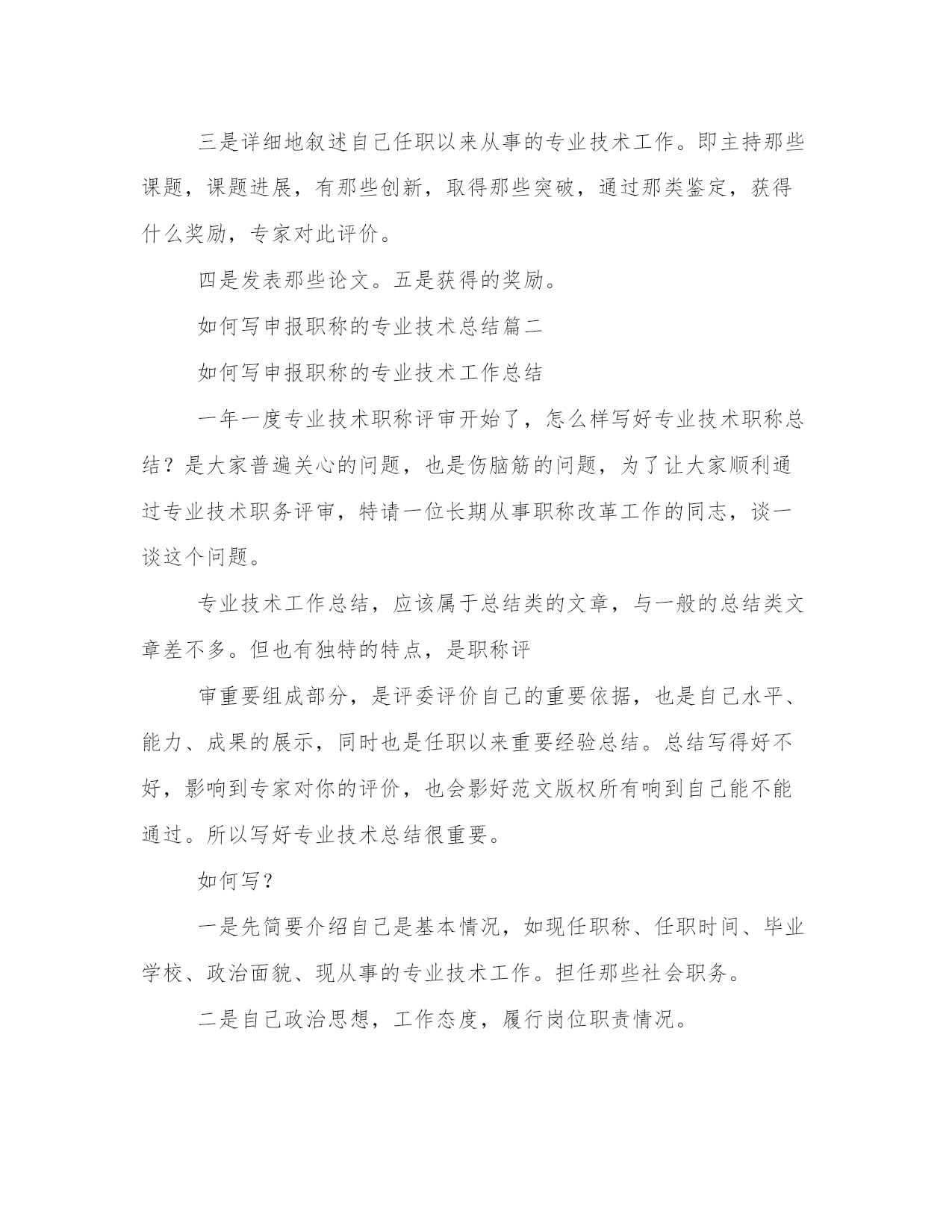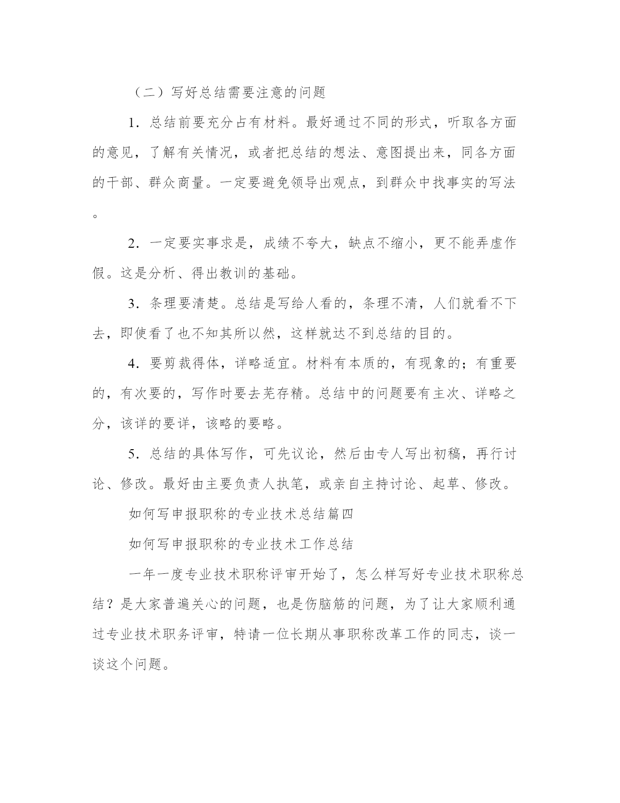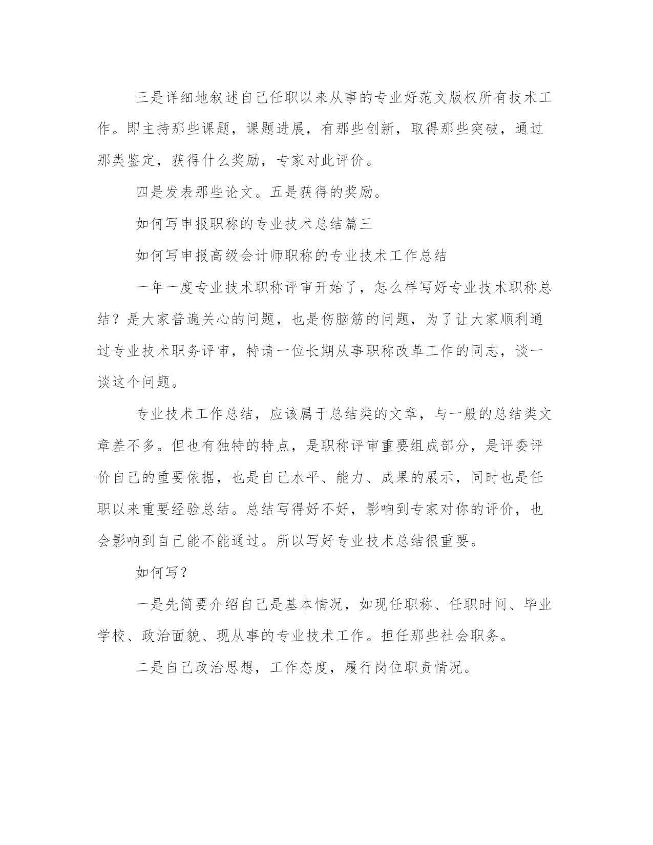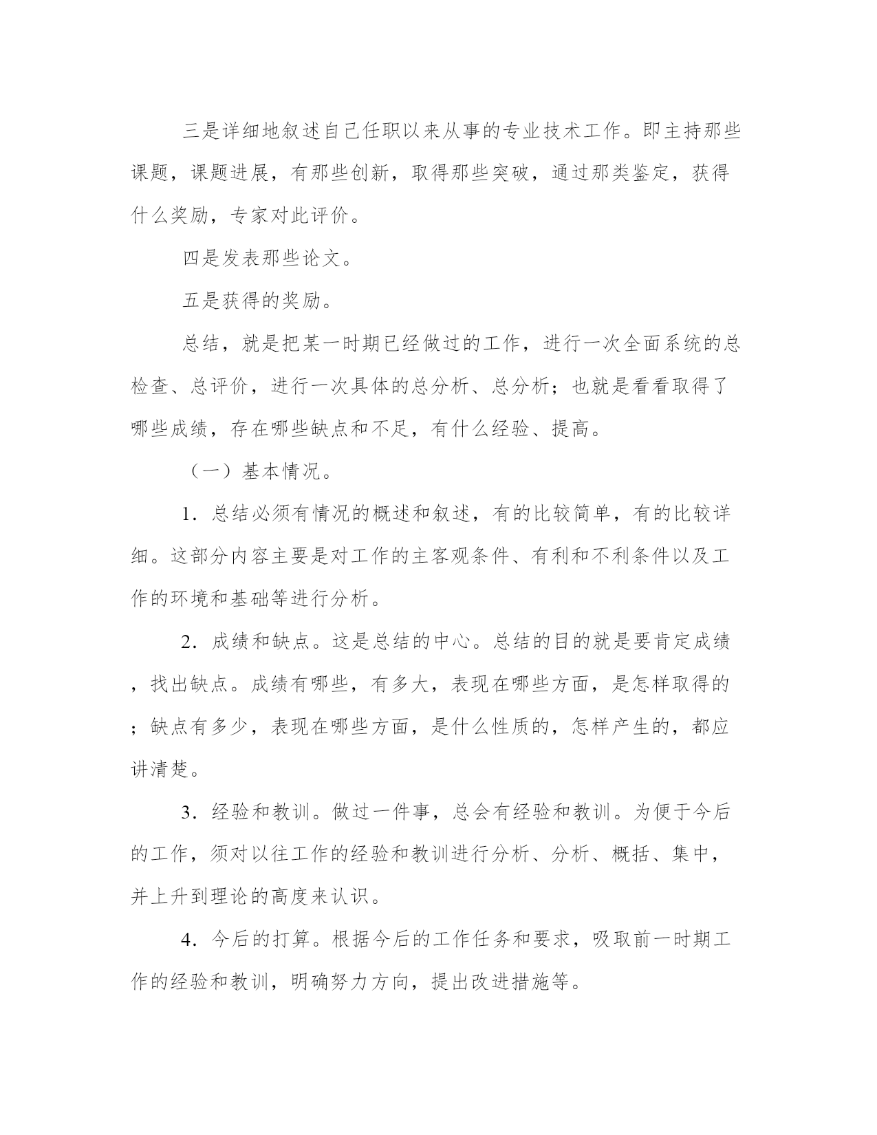 如何写申报职称的专业技术总结(九篇)总结是把一定阶段内的有关情况分析分析,做出有指导性的经验方法以及结论的书面材料,它可以使我们更有效率,不妨坐下来好好写写总结吧。那关于总结格式是怎样的呢?而个人总结又该怎么写呢?以下是小编收集整理的工作总结书范文,仅供参考,希望能够帮助到大家。如何写申报职称的专业技术总结篇一一年一度专业技术职称评审开始了,怎么样写好专业技术职称总结?是大家普遍关心的问题,也是伤脑筋的问题,为了让大家顺利通过专业技术职务评审,特请一位长期从事职称改革工作的同志,谈一谈这个问题。专业技术工作总结,应该属于总结类的文章,与一般的总结类文章差不多。但也有独特的特点,是职称评审重要组成部分,是评委评价自己的重要依据,也是自己水平、能力、成果的展示,同时也是任职以来重要经验总结。总结写得好不好,影响到专家对你的评价,也会影响到自己能不能通过。所以写好专业技术总结很重要。如何写?一是先简要介绍自己是基本情况,如现任职称、任职时间、毕业学校、政治面貌、现从事的专业技术工作。担任那些社会职务。二是自己政治思想,工作态度,履行岗位职责情况。三是详细地叙述自己任职以来从事的专业技术工作。即主持那些课题,课题进展,有那些创新,取得那些突破,通过那类鉴定,获得什么奖励,专家对此评价。四是发表那些论文。五是获得的奖励。如何写申报职称的专业技术总结篇二如何写申报职称的专业技术工作总结一年一度专业技术职称评审开始了,怎么样写好专业技术职称总结?是大家普遍关心的问题,也是伤脑筋的问题,为了让大家顺利通过专业技术职务评审,特请一位长期从事职称改革工作的同志,谈一谈这个问题。专业技术工作总结,应该属于总结类的文章,与一般的总结类文章差不多。但也有独特的特点,是职称评审重要组成部分,是评委评价自己的重要依据,也是自己水平、能力、成果的展示,同时也是任职以来重要经验总结。总结写得好不好,影响到专家对你的评价,也会影好范文版权所有响到自己能不能通过。所以写好专业技术总结很重要。如何写?一是先简要介绍自己是基本情况,如现任职称、任职时间、毕业学校、政治面貌、现从事的专业技术工作。担任那些社会职务。二是自己政治思想,工作态度,履行岗位职责情况。三是详细地叙述自己任职以来从事的专业好范文版权所有技术工作。即主持那些课题,课题进展,有那些创新,取得那些突破,通过那类鉴定,获得什么奖励,专家对此评价。四是发表那些论文。五是获得的奖励。如何写申报职称的专业技术总结篇三如何写申报高级会计师职称的专业技术工作总结一年一度专业技术职称评审开始了,怎么样写好专业技术职称总结?是大家普遍关心的问题,也是伤脑筋的问题,为了让大家顺利通过专业技术职务评审,特请一位长期从事职称改革工作的同志,谈一谈这个问题。专业技术工作总结,应该属于总结类的文章,与一般的总结类文章差不多。但也有独特的特点,是职称评审重要组成部分,是评委评价自己的重要依据,也是自己水平、能力、成果的展示,同时也是任职以来重要经验总结。总结写得好不好,影响到专家对你的评价,也会影响到自己能不能通过。所以写好专业技术总结很重要。如何写?一是先简要介绍自己是基本情况,如现任职称、任职时间、毕业学校、政治面貌、现从事的专业技术工作。担任那些社会职务。二是自己政治思想,工作态度,履行岗位职责情况。三是详细地叙述自己任职以来从事的专业技术工作。即主持那些课题,课题进展,有那些创新,取得那些突破,通过那类鉴定,获得什么奖励,专家对此评价。四是发表那些论文。五是获得的奖励。总结,就是把某一时期已经做过的工作,进行一次全面系统的总检查、总评价,进行一次具体的总分析、总分析;也就是看看取得了哪些成绩,存在哪些缺点和不足,有什么经验、提高。(一)基本情况。1.总结必须有情况的概述和叙述,有的比较简单,有的比较详细。这部分内容主要是对工作的主客观条件、有利和不利条件以及工作的环境和基础等进行分析。2.成绩和缺点。这是总结的中心。总结的目的就是要肯定成绩,找出缺点。成绩有哪些,有多大,表现在哪些方面,是怎样取得的;缺点有多少,表现在哪些方面,是什么性质的,怎样产生的,都应讲清楚。3.经验和教训。做过一件事,总会有经验和教训。为便于今后的工作,须对以往工作的经验和教训进行分析、分析、概括、集中,并上升到理论的高度来认识。4.今后的打算。根据今后的工作任务和要求,吸取前一时期工作的经验和教训,明确努力方向,提出改进措施等。(二)写好总结需要注意的问题1.总结前要充分占有材料。最好通过不同的形式,听取各方面的意见,了解有关情况,或者把总结的想法、意图提出来,同各方面的干部、群众商量。一定要避免领导出观点,到群众中找事实的写法。2.一定要实事求是,成绩不夸大,缺点不缩