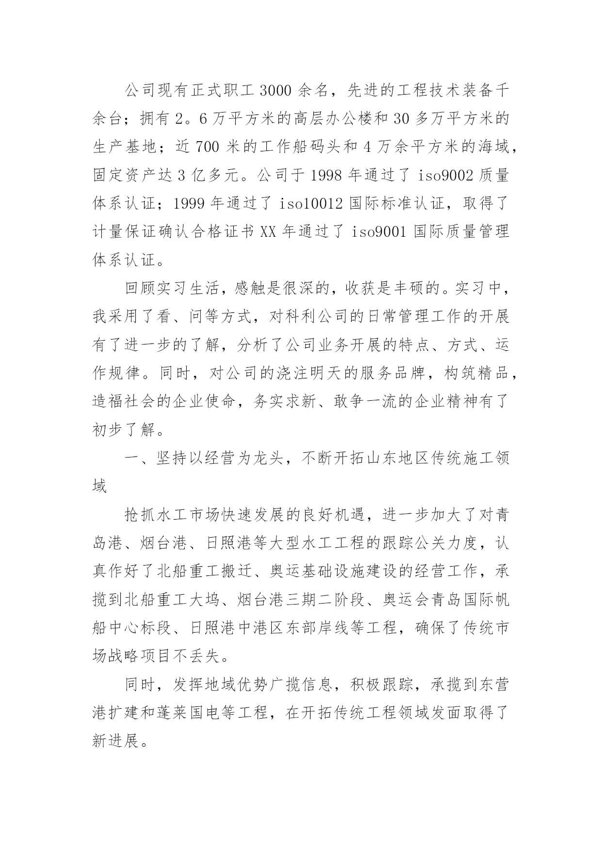 工商管理专业实习报告随着社会一步步向前发展,报告不再是罕见的东西,要注意报告在写作时具有一定的格式。我敢肯定,大部分人都对写报告很是头疼的,下面是小编精心整理的工商管理专业实习报告,欢迎阅读与收藏。工商管理专业实习报告1今年xx月xx日上午开始,我在中港第一航务工程局第二工程公司附属单位科利公司进行了工商管理实习工作。在实习中,我在公司指导老师的热心指导下,积极参与公司日常管理相关工作,注意把书本上学到的工商管理理论知识对照实际工作,用理论知识加深对实际工作的认识,用实践验证所学的工商管理理论,探求日常管理工作的本质与规律。简短的实习生活,既紧张,又新奇,收获也很多。通过实习,使我对日常管理工作有了深层次的感性和理性的认识。我所实习的科利公司,隶属于中港第一航务工程局第二工程公司。中港第一航务工程局第二工程公司成立于1953年,是以水工、市政、工民建、路桥、安装工程等为主要经营项目的国有大型骨干建筑施工企业,具有航务工程总承包一级、房建二级、市政、水利水电三级、地基与基础一级、钢结构一级、机电设备安装一级、商砼与预制构件二级、勘察设计、计量二级、建筑材料试验等资质。公司现有正式职工3000余名,先进的工程技术装备千余台;拥有2。6万平方米的高层办公楼和30多万平方米的生产基地;近700米的工作船码头和4万余平方米的海域,固定资产达3亿多元。公司于1998年通过了iso9002质量体系认证;1999年通过了iso10012国际标准认证,取得了计量保证确认合格证书XX年通过了iso9001国际质量管理体系认证。回顾实习生活,感触是很深的,收获是丰硕的。实习中,我采用了看、问等方式,对科利公司的日常管理工作的开展有了进一步的了解,分析了公司业务开展的特点、方式、运作规律。同时,对公司的浇注明天的服务品牌,构筑精品,造福社会的企业使命,务实求新、敢争一流的企业精神有了初步了解。一、坚持以经营为龙头,不断开拓山东地区传统施工领域抢抓水工市场快速发展的良好机遇,进一步加大了对青岛港、烟台港、日照港等大型水工工程的跟踪公关力度,认真作好了北船重工搬迁、奥运基础设施建设的经营工作,承揽到北船重工大坞、烟台港三期二阶段、奥运会青岛国际帆船中心标段、日照港中港区东部岸线等工程,确保了传统市场战略项目不丢失。同时,发挥地域优势广揽信息,积极跟踪,承揽到东营港扩建和蓬莱国电等工程,在开拓传统工程领域发面取得了新进展。二、强化三标一体管理体系运行,有效的促进了企业管理水平的提高切实加大三标一体管理体系运行力度,进一步强化了体系检查、文体整改和业务指导,对内审发现的问题及时进行了整改追踪检验,建立了基层单位与机关部室双向评价体系,不合格报告同比降低了50%,符合率和得分率较前年有了增长,三标一体管理体系得到有效的'运行。三、坚持以经营为龙头,积极实施1433经营举措,促进经营持续发展。20xx年公司经营工作思路确定为1433,即要成立一体化经营领导小组,建立四个经营分公司运行体制,坚持三位一体的经营原则,充分发挥经营工作的三个积极性,不断开拓山东地区、南方、桩基和陆域市场。1433经营思路具体内容是:公司成立一个精干高效、信息反馈迅速的公司经营领导小组,切实加强对经营工作的领导;建立经营分公司、厦门分公司、上海分公司和陆域经营分公司四个经营分公司的经营运行体制,增强开拓市场的能力;坚持以市场价中标,不投亏损标,诚信合作、互惠共赢三项经营原则;充分调动公司经营部、经营分公司和经营人员三方面经营积极性。在新的经营思路指引下,公司将继续加大对山东地区传统市场的开拓力度,全力以赴地做好前湾港、日照港、烟台港新建码头、黄岛招商国际码头、青黄复线、青黄隧道、东营港后续工程等工程项目的跟踪公关工作,紧盯不放,志在必得,巩固传统市场,力争在承揽特大型工程项目上有所突破。继续坚定不移地开拓南方市场,干好厦门、温州、海南等在建项目,赢得业主满意,树立企业形象。发挥经营分公司的作用,加大对重点工程的经营公关力度,做好投标工作,确保目标工程不丢失。以项目为依托,在开拓新的市场上有所作为,保持南方地区经营产值持续增长。坚定不移地开拓桩基市场,切实加大桩基设备投入,锻炼桩基施工队伍,进一步增强桩基施工能力。坚持水陆并进,提高规模效益。利用房建施工总承包一级资质,认真总结路桥施工经验、教训,加大陆域市场开拓力度,实现陆域市场的稳步发展。同时通过实习我发现中港第一航务工程局第二工程公司附属单位科利公司也存在问题:1、市场观念和经营体制不适应公司快速发展的要求,市场开拓的步伐与企业快速发展的要求有差距;经营体制还不完善,经营队伍、经营人员的责权利还有待于进一步提高。2、施工组织管理观念有待进一步转变,在施工过程中按照施工合同要求进行施工组织管理的意识不强,施工管理现状与施工管理科学化