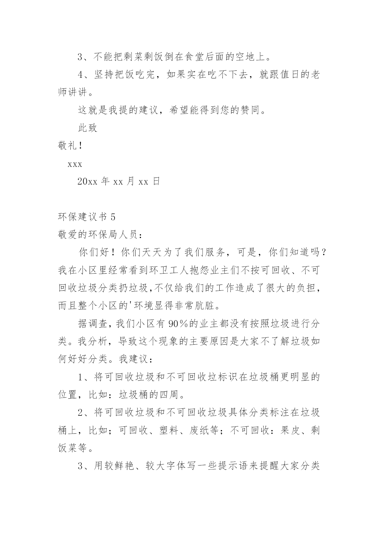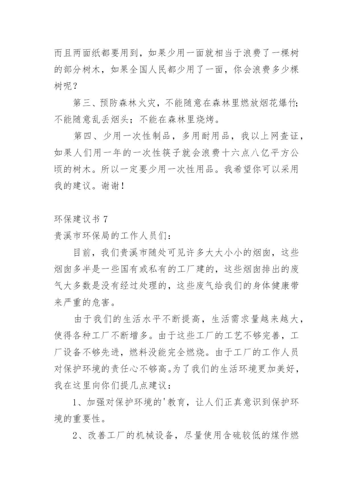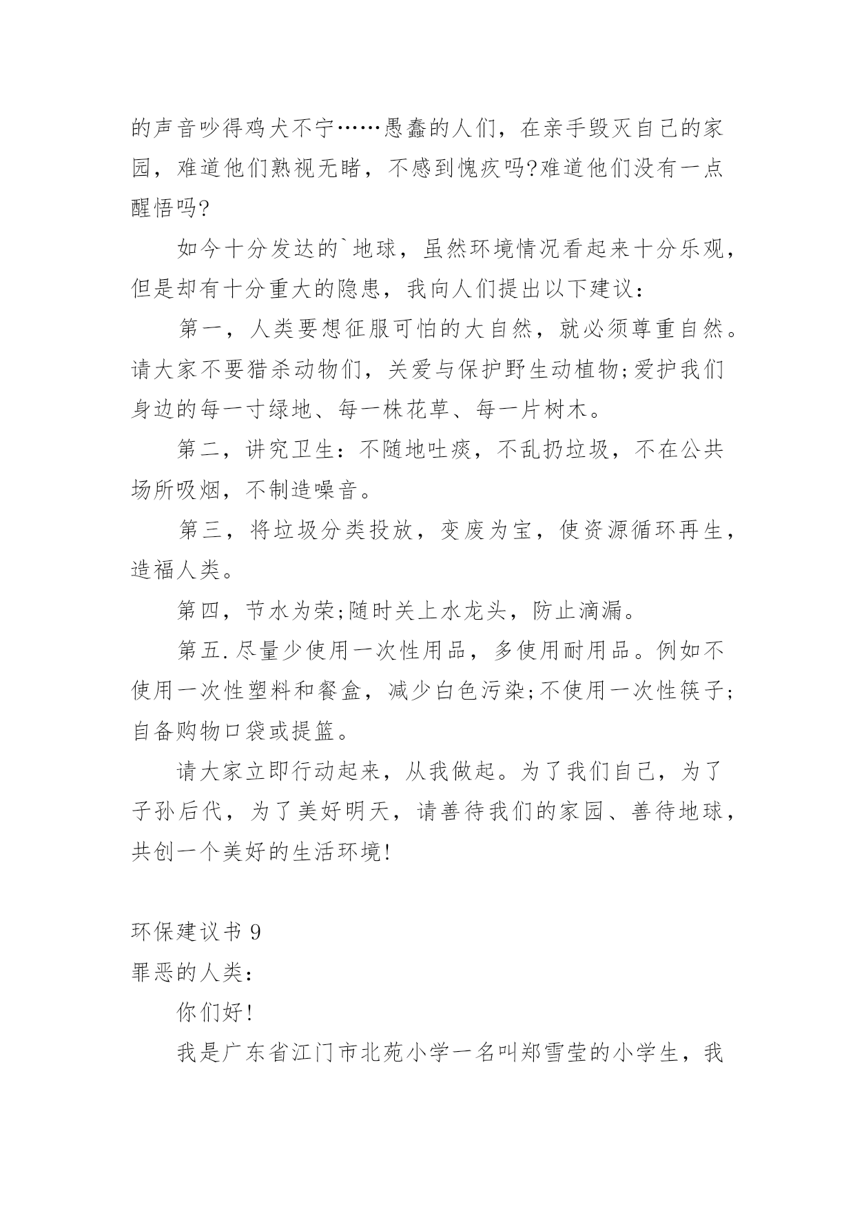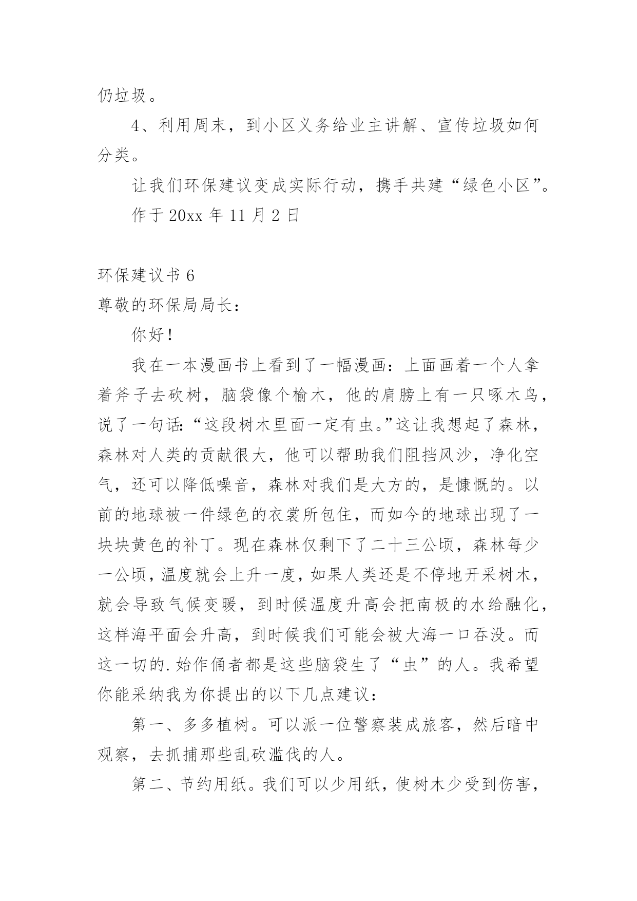 环保建议书(集合)环保建议书在当今社会生活中,需要使用建议书的场合越来越多,当建议书是面对领导和有关部门时,可以中肯地提出自己对对方工作的意见和自己的建议。那么你有了解过建议书吗?下面是小编精心整理的环保建议书,欢迎大家分享。环保建议书1尊敬的环卫局局长:你好!我是一名六年级的小学生,关于环境保护的问题,我今天想跟你提点建议。地球是我们的家,也是我们的母亲。地球无私地供给我们各种资源,让我们有吃的,穿的,用的……我们本应该竭尽全力去保护她。但是,我看到的并不是这样的,伐木工人砍倒一棵又一棵的参天大树,却不懂得砍一棵种一棵树的道理,导致森林面积大幅度地减少,大量水土流失。人们没有节制地用水,喝一杯水倒一杯水,洒一盆水的现象在我们身边大量出现,我们地球上的淡水正在走向枯竭。煤矿的开采力度日渐加大,地下的矿物就像杯子里的果汁一样,被人们一口一口地“喝”掉,矿物迟早会被开采光的。各种各样的工厂如雨后春笋般地拔地而起,一沟沟黑而发臭的'废水不断流入清澈的河流,一股股饱含有害物质的浓烟直冲云霄…像这们的例子在我们身边随处可见,为此,我向你提出如下建议:一、多植树造林,禁止乱砍滥伐,这样就可以增加绿化面积,防止水土流失。二、各级各类工厂应安装废水净化器和废气处理器,这样就可以使江河不被废水污染,空气不被废气污染。三、尽量使用可快速溶解的塑料,这样就可以减少白色垃圾的污染。四、生活中逐步培养人们的节约用水的好习惯,如污水可以冲厕所,洗菜水可以浇花…五、通过各种途径向人们宣传讲究卫生的好习惯,如不随地吐痰,不乱扔垃圾……希望你在百忙之中抽出一点时间关注一下环境问题,它真的已经成为不能忽视的问题了!此致敬礼!建议人:xxx时间:20xx年xx月xx日环保建议书2环保局的叔叔阿姨们:你们好!最近,我们街上老是“尘土飞扬”,风一吹,沙子就飘起来了,有时候还会弄到眼睛里去。而且植物也少得可怜,只有几棵大树站在那儿!如果每条街道都是这样的话,后果将不堪设想!曾经,有宇航员在天际遨游时,目睹地球,发出过这样的感叹:“我们这个地球太可爱了,同时又太容易破碎了!”是啊!善待地球就是善待自己,拯救地球就是拯救未来!鉴于此,我想提出以下几点建议:1、在马路中间建几条绿化带,多种些花草树木。2、在公交车或的士上贴宣传纸,告诉大家外出距离近骑自行车,距离远搭乘公交车,尽量少开汽车。3、招募一些环保志愿者,及时清理大街。4、让住在街上的.人们在窗外的防盗窗上种点植物。不知道我的几点建议行不行,但请你们研究、采纳!此致敬礼!倡议人:xxx20xx年xx月xx日环保建议书3在学校我们要做一个环保的小卫士,保护我们的学校,让我们生活成长的地方远离垃圾的污染,做一个处处绿化的校园。老师最近我发现学校的洗手间的水龙头经常关不紧,这样很浪费水,我们应该在我们的洗手间贴上相应的标示,让同学们在洗完手后记得把水龙头关好,这样就可以为我们的环保添一份力。还有我在学校的垃圾桶旁边会经常看见很多垃圾,应该是同学们在扔垃圾的时候离得太远,所以没有丢进去,这样会对我们的校园造成污染,所以我们应该在每个垃圾桶旁边做一些宣传指示,让同学们把垃圾丢进垃圾桶,为我们的校园环保加一份力。还有我们学校的.草地经常会有同学在上面走来走去,这样做是不对的,花草树木也是有生命的,我们应该保护他们,这样我们生活的学校才会一片绿色,给人一种清新的感觉。环保是无处不存在的,环保是需要每个人一起来完成的,环保是从身边的一点一滴做起的,只要我们大家都做到了,那我们生活成长的校园就不会受到环境的污染。我们才能健健康康的成长。环保建议书4尊敬的校长:您好!我是一名六年级的小学生。最近,我发现我们学校到处都是一堆堆的垃圾。每次进学校里,都会闻到一股臭味,这是什么原因呢?原来,是一些值日的同学懒得走到垃圾桶前,就把垃圾随便乱倒,时间一长,垃圾就腐败烂臭了,还有中午一些吃不完饭的.学生,怕倒饭被值日的老师骂,就把剩菜剩饭倒在食堂后面的空地上,所以我们才会闻到臭味。校长,我想请您立一个要求牌,要求是:1、不能把垃圾随便乱倒。2、要把垃圾倒在垃圾桶里。3、不能把剩菜剩饭倒在食堂后面的空地上。4、坚持把饭吃完,如果实在吃不下去,就跟值日的老师讲讲。这就是我提的建议,希望能得到您的赞同。此致敬礼!xxx20xx年xx月xx日环保建议书5敬爱的环保局人员:你们好!你们天天为了我们服务,可是,你们知道吗?我在小区里经常看到环卫工人抱怨业主们不按可回收、不可回收垃圾分类扔垃圾,不仅给我们的工作造成了很大的负担,而且整个小区的'环境显得非常肮脏。据调查,我们小区有90%的业主都没有按照垃圾进行分类。我分析,导致这个现象的主要原因是大家不了解垃圾如何好好分类。我建议:1、将可回收垃圾和不可回收垃标识在垃圾桶更明显的位置,比如:垃圾桶的四周。2、将