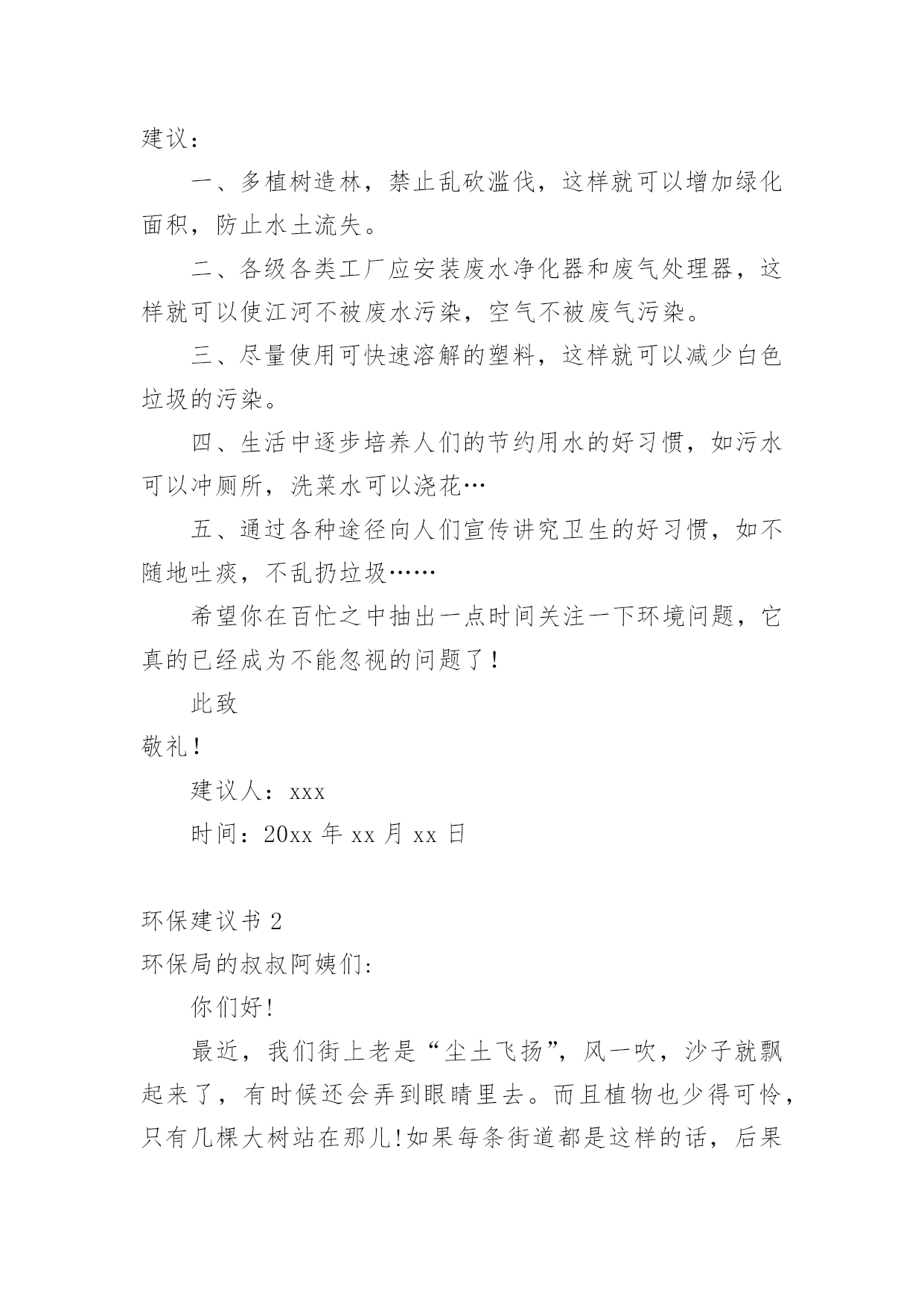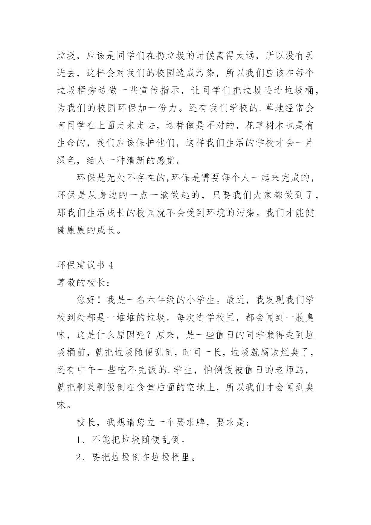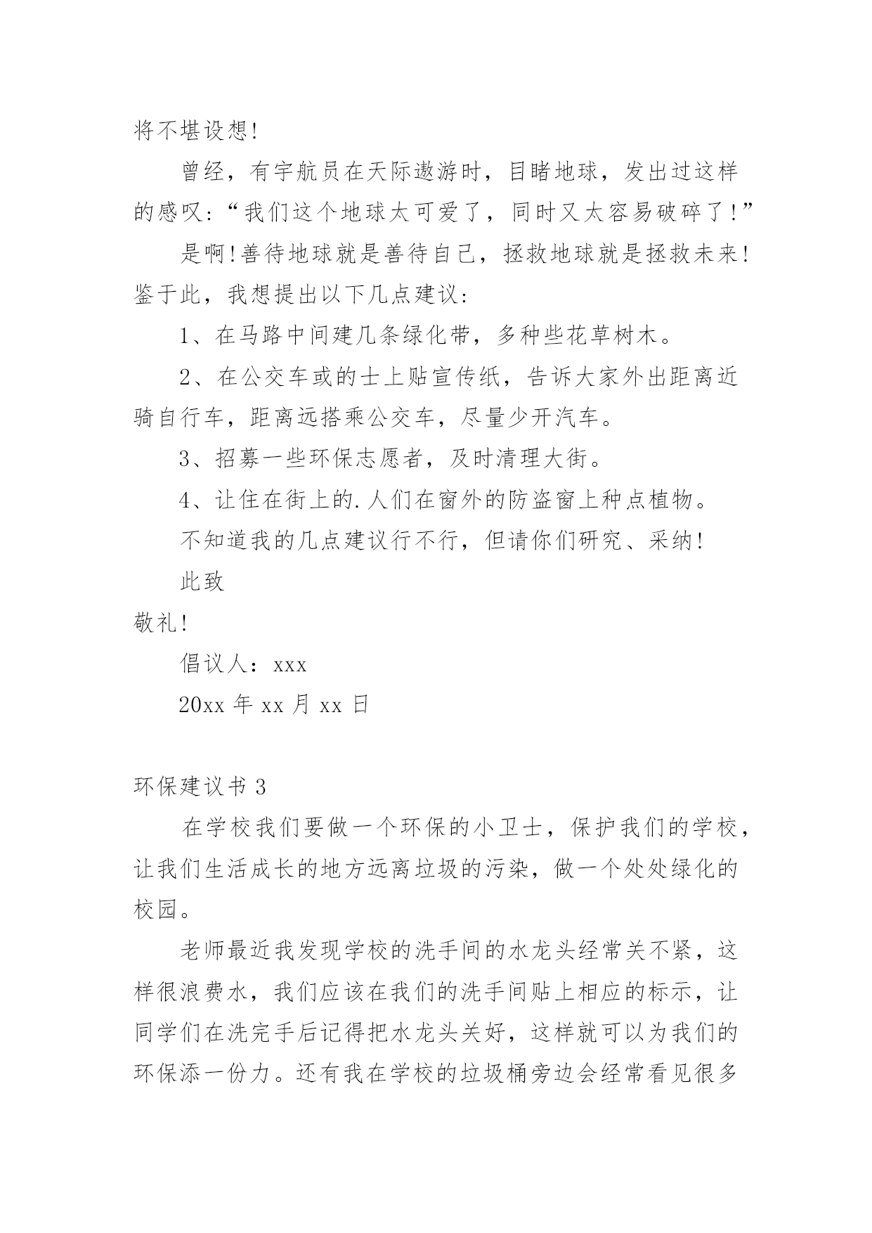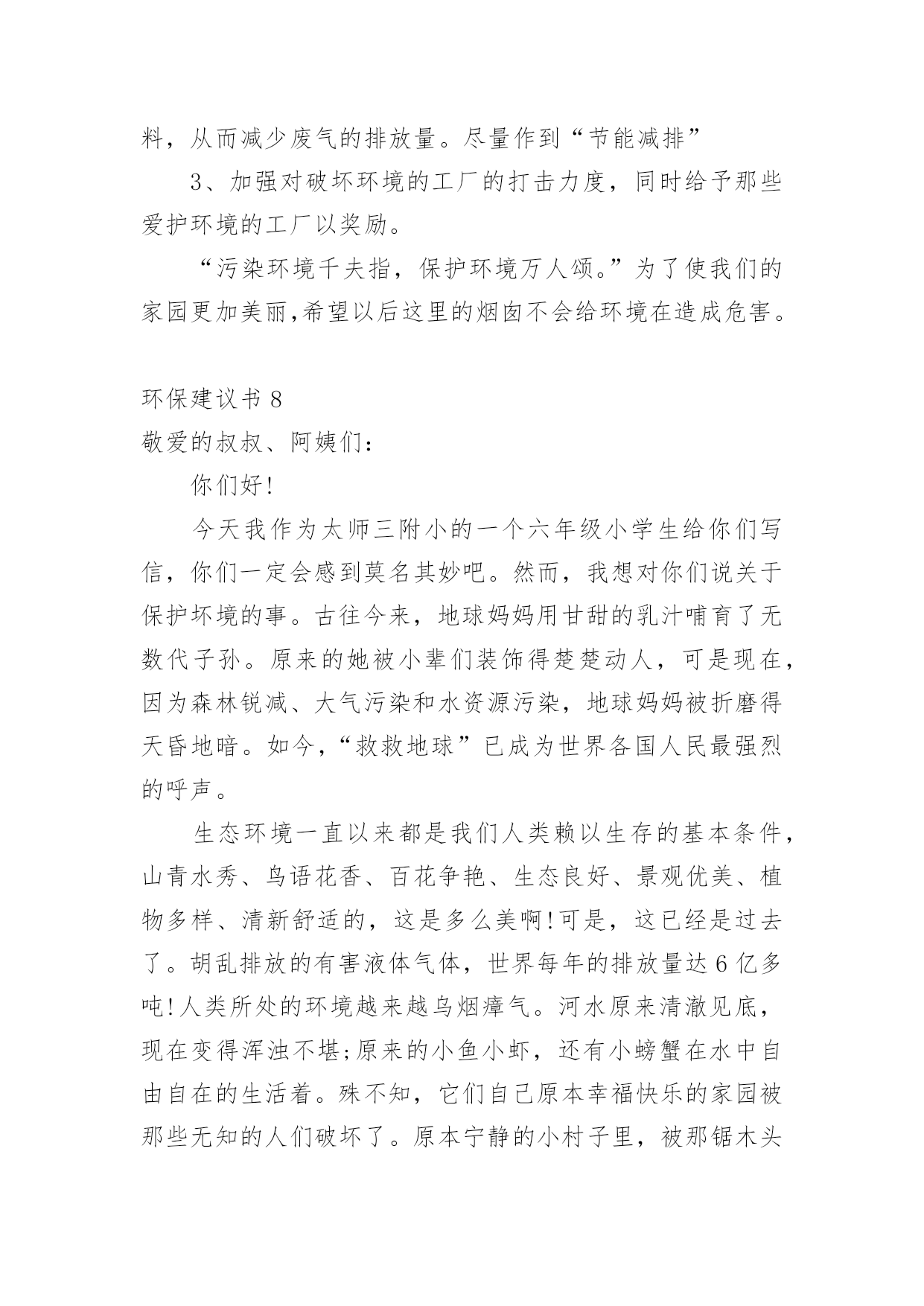 环保建议书(集合)环保建议书在当今社会生活中,需要使用建议书的场合越来越多,当建议书是面对领导和有关部门时,可以中肯地提出自己对对方工作的意见和自己的建议。那么你有了解过建议书吗?下面是小编精心整理的环保建议书,欢迎大家分享。环保建议书1尊敬的环卫局局长:你好!我是一名六年级的小学生,关于环境保护的问题,我今天想跟你提点建议。地球是我们的家,也是我们的母亲。地球无私地供给我们各种资源,让我们有吃的,穿的,用的……我们本应该竭尽全力去保护她。但是,我看到的并不是这样的,伐木工人砍倒一棵又一棵的参天大树,却不懂得砍一棵种一棵树的道理,导致森林面积大幅度地减少,大量水土流失。人们没有节制地用水,喝一杯水倒一杯水,洒一盆水的现象在我们身边大量出现,我们地球上的淡水正在走向枯竭。煤矿的开采力度日渐加大,地下的矿物就像杯子里的果汁一样,被人们一口一口地“喝”掉,矿物迟早会被开采光的。各种各样的工厂如雨后春笋般地拔地而起,一沟沟黑而发臭的'废水不断流入清澈的河流,一股股饱含有害物质的浓烟直冲云霄…像这们的例子在我们身边随处可见,为此,我向你提出如下建议:一、多植树造林,禁止乱砍滥伐,这样就可以增加绿化面积,防止水土流失。二、各级各类工厂应安装废水净化器和废气处理器,这样就可以使江河不被废水污染,空气不被废气污染。三、尽量使用可快速溶解的塑料,这样就可以减少白色垃圾的污染。四、生活中逐步培养人们的节约用水的好习惯,如污水可以冲厕所,洗菜水可以浇花…五、通过各种途径向人们宣传讲究卫生的好习惯,如不随地吐痰,不乱扔垃圾……希望你在百忙之中抽出一点时间关注一下环境问题,它真的已经成为不能忽视的问题了!此致敬礼!建议人:xxx时间:20xx年xx月xx日环保建议书2环保局的叔叔阿姨们:你们好!最近,我们街上老是“尘土飞扬”,风一吹,沙子就飘起来了,有时候还会弄到眼睛里去。而且植物也少得可怜,只有几棵大树站在那儿!如果每条街道都是这样的话,后果将不堪设想!曾经,有宇航员在天际遨游时,目睹地球,发出过这样的感叹:“我们这个地球太可爱了,同时又太容易破碎了!”是啊!善待地球就是善待自己,拯救地球就是拯救未来!鉴于此,我想提出以下几点建议:1、在马路中间建几条绿化带,多种些花草树木。2、在公交车或的士上贴宣传纸,告诉大家外出距离近骑自行车,距离远搭乘公交车,尽量少开汽车。3、招募一些环保志愿者,及时清理大街。4、让住在街上的.人们在窗外的防盗窗上种点植物。不知道我的几点建议行不行,但请你们研究、采纳!此致敬礼!倡议人:xxx20xx年xx月xx日环保建议书3在学校我们要做一个环保的小卫士,保护我们的学校,让我们生活成长的地方远离垃圾的污染,做一个处处绿化的校园。老师最近我发现学校的洗手间的水龙头经常关不紧,这样很浪费水,我们应该在我们的洗手间贴上相应的标示,让同学们在洗完手后记得把水龙头关好,这样就可以为我们的环保添一份力。还有我在学校的垃圾桶旁边会经常看见很多垃圾,应该是同学们在扔垃圾的时候离得太远,所以没有丢进去,这样会对我们的校园造成污染,所以我们应该在每个垃圾桶旁边做一些宣传指示,让同学们把垃圾丢进垃圾桶,为我们的校园环保加一份力。还有我们学校的.草地经常会有同学在上面走来走去,这样做是不对的,花草树木也是有生命的,我们应该保护他们,这样我们生活的学校才会一片绿色,给人一种清新的感觉。环保是无处不存在的,环保是需要每个人一起来完成的,环保是从身边的一点一滴做起的,只要我们大家都做到了,那我们生活成长的校园就不会受到环境的污染。我们才能健健康康的成长。环保建议书4尊敬的校长:您好!我是一名六年级的小学生。最近,我发现我们学校到处都是一堆堆的垃圾。每次进学校里,都会闻到一股臭味,这是什么原因呢?原来,是一些值日的同学懒得走到垃圾桶前,就把垃圾随便乱倒,时间一长,垃圾就腐败烂臭了,还有中午一些吃不完饭的.学生,怕倒饭被值日的老师骂,就把剩菜剩饭倒在食堂后面的空地上,所以我们才会闻到臭味。校长,我想请您立一个要求牌,要求是:1、不能把垃圾随便乱倒。2、要把垃圾倒在垃圾桶里。3、不能把剩菜剩饭倒在食堂后面的空地上。4、坚持把饭吃完,如果实在吃不下去,就跟值日的老师讲讲。这就是我提的建议,希望能得到您的赞同。此致敬礼!xxx20xx年xx月xx日环保建议书5敬爱的环保局人员:你们好!你们天天为了我们服务,可是,你们知道吗?我在小区里经常看到环卫工人抱怨业主们不按可回收、不可回收垃圾分类扔垃圾,不仅给我们的工作造成了很大的负担,而且整个小区的'环境显得非常肮脏。据调查,我们小区有90%的业主都没有按照垃圾进行分类。我分析,导致这个现象的主要原因是大家不了解垃圾如何好好分类。我建议:1、将可回收垃圾和不可回收垃标识在垃圾桶更明显的位置,比如:垃圾桶的四周。2、将