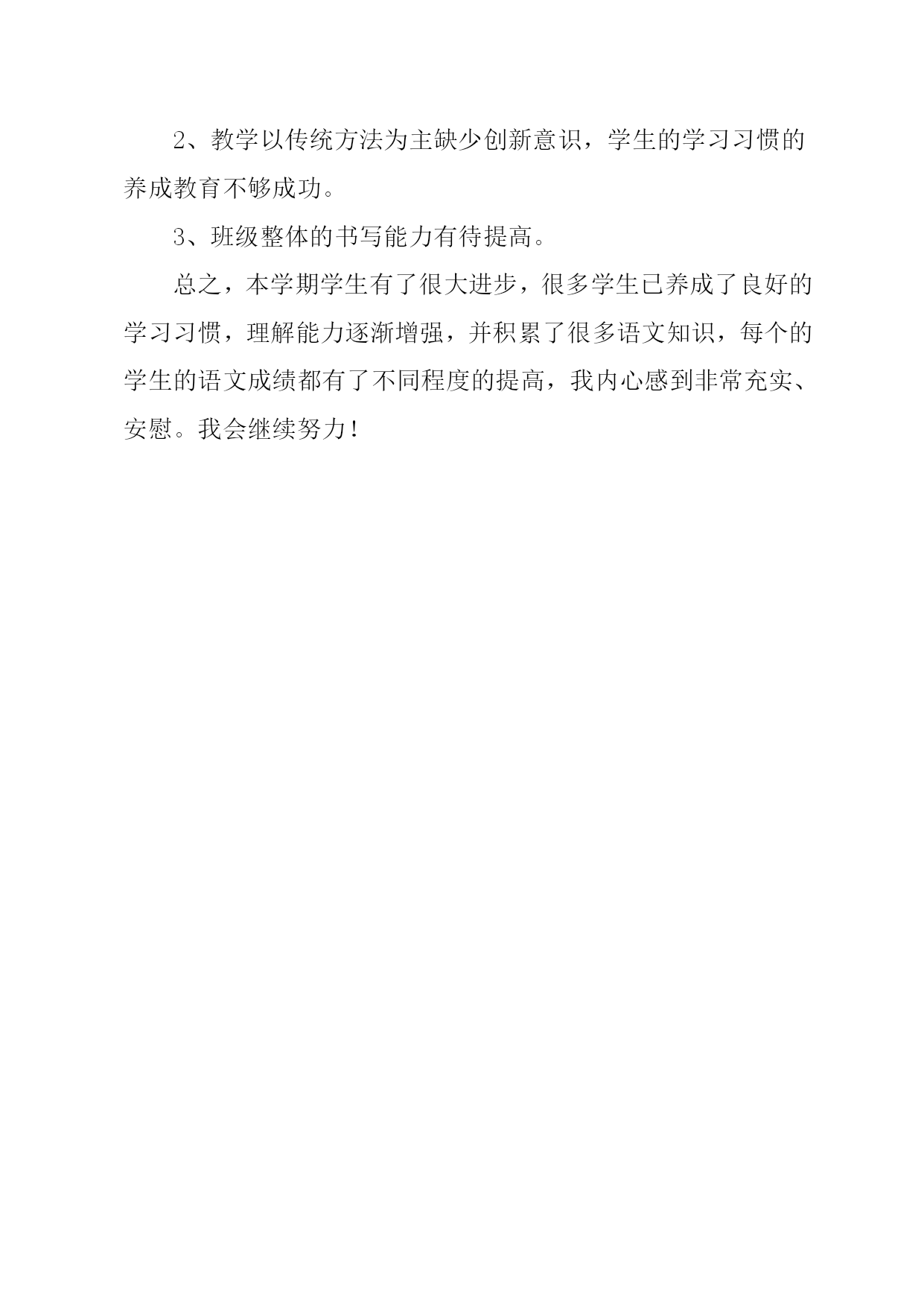 语文教学工作总结本学期,我继续担任一年四班的语文教学工作。一学期来,我认真扎实地对待教学,虚心向他人学习,在实践中积累了属于自己的教学感悟。现从以下几个方面加以总结:一、不断提高专业素养,与时俱进。为提高教学水平,给学生一个清新、明朗的课堂,本学期我认真参加集备活动,积极找问题,并请教他人,寻求解决问题的最佳途径。为了上好每一节课,我认真钻研教参、教材,并结合本班学生的实际特点,备好课,上好课。平时,我坚持独立备课,因此在课前的准备是很充分的,为加强教学常规的养成奠定了基础。课堂上,我着力抓好课堂常规。并以学生为主体,有目的、有条理地引导他们进行学习,自主获取知识。经过这段时间的训练,学生们已经学会带着问题认真地进行语文合作学习,学会了针对文本提出一些有质量的问题。课余,我积极参加各级各类组织的教研活动,还经常阅读一些教学书籍,吸收一些适用的方法,更新一些教学理念,从而促进自身专业的发展。二、积极开展语文活动,全面激发学生学习语文的兴趣。一期来,在教学方法上,我总结出了儿歌识字,字谜识字,形象识字,游戏识字,编故事识字等一系列学生喜欢的识字教学方法。平时,我尽量让学生多识字。除了课内识字外,我还鼓励学生在课外识字,引导学生平时留心观察,随时随地识字。课外书,同学朋友的名字,学校各处的名称以及大街上的广告牌,家里的报纸、包装袋、超市的货柜都是我们一年级小朋友识字的好地方。低年级的词语教学是巩固识字、提高语文素养的重要组成部分,在以往的教学过程中我更多关注的是学生对词语是否正确地认读,词语的积累重视不够,而本期我注重了这一点。经过一系列的词语积累练习后,大大丰富了学生的词语库,从而提高学生课堂表达能力。针对本班学生的特点和实际,本着“扎实打基础,认真来学习”的原则,除上好语文课以外,我还组织了以下活动:一是坚持早自习引读生字笔顺训练,培养学生识记生字以及正确书写的能力。二是天天少量的课外阅读活动,提高学生拼读水平,培养学生独立阅读的能力,拓展学生的知识面。三是开放式作业,促进学生观察、思考习惯的养成,鼓励学生在生活中学语文。三、加强后进生转化工作,缩短学生差距。本班个别学生与其他同学存在着较大的差异,为促使每位学生能在原有的基础上都有所发展,我“抓两头,扶中间”。注重培养优生的特长,同时,在班中成立“互助”小组,利用结对子形式,课外加强辅导工作,课堂中创设机会,给予鼓励,培养学生的学习兴趣,促使每一位学生都有提高。四、存在不足与今后打算:1、班级发展不平衡,一年级的学法指导工作还有待进一步加强,教学成绩仍然欠突出,还需提高;2、教学以传统方法为主缺少创新意识,学生的学习习惯的养成教育不够成功。3、班级整体的书写能力有待提高。总之,本学期学生有了很大进步,很多学生已养成了良好的学习习惯,理解能力逐渐增强,并积累了很多语文知识,每个的学生的语文成绩都有了不同程度的提高,我内心感到非常充实、安慰。我会继续努力!