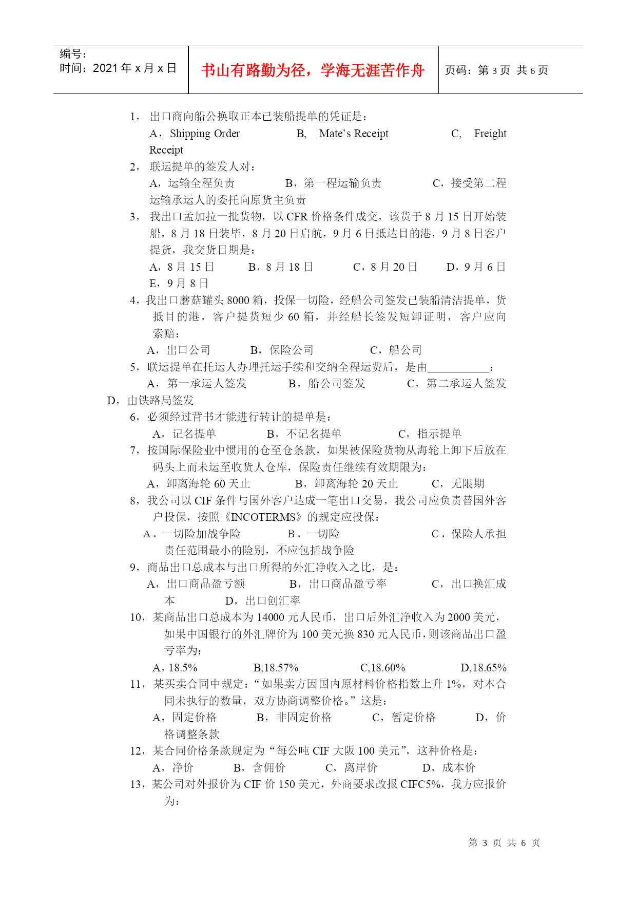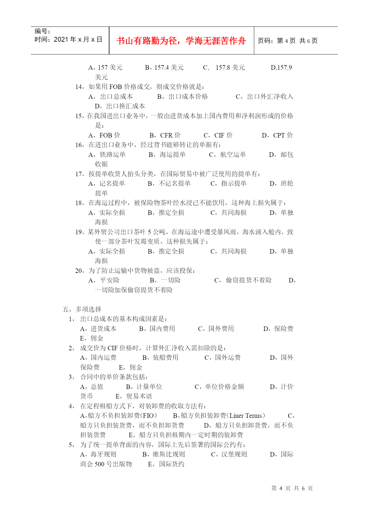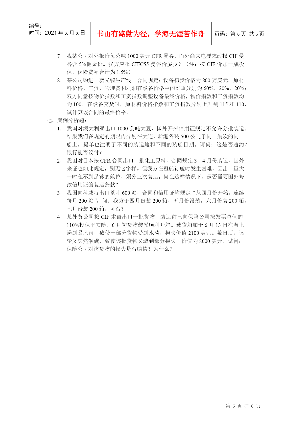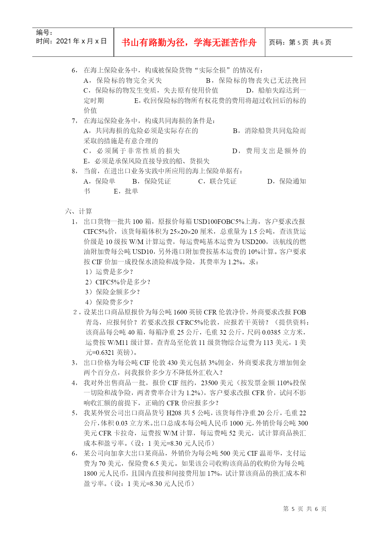 编号:时间:2021年x月x日书山有路勤为径,学海无涯苦作舟页码:第PAGE6页共NUMPAGES6页第PAGE\*MERGEFORMAT6页共NUMPAGES\*MERGEFORMAT6页练习三价格、运输、保险名词解释清洁已装船提单2,共同海损3,推定全损4,仓至仓条款5,暗佣填空1,航空运单与海运提单不同,前者不是,不能,也不能;而后者是,能,也能。2,国际海运班轮运费计算标准有、、、、、。3,提单按收货人抬头分类,可分为、、提单三种。4,海运提单的性质和作用是、、。5,我出口东非某商品1000箱,每箱毛重30公斤,体积40cm30cm30cm,经查运价表,该货运费计算标准为M/W,每运费吨为480港元,我应付运费共港元。6,来证对海运提单要求作空白抬头、空白背书,则提单收货人一栏应填,经后可转让他人,这种提单称为提单,也称为提单。7,投保人在投保一切险之后,还可根据需要加保险。8,CIC中的FPA、WA、AR分别与ICC新条款中的、、内容相似。9,在保险业务中,对部分损失,从其性质来分,可分为和。10,陆上运输货物保险的险别可分为和两种。11,保险公司对陆运险的承保范围大致相当于海运货物保险中的。12,航空运输货物保险分为和。13,根据陆运货物保险的责任起讫期限,如保险货物未到达目的地仓库或储存处所,则被保险货物到达最后卸载的车站后,保险责任以天为限。14,根据航空货物保险的责任起讫期限,如保险货物未到达目的地仓库或储存处所,则被保险货物在最后卸货地卸离飞机后,保险责任以天为限。15,邮包保险包括和两种基本险别。是非判断1,提单日期是说明装船开始的日期。2,合同规定“ShipmentduringOct.”是指十月底以前的任何时间都可以装运。3,国外客户向我定货时,要求在合同中规定“选择港:伦敦/鹿特丹/墨尔本”的条款,我方可以同意,因为这是国际上的习惯做法。4,所谓“仓至仓条款”就是指船公司负责将货物从装运地发货人的仓库运送到目的地收货人的仓库的运输条款。5,“空白抬头、空白背书”的提单是指既不填写收货人,又不须背书的提单。6,海运提单、航空运单、铁路运单都是物权凭证,都可以通过背书转让。7,如合同中规定装运条款为“2001年7/8月装运”,那么我出口公司必须将货物于七、八月两个月内,每月各装一批。8,水渍险的责任范围是除平安险责任范围以内的全部责任外,还包括由于暴风、巨浪等自然灾害引起的部分损失。9,出口货物一批,投保水渍险,途中遇到暴雨,使该批货物遭受一定损失,因此保险公司应负责赔偿这批损失。10,玻璃为易碎商品,出口投保险别应为破碎险加战争险。11,船舶航行中遇暴风雨并搁浅,为使船舶起浮,将舱面上整批钢板抛入海中,该批钢板属于部分损失。12,出口方面,中国人民保险公司承保出口货物的保险金额一般按CIF价加百分之十计算。13,一批货物经海运至伊拉克某港口,投保了一切险加战争险。载货货轮驶目的港后,因无泊位,将货物卸至驳船上。在驳船驶回码头途中,不幸被伊朗飞机炸沉。因货物已卸离载货轮船,这笔损失保险公司不负赔偿责任。14,出口陶瓷商品,因其在运输途中容易破碎,所以在投保一切险的基础上,还应加保破碎险。15,伦敦保险协会制定的《协会货物条款》中的A险、B险、C险依次取代原来的FPA、WPA、AR。16,在国际贸易中,向保险公司投保一切险后,在运输途中由于任何外来原因所造成的一切货损,均可向保险公司索赔。17,在出口业务中,保险单日期不能迟于提单日期。18,当出口换汇成本低于外汇牌价时,出口企业就有人民币盈利。19,佣金的支付要根据中间商提供服务的性质和内容而定,可以在达成交易时支付,也可在卖方收到货款后支付。20,在班轮运费中包括装卸费,船货双方不计滯期费和速遣费。21,《跟单信用证统一惯例》规定,除非信用证另有规定,允许分批和转船。22,《跟单信用证统一惯例》规定,在分批装运中任何一批未按规定装运,则本批及以后各批均告失效。23,单项选择出口商向船公换取正本已装船提单的凭证是:A,ShippingOrderB,Mate’sReceiptC,FreightReceipt联运提单的签发人对:A,运输全程负责B,第一程运输负责C,接受第二程运输承运人的委托向原货主负责我出口孟加拉一批货物,以CFR价格条件成交,该货于8月15日开始装船,8月18日装毕,8月20日启航,9月6日抵达目的港,9月8日客户提货,我交货日期是:A,8月15日B,8月18日C,8月20日D,9月6日E,9月8日4,我出口蘑菇罐头8000箱,投保一切险,经船公司签发已装船清洁提单,货抵目的港,客户提货短