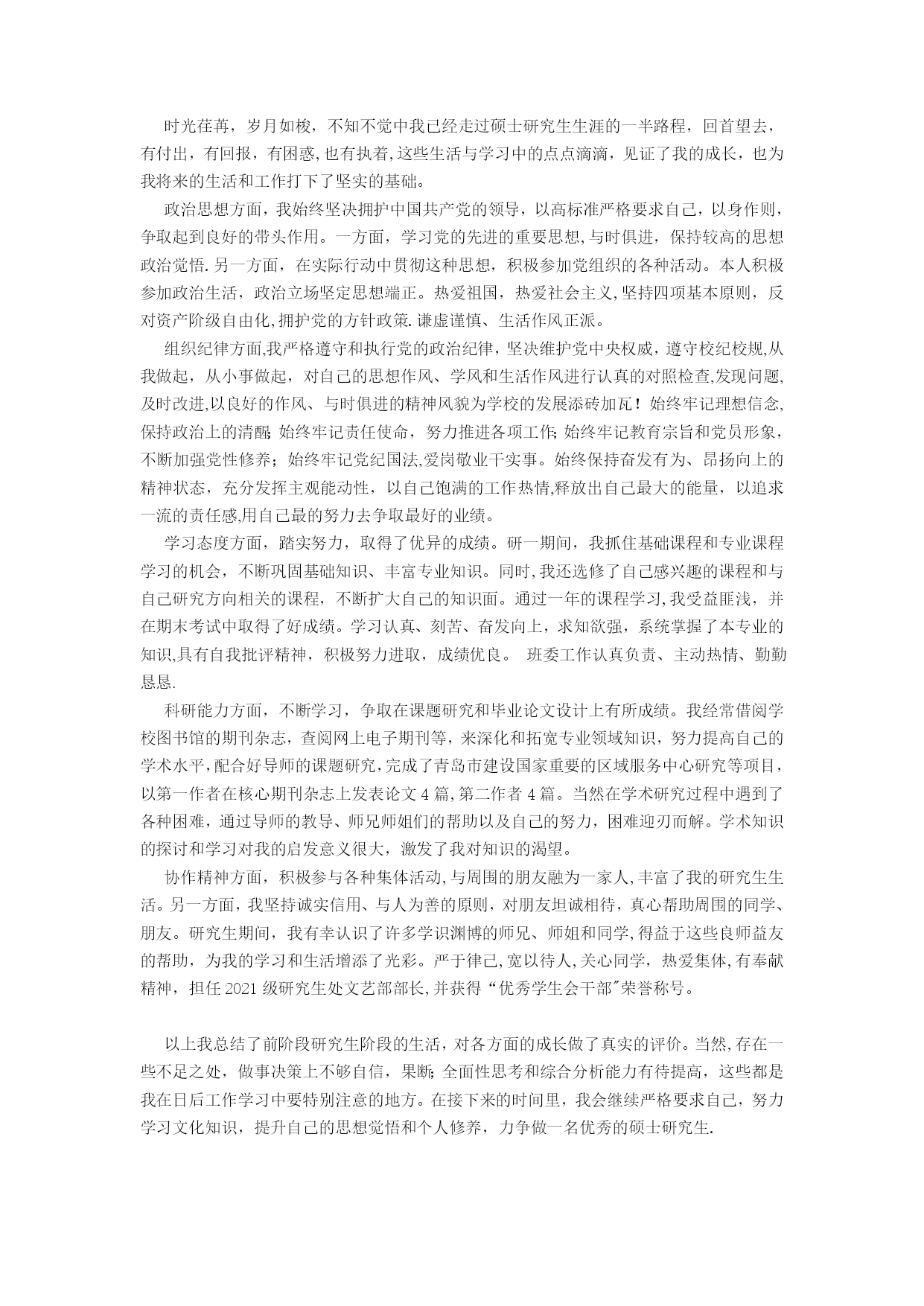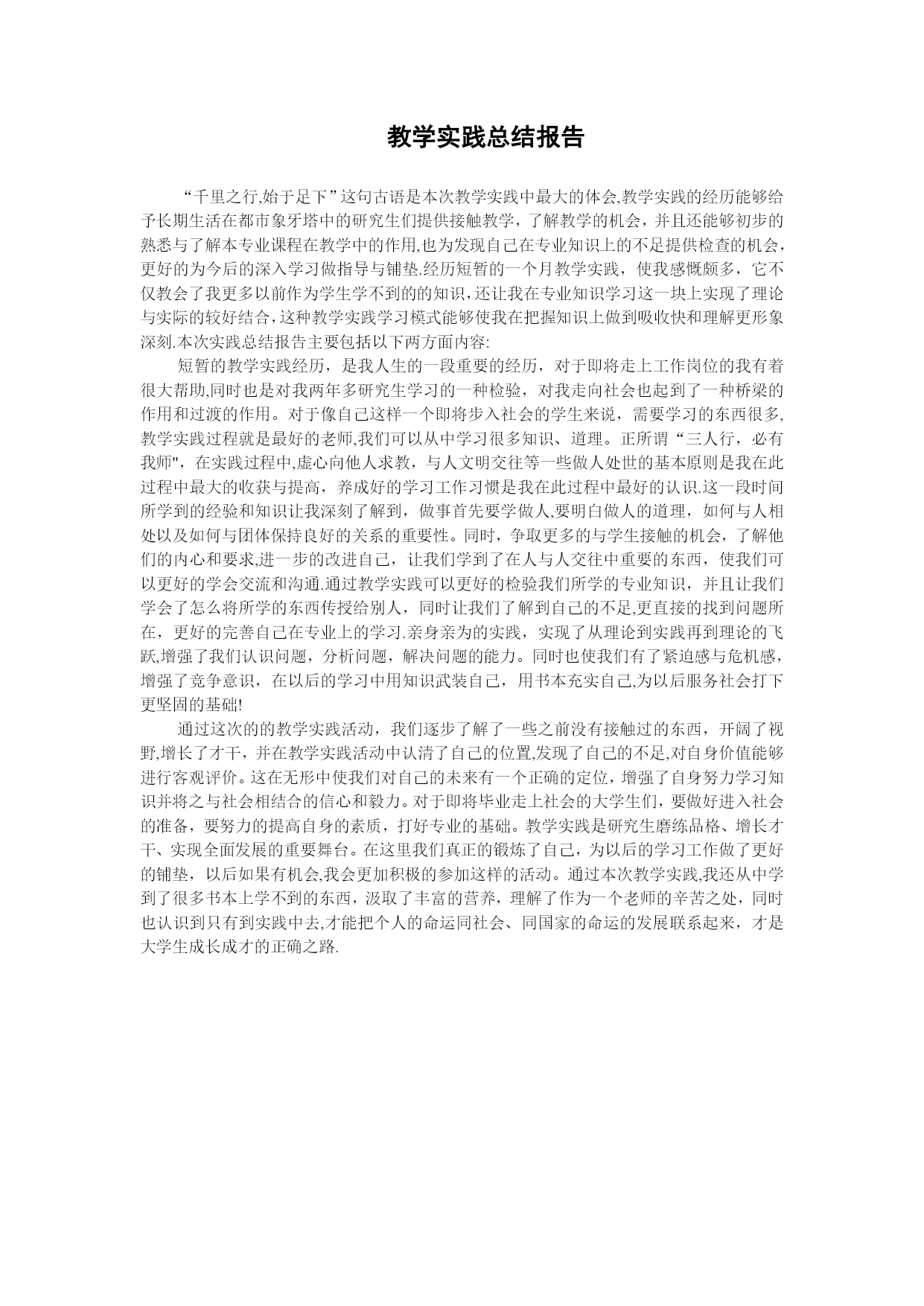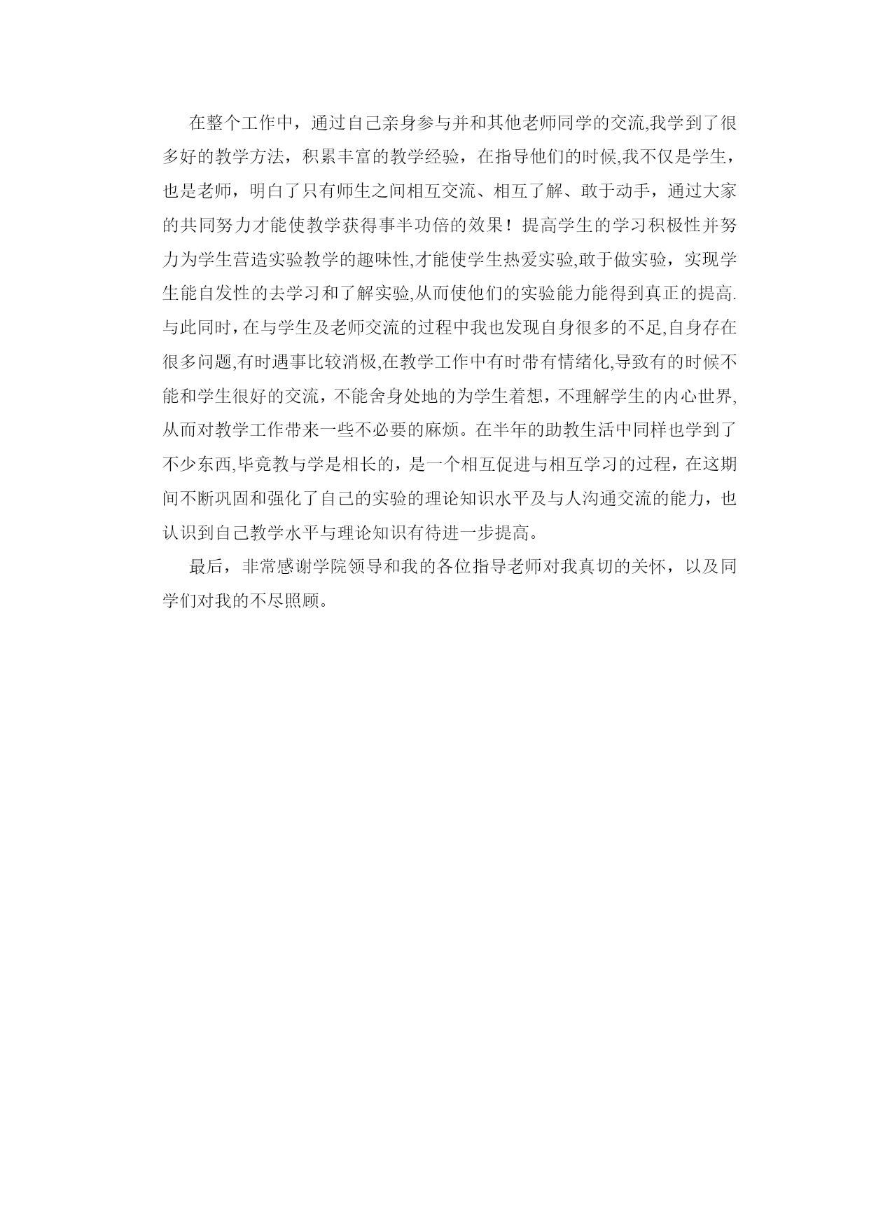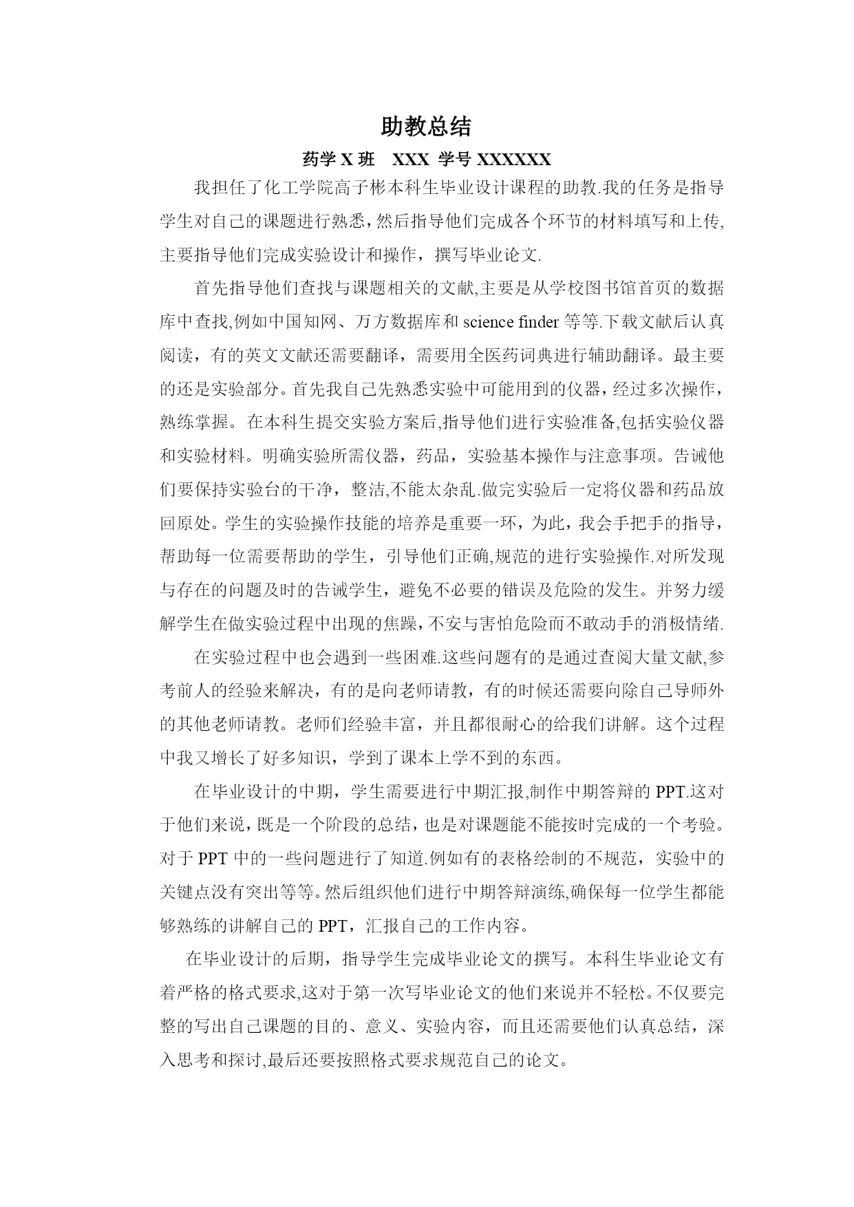 研究生助教总结个人总结实用文档(实用文档,可以直接使用,可编辑优秀版资料,欢迎下载)助教总结药学X班XXX学号XXXXXX我担任了化工学院高子彬本科生毕业设计课程的助教.我的任务是指导学生对自己的课题进行熟悉,然后指导他们完成各个环节的材料填写和上传,主要指导他们完成实验设计和操作,撰写毕业论文.首先指导他们查找与课题相关的文献,主要是从学校图书馆首页的数据库中查找,例如中国知网、万方数据库和sciencefinder等等.下载文献后认真阅读,有的英文文献还需要翻译,需要用全医药词典进行辅助翻译。最主要的还是实验部分。首先我自己先熟悉实验中可能用到的仪器,经过多次操作,熟练掌握。在本科生提交实验方案后,指导他们进行实验准备,包括实验仪器和实验材料。明确实验所需仪器,药品,实验基本操作与注意事项。告诫他们要保持实验台的干净,整洁,不能太杂乱.做完实验后一定将仪器和药品放回原处。学生的实验操作技能的培养是重要一环,为此,我会手把手的指导,帮助每一位需要帮助的学生,引导他们正确,规范的进行实验操作.对所发现与存在的问题及时的告诫学生,避免不必要的错误及危险的发生。并努力缓解学生在做实验过程中出现的焦躁,不安与害怕危险而不敢动手的消极情绪.在实验过程中也会遇到一些困难.这些问题有的是通过查阅大量文献,参考前人的经验来解决,有的是向老师请教,有的时候还需要向除自己导师外的其他老师请教。老师们经验丰富,并且都很耐心的给我们讲解。这个过程中我又增长了好多知识,学到了课本上学不到的东西。在毕业设计的中期,学生需要进行中期汇报,制作中期答辩的PPT.这对于他们来说,既是一个阶段的总结,也是对课题能不能按时完成的一个考验。对于PPT中的一些问题进行了知道.例如有的表格绘制的不规范,实验中的关键点没有突出等等。然后组织他们进行中期答辩演练,确保每一位学生都能够熟练的讲解自己的PPT,汇报自己的工作内容。在毕业设计的后期,指导学生完成毕业论文的撰写。本科生毕业论文有着严格的格式要求,这对于第一次写毕业论文的他们来说并不轻松。不仅要完整的写出自己课题的目的、意义、实验内容,而且还需要他们认真总结,深入思考和探讨,最后还要按照格式要求规范自己的论文。在整个工作中,通过自己亲身参与并和其他老师同学的交流,我学到了很多好的教学方法,积累丰富的教学经验,在指导他们的时候,我不仅是学生,也是老师,明白了只有师生之间相互交流、相互了解、敢于动手,通过大家的共同努力才能使教学获得事半功倍的效果!提高学生的学习积极性并努力为学生营造实验教学的趣味性,才能使学生热爱实验,敢于做实验,实现学生能自发性的去学习和了解实验,从而使他们的实验能力能得到真正的提高.与此同时,在与学生及老师交流的过程中我也发现自身很多的不足,自身存在很多问题,有时遇事比较消极,在教学工作中有时带有情绪化,导致有的时候不能和学生很好的交流,不能舍身处地的为学生着想,不理解学生的内心世界,从而对教学工作带来一些不必要的麻烦。在半年的助教生活中同样也学到了不少东西,毕竟教与学是相长的,是一个相互促进与相互学习的过程,在这期间不断巩固和强化了自己的实验的理论知识水平及与人沟通交流的能力,也认识到自己教学水平与理论知识有待进一步提高。最后,非常感谢学院领导和我的各位指导老师对我真切的关怀,以及同学们对我的不尽照顾。时光荏苒,岁月如梭,不知不觉中我已经走过硕士研究生生涯的一半路程,回首望去,有付出,有回报,有困惑,也有执着,这些生活与学习中的点点滴滴,见证了我的成长,也为我将来的生活和工作打下了坚实的基础。政治思想方面,我始终坚决拥护中国共产党的领导,以高标准严格要求自己,以身作则,争取起到良好的带头作用。一方面,学习党的先进的重要思想,与时俱进,保持较高的思想政治觉悟.另一方面,在实际行动中贯彻这种思想,积极参加党组织的各种活动。本人积极参加政治生活,政治立场坚定思想端正。热爱祖国,热爱社会主义,坚持四项基本原则,反对资产阶级自由化,拥护党的方针政策.谦虚谨慎、生活作风正派。组织纪律方面,我严格遵守和执行党的政治纪律,坚决维护党中央权威,遵守校纪校规,从我做起,从小事做起,对自己的思想作风、学风和生活作风进行认真的对照检查,发现问题,及时改进,以良好的作风、与时俱进的精神风貌为学校的发展添砖加瓦!始终牢记理想信念,保持政治上的清醒;始终牢记责任使命,努力推进各项工作;始终牢记教育宗旨和党员形象,不断加强党性修养;始终牢记党纪国法,爱岗敬业干实事。始终保持奋发有为、昂扬向上的精神状态,充分发挥主观能动性,以自己饱满的工作热情,释放出自己最大的能量,以追求一流的责任感,用自己最的努力去争取最好的业绩。学习态度方面,踏实努力,取得了优异的成绩。研一期间,我抓住基础课程和专业课程学习的机