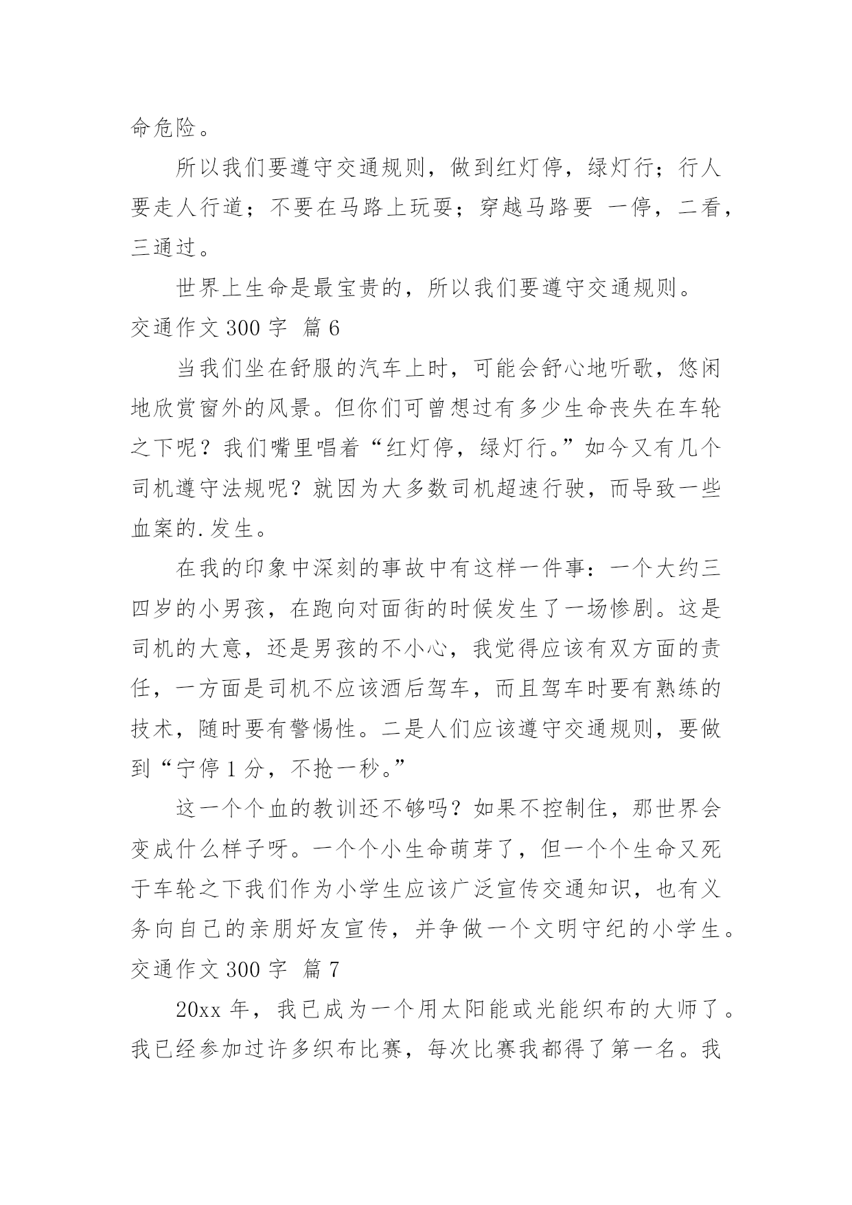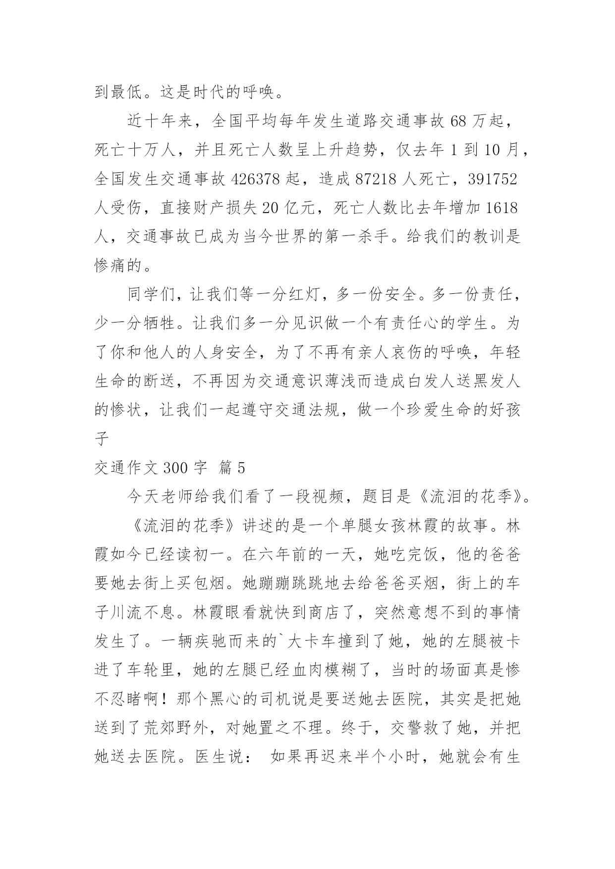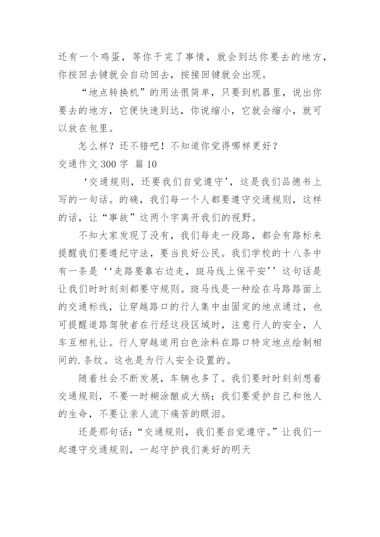 交通作文300字【优秀】交通作文300字在日常的学习、工作、生活中,大家总免不了要接触或使用作文吧,借助作文人们可以反映客观事物、表达思想感情、传递知识信息。如何写一篇有思想、有文采的作文呢?下面是小编为大家整理的交通作文300字10篇,供大家参考借鉴,希望可以帮助到有需要的朋友。交通作文300字篇1近来,发生的交通事故太多了,我真想对驾驶司机们大喊:“不要再开快车了,那是非常危险的事情,如果长期开快车,会祸不单行呀!不但车子被撞坏,还会另自已和别人受伤和赔钱,多吃亏啊!”记得那一次我目睹了一场交通事故,到现在仍记忆犹新:那天,我和老妈正在散步,突然,一辆小车急速地在马路上飞奔而过。就在这时,一个拐弯处驶出了一架红色摩托车,在这千钧一发之际,小车司机慌忙来了一个急刹车,并用尽全力扭转方向盘,但车子还是横着撞了过去。一刹那,摩托车上的`驾驶员飞了出去了,头破血流,一会儿,急救车来到把他送走了,真是惨不忍睹。我看了看车子,车子的车门变形了。又看了看地上,地上两条刹车印,非常明显。心想:“现在的司机总是喜欢把车子开得那么快,真是不怕一万,只怕万一啊。为了预防撞车的交通事故,不但要集中精神,还要不能开危险的高速车。”这时,老妈拉着我走时说:“这些司机心中根本没有交通规则思想,我们要小心才行!”司机们!请你们集中精神小心开车,不要再盲目开快车了,否则后果会很严重的!交通作文300字篇2我长大了想发明一种“天使新型车”,它的颜色很特别,是由白而粉组成的。它长得像天使一样,还有一对有力的天使翅膀。进去时,你就仿佛来到了鹅毛的世界,因为里面的座椅都是鹅毛做得。这种未来的新型汽车将会成为人们生活中必不可少的朋友。这种汽车没有方向盘,里面有三个按钮,当你遇到交通堵塞时,就可以按第一个按钮,它就会伸出它那有力的翅膀在天上飞翔,可以让你不耽误时间的.到达目的地。当你遇到海洋时,就按第二个按钮,车轮胎变大,在浮力和螺旋桨作用下汽车在海上行驶,而且有着非凡的速度。还可以观光海景,是一种美的享受。当你需要什么东西时,只有按第三个按钮,与它对话,它就会把你需要的东西送到你面前,如笔记本电脑、西瓜、喜欢吃得冰淇淋、还有我喜欢看得动画片……这辆车里既环保又舒服,它可是用的风能和水能哦!我好期待长大能实现这个梦想呀!交通作文300字篇3今天下午我们班开了一次班队会,主题是“交通安全你我他”,主持人是金怡莹和蒋雨婷,管纪录的是童露和金孙怡,照相师就是我们的班主任吴老师了。激动人心的时刻到了,只见黑板上书写着“交通安全你我他”七个大字,下面还有一排蜗牛般的小字,那就是“—501班班队课”。我们可为了这次班队课花了大功夫,还特地做了PPT呢!虽然这是我们第一次做,做的不太好,但还是不错的'!首先,金怡莹让同学们玩了一个交通知识对与错的游戏。对的是爱心,错的是叉叉。哈哈,同学们可被这些问题给难倒了,只好乖乖的投降喽!之后,蒋雨婷又介绍了红。黄色信号灯和交通标志。我们班还刚发现了交通大王——徐昊杰!他十分厉害,十字交叉注意行人……使人十分佩服他!时间飞快,不久就下课了,我们留恋这节课!在这节课中,我们用欢声笑语愉快地度过了这次班队课,使我更解了交通知识,知道了生活中我们应该时刻要注意的交通知识。交通作文300字篇4随着社会的飞速发展,生活工作节奏越来越快了,汽车成了人们主要的交通工具,它带给我们前所未有的方便,在人们感叹社会进步,享受社会进步的同时,也给我们带来了灾难,一个个鲜活的'生命小消失在飞驰的车轮下,一个个幸福的家庭一转眼破碎不堪,特别是那些还没有踏上社会的小学生,遇上这样的灾难,亲人哀伤的呼唤,留不住幼小的生命。我们能做什么呢。普及交通安全教育,把交通事故降到最低。这是时代的呼唤。近十年来,全国平均每年发生道路交通事故68万起,死亡十万人,并且死亡人数呈上升趋势,仅去年1到10月,全国发生交通事故426378起,造成87218人死亡,391752人受伤,直接财产损失20亿元,死亡人数比去年增加1618人,交通事故已成为当今世界的第一杀手。给我们的教训是惨痛的。同学们,让我们等一分红灯,多一份安全。多一份责任,少一分牺牲。让我们多一分见识做一个有责任心的学生。为了你和他人的人身安全,为了不再有亲人哀伤的呼唤,年轻生命的断送,不再因为交通意识薄浅而造成白发人送黑发人的惨状,让我们一起遵守交通法规,做一个珍爱生命的好孩子交通作文300字篇5今天老师给我们看了一段视频,题目是《流泪的花季》。《流泪的花季》讲述的是一个单腿女孩林霞的故事。林霞如今已经读初一。在六年前的一天,她吃完饭,他的爸爸要她去街上买包烟。她蹦蹦跳跳地去给爸爸买烟,街上的车子川流不息。林霞眼看就快到商店了,突然意想不到的事情发生了。一辆疾驰而来的`大卡车撞到了她,她的左腿被卡进了车轮里,她的左腿已经血