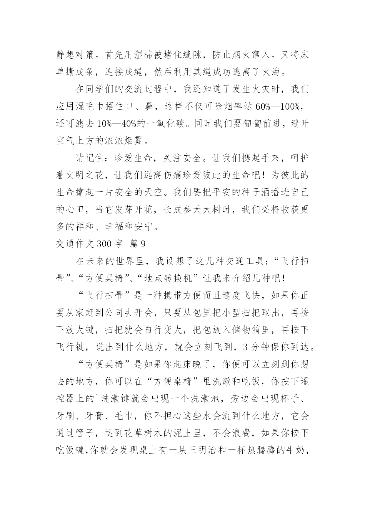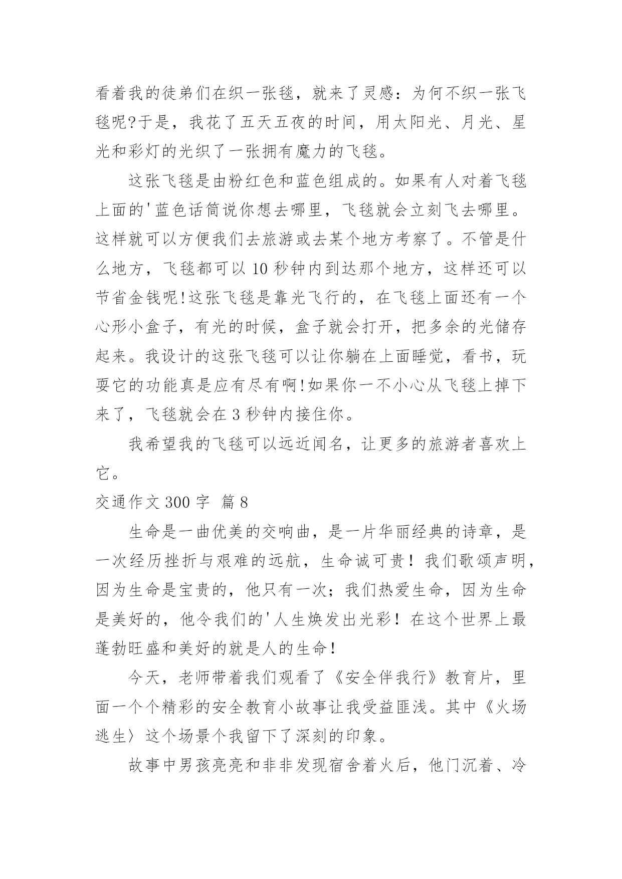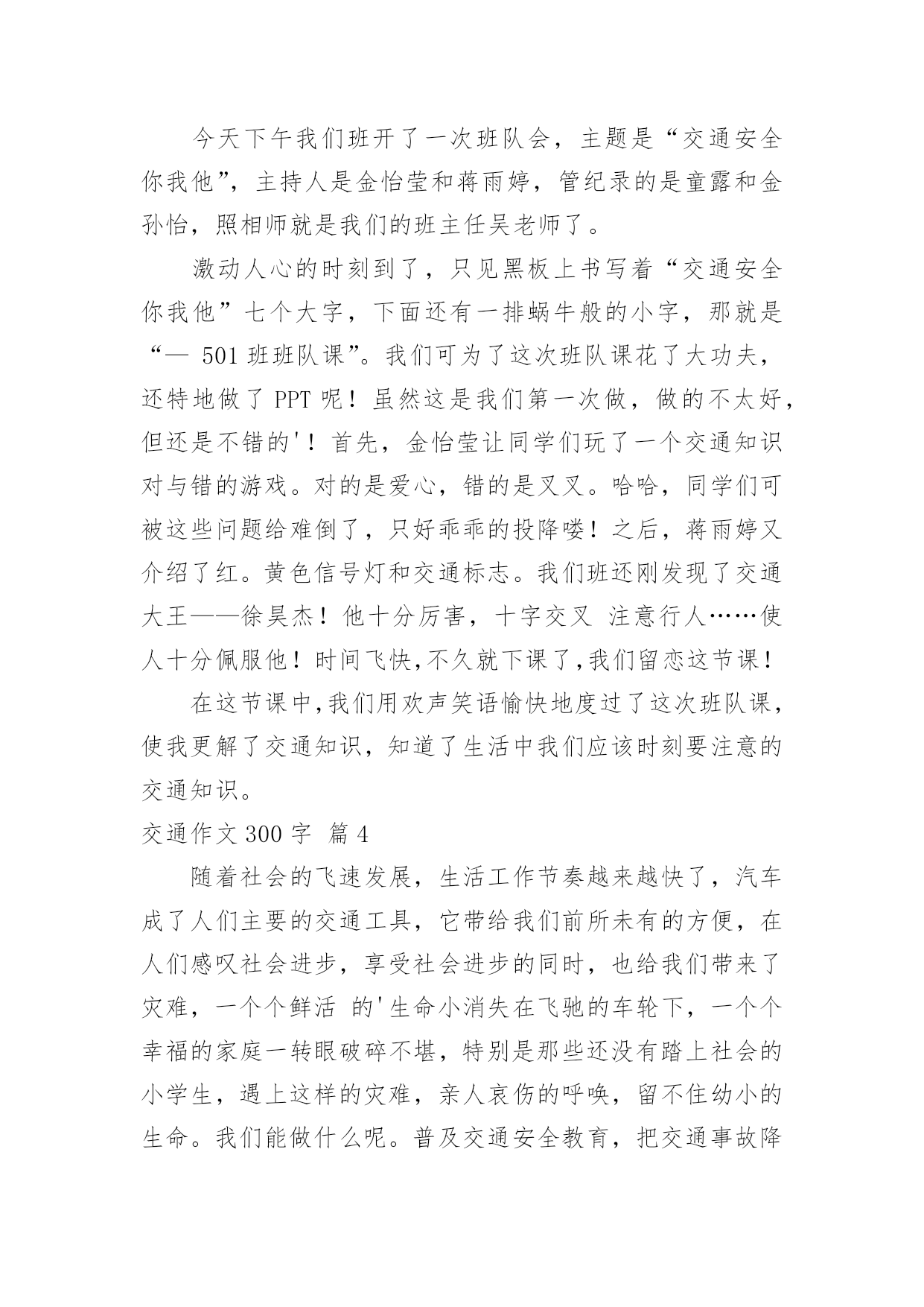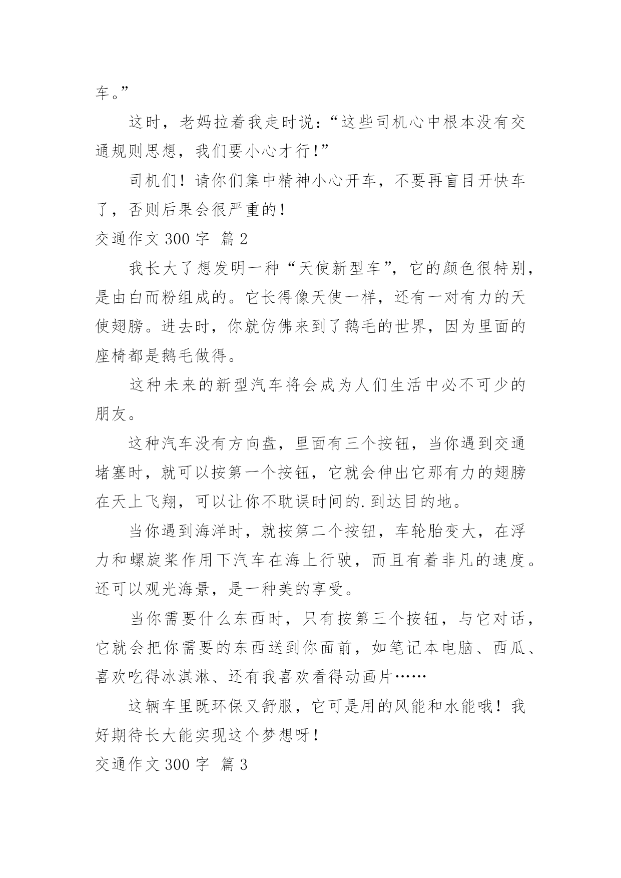 交通作文300字【优秀】交通作文300字在日常的学习、工作、生活中,大家总免不了要接触或使用作文吧,借助作文人们可以反映客观事物、表达思想感情、传递知识信息。如何写一篇有思想、有文采的作文呢?下面是小编为大家整理的交通作文300字10篇,供大家参考借鉴,希望可以帮助到有需要的朋友。交通作文300字篇1近来,发生的交通事故太多了,我真想对驾驶司机们大喊:“不要再开快车了,那是非常危险的事情,如果长期开快车,会祸不单行呀!不但车子被撞坏,还会另自已和别人受伤和赔钱,多吃亏啊!”记得那一次我目睹了一场交通事故,到现在仍记忆犹新:那天,我和老妈正在散步,突然,一辆小车急速地在马路上飞奔而过。就在这时,一个拐弯处驶出了一架红色摩托车,在这千钧一发之际,小车司机慌忙来了一个急刹车,并用尽全力扭转方向盘,但车子还是横着撞了过去。一刹那,摩托车上的`驾驶员飞了出去了,头破血流,一会儿,急救车来到把他送走了,真是惨不忍睹。我看了看车子,车子的车门变形了。又看了看地上,地上两条刹车印,非常明显。心想:“现在的司机总是喜欢把车子开得那么快,真是不怕一万,只怕万一啊。为了预防撞车的交通事故,不但要集中精神,还要不能开危险的高速车。”这时,老妈拉着我走时说:“这些司机心中根本没有交通规则思想,我们要小心才行!”司机们!请你们集中精神小心开车,不要再盲目开快车了,否则后果会很严重的!交通作文300字篇2我长大了想发明一种“天使新型车”,它的颜色很特别,是由白而粉组成的。它长得像天使一样,还有一对有力的天使翅膀。进去时,你就仿佛来到了鹅毛的世界,因为里面的座椅都是鹅毛做得。这种未来的新型汽车将会成为人们生活中必不可少的朋友。这种汽车没有方向盘,里面有三个按钮,当你遇到交通堵塞时,就可以按第一个按钮,它就会伸出它那有力的翅膀在天上飞翔,可以让你不耽误时间的.到达目的地。当你遇到海洋时,就按第二个按钮,车轮胎变大,在浮力和螺旋桨作用下汽车在海上行驶,而且有着非凡的速度。还可以观光海景,是一种美的享受。当你需要什么东西时,只有按第三个按钮,与它对话,它就会把你需要的东西送到你面前,如笔记本电脑、西瓜、喜欢吃得冰淇淋、还有我喜欢看得动画片……这辆车里既环保又舒服,它可是用的风能和水能哦!我好期待长大能实现这个梦想呀!交通作文300字篇3今天下午我们班开了一次班队会,主题是“交通安全你我他”,主持人是金怡莹和蒋雨婷,管纪录的是童露和金孙怡,照相师就是我们的班主任吴老师了。激动人心的时刻到了,只见黑板上书写着“交通安全你我他”七个大字,下面还有一排蜗牛般的小字,那就是“—501班班队课”。我们可为了这次班队课花了大功夫,还特地做了PPT呢!虽然这是我们第一次做,做的不太好,但还是不错的'!首先,金怡莹让同学们玩了一个交通知识对与错的游戏。对的是爱心,错的是叉叉。哈哈,同学们可被这些问题给难倒了,只好乖乖的投降喽!之后,蒋雨婷又介绍了红。黄色信号灯和交通标志。我们班还刚发现了交通大王——徐昊杰!他十分厉害,十字交叉注意行人……使人十分佩服他!时间飞快,不久就下课了,我们留恋这节课!在这节课中,我们用欢声笑语愉快地度过了这次班队课,使我更解了交通知识,知道了生活中我们应该时刻要注意的交通知识。交通作文300字篇4随着社会的飞速发展,生活工作节奏越来越快了,汽车成了人们主要的交通工具,它带给我们前所未有的方便,在人们感叹社会进步,享受社会进步的同时,也给我们带来了灾难,一个个鲜活的'生命小消失在飞驰的车轮下,一个个幸福的家庭一转眼破碎不堪,特别是那些还没有踏上社会的小学生,遇上这样的灾难,亲人哀伤的呼唤,留不住幼小的生命。我们能做什么呢。普及交通安全教育,把交通事故降到最低。这是时代的呼唤。近十年来,全国平均每年发生道路交通事故68万起,死亡十万人,并且死亡人数呈上升趋势,仅去年1到10月,全国发生交通事故426378起,造成87218人死亡,391752人受伤,直接财产损失20亿元,死亡人数比去年增加1618人,交通事故已成为当今世界的第一杀手。给我们的教训是惨痛的。同学们,让我们等一分红灯,多一份安全。多一份责任,少一分牺牲。让我们多一分见识做一个有责任心的学生。为了你和他人的人身安全,为了不再有亲人哀伤的呼唤,年轻生命的断送,不再因为交通意识薄浅而造成白发人送黑发人的惨状,让我们一起遵守交通法规,做一个珍爱生命的好孩子交通作文300字篇5今天老师给我们看了一段视频,题目是《流泪的花季》。《流泪的花季》讲述的是一个单腿女孩林霞的故事。林霞如今已经读初一。在六年前的一天,她吃完饭,他的爸爸要她去街上买包烟。她蹦蹦跳跳地去给爸爸买烟,街上的车子川流不息。林霞眼看就快到商店了,突然意想不到的事情发生了。一辆疾驰而来的`大卡车撞到了她,她的左腿被卡进了车轮里,她的左腿已经血