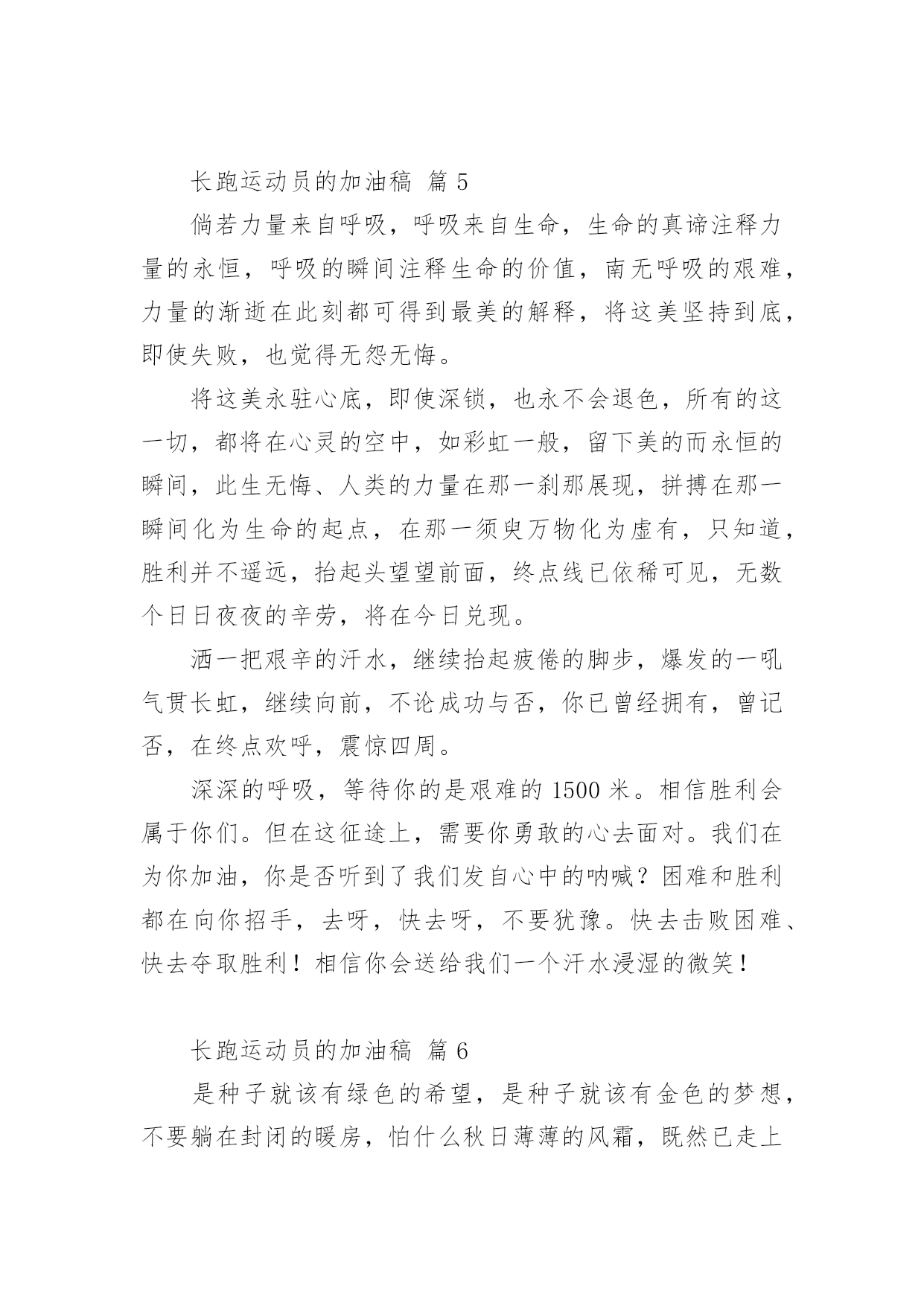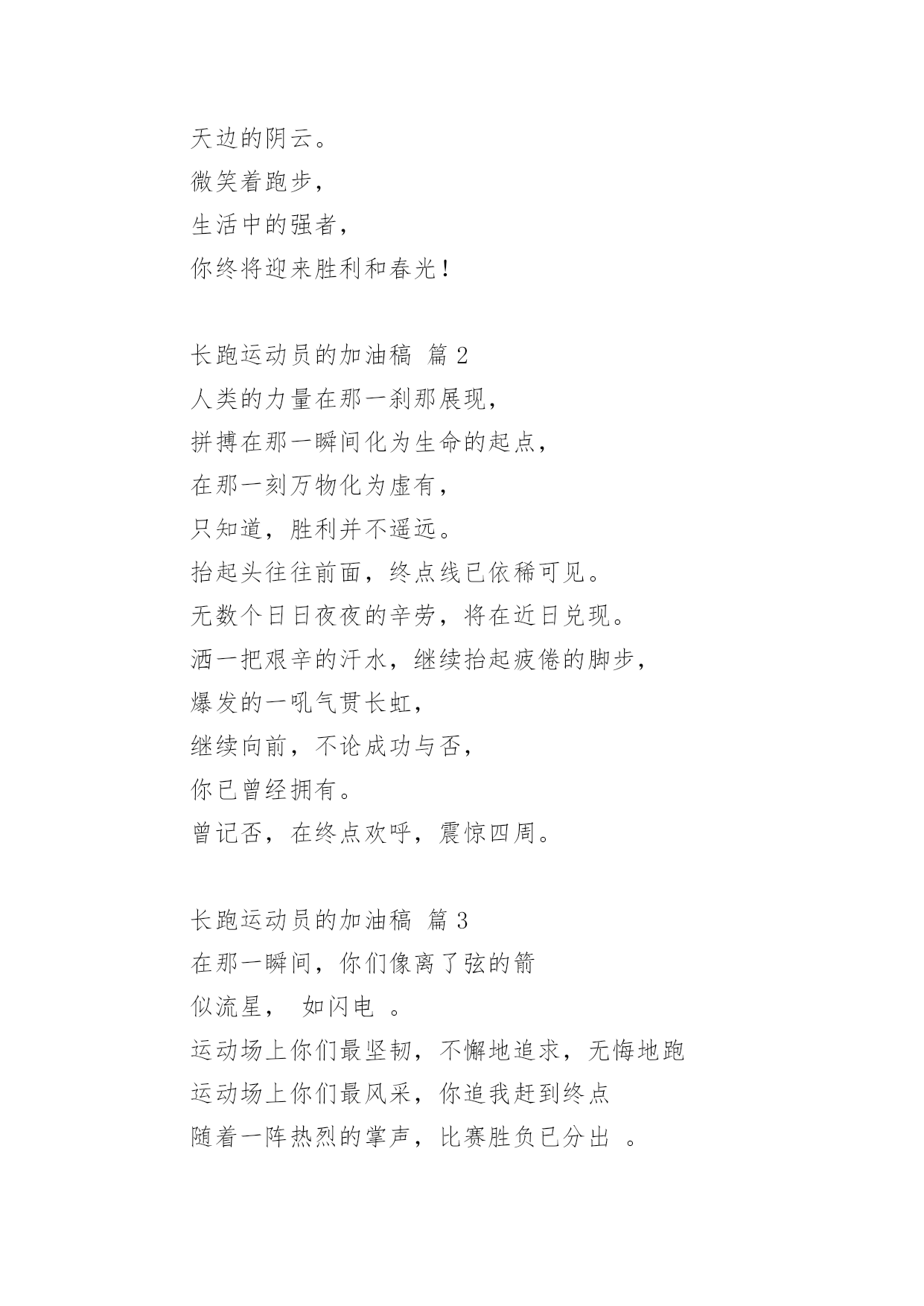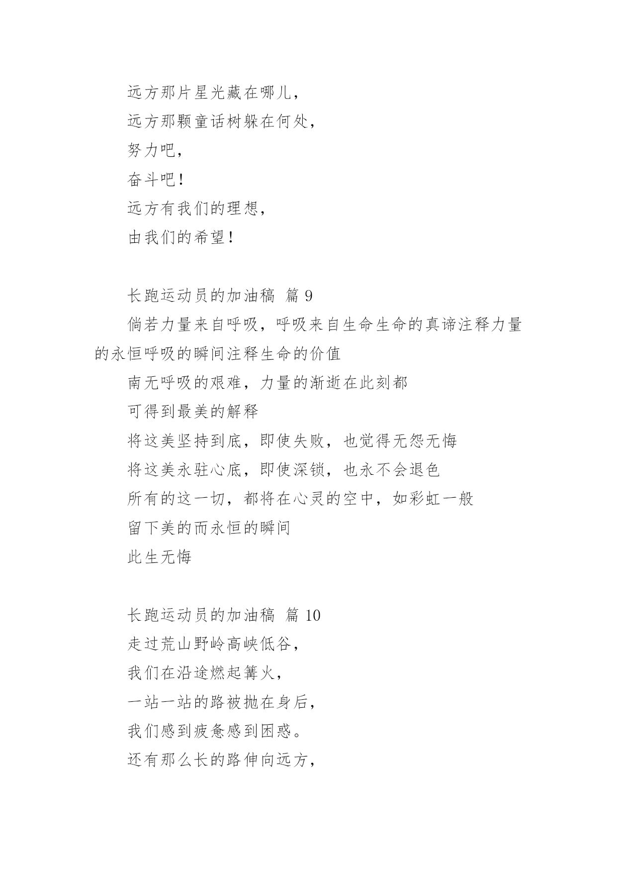 长跑运动员的加油稿长跑运动员的加油稿(精选10篇)在现在的社会生活中,越来越多人会去使用加油稿,加油稿有着正向的鼓动作用。写起加油稿来就毫无头绪?以下是小编帮大家整理的长跑运动员的加油稿,欢迎阅读,希望大家能够喜欢。长跑运动员的加油稿篇1漫长的道路依旧漫长,是猎人哪怕草莽荆棘虎豹豺狼;是水手怎恐激流漩涡惊涛骇浪;是战士不具枪林弹雨滚滚硝烟;是强者无畏艰难困苦失败挫折。只要不断的攀登,就能领略无限的风光;只要不停的追求,就能捉到天边的海风。抖擞疲惫的精神,让永不服输的心,在阳光雨露中尽情的激荡。挺直结实的腰杆,高昂不屈的头颅,拭去吧,额头的汗水;挥去吧,天边的阴云。微笑着跑步,生活中的强者,你终将迎来胜利和春光!长跑运动员的加油稿篇2人类的力量在那一刹那展现,拼搏在那一瞬间化为生命的起点,在那一刻万物化为虚有,只知道,胜利并不遥远。抬起头往往前面,终点线已依稀可见。无数个日日夜夜的辛劳,将在近日兑现。洒一把艰辛的汗水,继续抬起疲倦的脚步,爆发的一吼气贯长虹,继续向前,不论成功与否,你已曾经拥有。曾记否,在终点欢呼,震惊四周。长跑运动员的加油稿篇3在那一瞬间,你们像离了弦的箭似流星,如闪电。运动场上你们最坚韧,不懈地追求,无悔地跑运动场上你们最风采,你追我赶到终点随着一阵热烈的掌声,比赛胜负已分出。胜者继续加油,败者不要气馁互取长补短,相信你们都会收获,加油吧!长跑运动员的加油稿篇4也许你心里忐忑不安,我们的心里早已热血沸腾。昔日,长长的跑道上,留下了你深深的足迹。抹不去你渗出的汗水,拉不动你沉重的双脚。你为了班级,不在乎自己疲惫,不在乎泪水和汗水,因为你心里有一种坚定的信念。为了班级,我能行。致长跑运动员加油稿五:磨炼的是非凡的毅力,较量的是超常的体力,拼搏的是出类拔萃的耐力.把长长的跑道跑成一段漫漫的征途,听!呼啸的风在为你喝彩,看!猎猎的彩旗在为你加油,加油吧!为了到达终点时那一刻的辉煌!长跑运动员的加油稿篇5倘若力量来自呼吸,呼吸来自生命,生命的真谛注释力量的永恒,呼吸的瞬间注释生命的价值,南无呼吸的艰难,力量的渐逝在此刻都可得到最美的解释,将这美坚持到底,即使失败,也觉得无怨无悔。将这美永驻心底,即使深锁,也永不会退色,所有的这一切,都将在心灵的空中,如彩虹一般,留下美的而永恒的瞬间,此生无悔、人类的力量在那一刹那展现,拼搏在那一瞬间化为生命的起点,在那一须臾万物化为虚有,只知道,胜利并不遥远,抬起头望望前面,终点线已依稀可见,无数个日日夜夜的辛劳,将在今日兑现。洒一把艰辛的汗水,继续抬起疲倦的脚步,爆发的一吼气贯长虹,继续向前,不论成功与否,你已曾经拥有,曾记否,在终点欢呼,震惊四周。深深的呼吸,等待你的是艰难的1500米。相信胜利会属于你们。但在这征途上,需要你勇敢的心去面对。我们在为你加油,你是否听到了我们发自心中的呐喊?困难和胜利都在向你招手,去呀,快去呀,不要犹豫。快去击败困难、快去夺取胜利!相信你会送给我们一个汗水浸湿的微笑!长跑运动员的加油稿篇6是种子就该有绿色的希望,是种子就该有金色的梦想,不要躺在封闭的暖房,怕什么秋日薄薄的风霜,既然已走上了运动场,心里就不要多想,跑道已洒满阳光,不要羞涩、不要紧张,听秋雁在空中为你歌唱,快去拾取片片金黄,充满信心,就有希望。一滴滴汗水,飘洒在绿茵场上,伴随着矫健的步伐,奏出希望的乐章。一种种信念,放在蔚蓝的天空,伴随着你那深沉的眼光,画出美丽的弧线。人生能有几回搏?千百双眼睛注视着你,为了希望、为了胜利,跑出青春的梦想。磨炼的是非凡的毅力,较量的是超常的体力,拼搏的是出类拔萃的耐力。把长长的跑道跑成一段漫漫的征途,听!呼啸的风在为你喝彩,看!猎猎的彩旗在为你加油,加油吧!为了到达终点时那一刻的辉煌!长跑运动员的加油稿篇7我知道这是意志的.考验,长长的跑道上,留下长长的坚持。我知道这是耐力的考验,每一步的前进,充满执著和坚定。我知道你是今天的明星,我衷心为你祝福!为你喝彩!望着你赛场上愈渐沉重的步伐,曾用来鼓励你的豪言壮语,此刻变得那么脆弱无力。于是我选择了沉默,在心底默默为你祝福。对于同类不敢挑战的极限,为何你要攀登,义无反顾,明知这条路走的艰辛,为何你要执著?或许你是将勇气放上天平,另一边将托起整个大地,你可知道?你的无悔已载着你,抵达一座座典雅的里程碑,上面刻着青春的注释。也许你心里忐忑不安,我们的心里早已热血沸腾。昔日,长长的跑道上,留下了你深深的足迹。抹不去你渗出的汗水,拉不动你沉重的双脚。你为了班级,不在乎自己疲惫,不在乎泪水和汗水,因为你心里有一种坚定的信念。为了班级,我能行。长跑运动员的加油稿篇8你是运动场的心脏,跳动梦想;你是漫长路的精神,激励辉煌;你们是将上下求索的人!风为你加油,云为你助兴,坚定,执着,耐力与希望,在延伸的白色跑道中点点凝聚!力