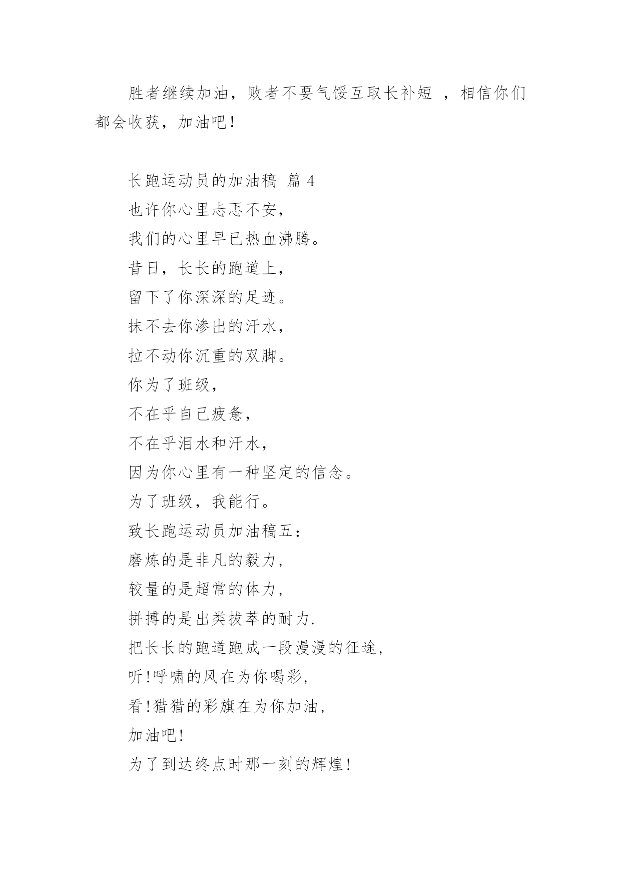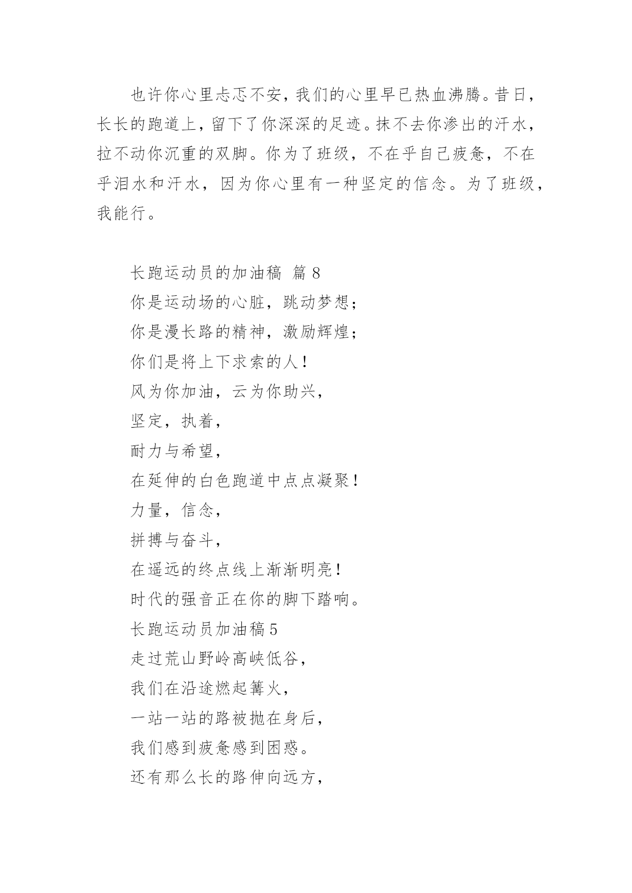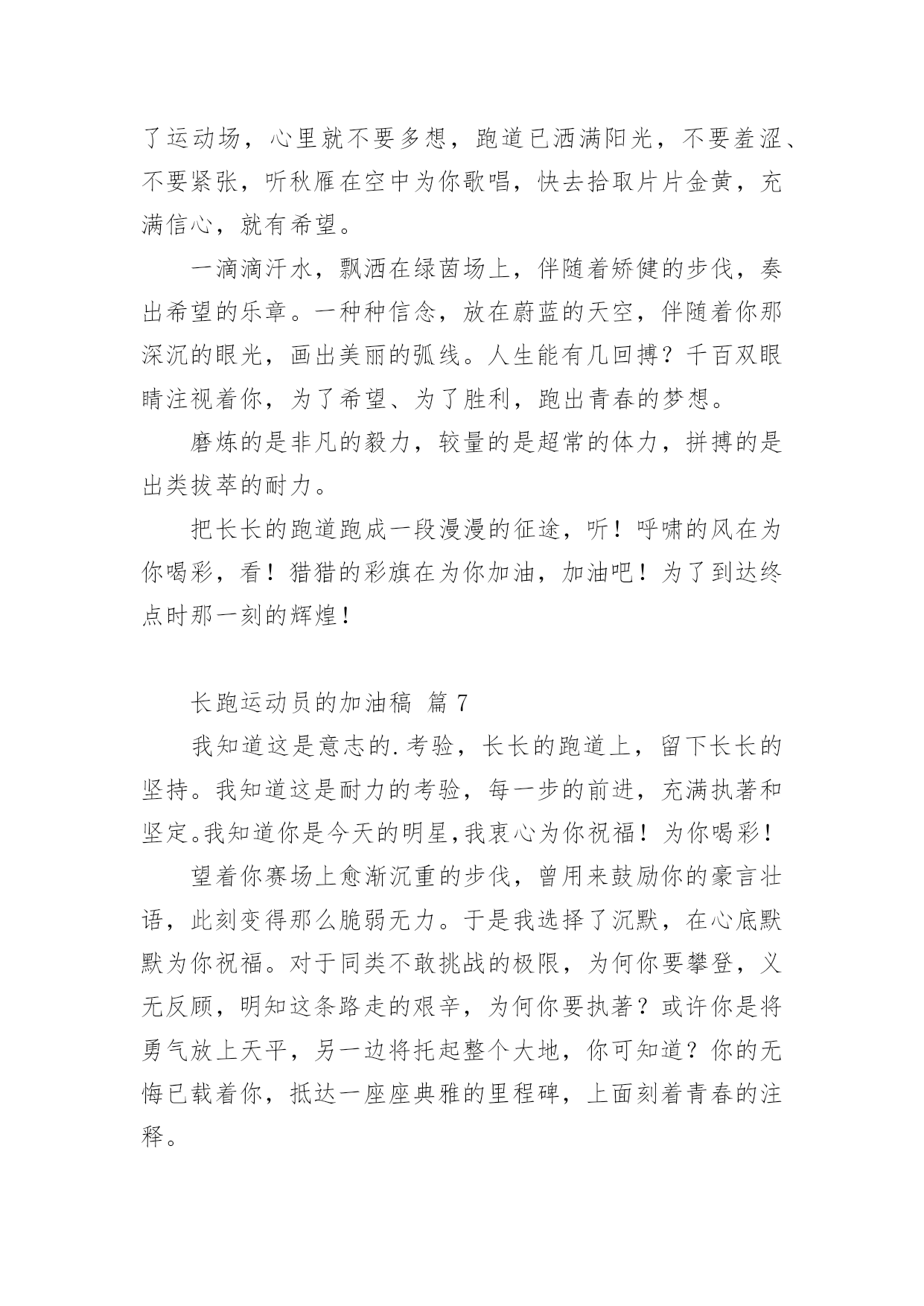 长跑运动员的加油稿长跑运动员的加油稿(精选10篇)在现在的社会生活中,越来越多人会去使用加油稿,加油稿有着正向的鼓动作用。写起加油稿来就毫无头绪?以下是小编帮大家整理的长跑运动员的加油稿,欢迎阅读,希望大家能够喜欢。长跑运动员的加油稿篇1漫长的道路依旧漫长,是猎人哪怕草莽荆棘虎豹豺狼;是水手怎恐激流漩涡惊涛骇浪;是战士不具枪林弹雨滚滚硝烟;是强者无畏艰难困苦失败挫折。只要不断的攀登,就能领略无限的风光;只要不停的追求,就能捉到天边的海风。抖擞疲惫的精神,让永不服输的心,在阳光雨露中尽情的激荡。挺直结实的腰杆,高昂不屈的头颅,拭去吧,额头的汗水;挥去吧,天边的阴云。微笑着跑步,生活中的强者,你终将迎来胜利和春光!长跑运动员的加油稿篇2人类的力量在那一刹那展现,拼搏在那一瞬间化为生命的起点,在那一刻万物化为虚有,只知道,胜利并不遥远。抬起头往往前面,终点线已依稀可见。无数个日日夜夜的辛劳,将在近日兑现。洒一把艰辛的汗水,继续抬起疲倦的脚步,爆发的一吼气贯长虹,继续向前,不论成功与否,你已曾经拥有。曾记否,在终点欢呼,震惊四周。长跑运动员的加油稿篇3在那一瞬间,你们像离了弦的箭似流星,如闪电。运动场上你们最坚韧,不懈地追求,无悔地跑运动场上你们最风采,你追我赶到终点随着一阵热烈的掌声,比赛胜负已分出。胜者继续加油,败者不要气馁互取长补短,相信你们都会收获,加油吧!长跑运动员的加油稿篇4也许你心里忐忑不安,我们的心里早已热血沸腾。昔日,长长的跑道上,留下了你深深的足迹。抹不去你渗出的汗水,拉不动你沉重的双脚。你为了班级,不在乎自己疲惫,不在乎泪水和汗水,因为你心里有一种坚定的信念。为了班级,我能行。致长跑运动员加油稿五:磨炼的是非凡的毅力,较量的是超常的体力,拼搏的是出类拔萃的耐力.把长长的跑道跑成一段漫漫的征途,听!呼啸的风在为你喝彩,看!猎猎的彩旗在为你加油,加油吧!为了到达终点时那一刻的辉煌!长跑运动员的加油稿篇5倘若力量来自呼吸,呼吸来自生命,生命的真谛注释力量的永恒,呼吸的瞬间注释生命的价值,南无呼吸的艰难,力量的渐逝在此刻都可得到最美的解释,将这美坚持到底,即使失败,也觉得无怨无悔。将这美永驻心底,即使深锁,也永不会退色,所有的这一切,都将在心灵的空中,如彩虹一般,留下美的而永恒的瞬间,此生无悔、人类的力量在那一刹那展现,拼搏在那一瞬间化为生命的起点,在那一须臾万物化为虚有,只知道,胜利并不遥远,抬起头望望前面,终点线已依稀可见,无数个日日夜夜的辛劳,将在今日兑现。洒一把艰辛的汗水,继续抬起疲倦的脚步,爆发的一吼气贯长虹,继续向前,不论成功与否,你已曾经拥有,曾记否,在终点欢呼,震惊四周。深深的呼吸,等待你的是艰难的1500米。相信胜利会属于你们。但在这征途上,需要你勇敢的心去面对。我们在为你加油,你是否听到了我们发自心中的呐喊?困难和胜利都在向你招手,去呀,快去呀,不要犹豫。快去击败困难、快去夺取胜利!相信你会送给我们一个汗水浸湿的微笑!长跑运动员的加油稿篇6是种子就该有绿色的希望,是种子就该有金色的梦想,不要躺在封闭的暖房,怕什么秋日薄薄的风霜,既然已走上了运动场,心里就不要多想,跑道已洒满阳光,不要羞涩、不要紧张,听秋雁在空中为你歌唱,快去拾取片片金黄,充满信心,就有希望。一滴滴汗水,飘洒在绿茵场上,伴随着矫健的步伐,奏出希望的乐章。一种种信念,放在蔚蓝的天空,伴随着你那深沉的眼光,画出美丽的弧线。人生能有几回搏?千百双眼睛注视着你,为了希望、为了胜利,跑出青春的梦想。磨炼的是非凡的毅力,较量的是超常的体力,拼搏的是出类拔萃的耐力。把长长的跑道跑成一段漫漫的征途,听!呼啸的风在为你喝彩,看!猎猎的彩旗在为你加油,加油吧!为了到达终点时那一刻的辉煌!长跑运动员的加油稿篇7我知道这是意志的.考验,长长的跑道上,留下长长的坚持。我知道这是耐力的考验,每一步的前进,充满执著和坚定。我知道你是今天的明星,我衷心为你祝福!为你喝彩!望着你赛场上愈渐沉重的步伐,曾用来鼓励你的豪言壮语,此刻变得那么脆弱无力。于是我选择了沉默,在心底默默为你祝福。对于同类不敢挑战的极限,为何你要攀登,义无反顾,明知这条路走的艰辛,为何你要执著?或许你是将勇气放上天平,另一边将托起整个大地,你可知道?你的无悔已载着你,抵达一座座典雅的里程碑,上面刻着青春的注释。也许你心里忐忑不安,我们的心里早已热血沸腾。昔日,长长的跑道上,留下了你深深的足迹。抹不去你渗出的汗水,拉不动你沉重的双脚。你为了班级,不在乎自己疲惫,不在乎泪水和汗水,因为你心里有一种坚定的信念。为了班级,我能行。长跑运动员的加油稿篇8你是运动场的心脏,跳动梦想;你是漫长路的精神,激励辉煌;你们是将上下求索的人!风为你加油,云为你助兴,坚定,执着,耐力与希望,在延伸的白色跑道中点点凝聚!力