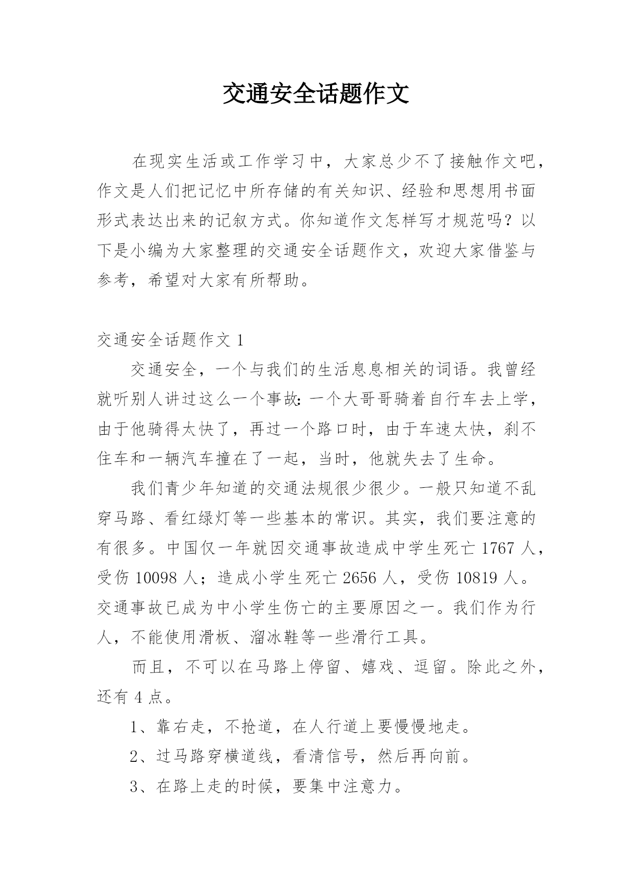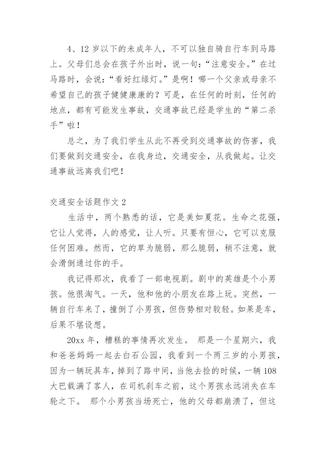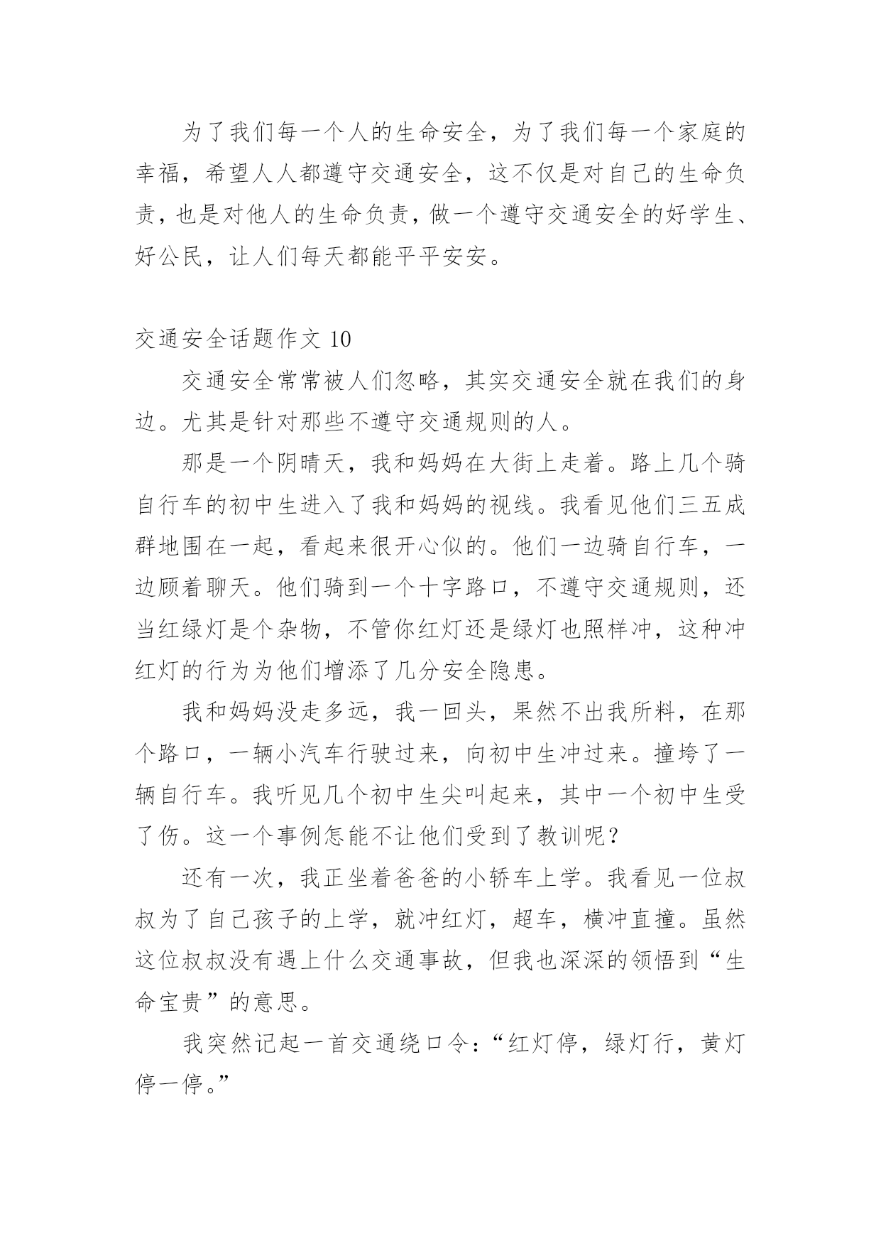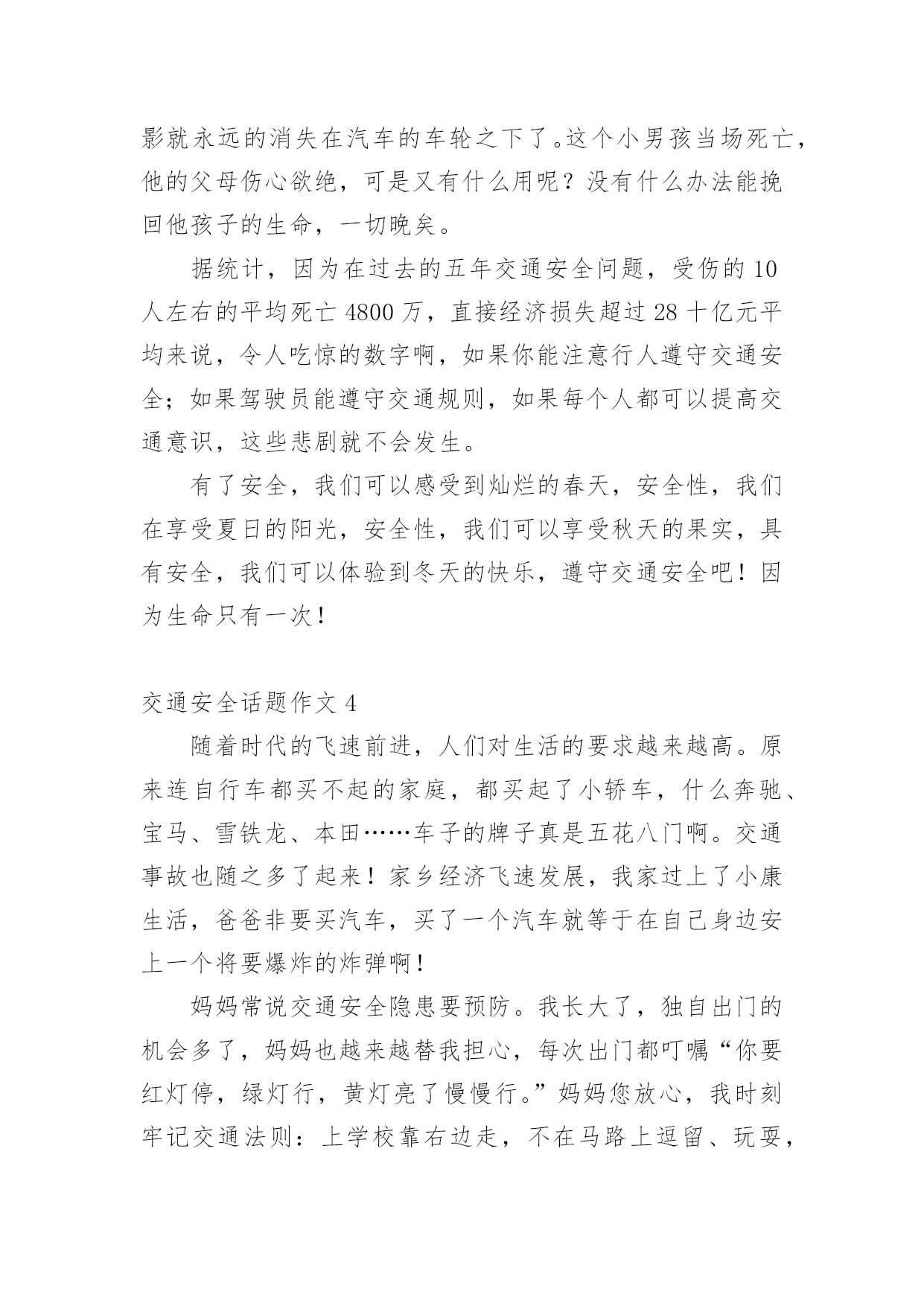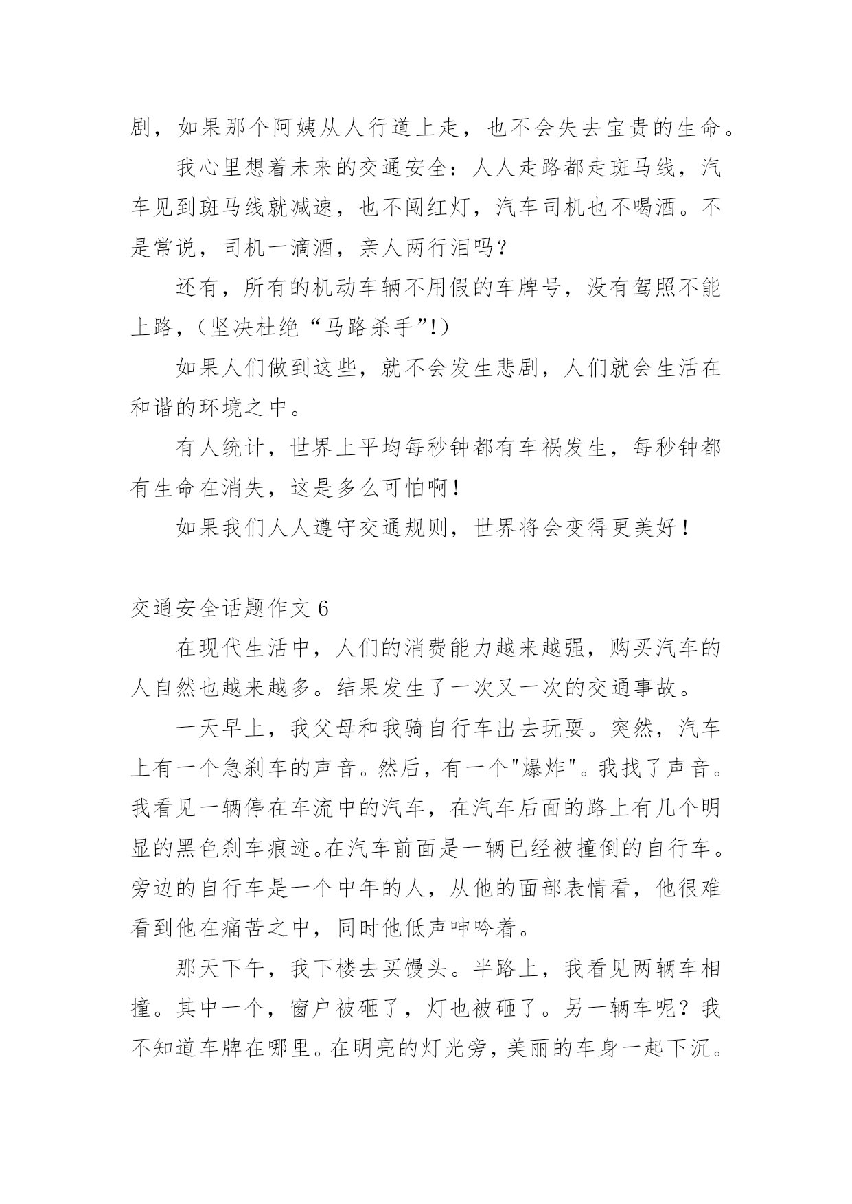 交通安全话题作文在现实生活或工作学习中,大家总少不了接触作文吧,作文是人们把记忆中所存储的有关知识、经验和思想用书面形式表达出来的记叙方式。你知道作文怎样写才规范吗?以下是小编为大家整理的交通安全话题作文,欢迎大家借鉴与参考,希望对大家有所帮助。交通安全话题作文1交通安全,一个与我们的生活息息相关的词语。我曾经就听别人讲过这么一个事故:一个大哥哥骑着自行车去上学,由于他骑得太快了,再过一个路口时,由于车速太快,刹不住车和一辆汽车撞在了一起,当时,他就失去了生命。我们青少年知道的交通法规很少很少。一般只知道不乱穿马路、看红绿灯等一些基本的常识。其实,我们要注意的有很多。中国仅一年就因交通事故造成中学生死亡1767人,受伤10098人;造成小学生死亡2656人,受伤10819人。交通事故已成为中小学生伤亡的主要原因之一。我们作为行人,不能使用滑板、溜冰鞋等一些滑行工具。而且,不可以在马路上停留、嬉戏、逗留。除此之外,还有4点。1、靠右走,不抢道,在人行道上要慢慢地走。2、过马路穿横道线,看清信号,然后再向前。3、在路上走的时候,要集中注意力。4、12岁以下的未成年人,不可以独自骑自行车到马路上。父母们总会在孩子外出时,说一句:“注意安全。”在过马路时,会说:“看好红绿灯。”是啊!哪一个父亲或母亲不希望自己的孩子健健康康的?可是,在任何的时刻,任何的地点,都有可能发生事故,交通事故已经是学生的“第二杀手”啦!总之,为了我们学生从此不再受到交通事故的伤害,我们要做到交通安全,在我身边,交通安全,从我做起。让交通事故远离我们吧!交通安全话题作文2生活中,两个熟悉的话,它是美如夏花。生命之花强,它让人觉得,人的感觉,让人听。只要有恒心,它可以克服任何困难。然而,它的草为脆弱,那么脆弱,稍不注意,就会滑倒通过你的手。我记得那次,我看了一部电视剧。剧中的英雄是个小男孩。他很淘气。一天,他和他的小朋友在路上玩。突然,一辆自行车来了,撞倒了小男孩,但伤势相对较轻。如果是车,后果不堪设想。20xx年,糟糕的事情再次发生。那是一个星期六,我和爸爸妈妈一起去白石公园,我看到一个两三岁的小男孩,因为一辆玩具车,掉到了路中间,当他去捡的时候,一辆108大巴载满了客人,在司机刹车之前,这个男孩永远消失在车轮之下。那个小男孩当场死亡,他的父母都崩溃了,但这有什么用呢?没有办法挽救他孩子的生命。太晚了。据统计,由于交通安全问题,过去五年全国平均每年约有十万人死亡,直接经济损失四千八百多万人,直接经济损失超过二十八亿人,数量惊人,如果司机能遵守交通安全,司机能遵守交通规则,如果每个人都能增强交通意识,就不会发生。有了安全,我们可以感受春光的灿烂,有了安全,我们享受夏日的阳光,有了安全,我们可以品尝秋天的果实,有了安全,我们可以体验冬天的快乐,遵守交通安全吧!因为生命只有一次!交通安全话题作文3生活中,两个熟悉的话,它是美如夏花。生命之花强,它让人觉得,人的感觉,让人听。只要有恒心,它可以克服任何困难。然而,这是草的脆弱,那么脆弱,稍不注意,就会滑倒通过你的手。我记得那次,我看了一部电视剧。剧中的英雄是个小男孩。他很淘气。一天,他和他的小朋友在路上玩。突然,一辆自行车来了,撞倒了小男孩,但伤势相对较轻。如果是车,后果不堪设想。20xx年,不幸的事情再次发生。那是一个星期六,我和爸爸、妈妈一去白石公园,我看见一个两三岁的小男孩因为一个玩具小汽车掉到了马路中间,他去捡时,一辆载满了客人的108路汽车疾驰而来,司机还来不及刹车,小男孩的身影就永远的消失在汽车的车轮之下了。这个小男孩当场死亡,他的父母伤心欲绝,可是又有什么用呢?没有什么办法能挽回他孩子的生命,一切晚矣。据统计,因为在过去的五年交通安全问题,受伤的10人左右的平均死亡4800万,直接经济损失超过28十亿元平均来说,令人吃惊的数字啊,如果你能注意行人遵守交通安全;如果驾驶员能遵守交通规则,如果每个人都可以提高交通意识,这些悲剧就不会发生。有了安全,我们可以感受到灿烂的春天,安全性,我们在享受夏日的阳光,安全性,我们可以享受秋天的果实,具有安全,我们可以体验到冬天的快乐,遵守交通安全吧!因为生命只有一次!交通安全话题作文4随着时代的飞速前进,人们对生活的要求越来越高。原来连自行车都买不起的家庭,都买起了小轿车,什么奔驰、宝马、雪铁龙、本田……车子的牌子真是五花八门啊。交通事故也随之多了起来!家乡经济飞速发展,我家过上了小康生活,爸爸非要买汽车,买了一个汽车就等于在自己身边安上一个将要爆炸的炸弹啊!妈妈常说交通安全隐患要预防。我长大了,独自出门的机会多了,妈妈也越来越替我担心,每次出门都叮嘱“你要红灯停,绿灯行,黄灯亮了慢慢行。”妈妈您放心,我时刻牢记交通法则:上学校靠右边走,不在马路上逗留、玩耍,看见车子及时