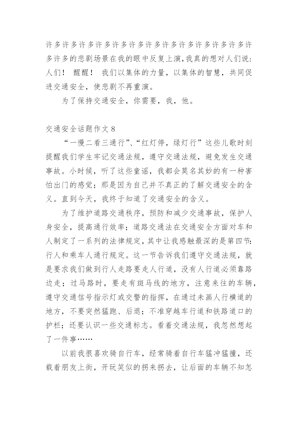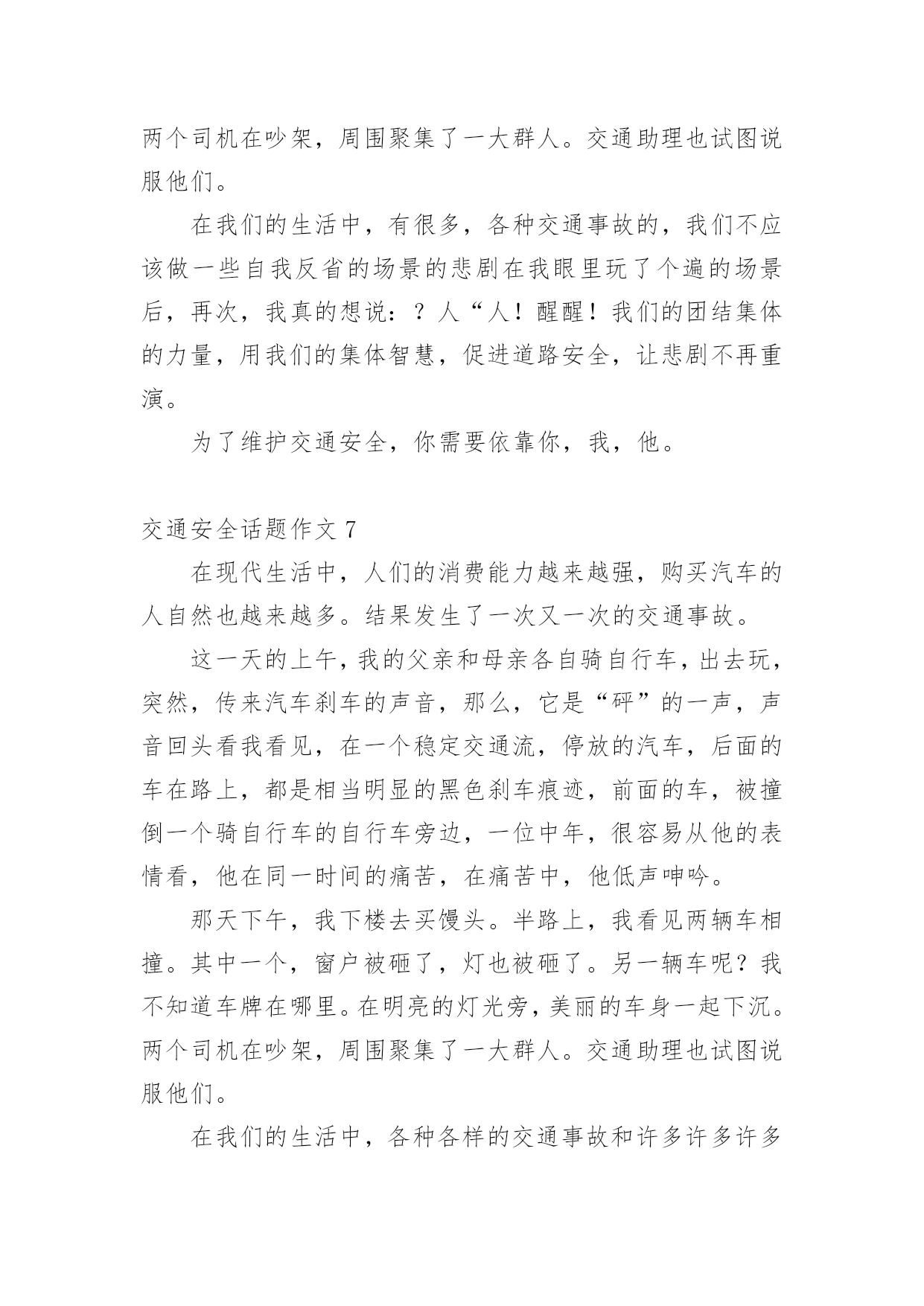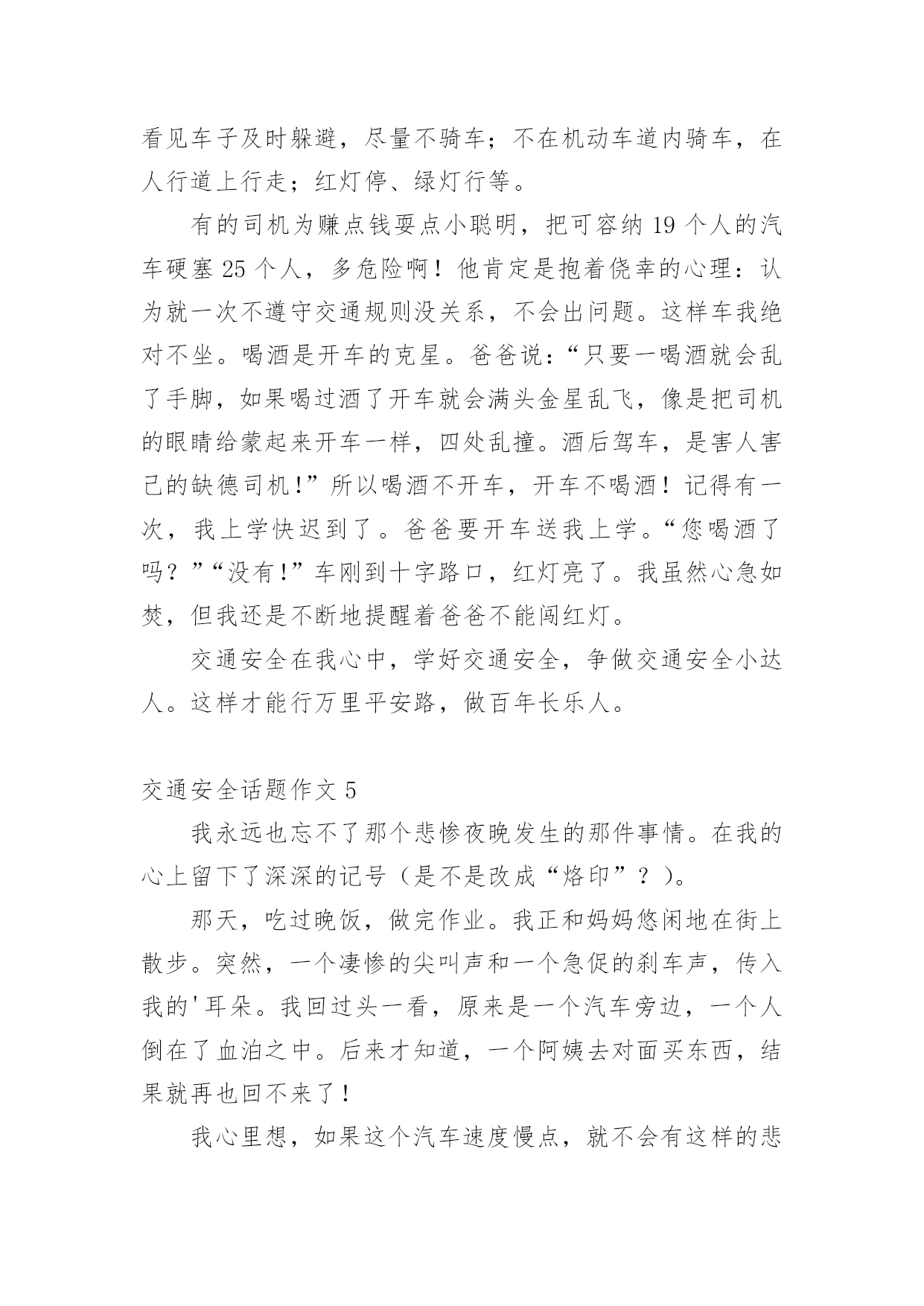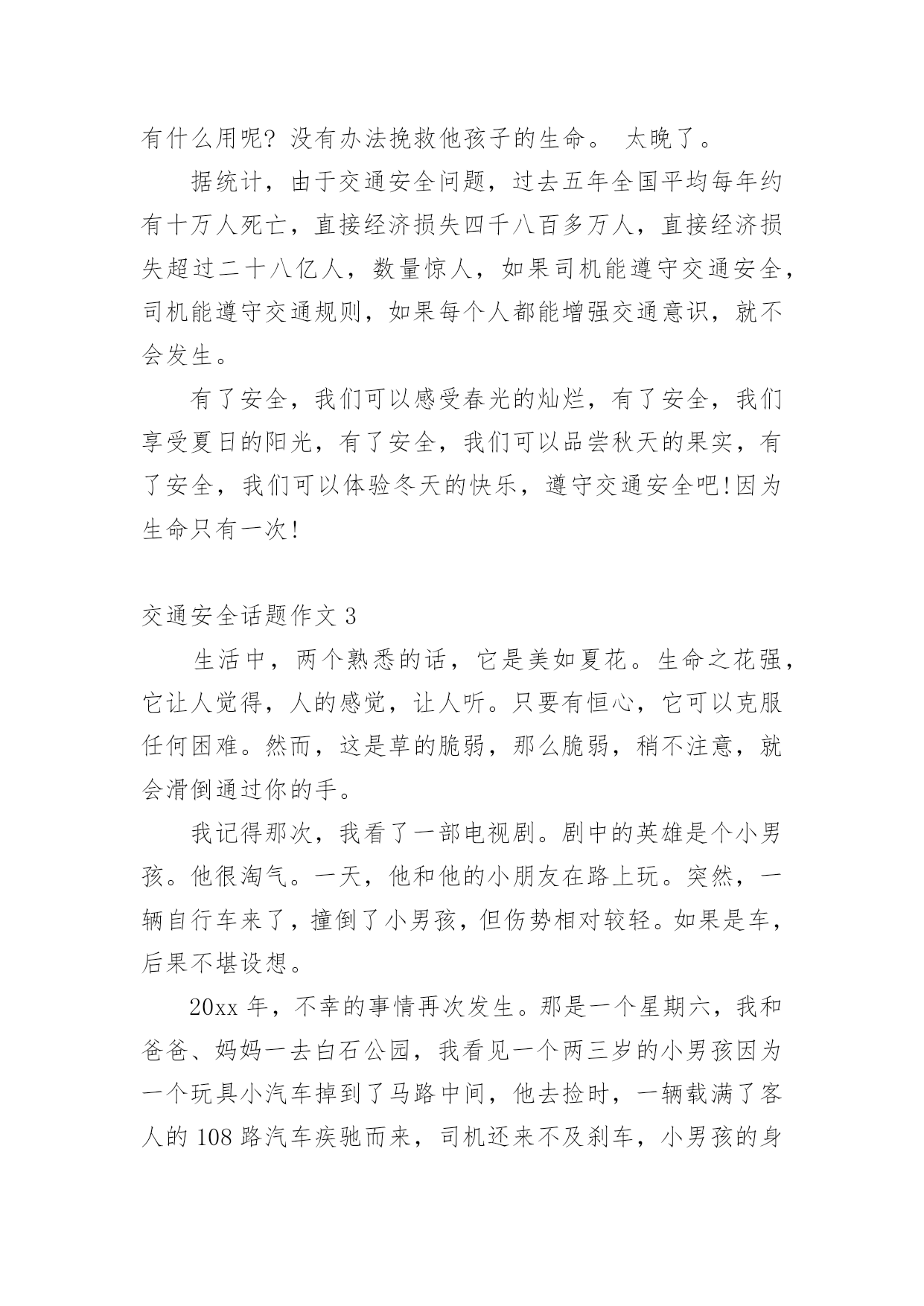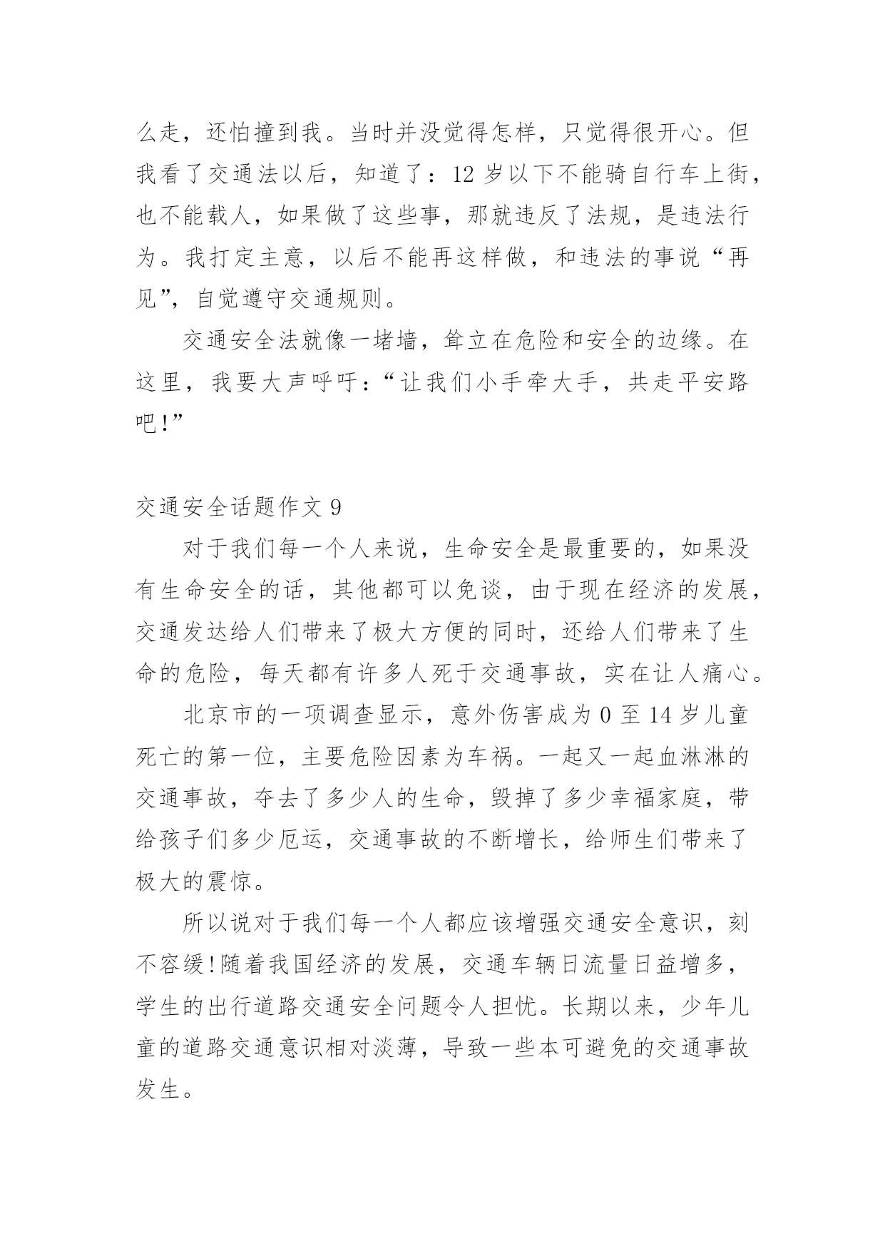 交通安全话题作文在现实生活或工作学习中,大家总少不了接触作文吧,作文是人们把记忆中所存储的有关知识、经验和思想用书面形式表达出来的记叙方式。你知道作文怎样写才规范吗?以下是小编为大家整理的交通安全话题作文,欢迎大家借鉴与参考,希望对大家有所帮助。交通安全话题作文1交通安全,一个与我们的生活息息相关的词语。我曾经就听别人讲过这么一个事故:一个大哥哥骑着自行车去上学,由于他骑得太快了,再过一个路口时,由于车速太快,刹不住车和一辆汽车撞在了一起,当时,他就失去了生命。我们青少年知道的交通法规很少很少。一般只知道不乱穿马路、看红绿灯等一些基本的常识。其实,我们要注意的有很多。中国仅一年就因交通事故造成中学生死亡1767人,受伤10098人;造成小学生死亡2656人,受伤10819人。交通事故已成为中小学生伤亡的主要原因之一。我们作为行人,不能使用滑板、溜冰鞋等一些滑行工具。而且,不可以在马路上停留、嬉戏、逗留。除此之外,还有4点。1、靠右走,不抢道,在人行道上要慢慢地走。2、过马路穿横道线,看清信号,然后再向前。3、在路上走的时候,要集中注意力。4、12岁以下的未成年人,不可以独自骑自行车到马路上。父母们总会在孩子外出时,说一句:“注意安全。”在过马路时,会说:“看好红绿灯。”是啊!哪一个父亲或母亲不希望自己的孩子健健康康的?可是,在任何的时刻,任何的地点,都有可能发生事故,交通事故已经是学生的“第二杀手”啦!总之,为了我们学生从此不再受到交通事故的伤害,我们要做到交通安全,在我身边,交通安全,从我做起。让交通事故远离我们吧!交通安全话题作文2生活中,两个熟悉的话,它是美如夏花。生命之花强,它让人觉得,人的感觉,让人听。只要有恒心,它可以克服任何困难。然而,它的草为脆弱,那么脆弱,稍不注意,就会滑倒通过你的手。我记得那次,我看了一部电视剧。剧中的英雄是个小男孩。他很淘气。一天,他和他的小朋友在路上玩。突然,一辆自行车来了,撞倒了小男孩,但伤势相对较轻。如果是车,后果不堪设想。20xx年,糟糕的事情再次发生。那是一个星期六,我和爸爸妈妈一起去白石公园,我看到一个两三岁的小男孩,因为一辆玩具车,掉到了路中间,当他去捡的时候,一辆108大巴载满了客人,在司机刹车之前,这个男孩永远消失在车轮之下。那个小男孩当场死亡,他的父母都崩溃了,但这有什么用呢?没有办法挽救他孩子的生命。太晚了。据统计,由于交通安全问题,过去五年全国平均每年约有十万人死亡,直接经济损失四千八百多万人,直接经济损失超过二十八亿人,数量惊人,如果司机能遵守交通安全,司机能遵守交通规则,如果每个人都能增强交通意识,就不会发生。有了安全,我们可以感受春光的灿烂,有了安全,我们享受夏日的阳光,有了安全,我们可以品尝秋天的果实,有了安全,我们可以体验冬天的快乐,遵守交通安全吧!因为生命只有一次!交通安全话题作文3生活中,两个熟悉的话,它是美如夏花。生命之花强,它让人觉得,人的感觉,让人听。只要有恒心,它可以克服任何困难。然而,这是草的脆弱,那么脆弱,稍不注意,就会滑倒通过你的手。我记得那次,我看了一部电视剧。剧中的英雄是个小男孩。他很淘气。一天,他和他的小朋友在路上玩。突然,一辆自行车来了,撞倒了小男孩,但伤势相对较轻。如果是车,后果不堪设想。20xx年,不幸的事情再次发生。那是一个星期六,我和爸爸、妈妈一去白石公园,我看见一个两三岁的小男孩因为一个玩具小汽车掉到了马路中间,他去捡时,一辆载满了客人的108路汽车疾驰而来,司机还来不及刹车,小男孩的身影就永远的消失在汽车的车轮之下了。这个小男孩当场死亡,他的父母伤心欲绝,可是又有什么用呢?没有什么办法能挽回他孩子的生命,一切晚矣。据统计,因为在过去的五年交通安全问题,受伤的10人左右的平均死亡4800万,直接经济损失超过28十亿元平均来说,令人吃惊的数字啊,如果你能注意行人遵守交通安全;如果驾驶员能遵守交通规则,如果每个人都可以提高交通意识,这些悲剧就不会发生。有了安全,我们可以感受到灿烂的春天,安全性,我们在享受夏日的阳光,安全性,我们可以享受秋天的果实,具有安全,我们可以体验到冬天的快乐,遵守交通安全吧!因为生命只有一次!交通安全话题作文4随着时代的飞速前进,人们对生活的要求越来越高。原来连自行车都买不起的家庭,都买起了小轿车,什么奔驰、宝马、雪铁龙、本田……车子的牌子真是五花八门啊。交通事故也随之多了起来!家乡经济飞速发展,我家过上了小康生活,爸爸非要买汽车,买了一个汽车就等于在自己身边安上一个将要爆炸的炸弹啊!妈妈常说交通安全隐患要预防。我长大了,独自出门的机会多了,妈妈也越来越替我担心,每次出门都叮嘱“你要红灯停,绿灯行,黄灯亮了慢慢行。”妈妈您放心,我时刻牢记交通法则:上学校靠右边走,不在马路上逗留、玩耍,看见车子及时