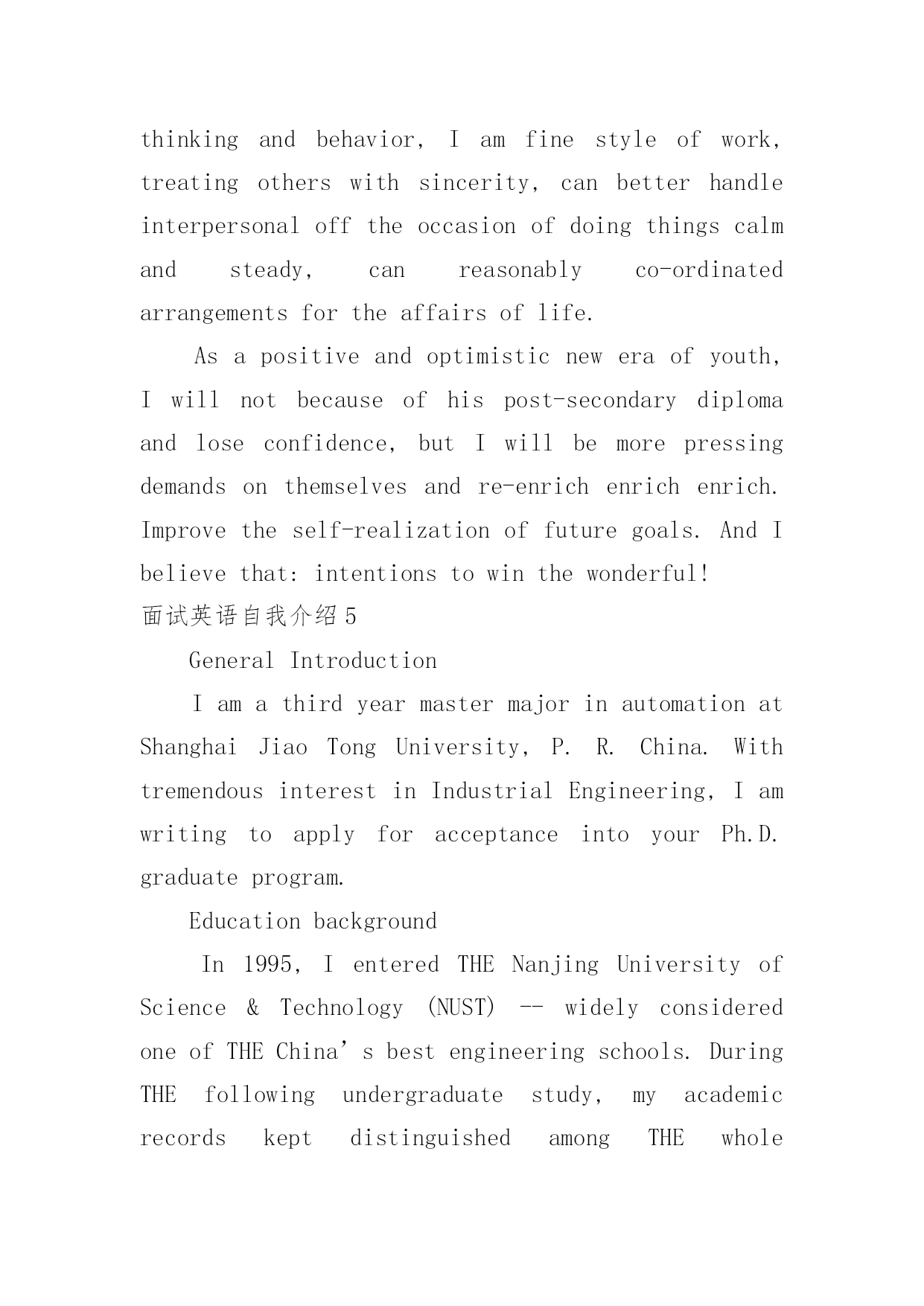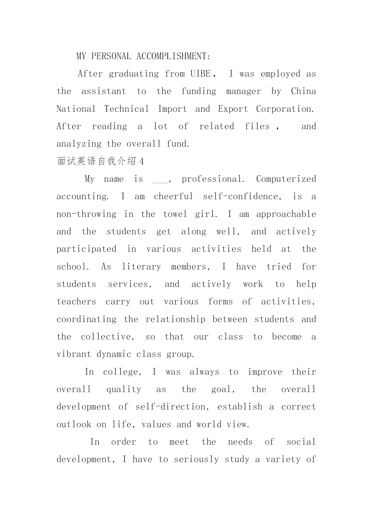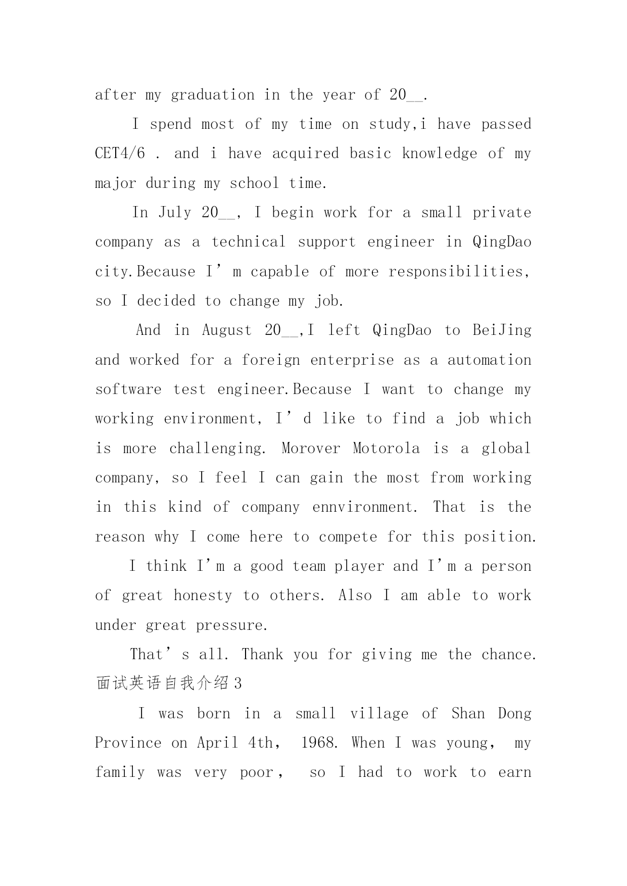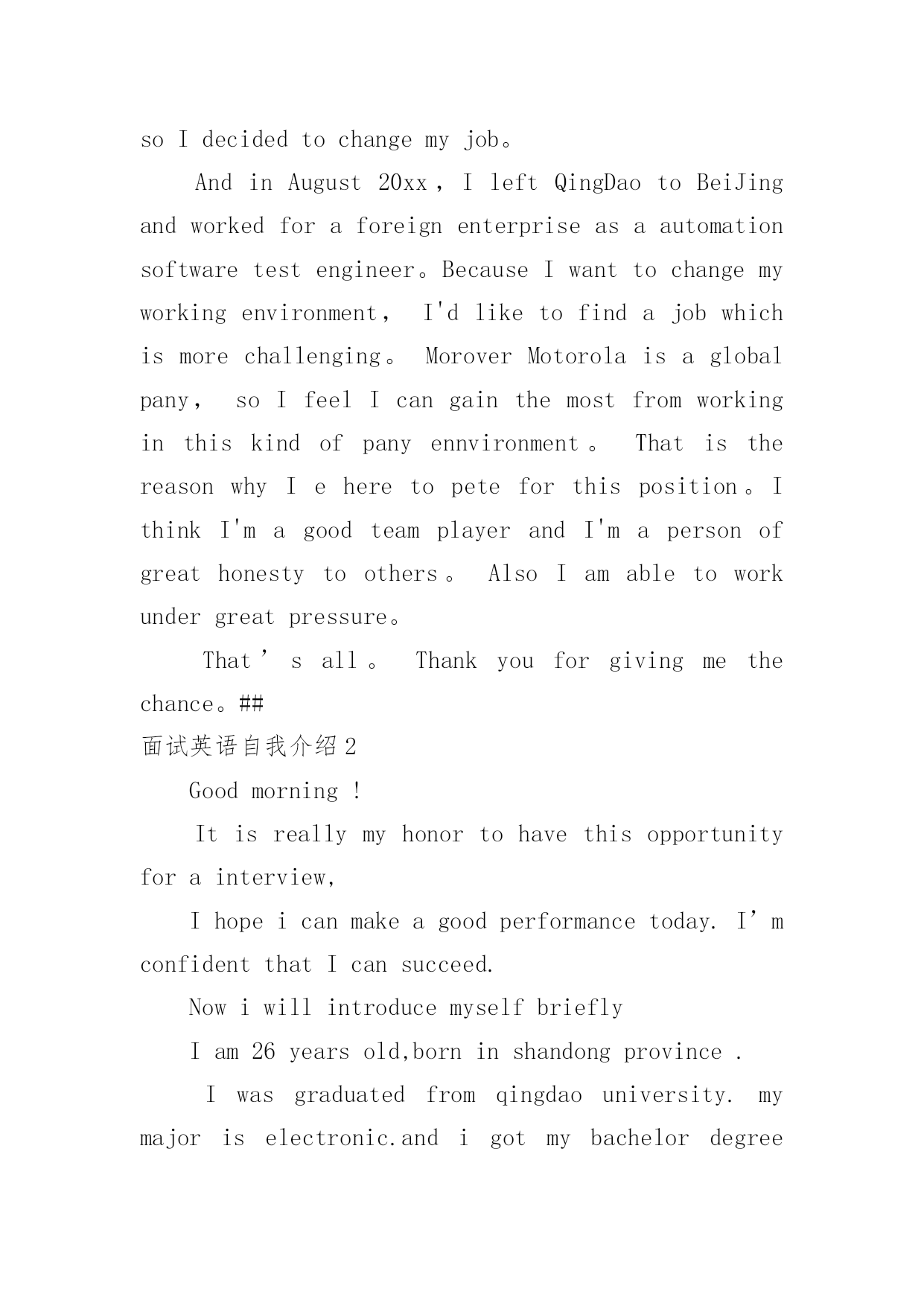 面试英语自我介绍【热门】面试英语自我介绍5篇当去到一个新环境下,时常需要我们进行一个自我介绍,自我介绍可以拉近我们与陌生人的关系。到底应如何写自我介绍呢?下面是小编帮大家整理的面试英语自我介绍,仅供参考,希望能够帮助到大家。面试英语自我介绍1Goodmorning!Itisreallymyhonortohavethisopportunityforainterview,IhopeIcanmakeagoodperformancetoday。I'mconfidentthatIcansucceed。NowIwillintroducemyselfbriefly。Iam26yearsold,borninshandongprovince。Iwasgraduatedfromqingdaouniversity。mymajoriselectronic。andIgotmybachelordegreeaftermygraduationintheyearof20xx。Ispendmostofmytimeonstudy,ihavepassedCET4/6。andIhaveacquiredbasicknowledgeofmymajorduringmyschooltime。InJuly20xx,IbeginworkforasmallprivatepanyasatechnicalsupportengineerinQingDaocity。BecauseI'mcapableofmoreresponsibilities,soIdecidedtochangemyjob。AndinAugust20xx,IleftQingDaotoBeiJingandworkedforaforeignenterpriseasaautomationsoftwaretestengineer。BecauseIwanttochangemyworkingenvironment,I'dliketofindajobwhichismorechallenging。MoroverMotorolaisaglobalpany,soIfeelIcangainthemostfromworkinginthiskindofpanyennvironment。ThatisthereasonwhyIeheretopeteforthisposition。IthinkI'magoodteamplayerandI'mapersonofgreathonestytoothers。AlsoIamabletoworkundergreatpressure。That’sall。Thankyouforgivingmethechance。##面试英语自我介绍2Goodmorning!Itisreallymyhonortohavethisopportunityforainterview,Ihopeicanmakeagoodperformancetoday.I’mconfidentthatIcansucceed.NowiwillintroducemyselfbrieflyIam26yearsold,borninshandongprovince.Iwasgraduatedfromqingdaouniversity.mymajoriselectronic.andigotmybachelordegreeaftermygraduationintheyearof20__.Ispendmostofmytimeonstudy,ihavepassedCET4/6.andihaveacquiredbasicknowledgeofmymajorduringmyschooltime.InJuly20__,IbeginworkforasmallprivatecompanyasatechnicalsupportengineerinQingDaocity.BecauseI’mcapableofmoreresponsibilities,soIdecidedtochangemyjob.AndinAugust20__,IleftQingDaotoBeiJingandworkedforaforeignenterpriseasaautomationsoftwaretestengineer.BecauseIwanttochangemyworkingenvironment,I’dliketofindajobwhichismorechallenging.MoroverMotorolaisaglobalcompany,soIfeelIcangainthemostfromworkinginthiskindofcompanyennvironment.ThatisthereasonwhyIcome