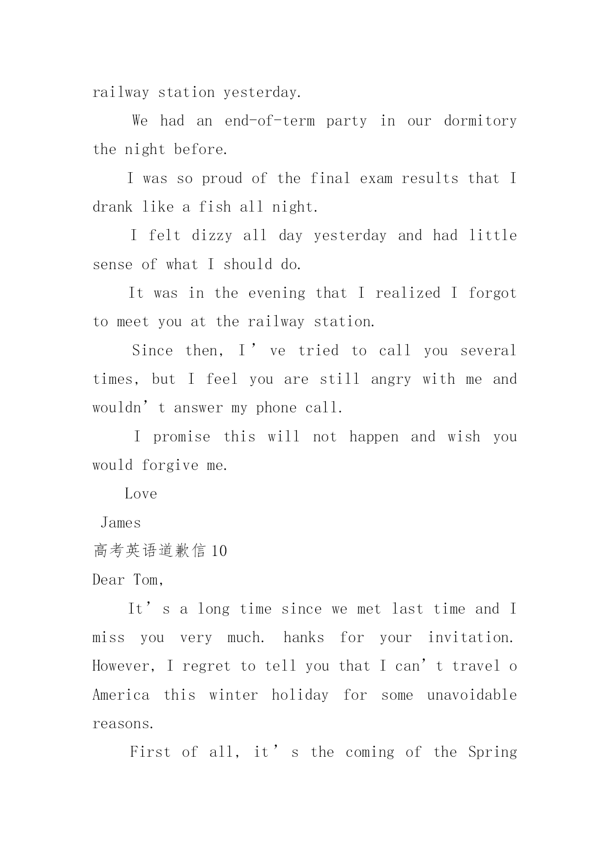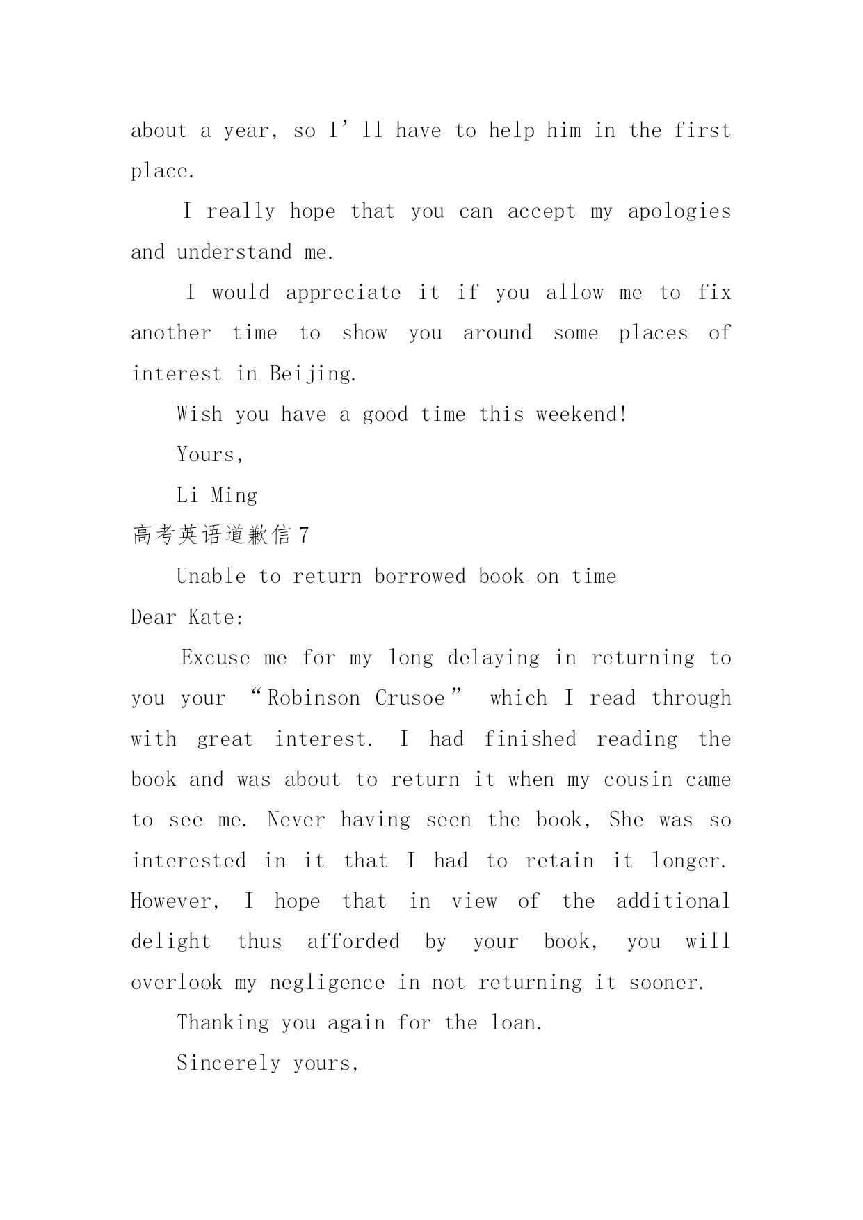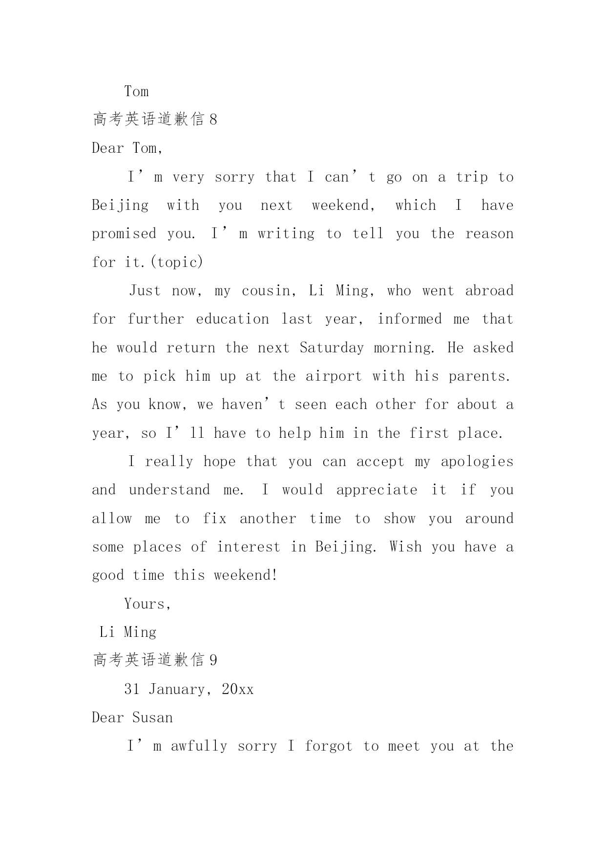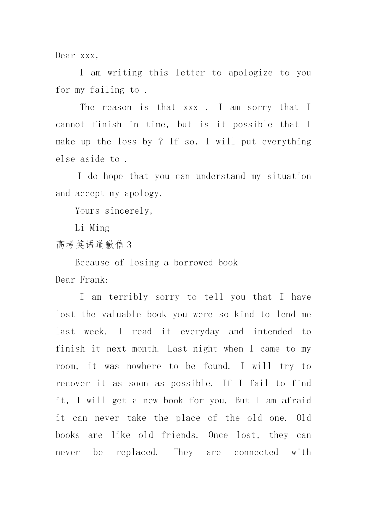 高考英语道歉信高考英语道歉信在平日里,我们总不免地需要写道歉信,通过道歉信我们可以更好反省自己的过失,更好的.向对方表示陪礼道歉。你所见过的道歉信是什么样的呢?以下是小编为大家整理的高考英语道歉信,仅供参考,大家一起来看看吧。高考英语道歉信1Dearxxx,Muchtomyregret/IamterriblysorrythatIamunabletoxxx.ItismainlybecauseatthattimeIwillbefulloccupiedbywhichisquiteoutofmyexpectation,andthatconflictswithyour.ThereforeIamforcedtoadjustmyscheduleandcannotmakemypresenceonyour.Isincerelyhopethatyouwillenjoyagoodtime.Bytheway,canwehavedinnertogethersometimenextweek?Ihopetoseeyousoon.IamreallysorryagainandItrustthatyouwillunderstand.Yourssincerely,LiMing高考英语道歉信2Dearxxx,Iamwritingthislettertoapologizetoyouformyfailingto.Thereasonisthatxxx.IamsorrythatIcannotfinishintime,butisitpossiblethatImakeupthelossby?Ifso,Iwillputeverythingelseasideto.Idohopethatyoucanunderstandmysituationandacceptmyapology.Yourssincerely,LiMing高考英语道歉信3BecauseoflosingaborrowedbookDearFrank:IamterriblysorrytotellyouthatIhavelostthevaluablebookyouweresokindtolendmelastweek.Ireaditeverydayandintendedtofinishitnextmonth.LastnightwhenIcametomyroom,itwasnowheretobefound.Iwilltrytorecoveritassoonaspossible.IfIfailtofindit,Iwillgetanewbookforyou.ButIamafraiditcannevertaketheplaceoftheoldone.Oldbooksarelikeoldfriends.Oncelost,theycanneverbereplaced.Theyareconnectedwithcherishedassociationswhichthenewonescanneverhave.Andforthisirrecoverableloss,Iamtoblame.Iwassocarelesswithmythings.Thisisawarningtometobemorecarefulinthefuture.Yourstruly,Tom高考英语道歉信4DearTom,It’salongtimesincewemetlasttimeandImissyouverymuch.hanksforyourinvitation.However,IregrettotellyouthatIcan’ttraveloAmericathiswinterholidayforsomeunavoidablereasons.Firstofall,it’sthecomingoftheSpringFestivalthatmakesmerefertostayathomeratherthantakeatraveltoAmerica.AsfarasweChineseareconcerned,theSpringFestivalisafamilytimetreasuredbyusall.What’smore,theCollegeEntranceExaminationiscoming.SosignificantisittomethatIwillattendsometutorialclassesduringthiswinterholidayforsomeofmyweakpisions.Takingalltheabovefactorsintoconsideration,IhavetosaysorryagainAnyway,shallImakeitaftertheExam?Iwil