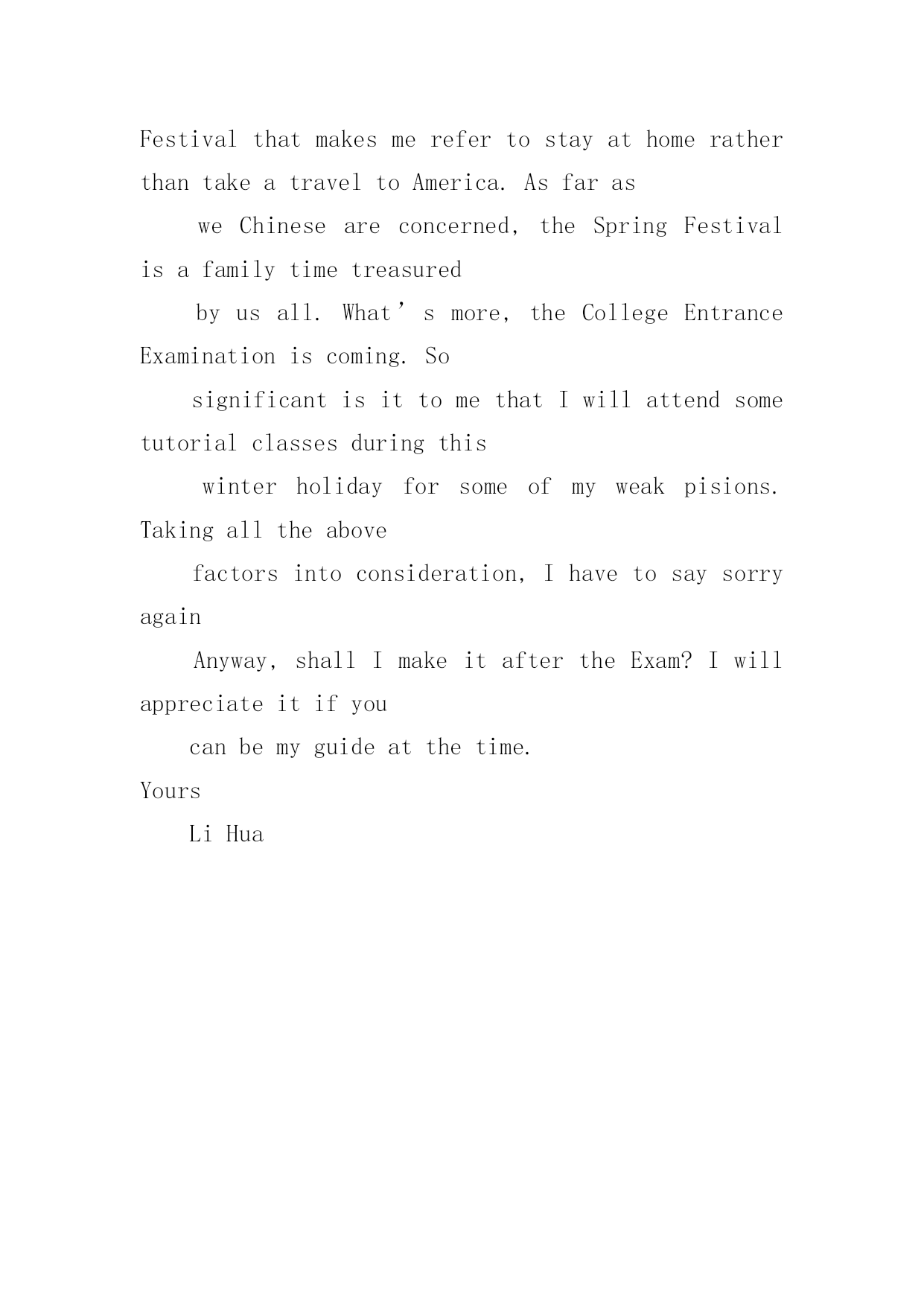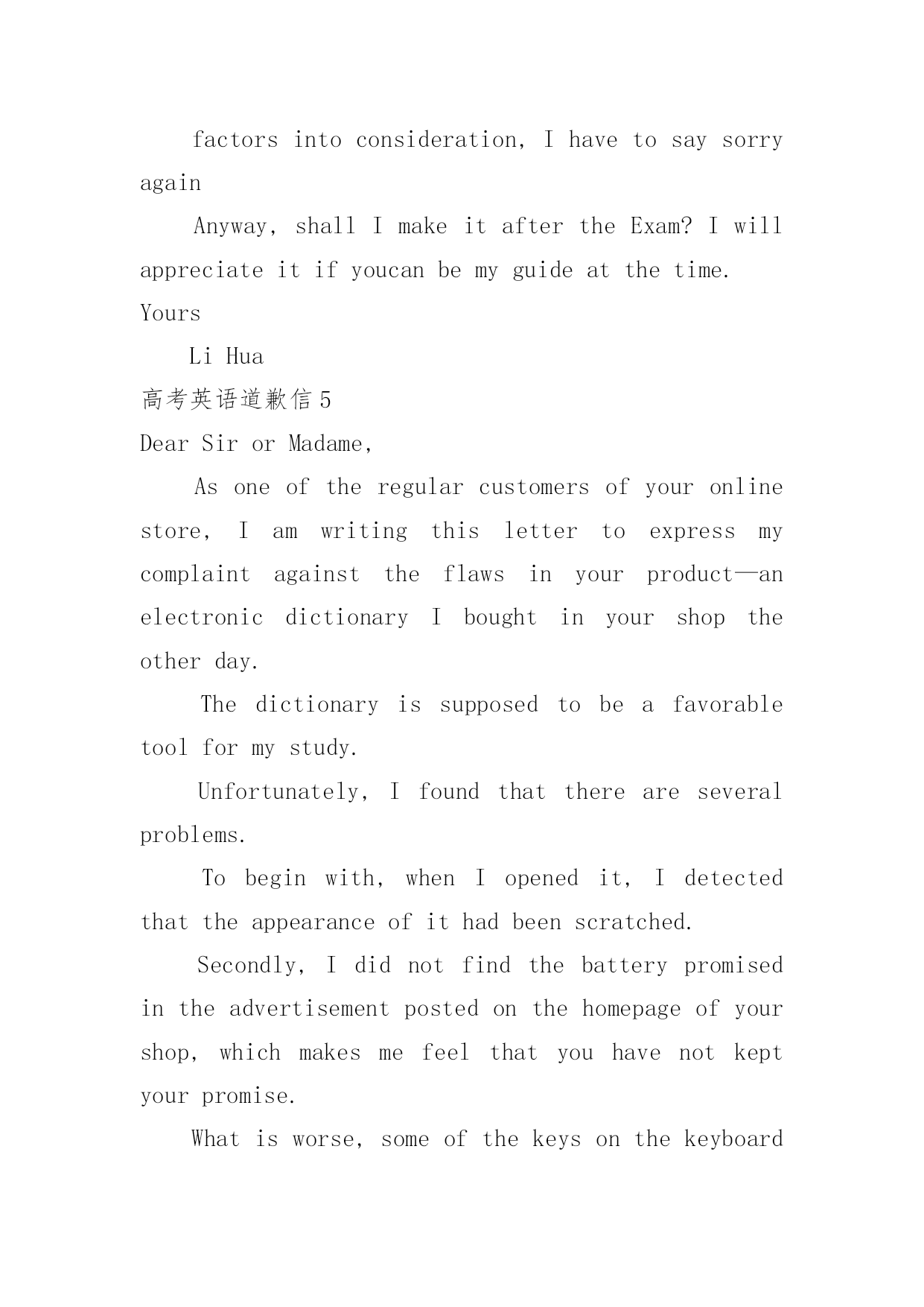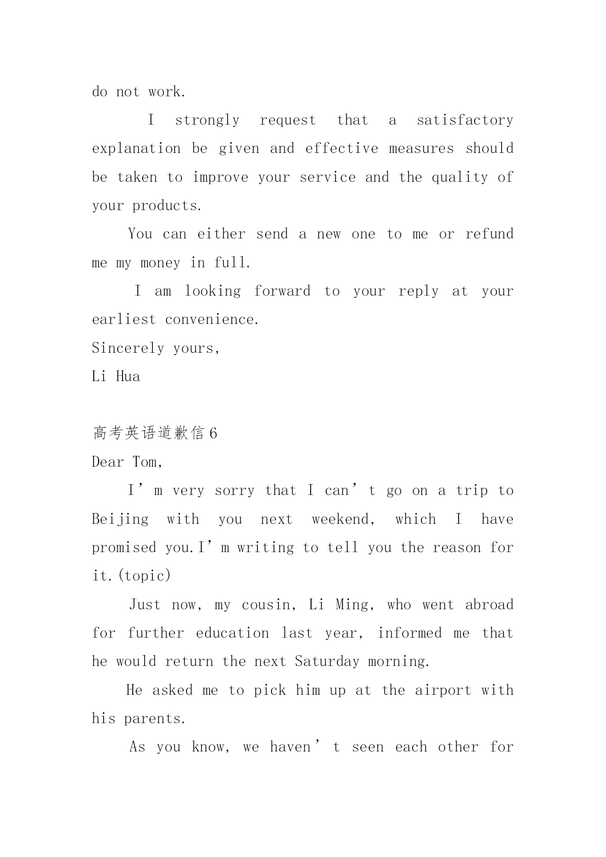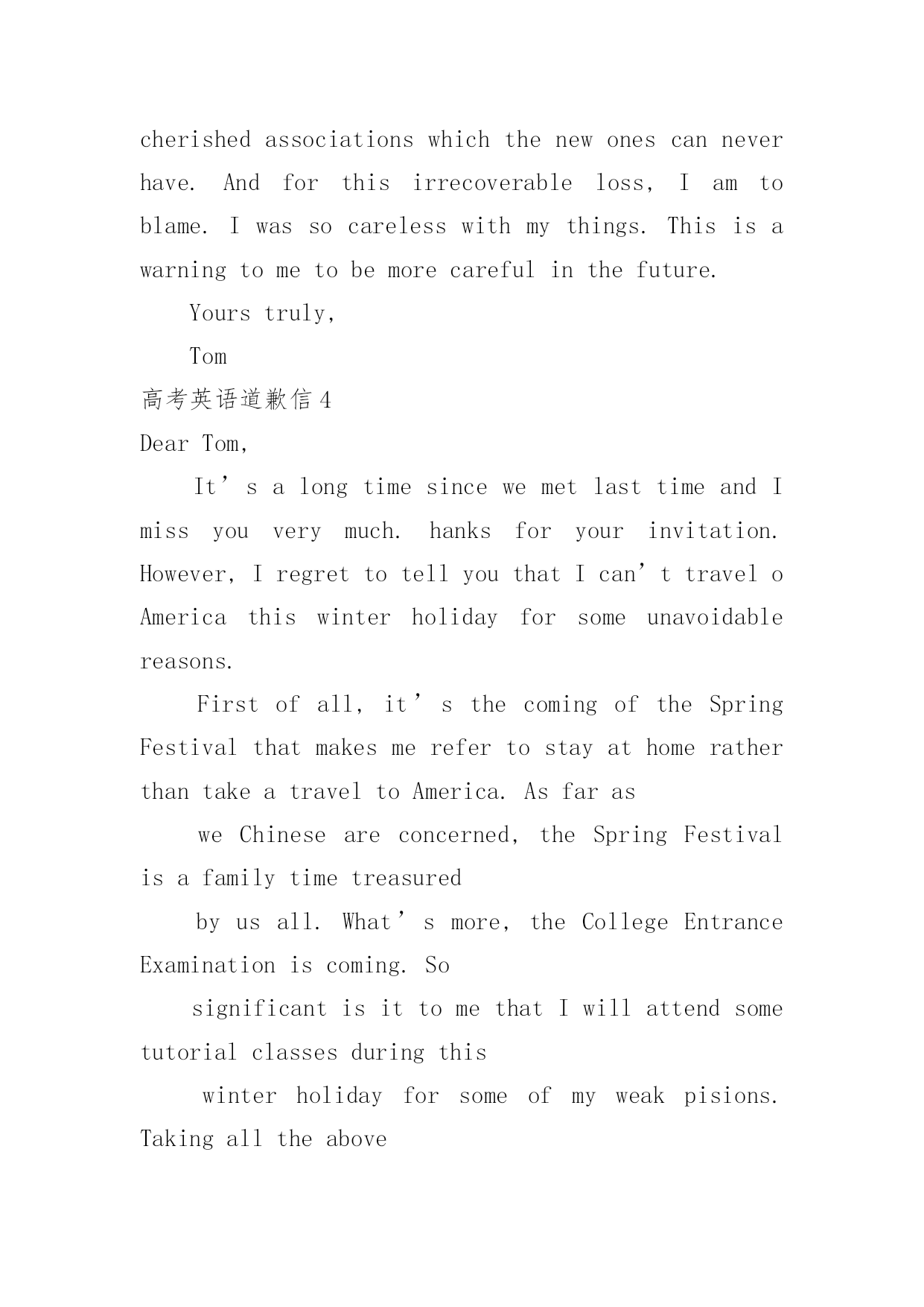 高考英语道歉信高考英语道歉信在平日里,我们总不免地需要写道歉信,通过道歉信我们可以更好反省自己的过失,更好的.向对方表示陪礼道歉。你所见过的道歉信是什么样的呢?以下是小编为大家整理的高考英语道歉信,仅供参考,大家一起来看看吧。高考英语道歉信1Dearxxx,Muchtomyregret/IamterriblysorrythatIamunabletoxxx.ItismainlybecauseatthattimeIwillbefulloccupiedbywhichisquiteoutofmyexpectation,andthatconflictswithyour.ThereforeIamforcedtoadjustmyscheduleandcannotmakemypresenceonyour.Isincerelyhopethatyouwillenjoyagoodtime.Bytheway,canwehavedinnertogethersometimenextweek?Ihopetoseeyousoon.IamreallysorryagainandItrustthatyouwillunderstand.Yourssincerely,LiMing高考英语道歉信2Dearxxx,Iamwritingthislettertoapologizetoyouformyfailingto.Thereasonisthatxxx.IamsorrythatIcannotfinishintime,butisitpossiblethatImakeupthelossby?Ifso,Iwillputeverythingelseasideto.Idohopethatyoucanunderstandmysituationandacceptmyapology.Yourssincerely,LiMing高考英语道歉信3BecauseoflosingaborrowedbookDearFrank:IamterriblysorrytotellyouthatIhavelostthevaluablebookyouweresokindtolendmelastweek.Ireaditeverydayandintendedtofinishitnextmonth.LastnightwhenIcametomyroom,itwasnowheretobefound.Iwilltrytorecoveritassoonaspossible.IfIfailtofindit,Iwillgetanewbookforyou.ButIamafraiditcannevertaketheplaceoftheoldone.Oldbooksarelikeoldfriends.Oncelost,theycanneverbereplaced.Theyareconnectedwithcherishedassociationswhichthenewonescanneverhave.Andforthisirrecoverableloss,Iamtoblame.Iwassocarelesswithmythings.Thisisawarningtometobemorecarefulinthefuture.Yourstruly,Tom高考英语道歉信4DearTom,It’salongtimesincewemetlasttimeandImissyouverymuch.hanksforyourinvitation.However,IregrettotellyouthatIcan’ttraveloAmericathiswinterholidayforsomeunavoidablereasons.Firstofall,it’sthecomingoftheSpringFestivalthatmakesmerefertostayathomeratherthantakeatraveltoAmerica.AsfarasweChineseareconcerned,theSpringFestivalisafamilytimetreasuredbyusall.What’smore,theCollegeEntranceExaminationiscoming.SosignificantisittomethatIwillattendsometutorialclassesduringthiswinterholidayforsomeofmyweakpisions.Takingalltheabovefactorsintoconsideration,IhavetosaysorryagainAnyway,shallImakeitaftertheExam?Iwil