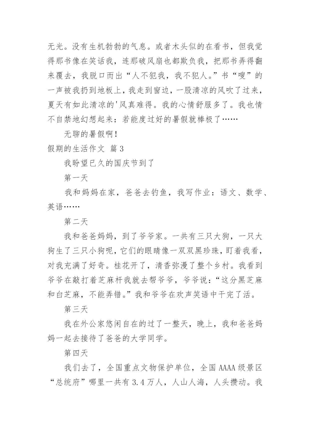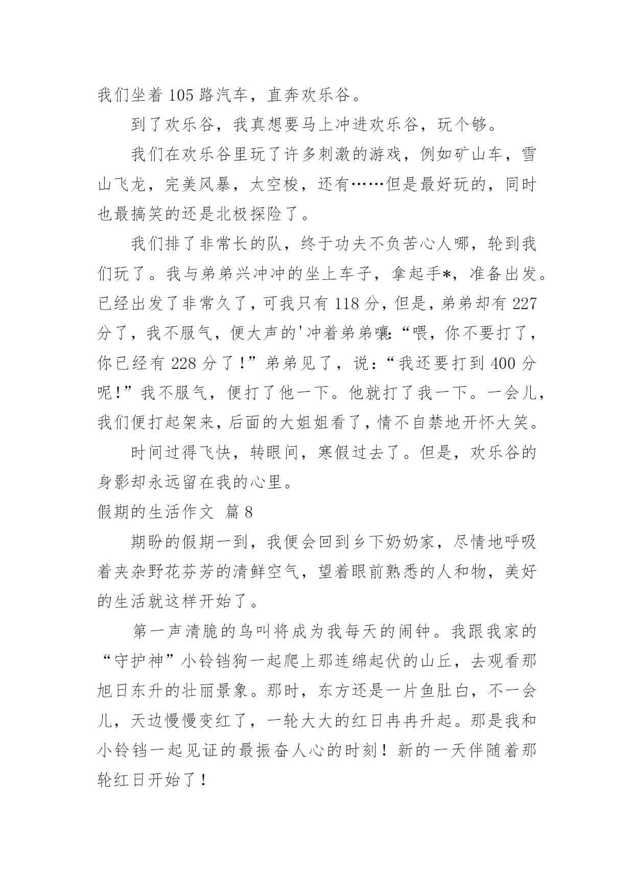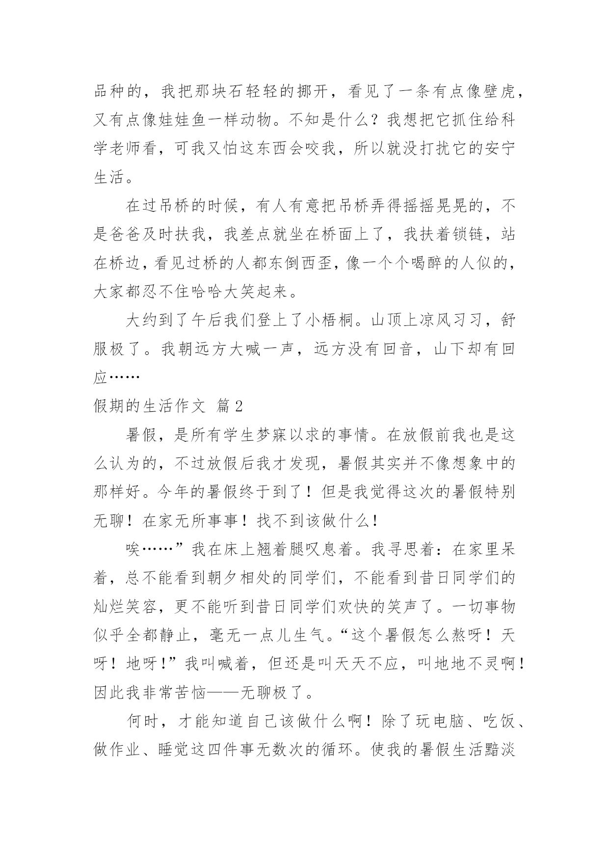 假期的生活作文(经典)假期的生活作文无论是在学校还是在社会中,大家最不陌生的就是作文了吧,作文可分为小学作文、中学作文、大学作文(论文)。那么,怎么去写作文呢?以下是小编帮大家整理的假期的生活作文8篇,仅供参考,大家一起来看看吧。假期的生活作文篇1假期我和家人去爬梧桐山。来到梧桐山,只见山上的树木绿油油的,一片接着一片,绵绵不绝,覆盖所有的山体,几乎没有空隙,好像是仙人有意涂上的颜色,比往常绿多了。登山道上人流不断,男女老少,甚至还有人带上了狗狗一起爬山,锻炼身体。看见清澈见底的山泉溪水,我便把鞋脱了,站在凉凉的溪水里,享受着冰凉的山泉水为我的脚按摩。我弯腰找漂亮的石头的.时候,意外发现好多石头上趴着鱼儿,这种鱼儿跟别的鱼不一样,它不会在水中游来游去,而是静静的趴在石头上。我很好奇,便打算抓一条仔细观察,可我抓了半天也没抓到一条,好几次还差点成了落汤鸡。虽然没抓到但我发现,这种鱼儿很机灵,它们的身体虎皮花纹的比较多,也有乳白色的,但比较少。我想:下次来我要带一个放大镜和一个小渔网来观察它们。突然,我发现一块大石头下露出了一条黑黄色的尾巴,我还以为是一条跟其他趴着的鱼是一个品种的,我把那块石轻轻的挪开,看见了一条有点像壁虎,又有点像娃娃鱼一样动物。不知是什么?我想把它抓住给科学老师看,可我又怕这东西会咬我,所以就没打扰它的安宁生活。在过吊桥的时候,有人有意把吊桥弄得摇摇晃晃的,不是爸爸及时扶我,我差点就坐在桥面上了,我扶着锁链,站在桥边,看见过桥的人都东倒西歪,像一个个喝醉的人似的,大家都忍不住哈哈大笑起来。大约到了午后我们登上了小梧桐。山顶上凉风习习,舒服极了。我朝远方大喊一声,远方没有回音,山下却有回应……假期的生活作文篇2暑假,是所有学生梦寐以求的事情。在放假前我也是这么认为的,不过放假后我才发现,暑假其实并不像想象中的那样好。今年的暑假终于到了!但是我觉得这次的暑假特别无聊!在家无所事事!找不到该做什么!唉……”我在床上翘着腿叹息着。我寻思着:在家里呆着,总不能看到朝夕相处的同学们,不能看到昔日同学们的灿烂笑容,更不能听到昔日同学们欢快的笑声了。一切事物似乎全都静止,毫无一点儿生气。“这个暑假怎么熬呀!天呀!地呀!”我叫喊着,但还是叫天天不应,叫地地不灵啊!因此我非常苦恼——无聊极了。何时,才能知道自己该做什么啊!除了玩电脑、吃饭、做作业、睡觉这四件事无数次的循环。使我的暑假生活黯淡无光。没有生机勃勃的气息。或者木头似的在看书,但我觉得那书像在笑话我,连那破风扇也都欺负我,把那书弄得翻来覆去,我脱口而出“人不犯我,我不犯人。”书“嗖”的一声被我扔到地板上,我走到窗边,一股清凉的风吹了过来,夏天有如此清凉的'风真难得。我的心情舒服多了。我也情不自禁地幻想起来:若能度过好的暑假就棒极了……无聊的暑假啊!假期的生活作文篇3我盼望已久的国庆节到了第一天我和妈妈在家,爸爸去钓鱼,我写作业:语文、数学、英语……第二天我和爸爸妈妈,到了爷爷家。一共有三只大狗,一只大狗生了三只小狗呢,它们的眼睛像一双双黑珍珠,盯着我看,对我充满了好奇。桂花开了,清香弥漫了整个乡村。我看到爷爷在敲打着芝麻杆我就去帮爷爷,爷爷说:“这分黑芝麻和白芝麻,不能弄错。”我和爷爷在欢声笑语中干完了活。第三天我在外公家悠闲自在的过了一整天,晚上,我和爸爸妈妈一起去接待了爸爸的大学同学。第四天我们去了,全国重点文物保护单位,全国AAAA级景区“总统府”哪里一共有3.4万人,人山人海,人头攒动。我们请了一位导游为我们讲解。我们先去了大堂,又去了天朝宫殿,还有行政院。那里还有孙中山起居室,孙中山临时大总统办公室,夕佳楼、石船、花厅、复国、子超楼……听着导游的`讲解我对历史产生了浓厚的兴趣。虽然国庆节放假七天,但是快乐时间总是那么的短暂。。假期的生活作文篇4时间过的可真快呀,转眼间放寒假了,对第一次体会上学后假期生活的我,感觉好极了,爸爸妈妈根据老师的要求,也对我的假期生活也做了细质的安排:每天上午作寒假作业,练习15分钟的字贴、听英语碟片;下午呢,做剪贴报、看完课外书后自由活动!虽然有时感觉爸爸妈妈让我做的'这些作业比上学时候还要多心里很烦,可是想想都是为我好,我也就平静了,感觉很充实!假期的生活作文篇5我理想中的假期生活可不是乏味,无趣的,天天玩电脑玩到黑屏,看电视看到午夜,作业拖到最后几天写……我想过一个轻松,充实的假期。这天,我趴在桌子上,吃着刚出炉的蔓越莓饼干,想:天天像这样写作业,看电视,太无聊了。要是可以去别处玩玩,该多好啊。就这样,我陷入了遐想中。我回到了老家,来到清澈的小溪边捉田螺,先把网子里抹上面糊,放进水中,鱼儿来了之后,把网提起来,哇,好多闪闪发光的小鱼啊!我要去河边摘莲蓬,摘荷花,先找一叶渔船,坐上后划桨,前面有好多荷叶!流进荷叶中后,开始找莲