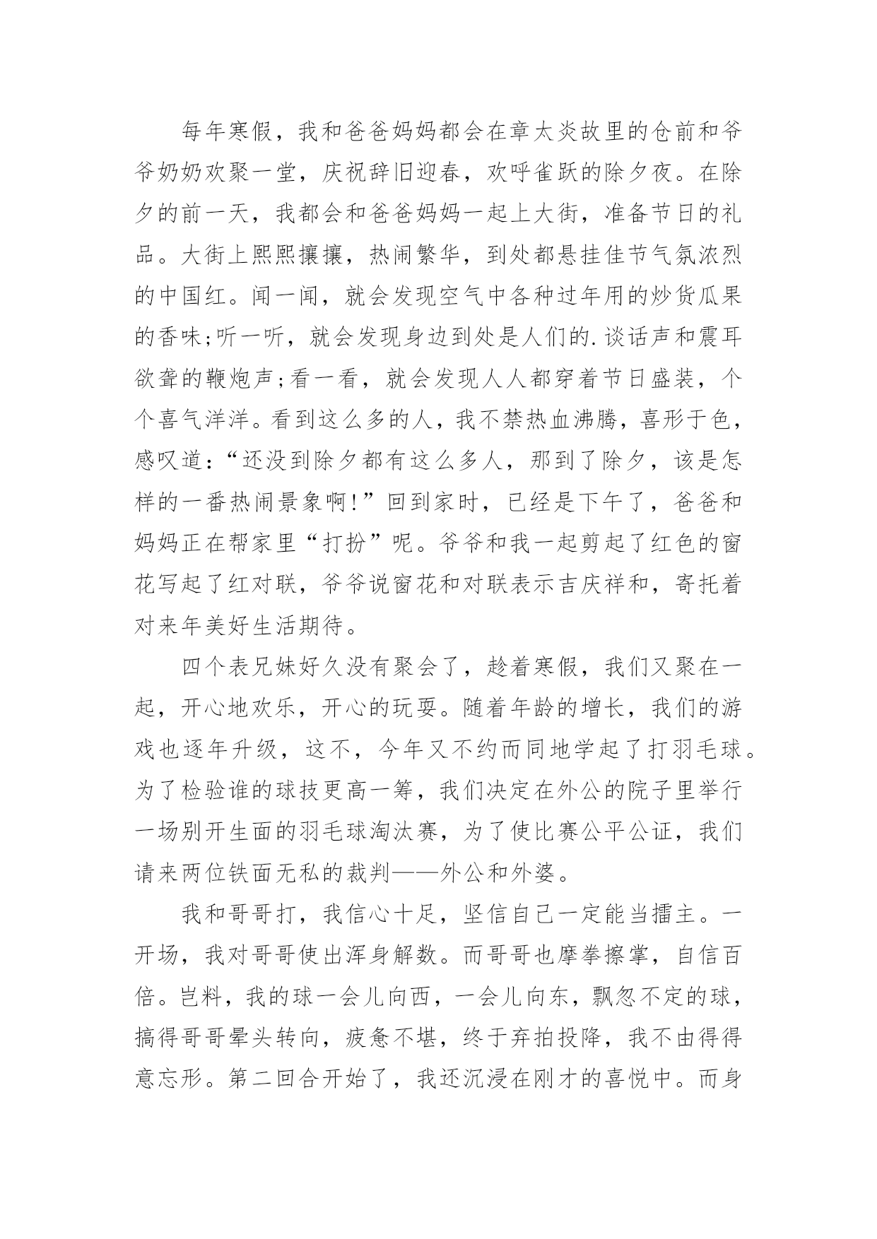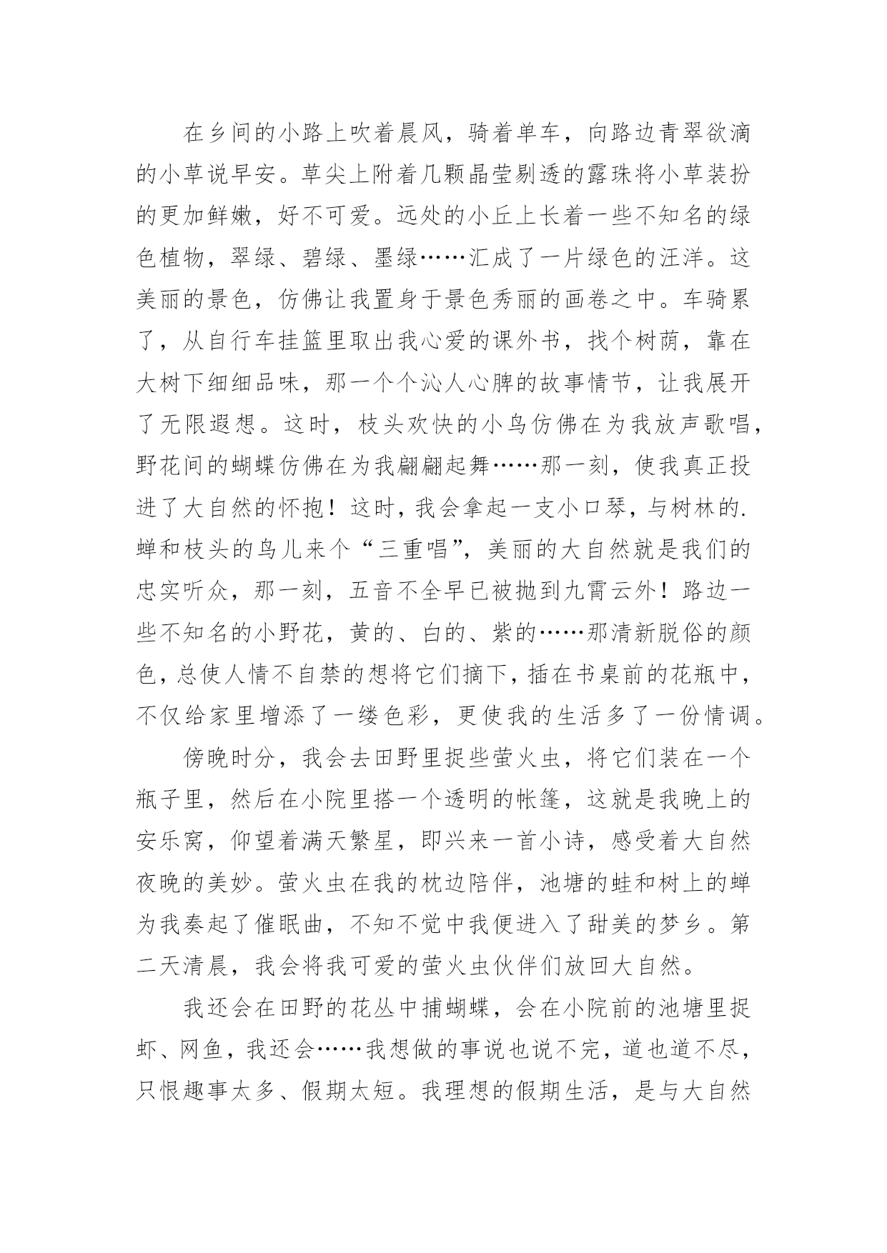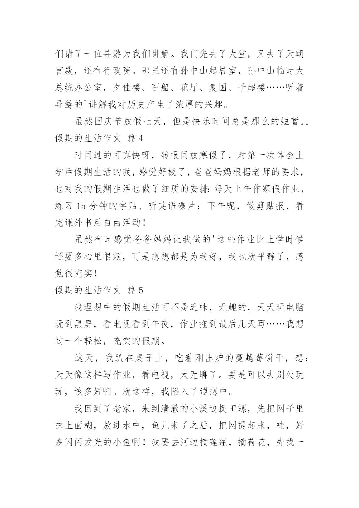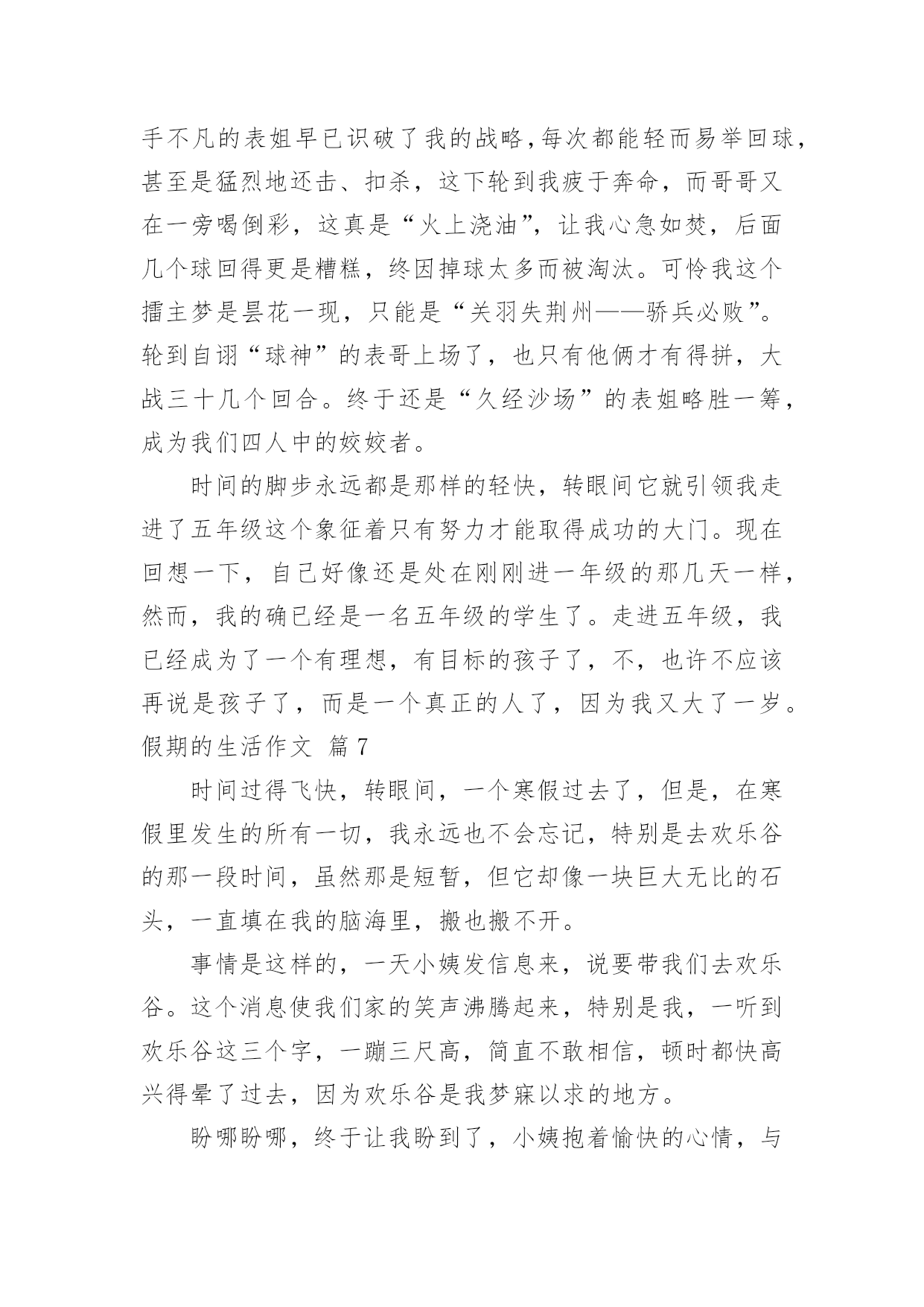 假期的生活作文(经典)假期的生活作文无论是在学校还是在社会中,大家最不陌生的就是作文了吧,作文可分为小学作文、中学作文、大学作文(论文)。那么,怎么去写作文呢?以下是小编帮大家整理的假期的生活作文8篇,仅供参考,大家一起来看看吧。假期的生活作文篇1假期我和家人去爬梧桐山。来到梧桐山,只见山上的树木绿油油的,一片接着一片,绵绵不绝,覆盖所有的山体,几乎没有空隙,好像是仙人有意涂上的颜色,比往常绿多了。登山道上人流不断,男女老少,甚至还有人带上了狗狗一起爬山,锻炼身体。看见清澈见底的山泉溪水,我便把鞋脱了,站在凉凉的溪水里,享受着冰凉的山泉水为我的脚按摩。我弯腰找漂亮的石头的.时候,意外发现好多石头上趴着鱼儿,这种鱼儿跟别的鱼不一样,它不会在水中游来游去,而是静静的趴在石头上。我很好奇,便打算抓一条仔细观察,可我抓了半天也没抓到一条,好几次还差点成了落汤鸡。虽然没抓到但我发现,这种鱼儿很机灵,它们的身体虎皮花纹的比较多,也有乳白色的,但比较少。我想:下次来我要带一个放大镜和一个小渔网来观察它们。突然,我发现一块大石头下露出了一条黑黄色的尾巴,我还以为是一条跟其他趴着的鱼是一个品种的,我把那块石轻轻的挪开,看见了一条有点像壁虎,又有点像娃娃鱼一样动物。不知是什么?我想把它抓住给科学老师看,可我又怕这东西会咬我,所以就没打扰它的安宁生活。在过吊桥的时候,有人有意把吊桥弄得摇摇晃晃的,不是爸爸及时扶我,我差点就坐在桥面上了,我扶着锁链,站在桥边,看见过桥的人都东倒西歪,像一个个喝醉的人似的,大家都忍不住哈哈大笑起来。大约到了午后我们登上了小梧桐。山顶上凉风习习,舒服极了。我朝远方大喊一声,远方没有回音,山下却有回应……假期的生活作文篇2暑假,是所有学生梦寐以求的事情。在放假前我也是这么认为的,不过放假后我才发现,暑假其实并不像想象中的那样好。今年的暑假终于到了!但是我觉得这次的暑假特别无聊!在家无所事事!找不到该做什么!唉……”我在床上翘着腿叹息着。我寻思着:在家里呆着,总不能看到朝夕相处的同学们,不能看到昔日同学们的灿烂笑容,更不能听到昔日同学们欢快的笑声了。一切事物似乎全都静止,毫无一点儿生气。“这个暑假怎么熬呀!天呀!地呀!”我叫喊着,但还是叫天天不应,叫地地不灵啊!因此我非常苦恼——无聊极了。何时,才能知道自己该做什么啊!除了玩电脑、吃饭、做作业、睡觉这四件事无数次的循环。使我的暑假生活黯淡无光。没有生机勃勃的气息。或者木头似的在看书,但我觉得那书像在笑话我,连那破风扇也都欺负我,把那书弄得翻来覆去,我脱口而出“人不犯我,我不犯人。”书“嗖”的一声被我扔到地板上,我走到窗边,一股清凉的风吹了过来,夏天有如此清凉的'风真难得。我的心情舒服多了。我也情不自禁地幻想起来:若能度过好的暑假就棒极了……无聊的暑假啊!假期的生活作文篇3我盼望已久的国庆节到了第一天我和妈妈在家,爸爸去钓鱼,我写作业:语文、数学、英语……第二天我和爸爸妈妈,到了爷爷家。一共有三只大狗,一只大狗生了三只小狗呢,它们的眼睛像一双双黑珍珠,盯着我看,对我充满了好奇。桂花开了,清香弥漫了整个乡村。我看到爷爷在敲打着芝麻杆我就去帮爷爷,爷爷说:“这分黑芝麻和白芝麻,不能弄错。”我和爷爷在欢声笑语中干完了活。第三天我在外公家悠闲自在的过了一整天,晚上,我和爸爸妈妈一起去接待了爸爸的大学同学。第四天我们去了,全国重点文物保护单位,全国AAAA级景区“总统府”哪里一共有3.4万人,人山人海,人头攒动。我们请了一位导游为我们讲解。我们先去了大堂,又去了天朝宫殿,还有行政院。那里还有孙中山起居室,孙中山临时大总统办公室,夕佳楼、石船、花厅、复国、子超楼……听着导游的`讲解我对历史产生了浓厚的兴趣。虽然国庆节放假七天,但是快乐时间总是那么的短暂。。假期的生活作文篇4时间过的可真快呀,转眼间放寒假了,对第一次体会上学后假期生活的我,感觉好极了,爸爸妈妈根据老师的要求,也对我的假期生活也做了细质的安排:每天上午作寒假作业,练习15分钟的字贴、听英语碟片;下午呢,做剪贴报、看完课外书后自由活动!虽然有时感觉爸爸妈妈让我做的'这些作业比上学时候还要多心里很烦,可是想想都是为我好,我也就平静了,感觉很充实!假期的生活作文篇5我理想中的假期生活可不是乏味,无趣的,天天玩电脑玩到黑屏,看电视看到午夜,作业拖到最后几天写……我想过一个轻松,充实的假期。这天,我趴在桌子上,吃着刚出炉的蔓越莓饼干,想:天天像这样写作业,看电视,太无聊了。要是可以去别处玩玩,该多好啊。就这样,我陷入了遐想中。我回到了老家,来到清澈的小溪边捉田螺,先把网子里抹上面糊,放进水中,鱼儿来了之后,把网提起来,哇,好多闪闪发光的小鱼啊!我要去河边摘莲蓬,摘荷花,先找一叶渔船,坐上后划桨,前面有好多荷叶!流进荷叶中后,开始找莲