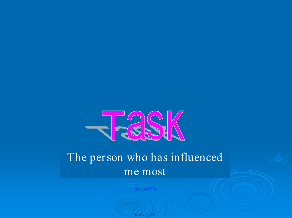 牛津(niújīn)译林英语上TaskObjectivesRevision1.Phrases:inhisfiftiesnot….until…bereadytogivemoneytosomeoneinneedtomysurprisedonatebloodcellstopeoplewithbloodcancerheseemedtobekindertoothersthantohisfamilyAMrWuisaskingeachoftheClass1,Grade9studentstowriteaboutthepersonwhohasinfluencedhimorhermost.Heshowsanarticletothemasamodel.Readthearticleandanswerthequestions.*Whohasinfluencedtheauthormost?*Howoldisherfather?*Whatisherfatherlike?*Whathasherfatherdonesince1990?*Whatsurprisedtheauthor?*Whatdoestheauthorrealizenow?Readthearticleandsummarisethemainpointsabouttheauthor’sfather.…isthepersonwhohasinfluencedmemost.…isinhis/hertwenties/thirties/forties/…Youwillnotfindanythingunusualabouthim/heruntil……hasalwaysbeenkind/helpful/…Tomysurprise,…WhenIwasalittlegirl/boy,Icouldnotunderstand…NowIrealizethat…1.Whohasinfluencedyoumostinyourlife?__________________________________2.Whatdoeshe/shelooklike?_________________________________3.Whatisspecialabouthim/her?_________________________________4.Whathashe/shedone?_________________________________5.Whatdoyouthinkofhim/her?_________________________________friendlyLanguagepoints1.Myfatherisinhisfifties.1.Myfatherisinhisfifties.表示整十的数词后加s变成复数,用在“inone’s+数词复数”短语中,表示“某人年龄处于(chǔyú)某段时间”。如:inone’stwenties/thirties/forties在某人二十/三十/四十多岁时表示整十的数词后加s变成复数,也可以用在“inthe+数词复数”短语(duǎnyǔ)中,表示“在某个年代”。如:intheseventies/eighties/nineties在七十/八十/九十年代2.Heisreadytohelpanyone.donate意为“捐赠,赠送(财物(cáiwù)等)(尤指对慈善事业)”,常用donate...to…“捐献……给……”。如:4.Tomysurprise,hehasdecidedtodonatehisbodyformedicalresearchafterhisdeath.4.Tomysurprise,hehasdecidedtodonatehisbodyformedicalresearchafterhisdeath.toone’ssurprise令某人惊奇(jīngqí)的是e.g.Tomysurprise,thetaskwasfinishedinonlyoneweek.使我惊讶是,这项任务仅一周就完成了。Practise1.直到你走进屋子才会发现不同寻常之处。You_________________________________youenterthehouse.2.他把自行车给一个(yīɡè)无力购买自行车的男孩。Hegavehisbicycletoaboy__________________________.3.年轻人应该照顾年长者。Theyoung_______________________________________theelderly.4.冰箱里有剩余的牛奶吗?_