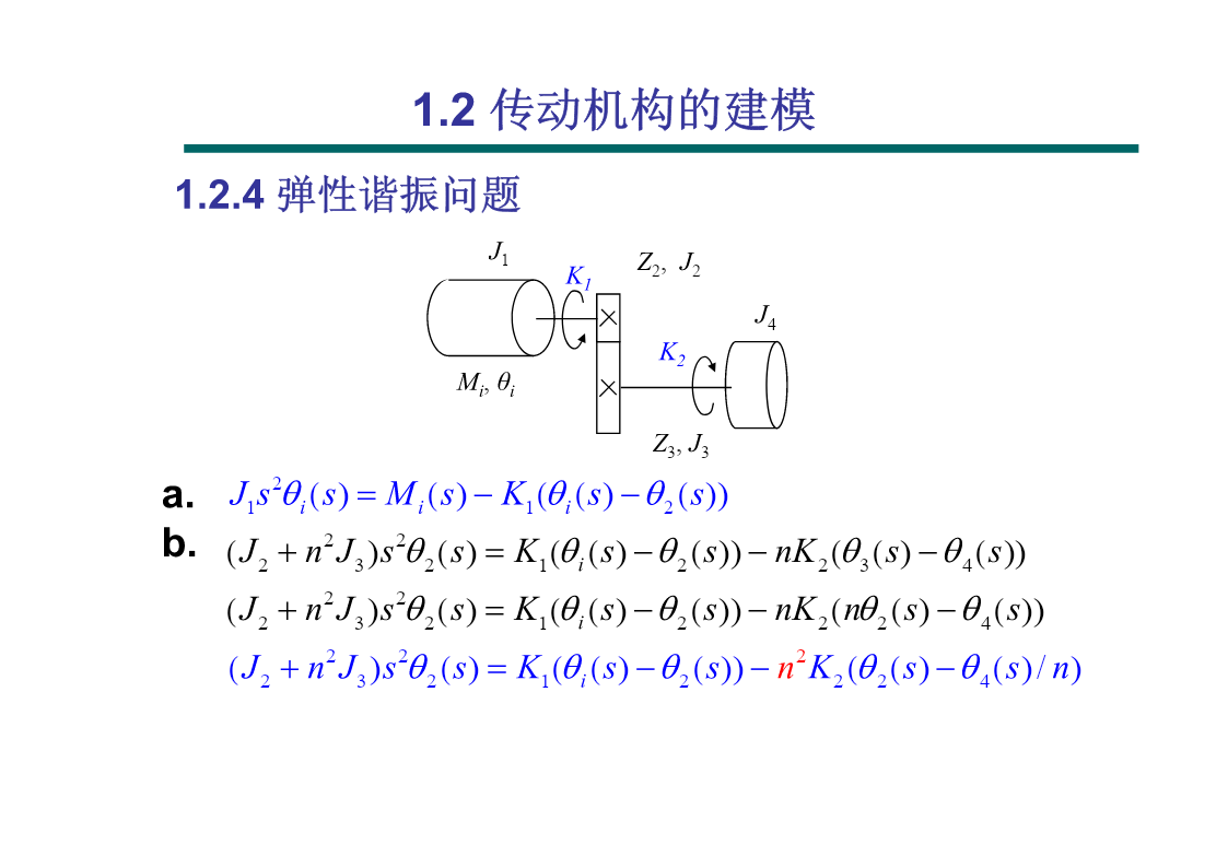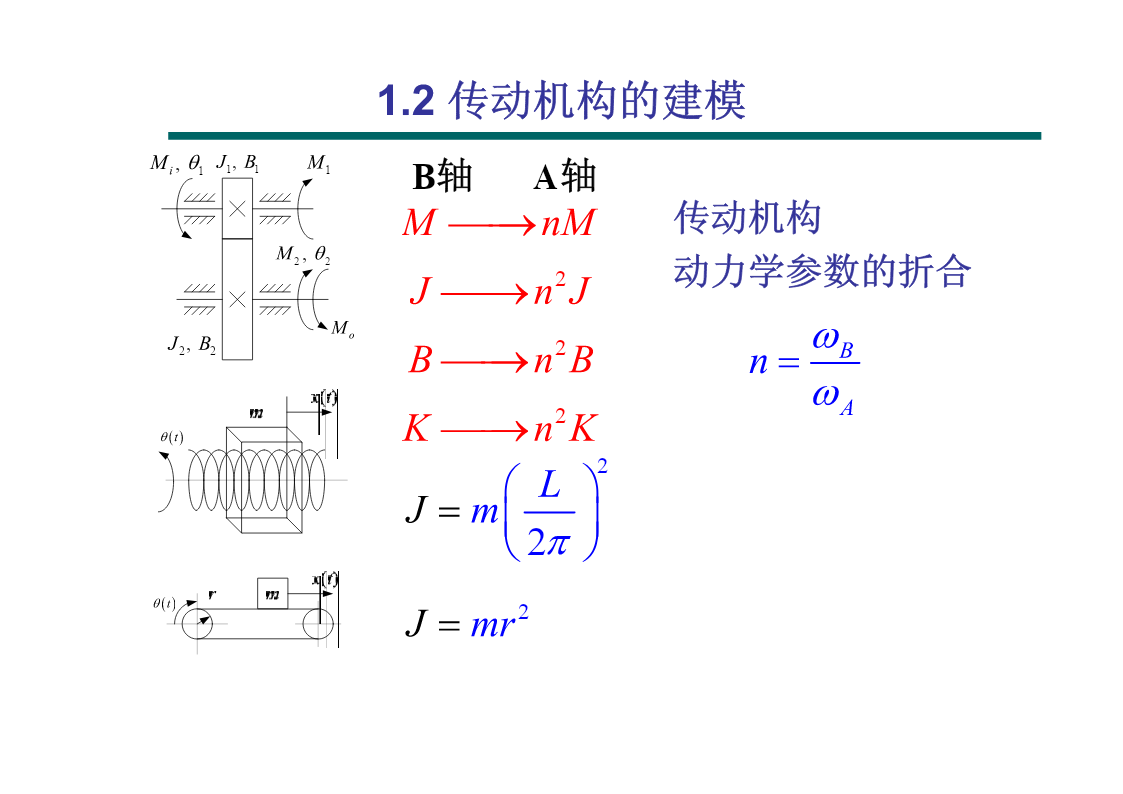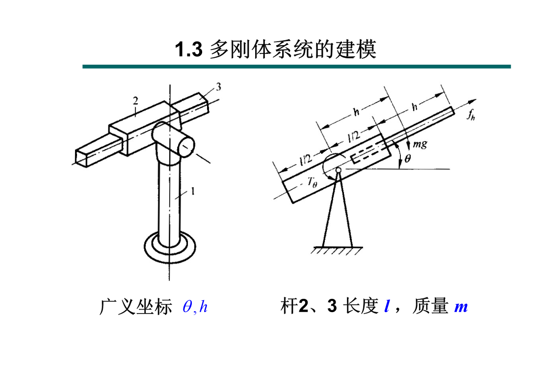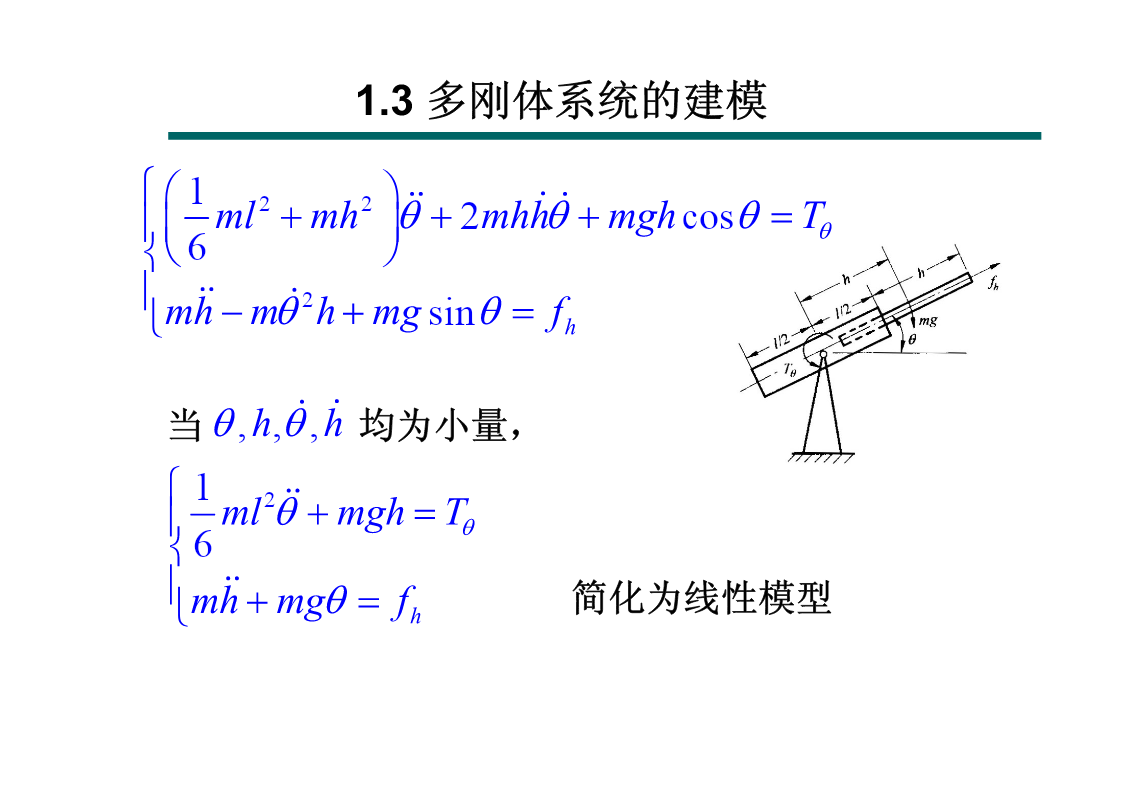 机电控制工程1.机电系统建模1.1控制工程基础知识1.2传动机构的建模131.3多刚体系统的建模1.4微机电系统的建模1.2传动机构的建模1.2.2旋转-直线传动丝杠螺母传动丝杠导程L,角速度ω质量块速度v,ωv=Lθ()t2π设质量块等效到丝杠的转动惯量为J,221122⎛⎞v⎛⎞LJmvω=J=m⎜⎟=m⎜⎟22⎝ω⎠⎝2π⎠1.2传动机构的建模1.2.3旋转-旋转传动主动轴:1,从动轴:2JB,Mi,θ111M1M1:轴2对轴1的力矩M2:轴1对轴2的力矩dd2θθJBMM11++=111dt2dtiM,θ222ddθθJBMM22++=22dt2dto2如果传动效率100%,Moddθθθ&JB22,122M12=MM12=Mdtdtθ&11.2传动机构的建模1.2.4弹性谐振问题J1Z2,J2K1J4K2Mi,θiZ3,J32a.Js112θθθii()s=−M()sK(i()s−())sb.22(JnJssKssnKss2321+=−−−)()(()())(()())θθθi2234θθ22(JnJssK2321+=−−−)()(()())(()())θθθθθis2snKns224s222()()(()())(()()/)JnJssK2321+=−−−θθθθθis2snK22sn4s1.2传动机构的建模M,θJ,BMi1111B轴A轴MMM⎯⎯→nM传动机构M,θ22动力学参数的折合J⎯⎯→nJ2MJB,oω22B⎯⎯→nB2n=Bω2Aθ(t)K⎯⎯→nK2⎛⎞LJ=m⎜⎟⎝⎠2πθt()J=mr21.机电系统建模1.1控制工程基础知识1.2传动机构的建模131.3多刚体系统的建模1.4微机电系统的建模1.3多刚体系统的建模刚体的广义位移:θq(qn=1,2,L,)每个刚体的动能:Tq(qn=1,2,L,)作用在每个刚体自由度方向上的广义力:fq(q=1,,,2,,L,n)拉格朗日方程dT⎛⎞∂∂T−==f⎜⎟qdt⎝⎠∂∂θθ&qqn其中TT=∑q为系统的总动能q=11.3多刚体系统的建模广义坐标θ,h杆2、3长度l,质量m1.3多刚体系统的建模⎧⎛⎞122⎪⎜⎟ml+++mhθθ&&2cosmhh&&mghθ=Tθ⎨⎝⎠6⎪2⎩mh&&−+mθθ&h+mgsin=fh当θ,,,hhθ&&均为小量,⎧12⎪mlθ&&+=mghTθ⎨6⎪简化为线性模型⎩mh&&+=mgθfh试验建模方法无人直升机航向控制模型ω通过控制尾桨桨叶偏转角度实现航向控制无人直升机航向控制模型尾桨控制信号脉宽直升机航向无人直升机航向控制模型a.直接对原始数据做辨识Matlab:identA(q)y(t)=B(q)u(t)+e(t)A(q)=1-3.66q-1+5.01q-2-3.03q-3+0.692q-4B(q)=-0.0683+0.205q-1-0.214q-2+0.0772q-3Measuredandsimulatedmodeloutput32031030029028027026025011.522.5Time无人直升机航向控制模型零极点分布有1个极点在单位圆外?无人直升机航向控制模型输入去偏置输出做微分500Fin-50-10000.511.5500-50Ω-100-15000.511.5Time/s无人直升机航向控制模型Ω(z)−+0.07866z0.1372控制量到角速度:=X(zz)2−1.706z+0.741Measuredandsimulated(--)modeloutputPoles(x)andZeros(o)20100.5-20-400-60-0.5-80-100-1-1-0.500.511.52-12011.522.5Time无人直升机航向控制模型输入、输出信号的Ω(s)−+2.80s41.0=各阶微分的线性组合Xs()s2+6.46s+25.3搜索极小值Order21500Input-50-10000.511.550Fit0real-50Ω-100-15000.511.5Time/s1.机电系统建模1.4微机电系统的建模1.4.1弹性非线性1421.4.2偏置梳齿结构中的静电力