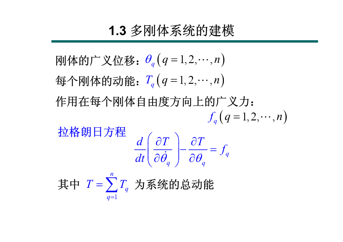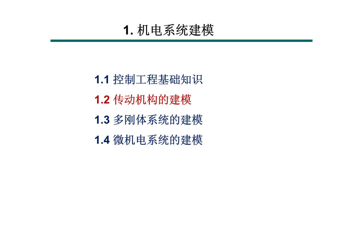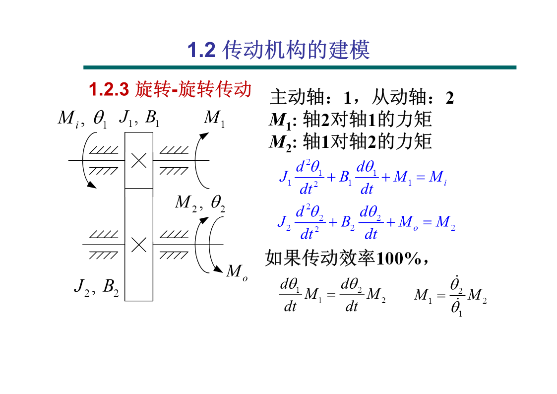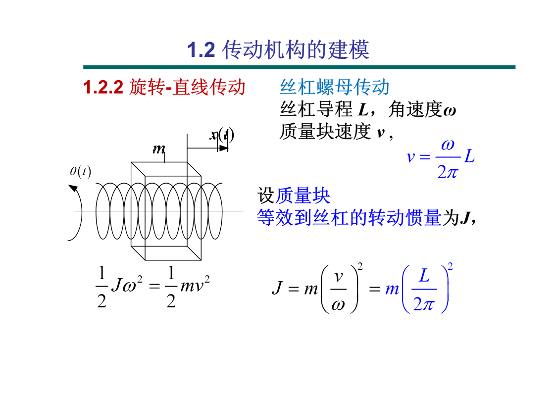 机电控制工程1.机电系统建模1.1控制工程基础知识1.2传动机构的建模131.3多刚体系统的建模1.4微机电系统的建模1.2传动机构的建模1.2.2旋转-直线传动丝杠螺母传动丝杠导程L,角速度ω质量块速度v,ωv=Lθ()t2π设质量块等效到丝杠的转动惯量为J,221122⎛⎞v⎛⎞LJmvω=J=m⎜⎟=m⎜⎟22⎝ω⎠⎝2π⎠1.2传动机构的建模1.2.3旋转-旋转传动主动轴:1,从动轴:2JB,Mi,θ111M1M1:轴2对轴1的力矩M2:轴1对轴2的力矩dd2θθJBMM11++=111dt2dtiM,θ222ddθθJBMM22++=22dt2dto2如果传动效率100%,Moddθθθ&JB22,122M12=MM12=Mdtdtθ&11.2传动机构的建模1.2.4弹性谐振问题J1Z2,J2K1J4K2Mi,θiZ3,J32a.Js112θθθii()s=−M()sK(i()s−())sb.22(JnJssKssnKss2321+=−−−)()(()())(()())θθθi2234θθ22(JnJssK2321+=−−−)()(()())(()())θθθθθis2snKns224s222()()(()())(()()/)JnJssK2321+=−−−θθθθθis2snK22sn4s1.2传动机构的建模M,θJ,BMi1111B轴A轴MMM⎯⎯→nM传动机构M,θ22动力学参数的折合J⎯⎯→nJ2MJB,oω22B⎯⎯→nB2n=Bω2Aθ(t)K⎯⎯→nK2⎛⎞LJ=m⎜⎟⎝⎠2πθt()J=mr21.机电系统建模1.1控制工程基础知识1.2传动机构的建模131.3多刚体系统的建模1.4微机电系统的建模1.3多刚体系统的建模刚体的广义位移:θq(qn=1,2,L,)每个刚体的动能:Tq(qn=1,2,L,)作用在每个刚体自由度方向上的广义力:fq(q=1,,,2,,L,n)拉格朗日方程dT⎛⎞∂∂T−==f⎜⎟qdt⎝⎠∂∂θθ&qqn其中TT=∑q为系统的总动能q=11.3多刚体系统的建模广义坐标θ,h杆2、3长度l,质量m1.3多刚体系统的建模⎧⎛⎞122⎪⎜⎟ml+++mhθθ&&2cosmhh&&mghθ=Tθ⎨⎝⎠6⎪2⎩mh&&−+mθθ&h+mgsin=fh当θ,,,hhθ&&均为小量,⎧12⎪mlθ&&+=mghTθ⎨6⎪简化为线性模型⎩mh&&+=mgθfh试验建模方法无人直升机航向控制模型ω通过控制尾桨桨叶偏转角度实现航向控制无人直升机航向控制模型尾桨控制信号脉宽直升机航向无人直升机航向控制模型a.直接对原始数据做辨识Matlab:identA(q)y(t)=B(q)u(t)+e(t)A(q)=1-3.66q-1+5.01q-2-3.03q-3+0.692q-4B(q)=-0.0683+0.205q-1-0.214q-2+0.0772q-3Measuredandsimulatedmodeloutput32031030029028027026025011.522.5Time无人直升机航向控制模型零极点分布有1个极点在单位圆外?无人直升机航向控制模型输入去偏置输出做微分500Fin-50-10000.511.5500-50Ω-100-15000.511.5Time/s无人直升机航向控制模型Ω(z)−+0.07866z0.1372控制量到角速度:=X(zz)2−1.706z+0.741Measuredandsimulated(--)modeloutputPoles(x)andZeros(o)20100.5-20-400-60-0.5-80-100-1-1-0.500.511.52-12011.522.5Time无人直升机航向控制模型输入、输出信号的Ω(s)−+2.80s41.0=各阶微分的线性组合Xs()s2+6.46s+25.3搜索极小值Order21500Input-50-10000.511.550Fit0real-50Ω-100-15000.511.5Time/s1.机电系统建模1.4微机电系统的建模1.4.1弹性非线性1421.4.2偏置梳齿结构中的静电力