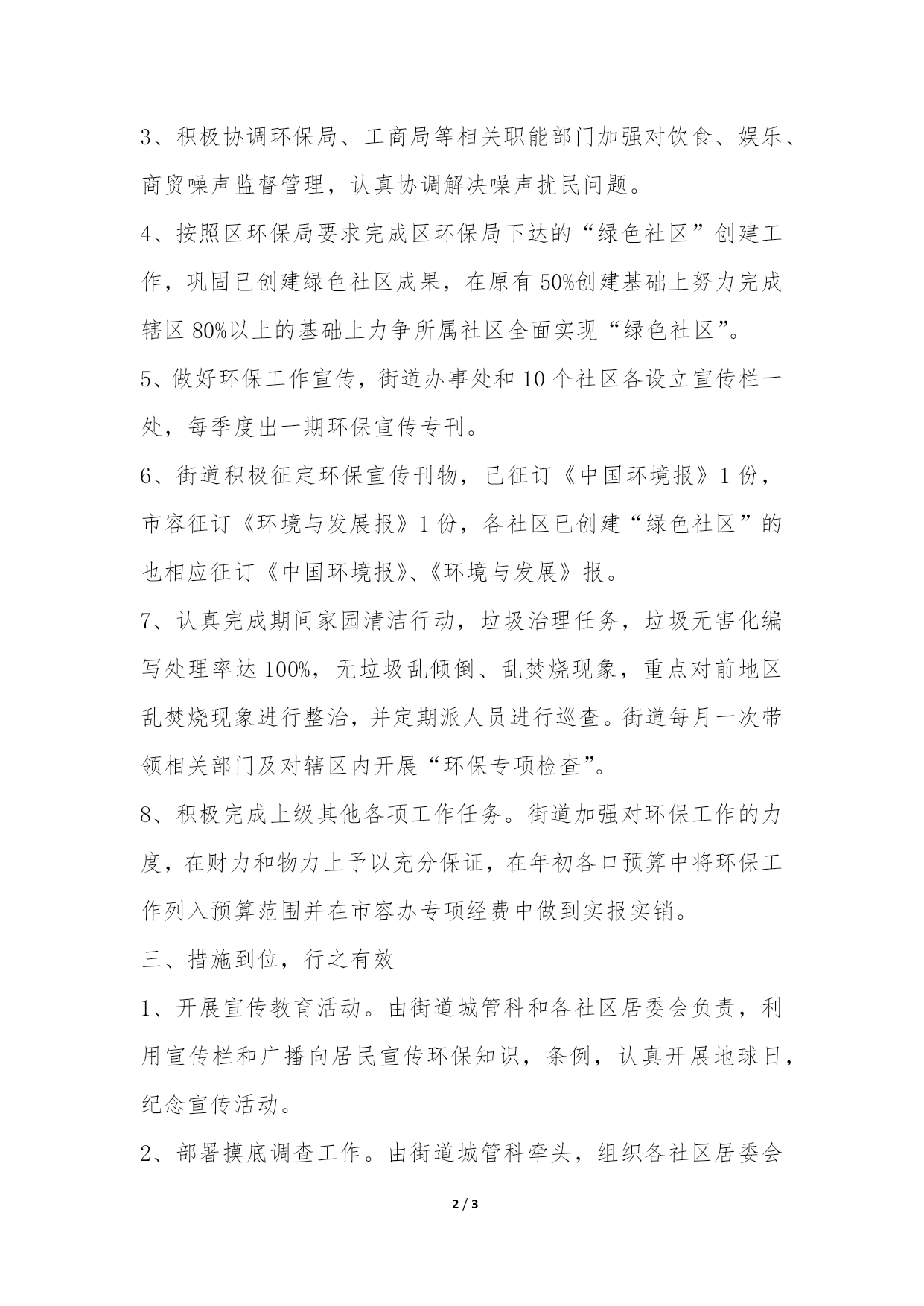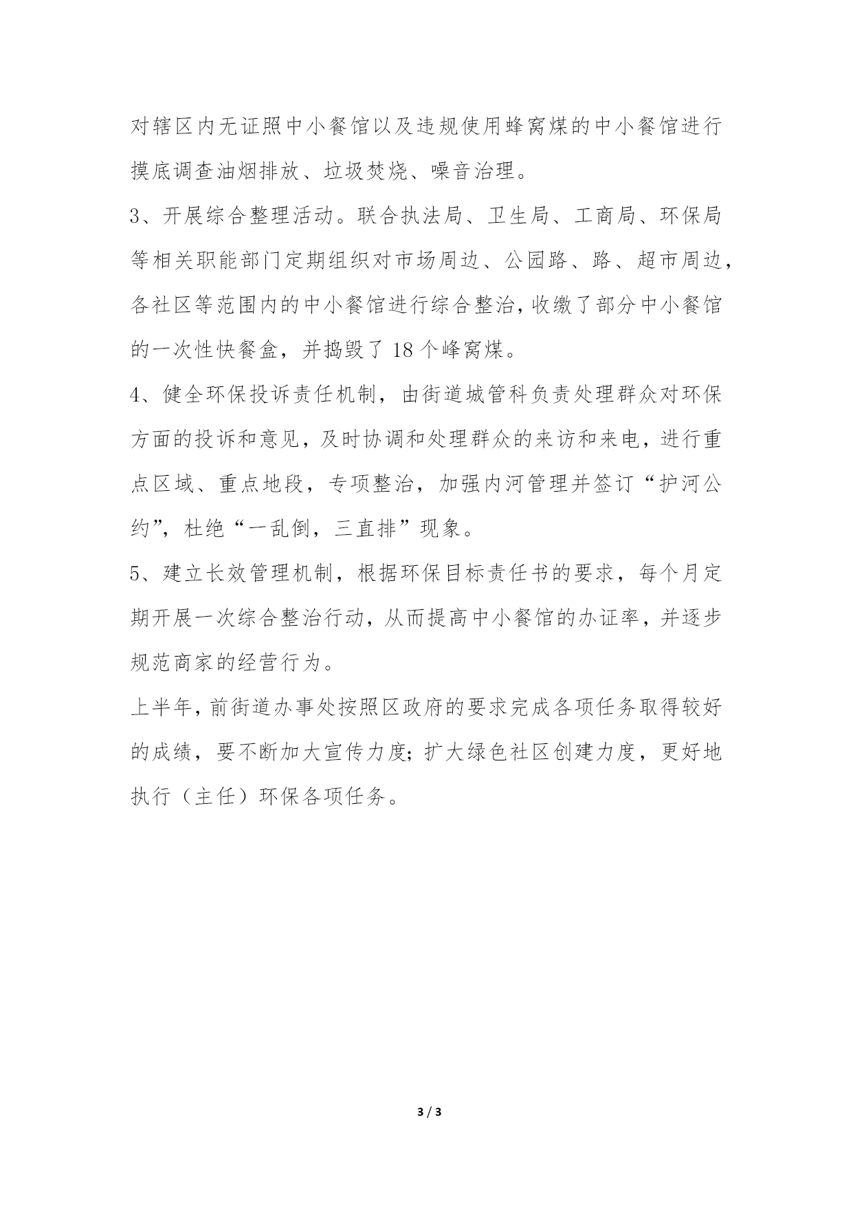PAGE3/NUMPAGES3环保监管工作汇报为全面落实科学发展观,服务和促进海峡西岸经济区建设,认真按时完成区政府下达各项环保工作任务,前街道组织相关部门着手落实各项整治措施,现将有关情况汇报如下:一、高度重视,加强领导为全面落实《区各镇(街)年度镇长(主任)环保目标责任书》工作,街道办事处高度重视,结合城管科例会召开专项部署成立以主要领导为组长,分管领导为副组长,成员由街道城管科、城管中队、党政办、财政所、经济办、爱卫办、劳动保障所、各社区卫生主任组成的工作领导小组,并结合本街道的实际情况制定具体工作方案,做到有计划、有部署、有实施。二、制定方案,具体落实1、落实各级责任,街道主要领导负责辖区范围内环境保护工作,分管领导对辖区范围内环境保护工作负主要责任,街道城管科对分管业务工作范围内的环境保护工作负直接领导责任,街道办事处认真贯彻落实省政府环境保护“一岗双责”规定,同时明确各分管班子成员,各相关部门及各社区在做好本职工作以外的环保责任,切实担负起本辖区环境质量环保责任,采取措施改善环境质量。2、每月拟由街道城管科牵头协调区卫生局、环保局、工商局、执法局、公安局等相关部门对辖区内中小餐馆进行综合整治。3、积极协调环保局、工商局等相关职能部门加强对饮食、娱乐、商贸噪声监督管理,认真协调解决噪声扰民问题。4、按照区环保局要求完成区环保局下达的“绿色社区”创建工作,巩固已创建绿色社区成果,在原有50%创建基础上努力完成辖区80%以上的基础上力争所属社区全面实现“绿色社区”。5、做好环保工作宣传,街道办事处和10个社区各设立宣传栏一处,每季度出一期环保宣传专刊。6、街道积极征定环保宣传刊物,已征订《中国环境报》1份,市容征订《环境与发展报》1份,各社区已创建“绿色社区”的也相应征订《中国环境报》、《环境与发展》报。7、认真完成期间家园清洁行动,垃圾治理任务,垃圾无害化编写处理率达100%,无垃圾乱倾倒、乱焚烧现象,重点对前地区乱焚烧现象进行整治,并定期派人员进行巡查。街道每月一次带领相关部门及对辖区内开展“环保专项检查”。8、积极完成上级其他各项工作任务。街道加强对环保工作的力度,在财力和物力上予以充分保证,在年初各口预算中将环保工作列入预算范围并在市容办专项经费中做到实报实销。三、措施到位,行之有效1、开展宣传教育活动。由街道城管科和各社区居委会负责,利用宣传栏和广播向居民宣传环保知识,条例,认真开展地球日,纪念宣传活动。2、部署摸底调查工作。由街道城管科牵头,组织各社区居委会对辖区内无证照中小餐馆以及违规使用蜂窝煤的中小餐馆进行摸底调查油烟排放、垃圾焚烧、噪音治理。3、开展综合整理活动。联合执法局、卫生局、工商局、环保局等相关职能部门定期组织对市场周边、公园路、路、超市周边,各社区等范围内的中小餐馆进行综合整治,收缴了部分中小餐馆的一次性快餐盒,并捣毁了18个峰窝煤。4、健全环保投诉责任机制,由街道城管科负责处理群众对环保方面的投诉和意见,及时协调和处理群众的来访和来电,进行重点区域、重点地段,专项整治,加强内河管理并签订“护河公约”,杜绝“一乱倒,三直排”现象。5、建立长效管理机制,根据环保目标责任书的要求,每个月定期开展一次综合整治行动,从而提高中小餐馆的办证率,并逐步规范商家的经营行为。上半年,前街道办事处按照区政府的要求完成各项任务取得较好的成绩,要不断加大宣传力度;扩大绿色社区创建力度,更好地执行(主任)环保各项任务。