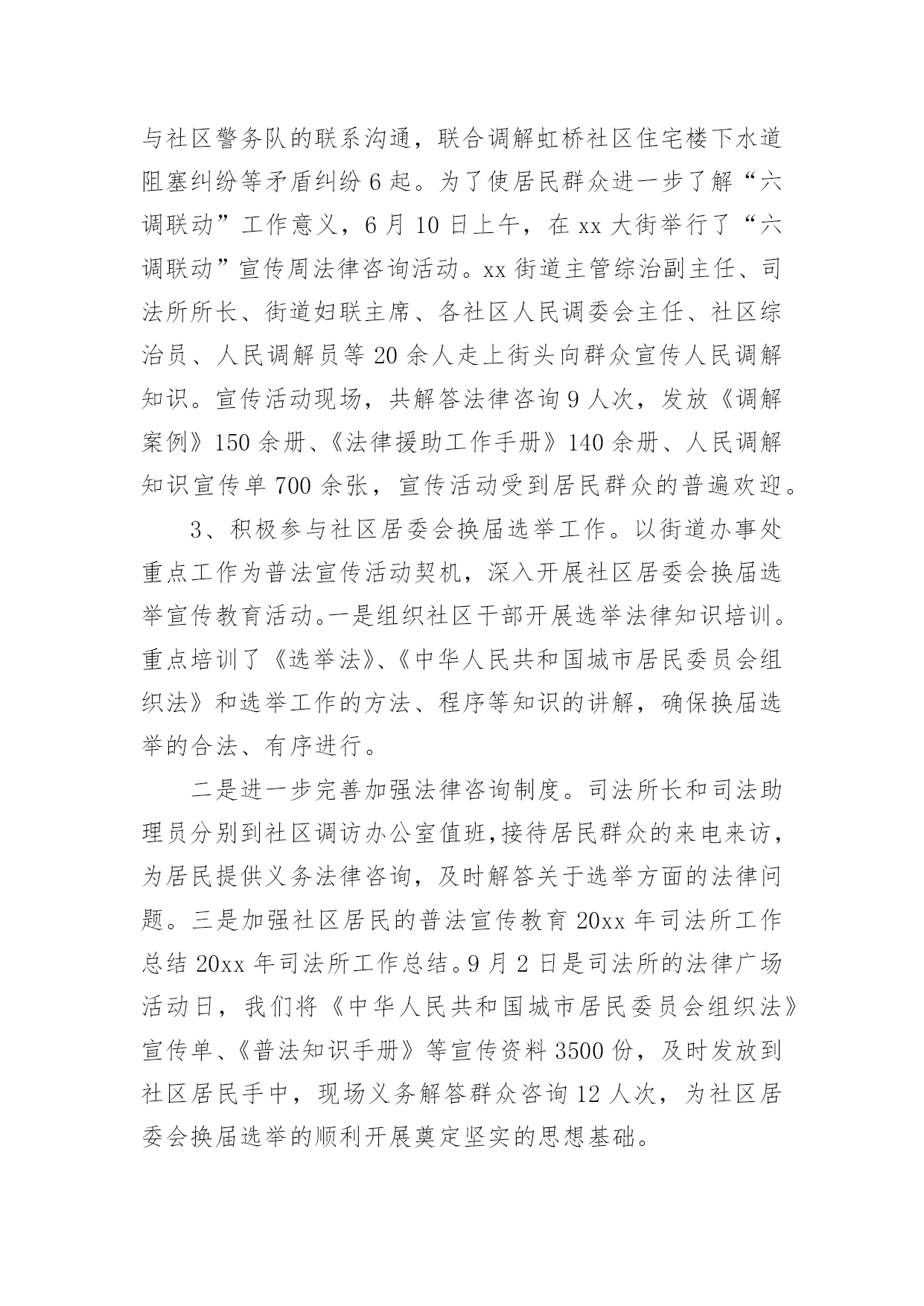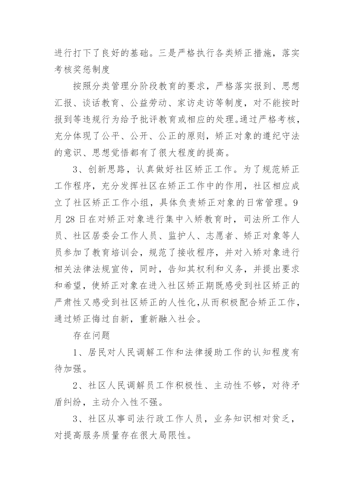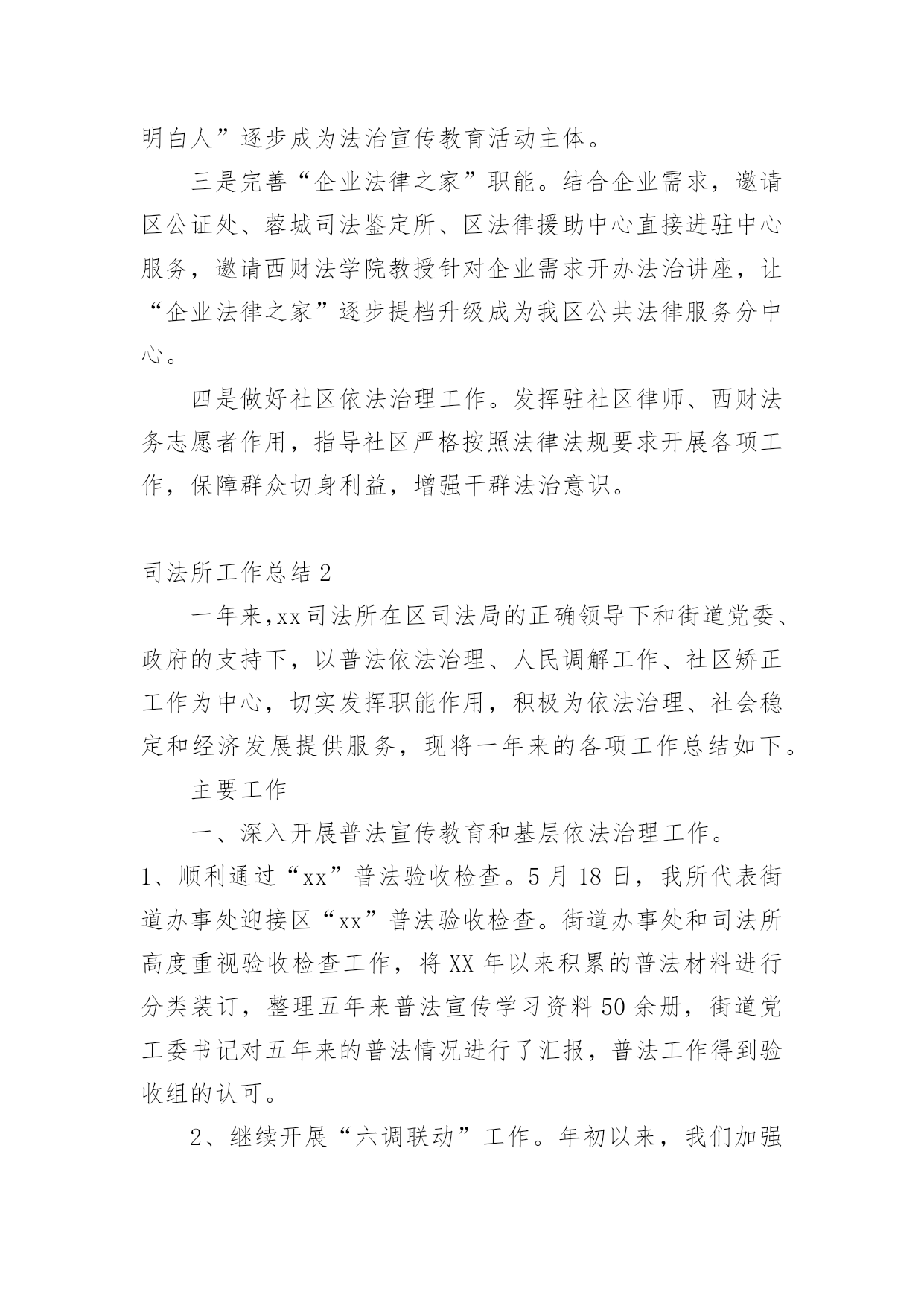 司法所工作总结总结就是把一个时间段取得的成绩、存在的问题及得到的经验和教训进行一次全面系统的总结的书面材料,它可以给我们下一阶段的学习和工作生活做指导,让我们一起认真地写一份总结吧。总结怎么写才能发挥它的作用呢?下面是小编为大家收集的司法所工作总结,欢迎大家分享。司法所工作总结1xxxx年,x司法所在局党组、镇党委政府的领导下,以公共法律服务体系建设、维护社会稳定和谐、提高干群法治意识为重点,紧紧围绕“三镇”战略实施,“亲水滨河小镇”目标推进,切实发挥司法行政工作职能,现将年度工作总结汇报如下:一、推动公共法律服务体系建设,维护企业、群众合法权益(一)法律服务,护航企业发展。结合园区小微企业法律需求,建立“园区企业法律之家”。聘请专业律师团队服务,采取公益化为主、市场化为辅的运营模式,为小微企业免费提供法律咨询、法律文书合法性审查、矛盾纠纷调解等公共法律服务项目。从法律角度积极指导企业开展谈判应诉、兼并重组、权责划分、融资上市、“房东变股东”等工作。同时开通公证、法律援助、司法鉴定预约预审通道,有效提高公共法律服务便捷性。x月xx日“企业法律之家”建成运行至今,共指导企业纠纷调解x件,接待职工来访咨询xx人次,企业咨询xx人次。(二)法律援助,保障基本权益。按照市、区民生目标要求,加大法律援助宣传力度。热情接待法律援助咨询,对符合要求的案件,积极对接社区、援助中心进行办理。x-xx月共接待法律援助来访咨询xxx人次,协办援助案件x件。(三)律师服务,促进依法治理。x-xx月,x名驻社区律师,共解答群众咨询xxx人次,参加宣传活动x场次,授课x场次,为社区提供法律意见建议xx条。二、多措并举,法治宣传教育成效显著一是创新形式,探索“政群”共建普法模式。以规范化司法所建设法治文化植入为契机,以政府引导、群众创作为模式,征集我镇群众、企业创作的书画、手工作品xx余件,内容涵盖宪法、预防职务犯罪、禁止酒驾、禁毒、预防未成年人犯罪等主题。打造了全区首个“政群”共建法治文化宣传阵地。二是狠抓青少年法治意识培育。以“新市民法治意识培育”为平台,以“送法进校园”为抓手,针对青少年做好普法教育工作。开办了“法治午间课”,邀请检察官、律师、干警(法治副校长)到x实验校为青少年授课,讲解法律知识;策划了“法治警示游”,对接拘留所、派出所、司法所,组织青少年开展现场观摩警示教育,树立法律权威;举办了“暑期学法班”,委托田园社会组织负责组织社区青少年暑期托管班开展法治教育系列活动,让青少年在暑期生活中了解法律知识。三是以“法治大讲堂”为平台,结合环保督查、安全生产大检查发动各驻社区律师开展《环保法》、《安全生产法》知识讲座,提高企业依法经营意识。四是以依法治镇为抓手,推行“一讲二学三测验”学法模式,全面推动书记法治建设第一责任人职责和班子成员“一岗双责”落到实处,全镇党员干部法治意识、法律知识水平得到有效提升,依法行政工作水平全面提高。五是策划组织了建军xx周年“送法进军营”活动,在武警水电九支队设立了“军人维权岗”。三、发挥人民调解职能,保障辖区稳定和谐严格执行矛盾纠纷周、月及重点时节专项排查制度。x-xx月共排查各类矛盾纠纷xxx件,调解xxx件,调解成功xxx件,调解成功率达xx%。其中x件赡养纠纷已办理法律援助立案审理,x件劳资纠纷正积极协调解决。一年中,我所指导镇、社区、行业调委会完成换届选举工作,对全镇xx个调委会,xx名调解员进行了备案。按照“平安社区”创建要求,在水沐怡境小区、金河苑小区组建了物业纠纷调委会,建立了物业纠纷调解室,确保物业纠纷受理及时、调处得力。主持蜀云科技园厂房建设工程农民工工资调解,前后督促支付农民工工资xx万余元,并促成艾医生医疗器械有限责任公司与x成越劳务派遣公司达成xxx万元工程决算协议。指导零点印务公司xx余家供应商严格按照法律规定进行债务清算。配合中央电视台法治频道“小区大事”栏目组拍摄我镇金鸡社区家庭创业纠纷,宣传我镇引导群众干事创业、积极化解生产经营纠纷的先进事迹。四、强化三项意识,做好社区矫正工作我所现有社区服刑人员x人,其中缓刑x人,期满解除矫正x人,无社区服刑人员脱管漏管情况和重新犯罪情况发生。在工作中我所一是严格执行周听声、月见面、每月x小时学习和x小时公益劳动制度,确保管教到位;二是树立证据、程序、节点三项意识,严格规范社区服刑人员档案资料,确保日常监管记录齐全;三是全面推行帮教个案化,对每名社区服刑人员根据犯罪细节、悔罪表现、家庭情况、性格特点制定帮教个案,有针对性的开展社区矫正工作。xxxx年,我所各项工作推进有力,但仍然存在着一定的不足:一是作为“七五”普法牵头部门,没有按照“谁执法、谁主管、谁普法”工作要求制定目标计划,建立考评机制;二是普法工作形式单一、载体陈旧,无法调动群众参与