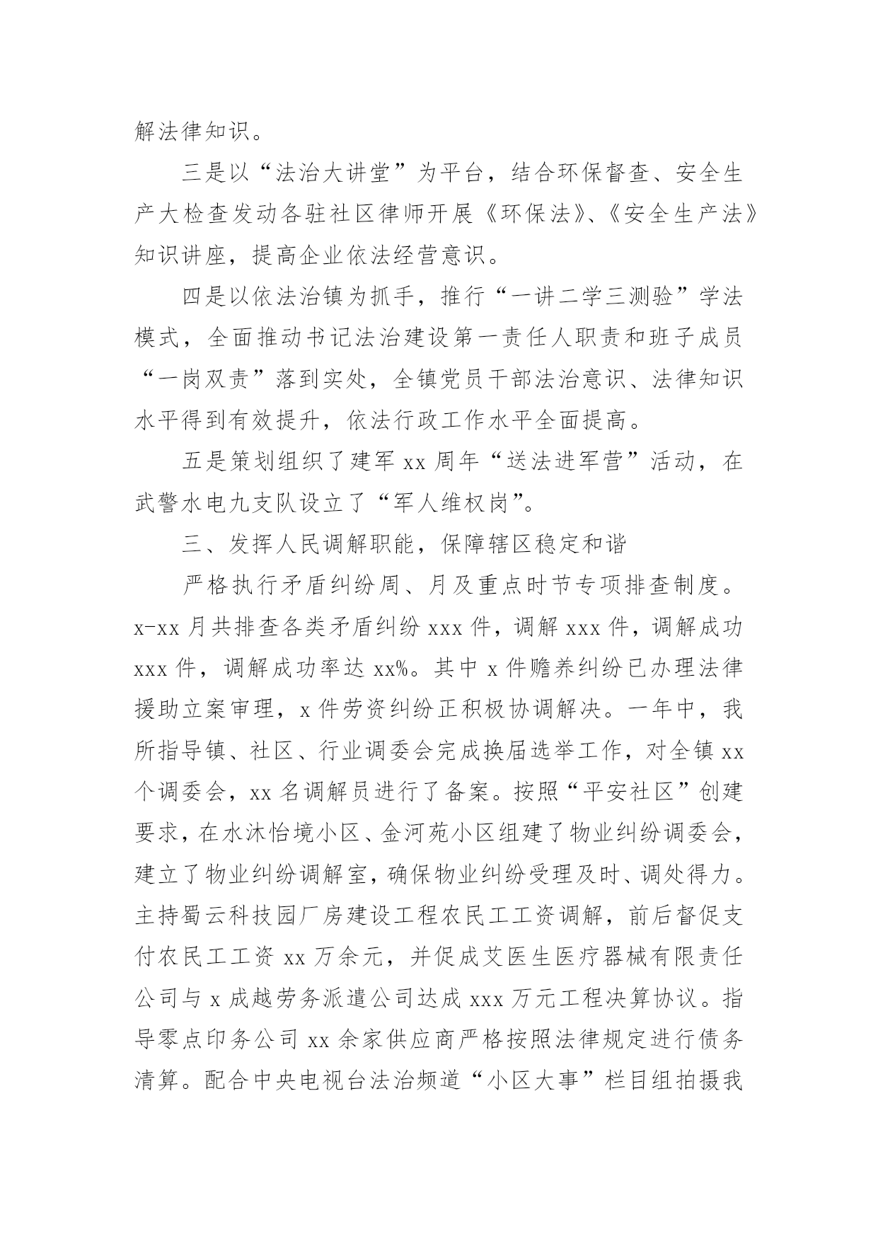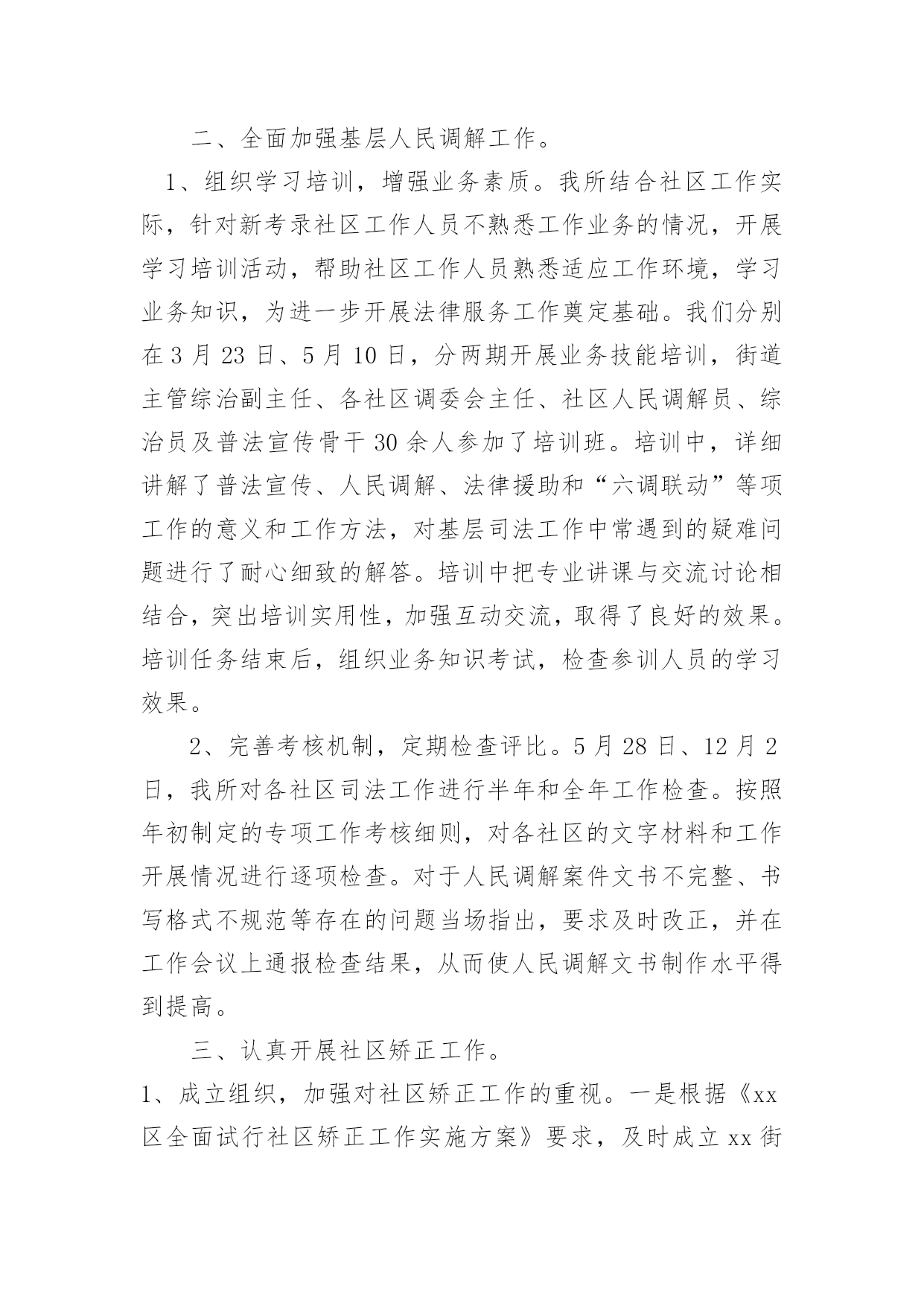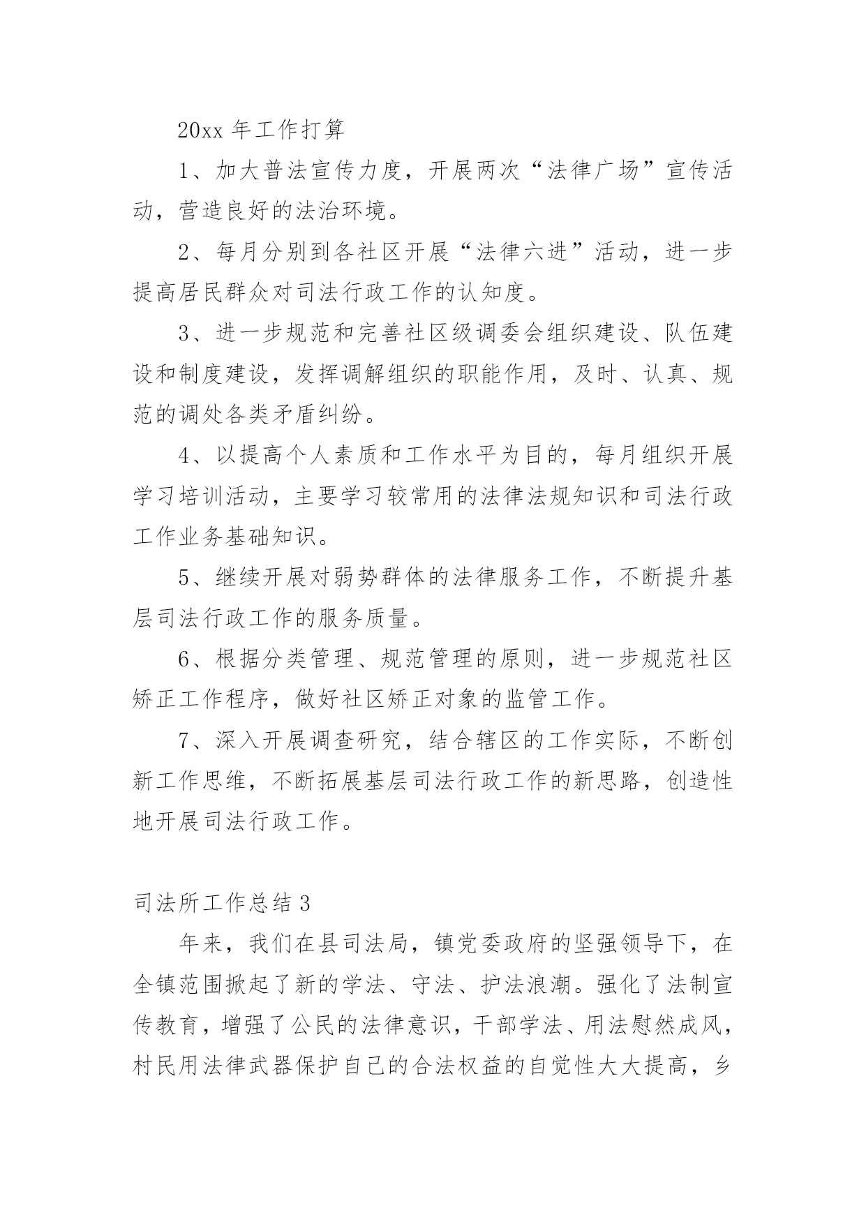 司法所工作总结总结就是把一个时间段取得的成绩、存在的问题及得到的经验和教训进行一次全面系统的总结的书面材料,它可以给我们下一阶段的学习和工作生活做指导,让我们一起认真地写一份总结吧。总结怎么写才能发挥它的作用呢?下面是小编为大家收集的司法所工作总结,欢迎大家分享。司法所工作总结1xxxx年,x司法所在局党组、镇党委政府的领导下,以公共法律服务体系建设、维护社会稳定和谐、提高干群法治意识为重点,紧紧围绕“三镇”战略实施,“亲水滨河小镇”目标推进,切实发挥司法行政工作职能,现将年度工作总结汇报如下:一、推动公共法律服务体系建设,维护企业、群众合法权益(一)法律服务,护航企业发展。结合园区小微企业法律需求,建立“园区企业法律之家”。聘请专业律师团队服务,采取公益化为主、市场化为辅的运营模式,为小微企业免费提供法律咨询、法律文书合法性审查、矛盾纠纷调解等公共法律服务项目。从法律角度积极指导企业开展谈判应诉、兼并重组、权责划分、融资上市、“房东变股东”等工作。同时开通公证、法律援助、司法鉴定预约预审通道,有效提高公共法律服务便捷性。x月xx日“企业法律之家”建成运行至今,共指导企业纠纷调解x件,接待职工来访咨询xx人次,企业咨询xx人次。(二)法律援助,保障基本权益。按照市、区民生目标要求,加大法律援助宣传力度。热情接待法律援助咨询,对符合要求的案件,积极对接社区、援助中心进行办理。x-xx月共接待法律援助来访咨询xxx人次,协办援助案件x件。(三)律师服务,促进依法治理。x-xx月,x名驻社区律师,共解答群众咨询xxx人次,参加宣传活动x场次,授课x场次,为社区提供法律意见建议xx条。二、多措并举,法治宣传教育成效显著一是创新形式,探索“政群”共建普法模式。以规范化司法所建设法治文化植入为契机,以政府引导、群众创作为模式,征集我镇群众、企业创作的书画、手工作品xx余件,内容涵盖宪法、预防职务犯罪、禁止酒驾、禁毒、预防未成年人犯罪等主题。打造了全区首个“政群”共建法治文化宣传阵地。二是狠抓青少年法治意识培育。以“新市民法治意识培育”为平台,以“送法进校园”为抓手,针对青少年做好普法教育工作。开办了“法治午间课”,邀请检察官、律师、干警(法治副校长)到x实验校为青少年授课,讲解法律知识;策划了“法治警示游”,对接拘留所、派出所、司法所,组织青少年开展现场观摩警示教育,树立法律权威;举办了“暑期学法班”,委托田园社会组织负责组织社区青少年暑期托管班开展法治教育系列活动,让青少年在暑期生活中了解法律知识。三是以“法治大讲堂”为平台,结合环保督查、安全生产大检查发动各驻社区律师开展《环保法》、《安全生产法》知识讲座,提高企业依法经营意识。四是以依法治镇为抓手,推行“一讲二学三测验”学法模式,全面推动书记法治建设第一责任人职责和班子成员“一岗双责”落到实处,全镇党员干部法治意识、法律知识水平得到有效提升,依法行政工作水平全面提高。五是策划组织了建军xx周年“送法进军营”活动,在武警水电九支队设立了“军人维权岗”。三、发挥人民调解职能,保障辖区稳定和谐严格执行矛盾纠纷周、月及重点时节专项排查制度。x-xx月共排查各类矛盾纠纷xxx件,调解xxx件,调解成功xxx件,调解成功率达xx%。其中x件赡养纠纷已办理法律援助立案审理,x件劳资纠纷正积极协调解决。一年中,我所指导镇、社区、行业调委会完成换届选举工作,对全镇xx个调委会,xx名调解员进行了备案。按照“平安社区”创建要求,在水沐怡境小区、金河苑小区组建了物业纠纷调委会,建立了物业纠纷调解室,确保物业纠纷受理及时、调处得力。主持蜀云科技园厂房建设工程农民工工资调解,前后督促支付农民工工资xx万余元,并促成艾医生医疗器械有限责任公司与x成越劳务派遣公司达成xxx万元工程决算协议。指导零点印务公司xx余家供应商严格按照法律规定进行债务清算。配合中央电视台法治频道“小区大事”栏目组拍摄我镇金鸡社区家庭创业纠纷,宣传我镇引导群众干事创业、积极化解生产经营纠纷的先进事迹。四、强化三项意识,做好社区矫正工作我所现有社区服刑人员x人,其中缓刑x人,期满解除矫正x人,无社区服刑人员脱管漏管情况和重新犯罪情况发生。在工作中我所一是严格执行周听声、月见面、每月x小时学习和x小时公益劳动制度,确保管教到位;二是树立证据、程序、节点三项意识,严格规范社区服刑人员档案资料,确保日常监管记录齐全;三是全面推行帮教个案化,对每名社区服刑人员根据犯罪细节、悔罪表现、家庭情况、性格特点制定帮教个案,有针对性的开展社区矫正工作。xxxx年,我所各项工作推进有力,但仍然存在着一定的不足:一是作为“七五”普法牵头部门,没有按照“谁执法、谁主管、谁普法”工作要求制定目标计划,建立考评机制;二是普法工作形式单一、载体陈旧,无法调动群众参与