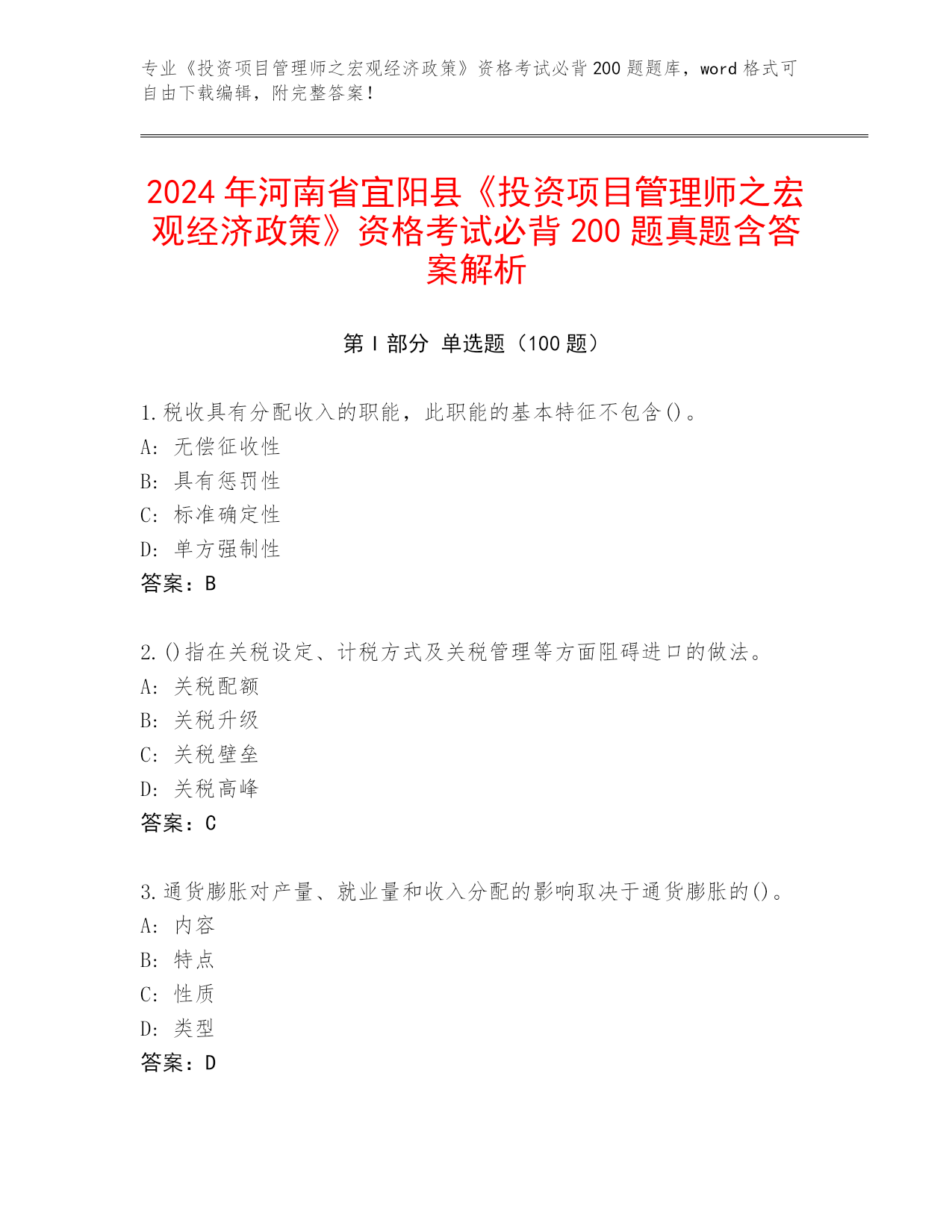 2024年河南省宜阳县《投资项目管理师之宏观经济政策》资格考试必背200题真题含答案解析